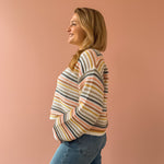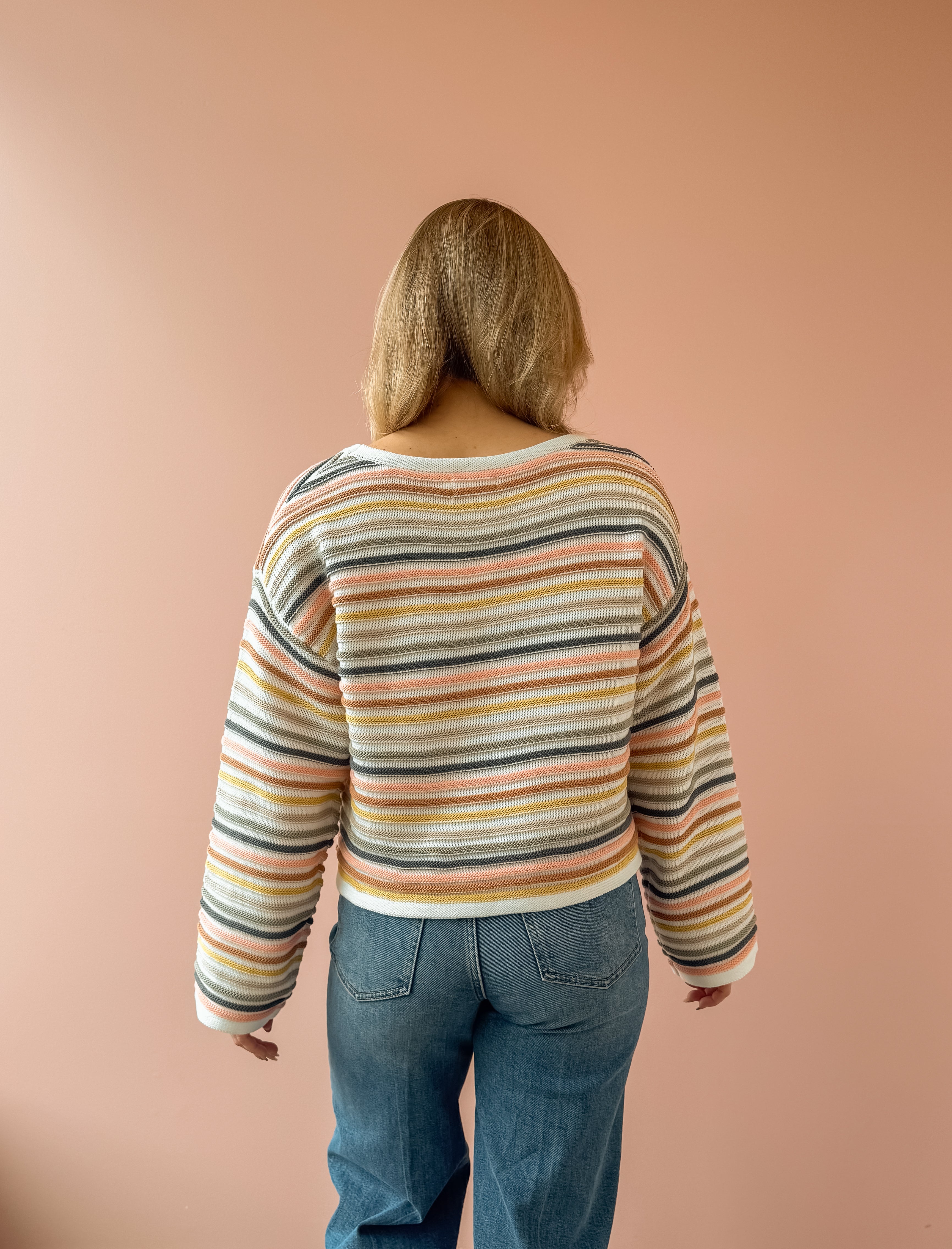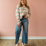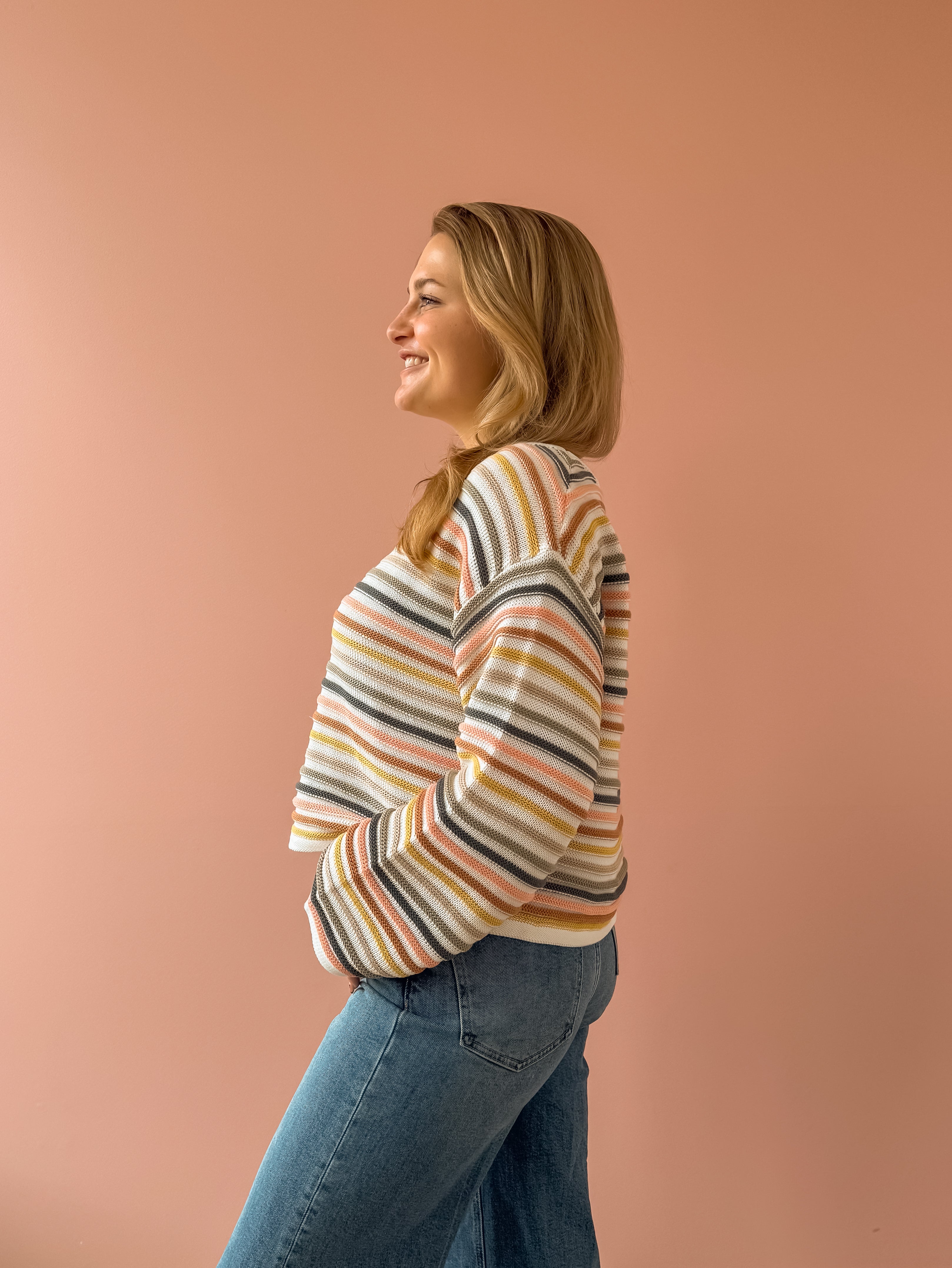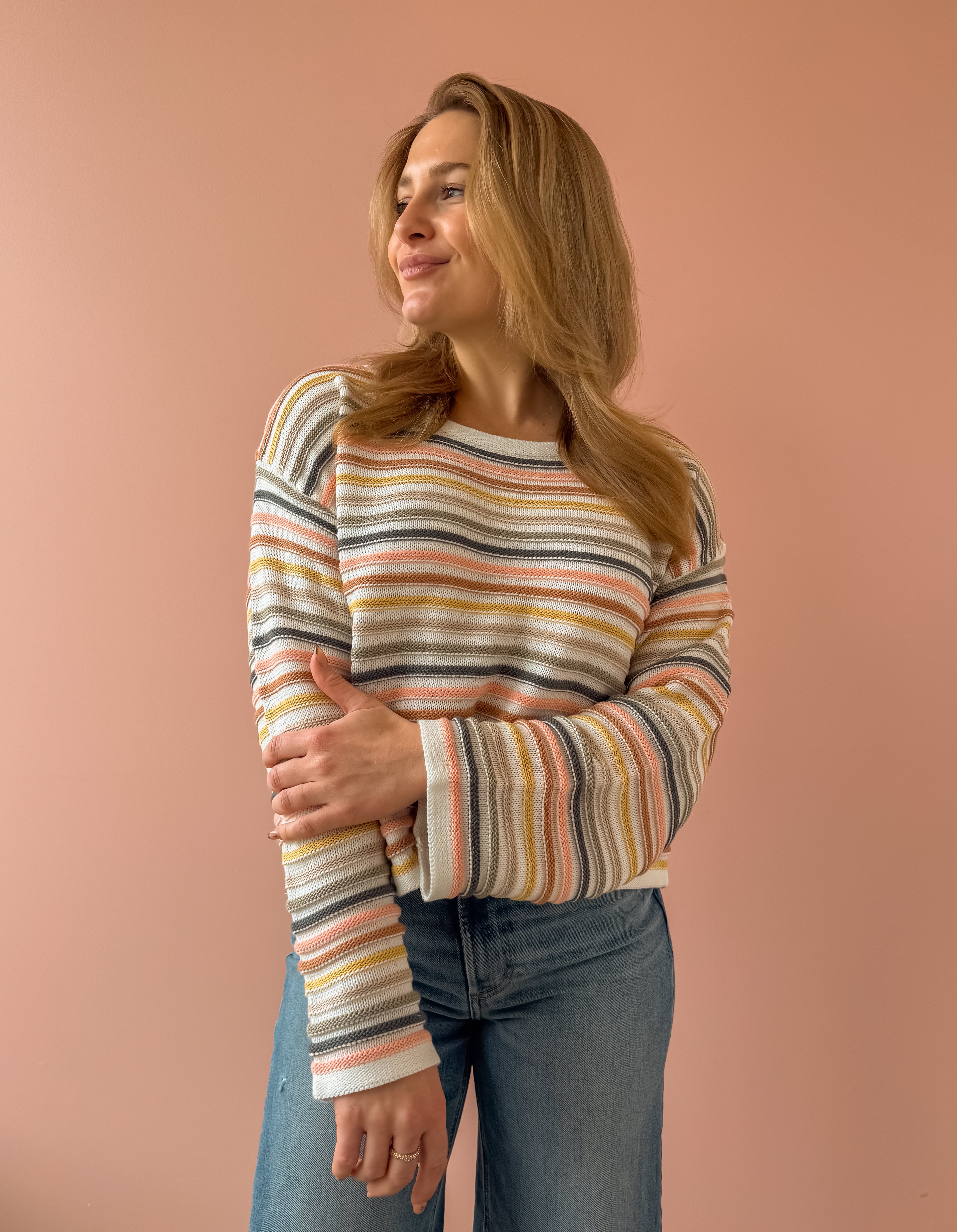 The Abigail Sweater combines effortless style with all-day comfort. Featuring a vibrant stripe pattern, this versatile piece transitions seamlessly from casual weekends to relaxed workdays. Crafted from soft, breathable fabric, it layers over basics or wear it solo. A timeless essential that delivers both warmth and personality. Style with denim and a sandal!