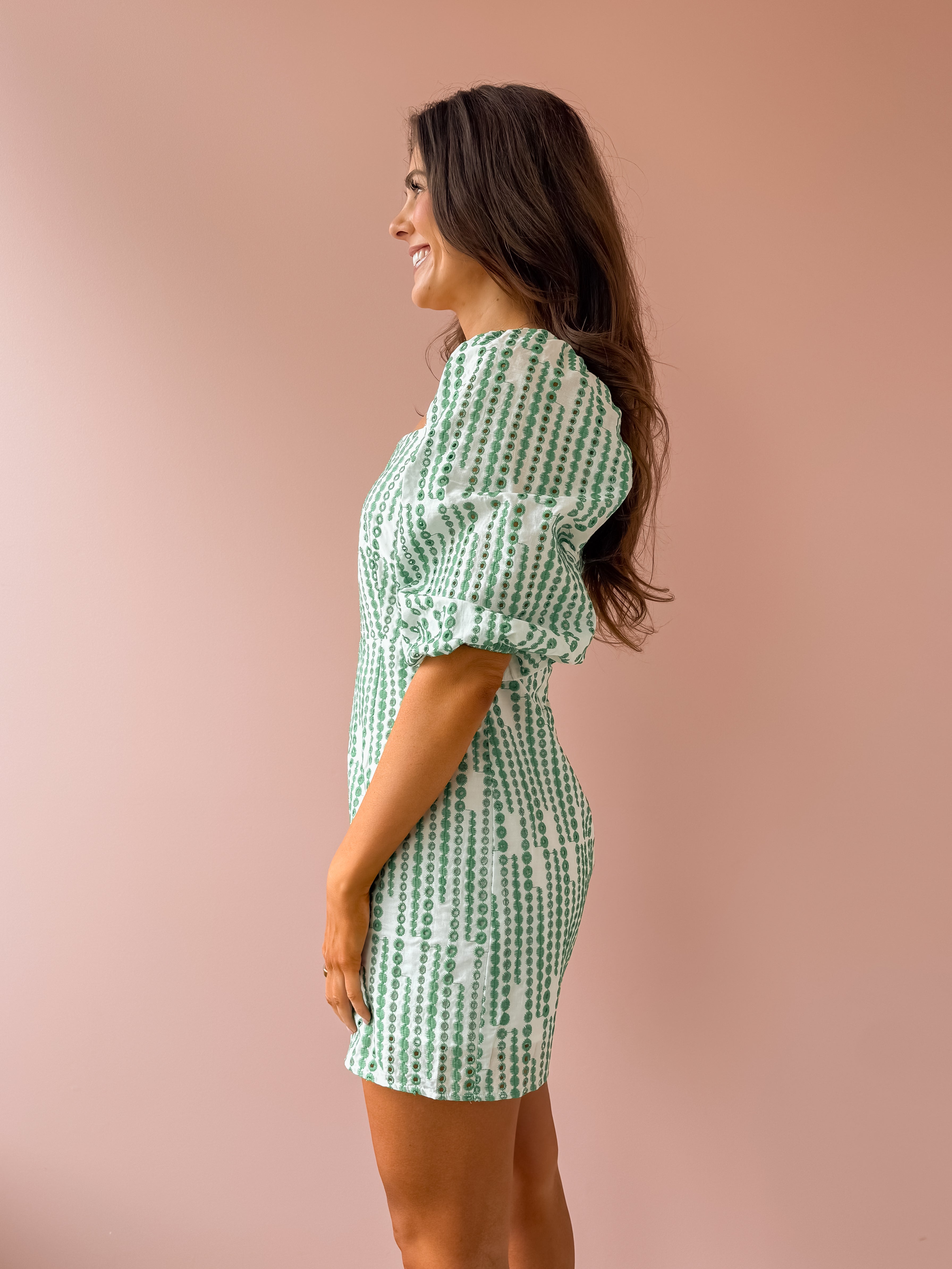 The Addison Mini Dress is a standout piece with a feminine, elevated feel. Designed in a breezy mini silhouette, it’s light and refined with a more dressed-up look. The subtle green detailing adds a unique touch that sets it apart. Style it with heels and jewelry for a polished, statement-making outfit.