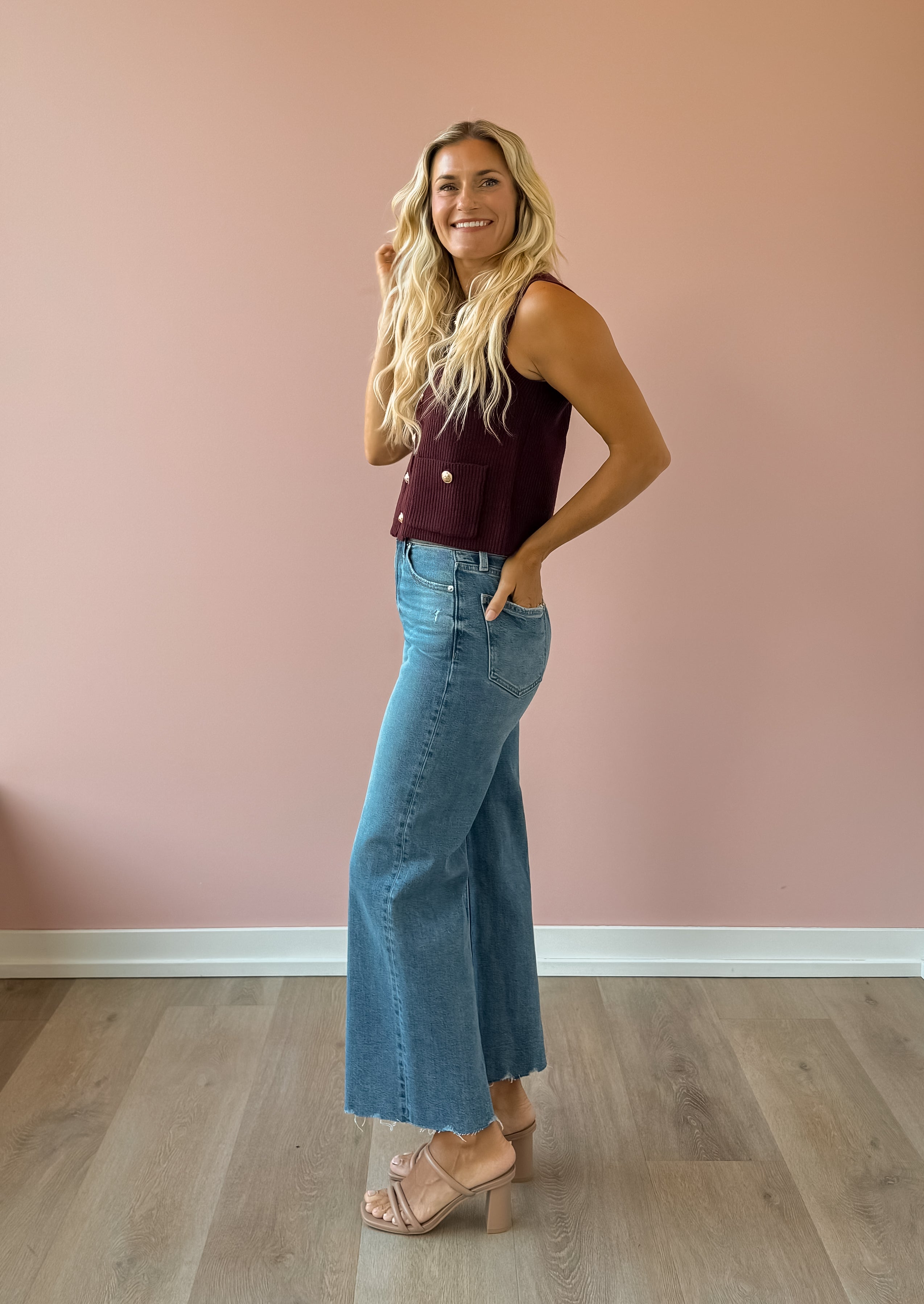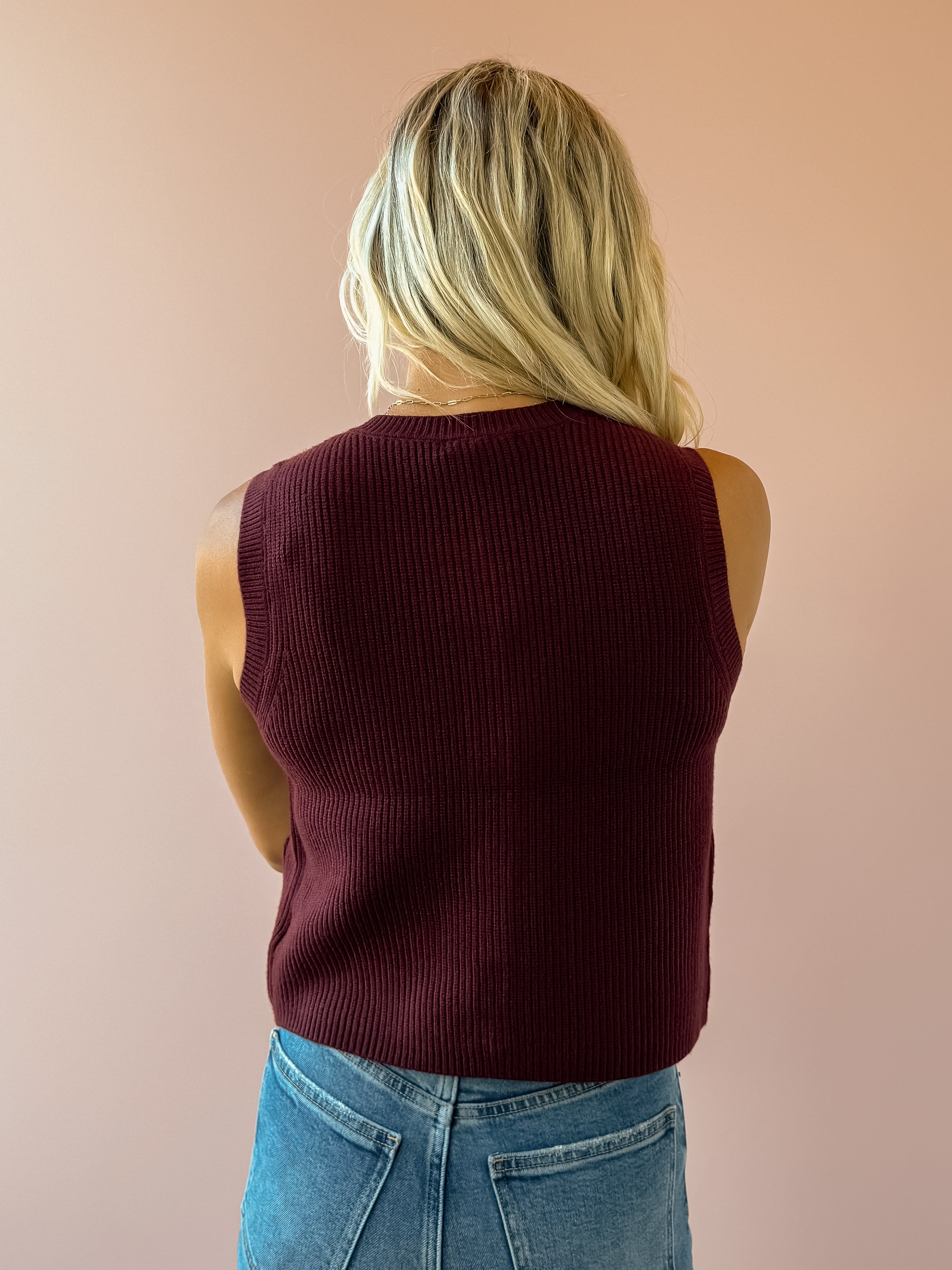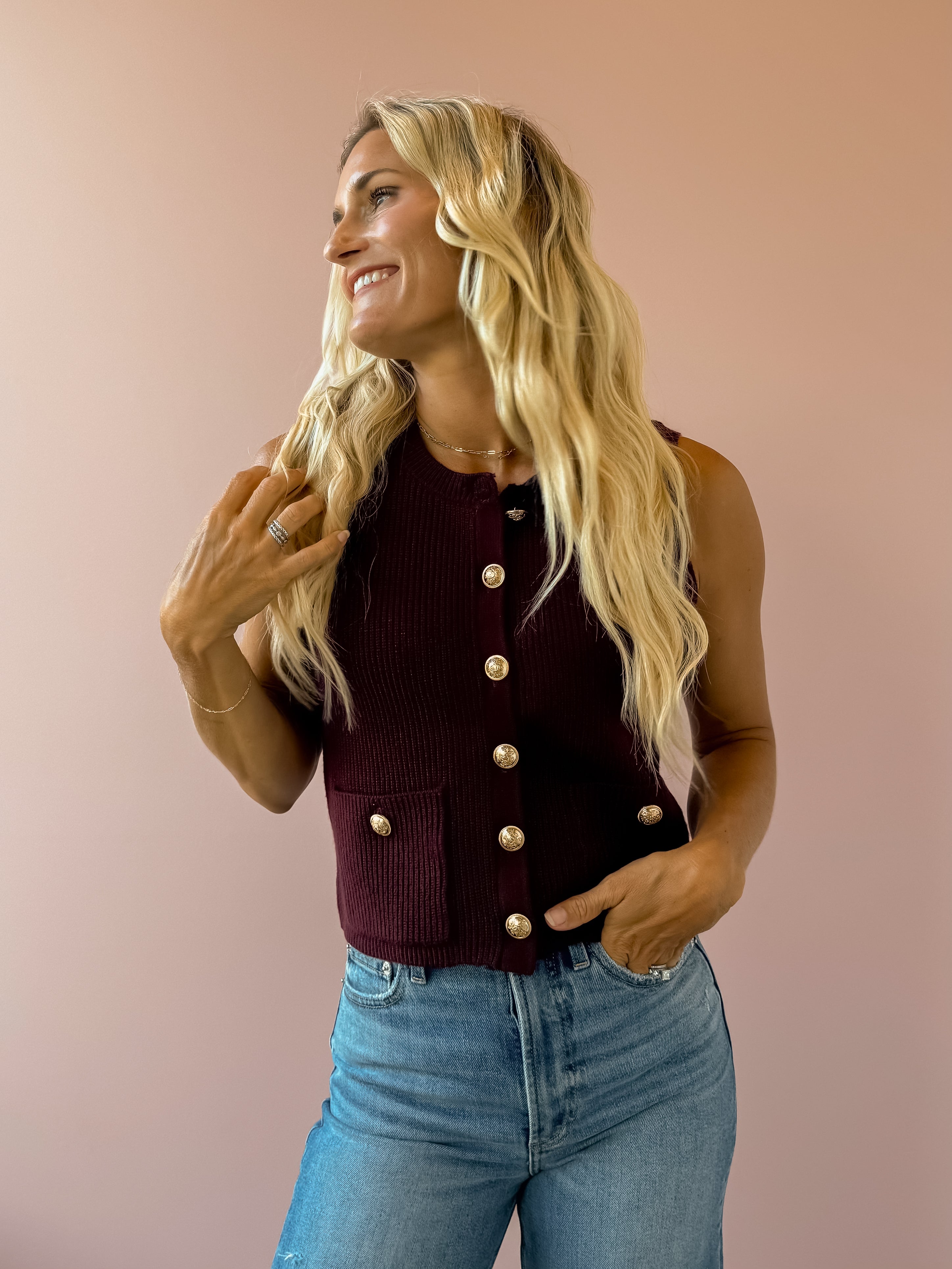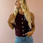 Elevate your style with the Aliya Sweater Vest, a sleeveless button-up designed for effortless layering. Its rich red wine hue and bold gold buttons create a striking look, while two front pockets add practical charm. Perfect for transitional weather, this vest pairs beautifully over shirts or stands out on its own for a polished, sophisticated outfit. Style it with denim and heels for a date night!