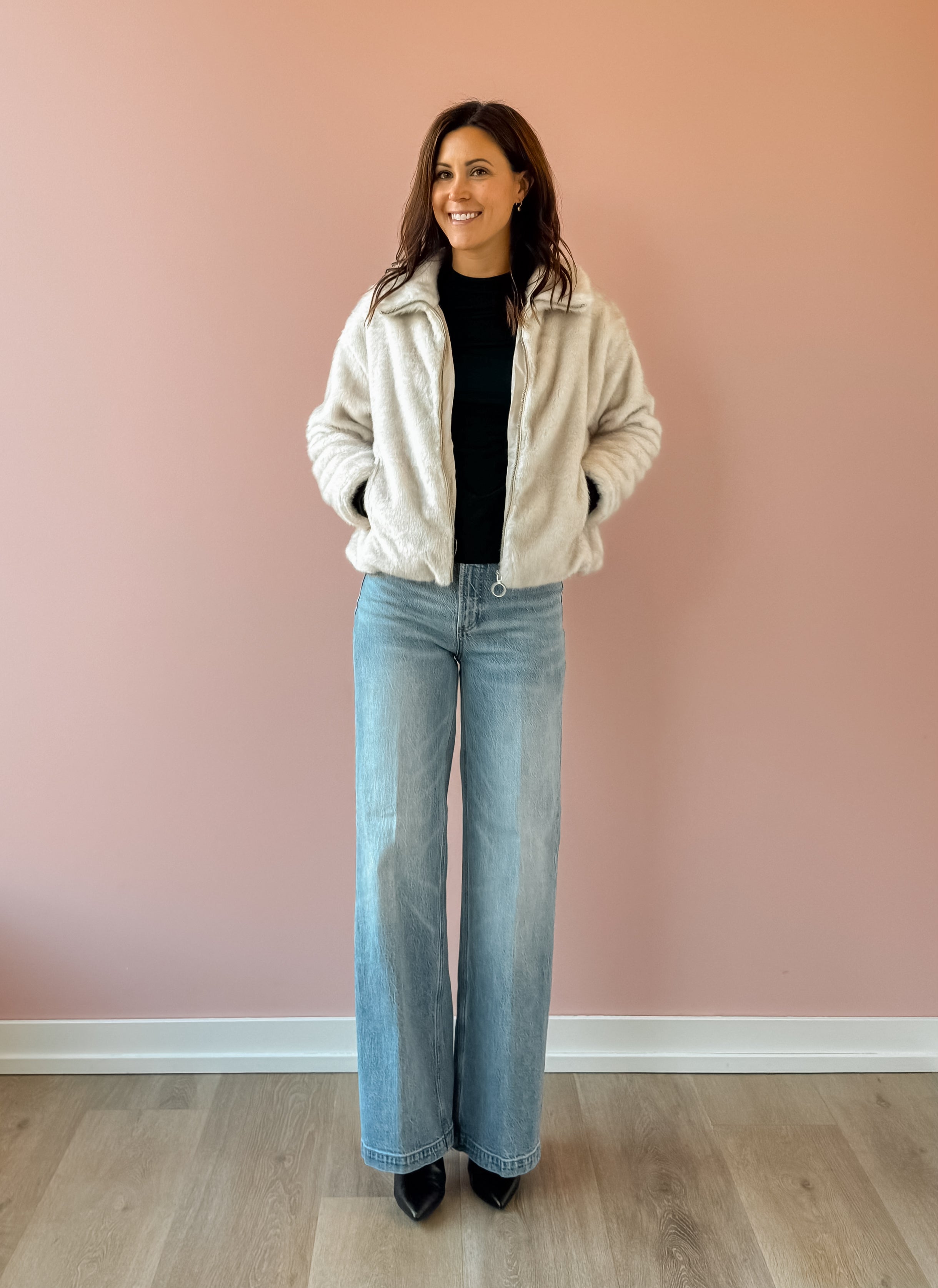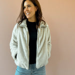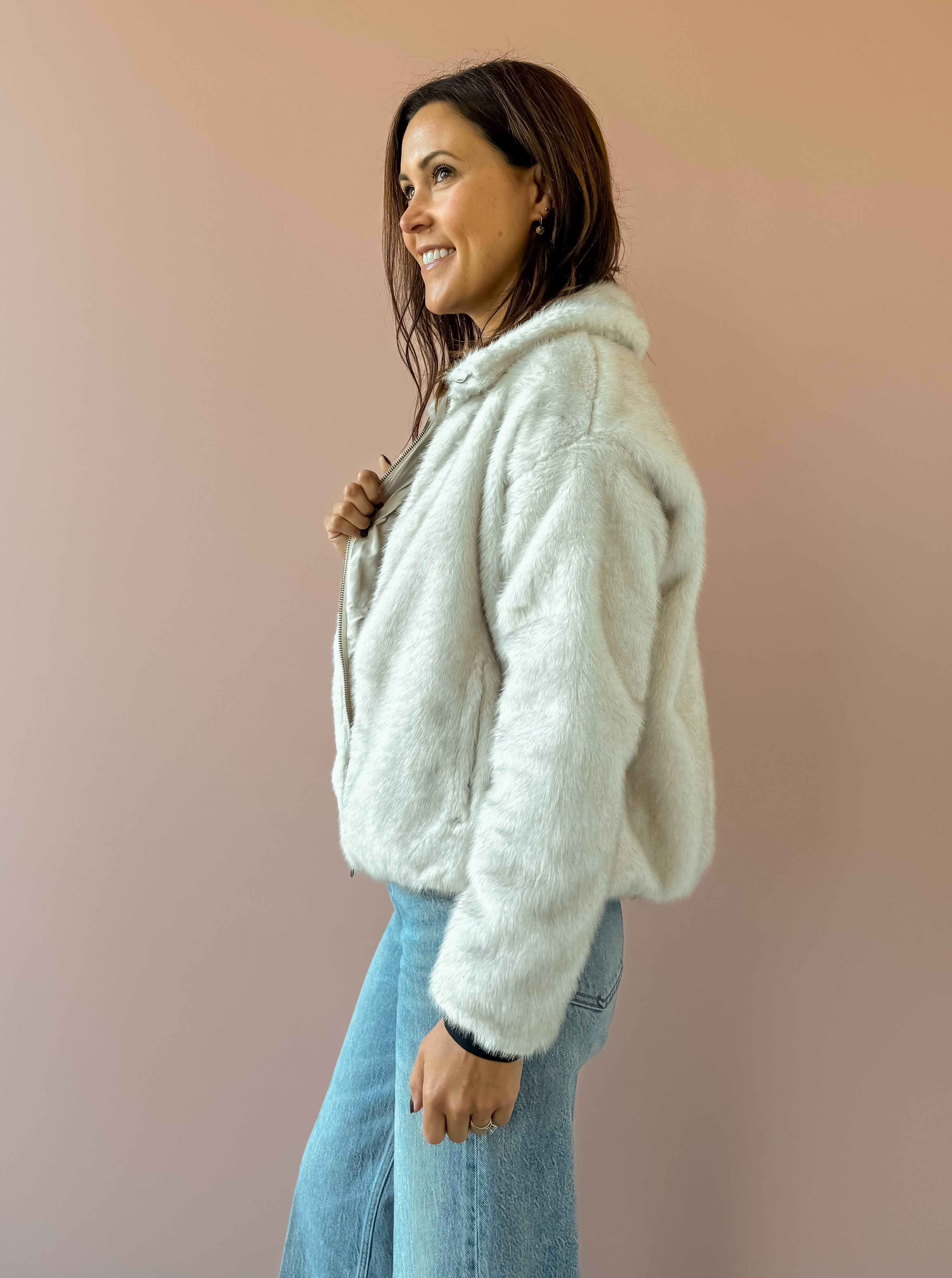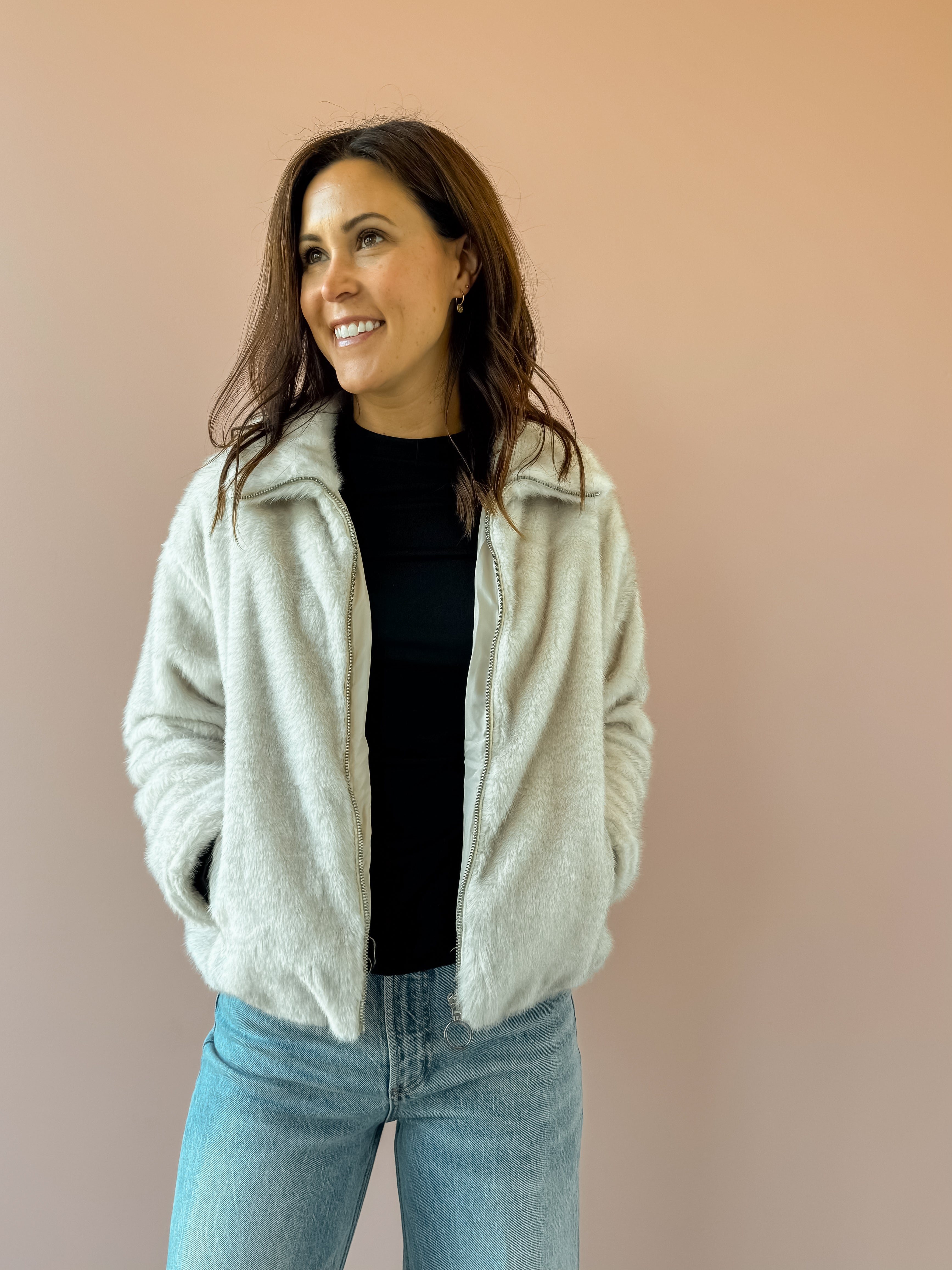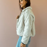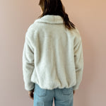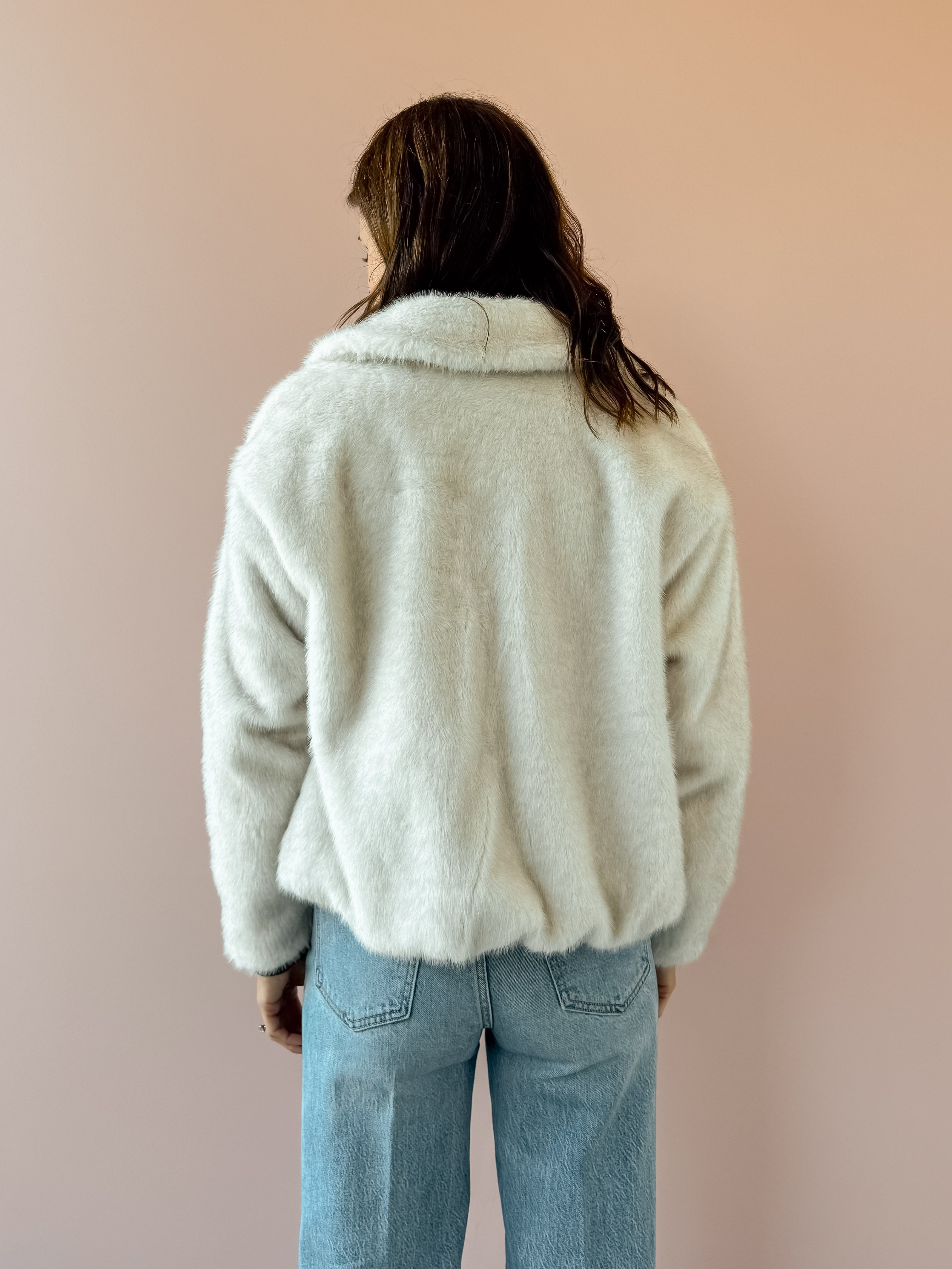This plush faux fur jacket offers ultimate coziness, perfect for both casual and dressed-up looks. Presented in a soft ivory shade, it includes a collared neckline, long sleeves, full lining, front zipper, and side seam pockets. Its heavyweight material and regular fit make it an ideal layering piece. Pair it with denim and boots for a stylish night out!