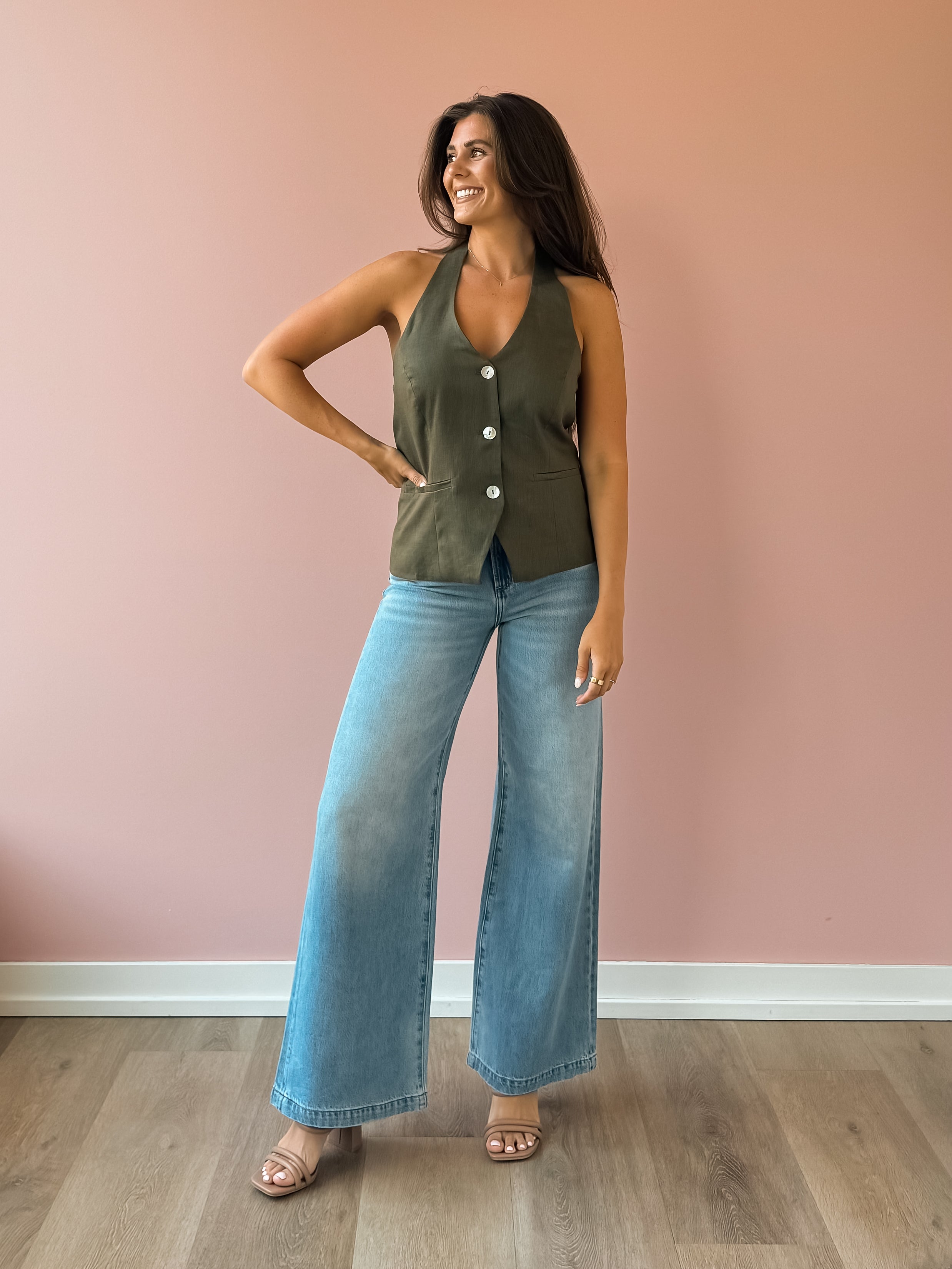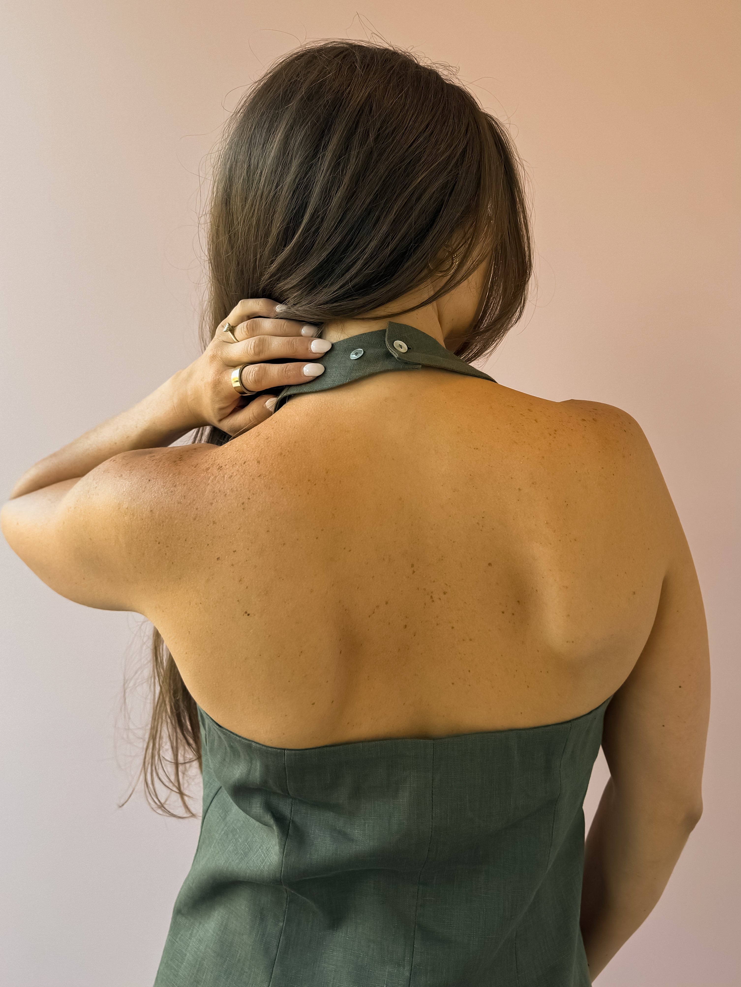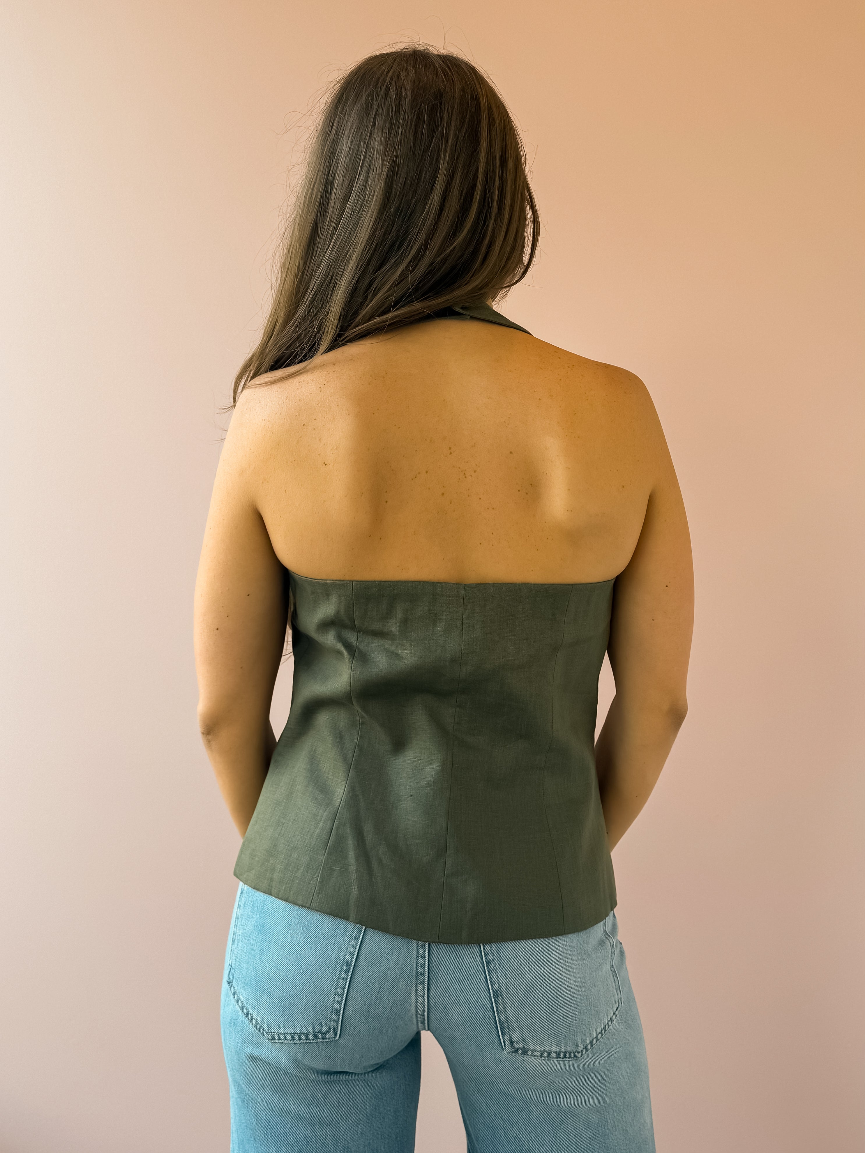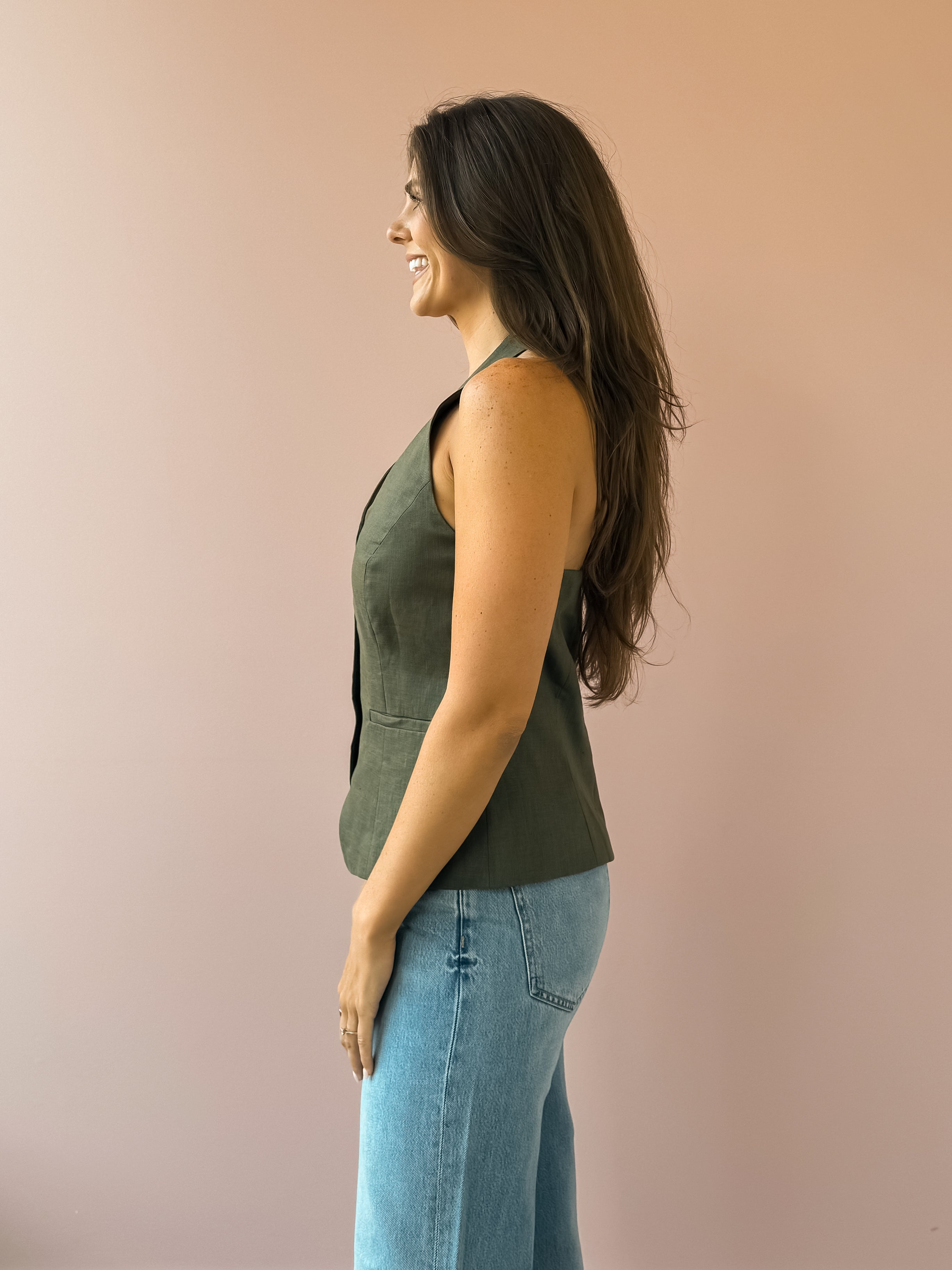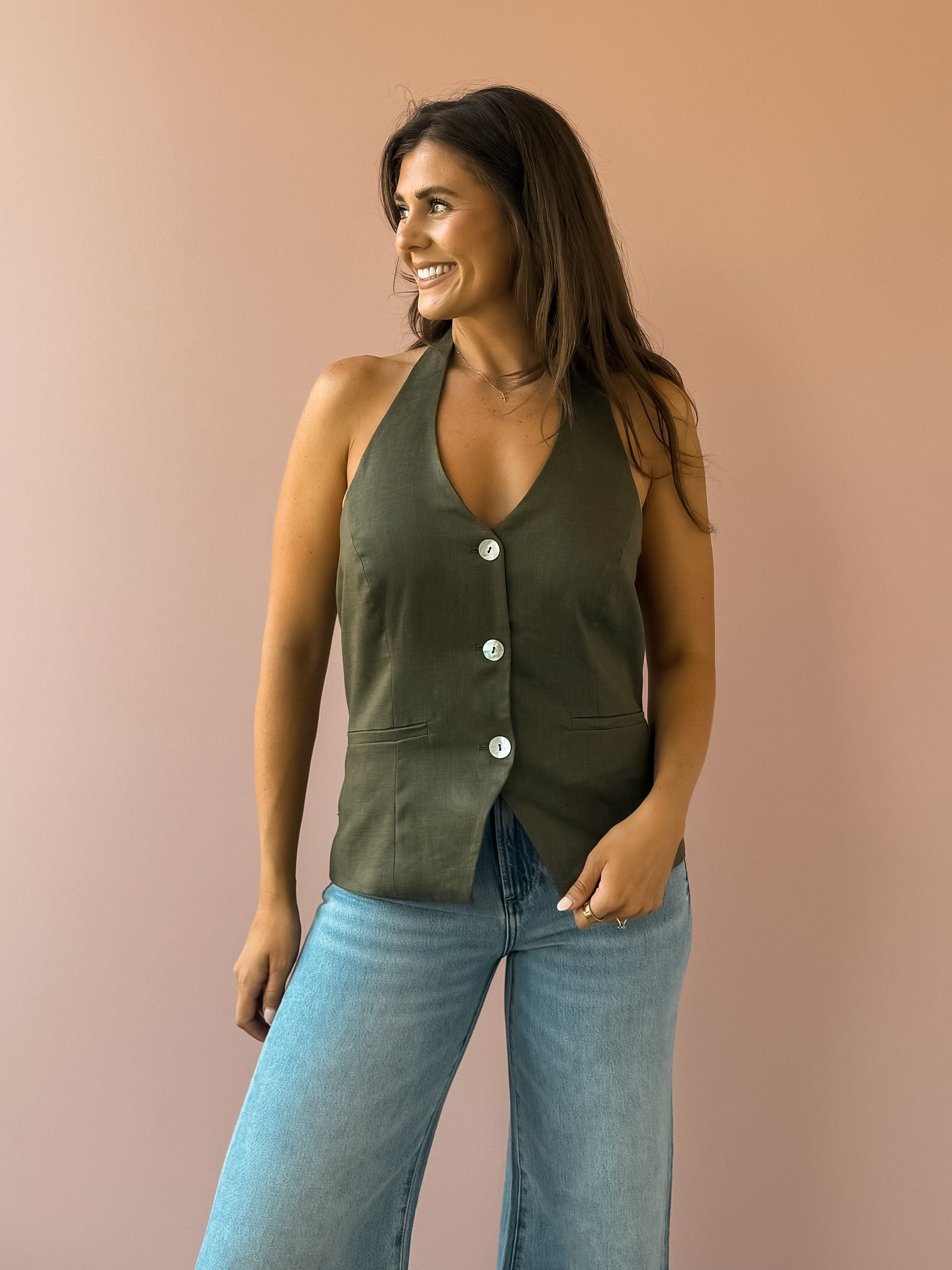 The Inaya Halter Vest brings a playful edge to polished styling with its flattering halter neckline, deep V-cut, and button-up front. In a sleek olive green, this flirty silhouette features two side pockets for added charm. Pair it with wide-leg trousers or a midi skirt for a look that’s equal parts girly and effortlessly sexy.