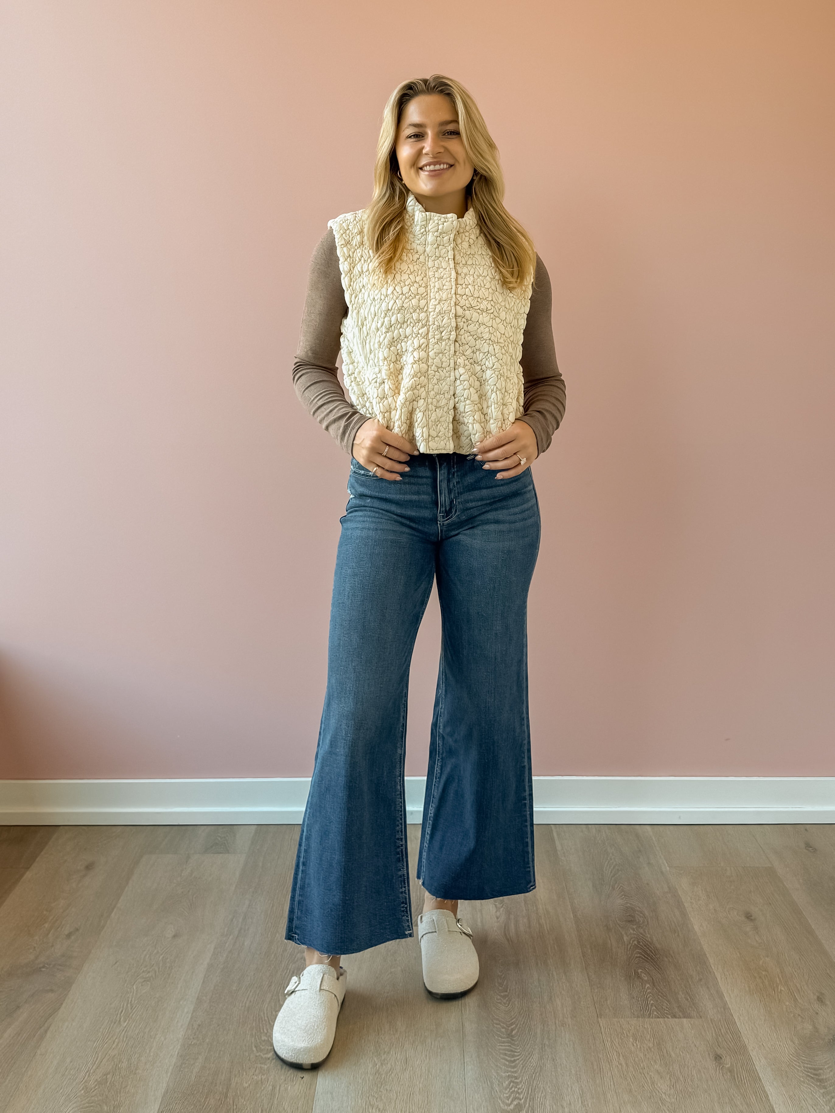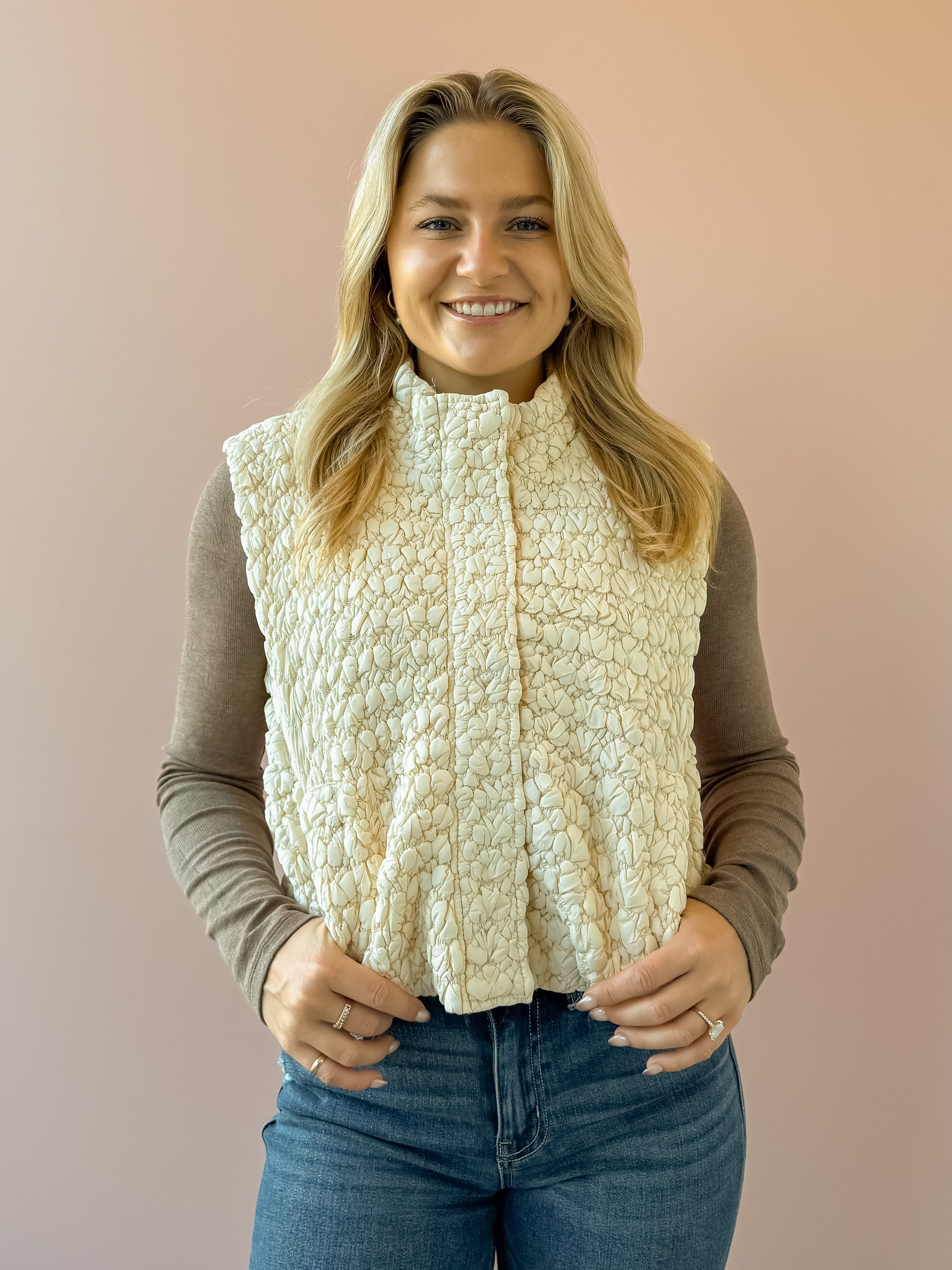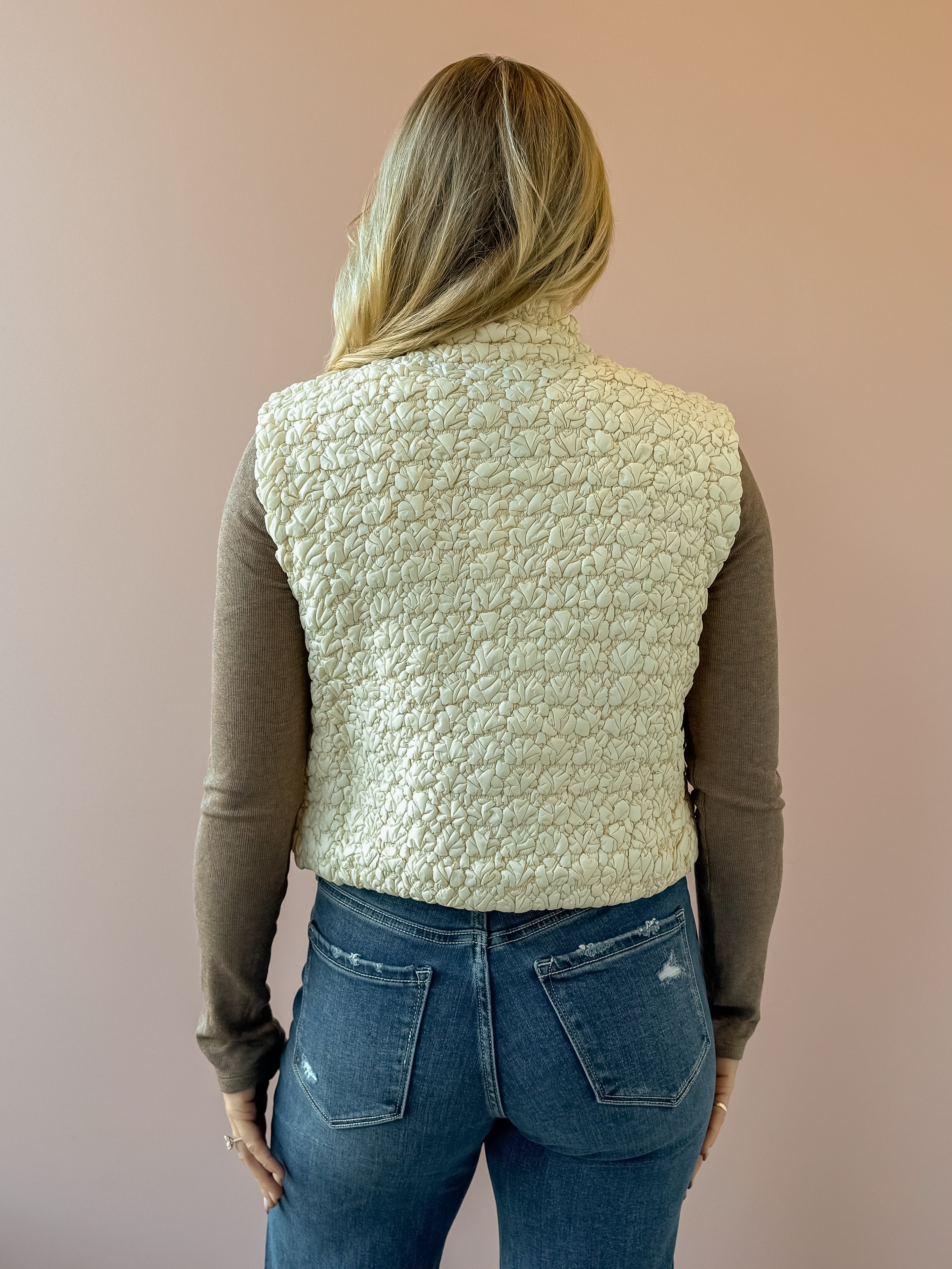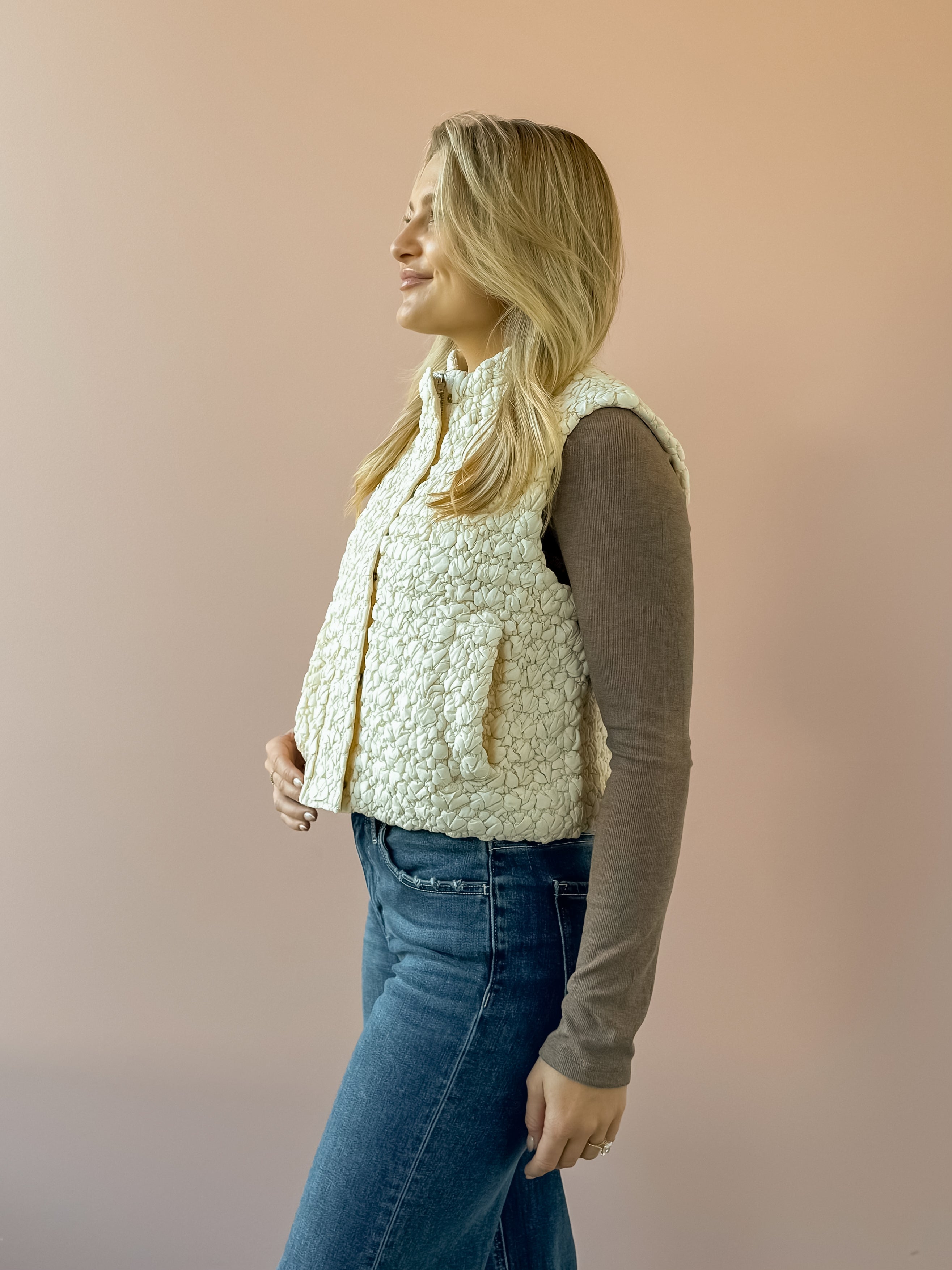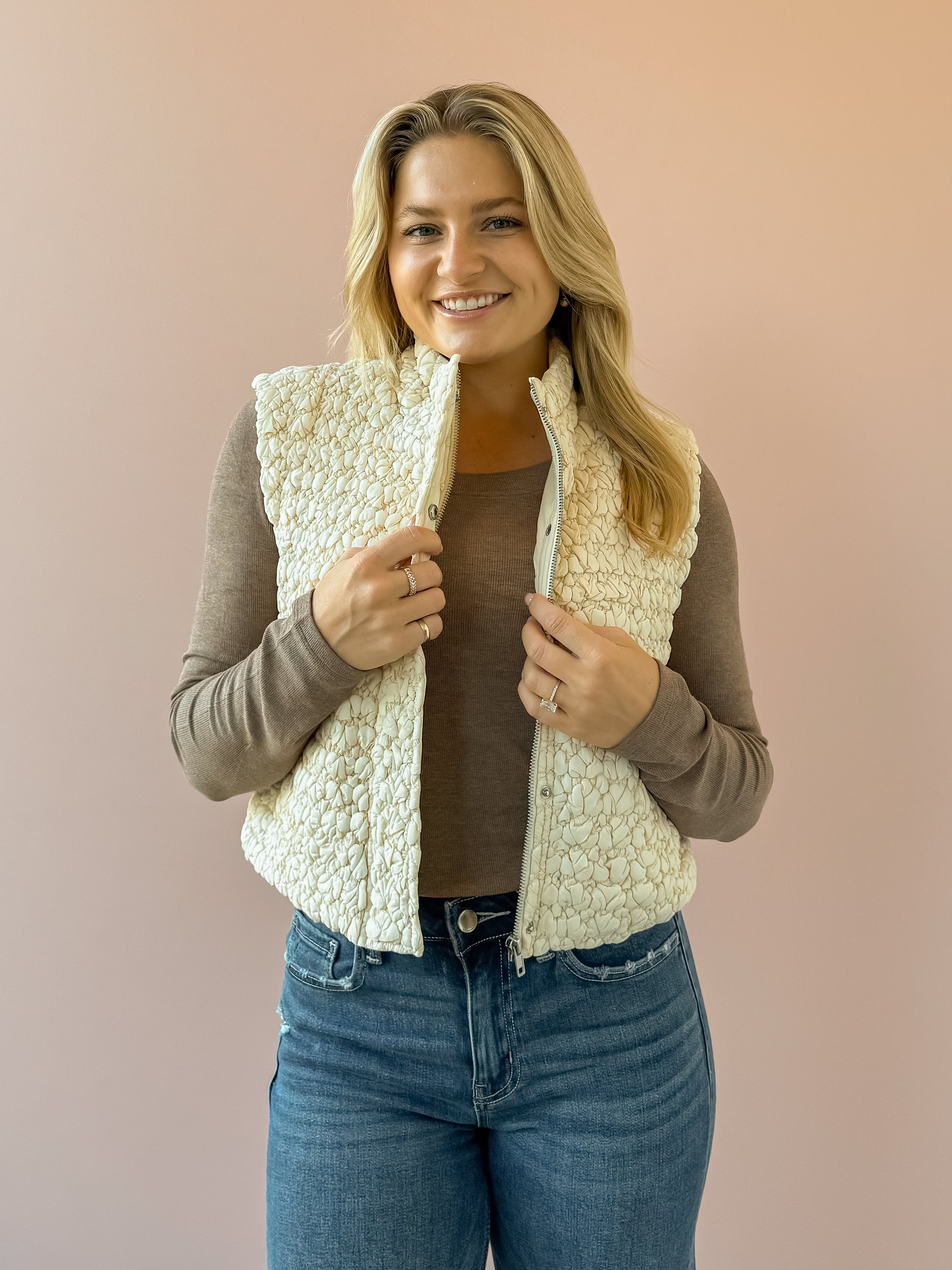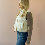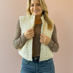Stay warm and stylish with the Arden Quilted Vest. This ivory cropped vest features a full zipper front for easy layering and convenient pockets to keep your essentials close. Its quilted design adds texture and insulation, making it perfect for transitioning through seasons while enhancing your outfit with a modern, sporty edge. Style with a long sleeve or crewneck underneath, denim and sneakers for a chic on-the-go look!