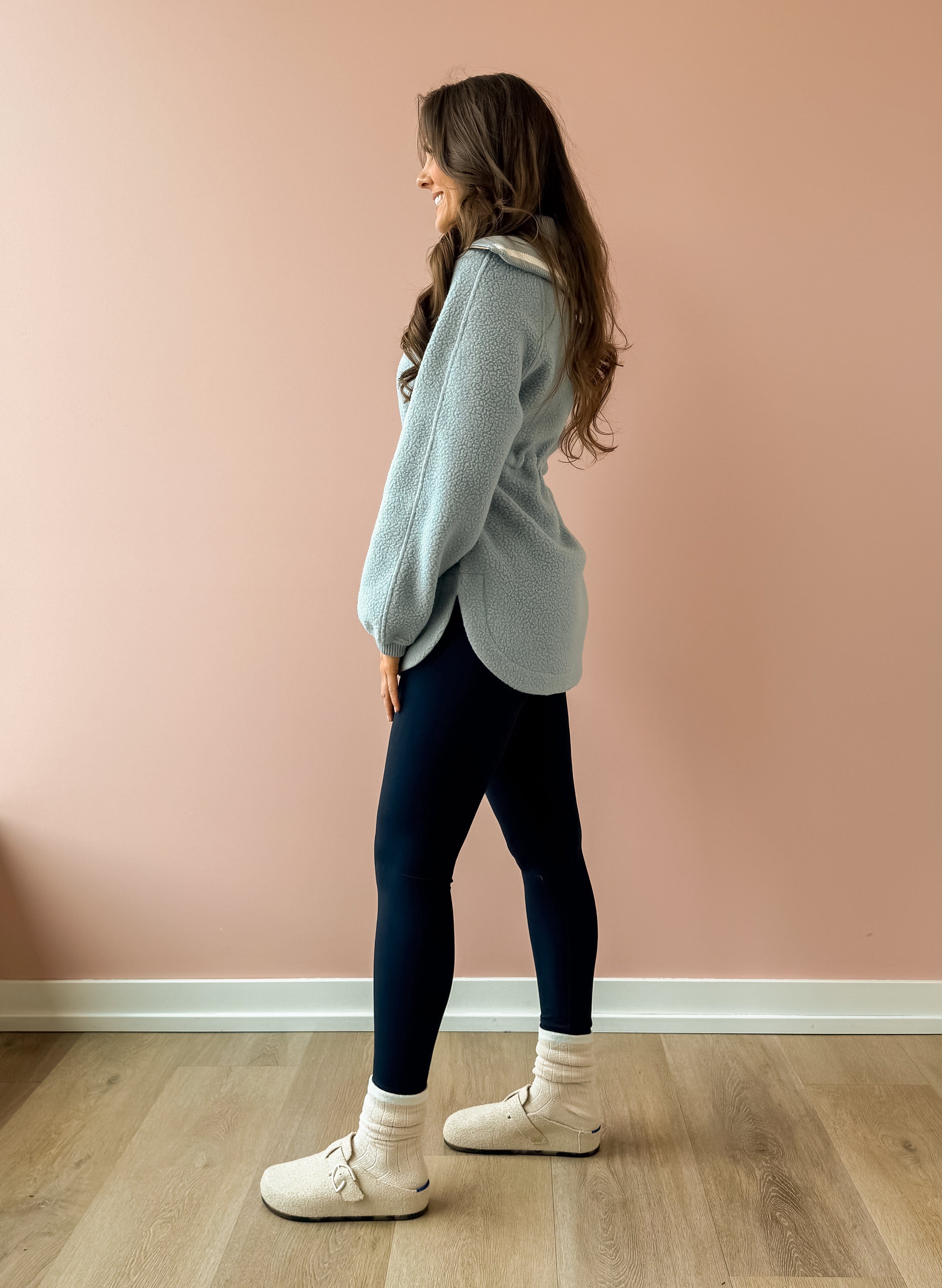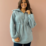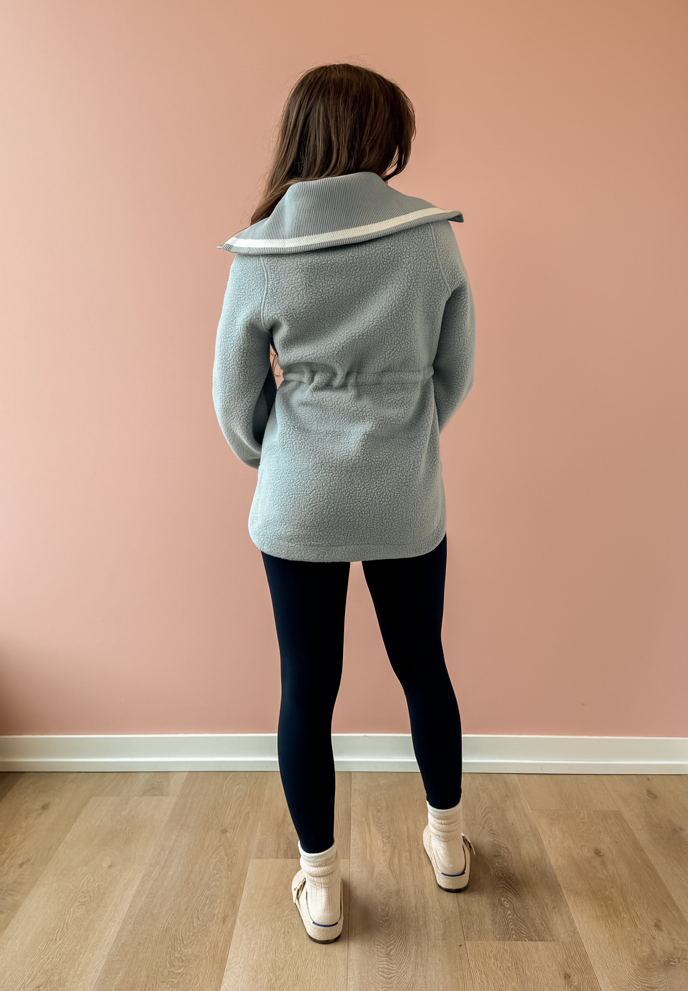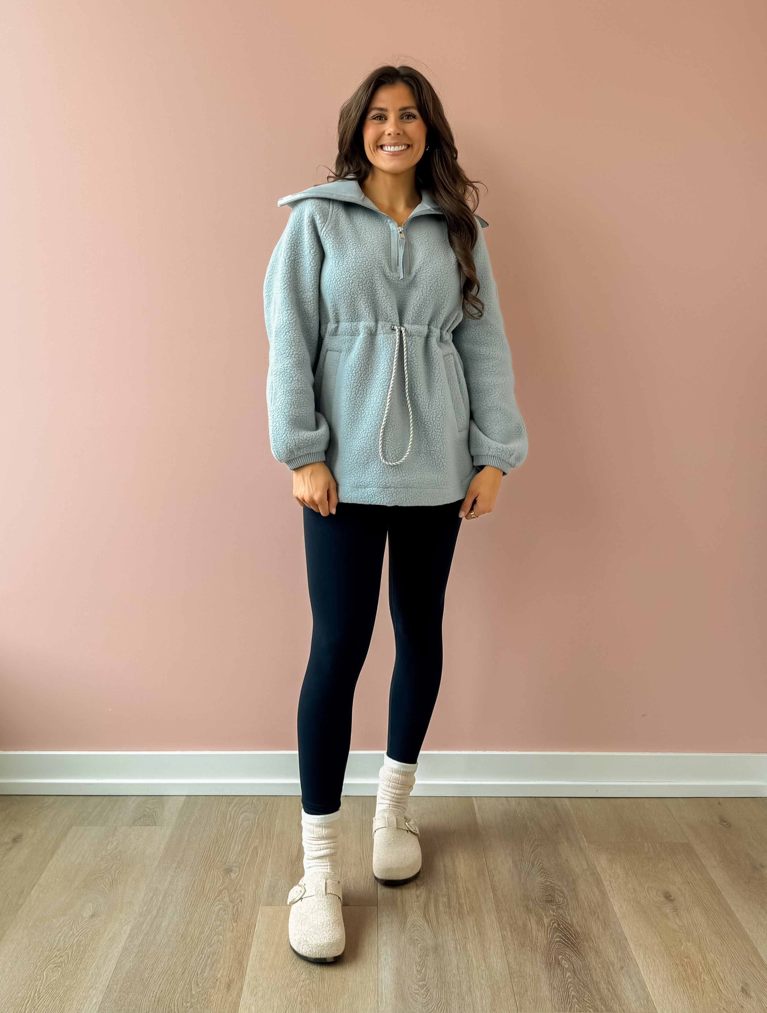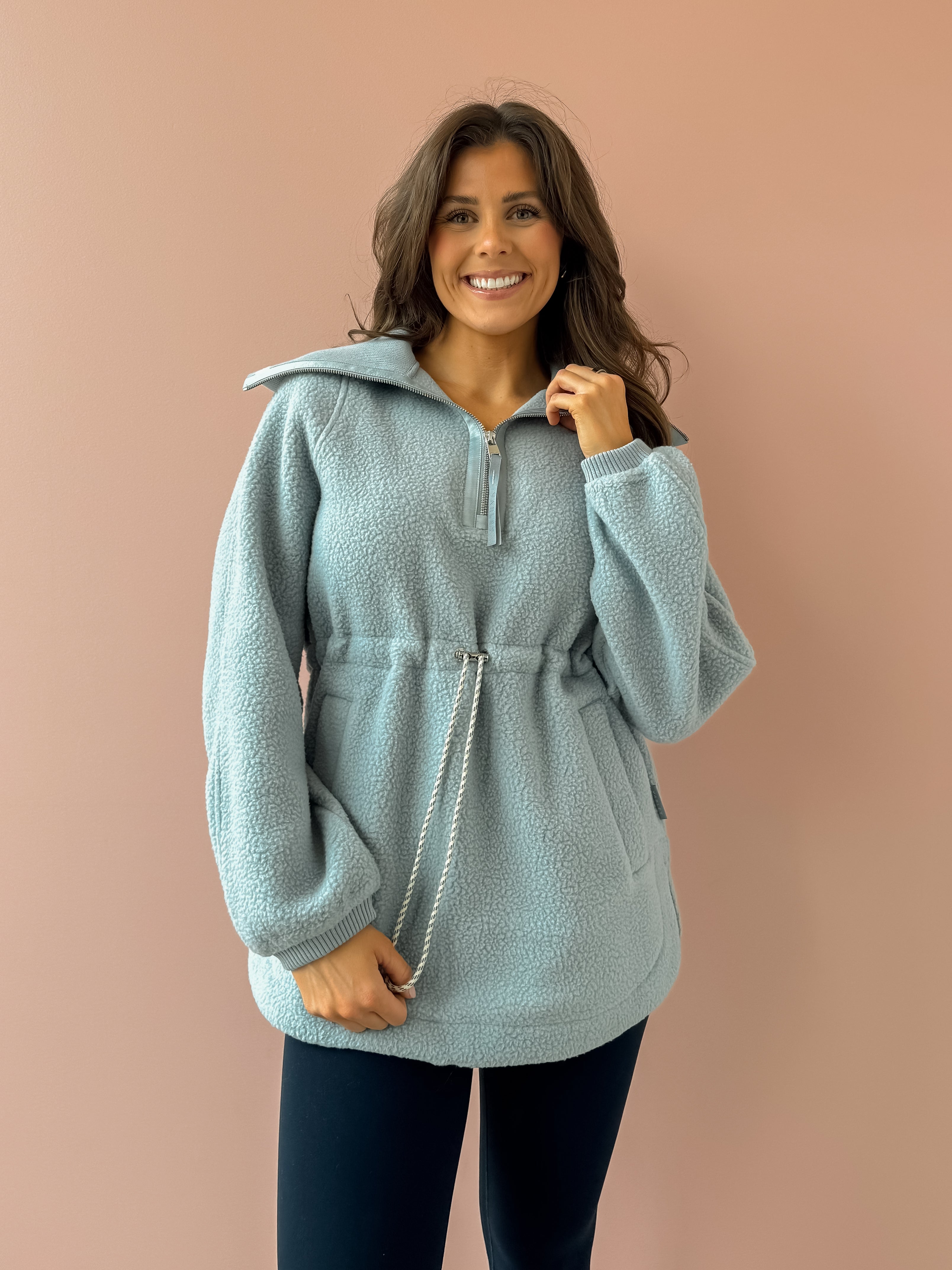 Experience cozy elegance with the Ashby Half Zip Fleece in soft powdered blue. Its longer fit and adjustable waist create a flattering silhouette that moves with you. Crafted from plush fleece, it offers warmth and comfort perfect for busy days. Pair with leggings and sneakers for an effortlessly chic, on-the-go outfit.