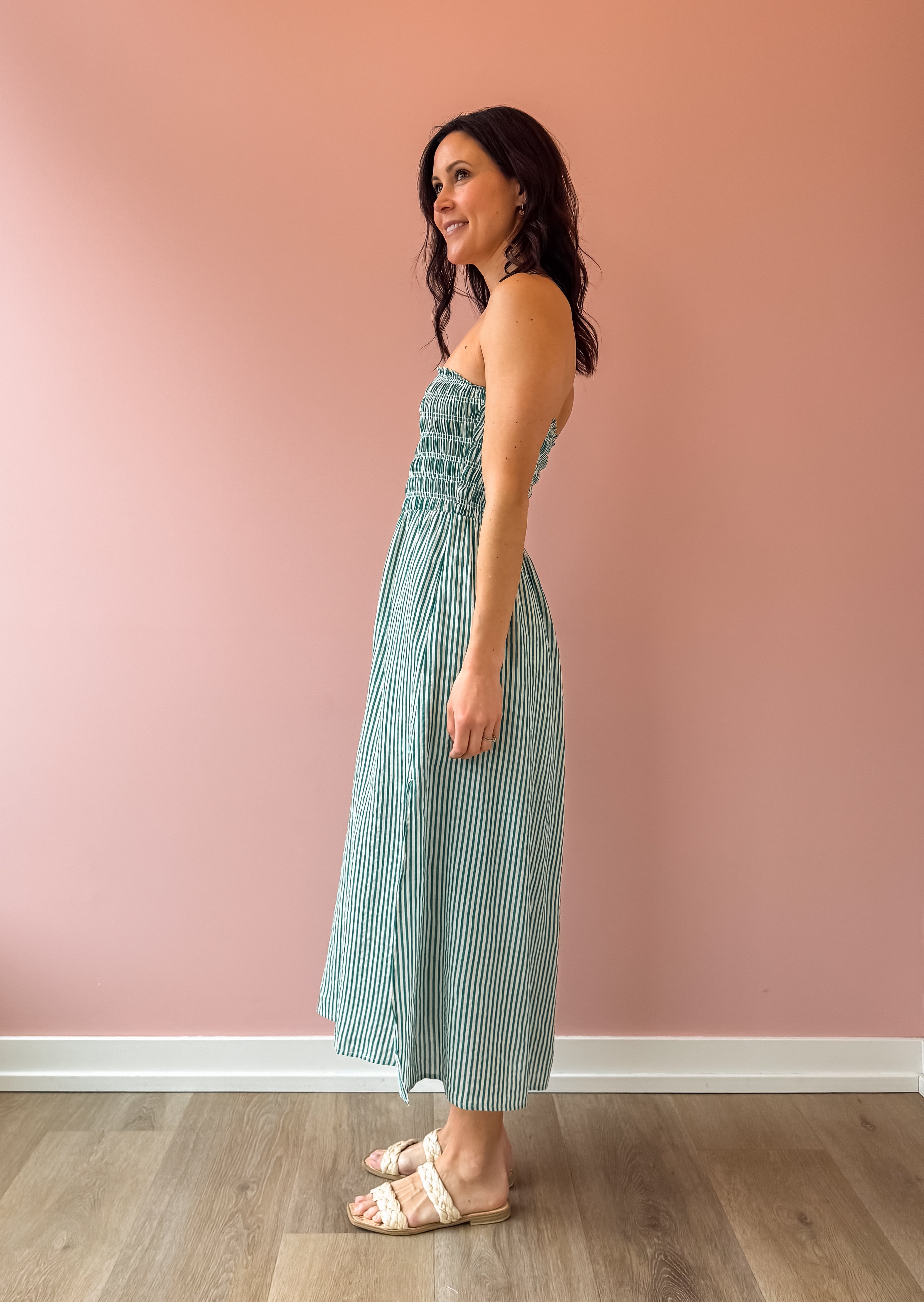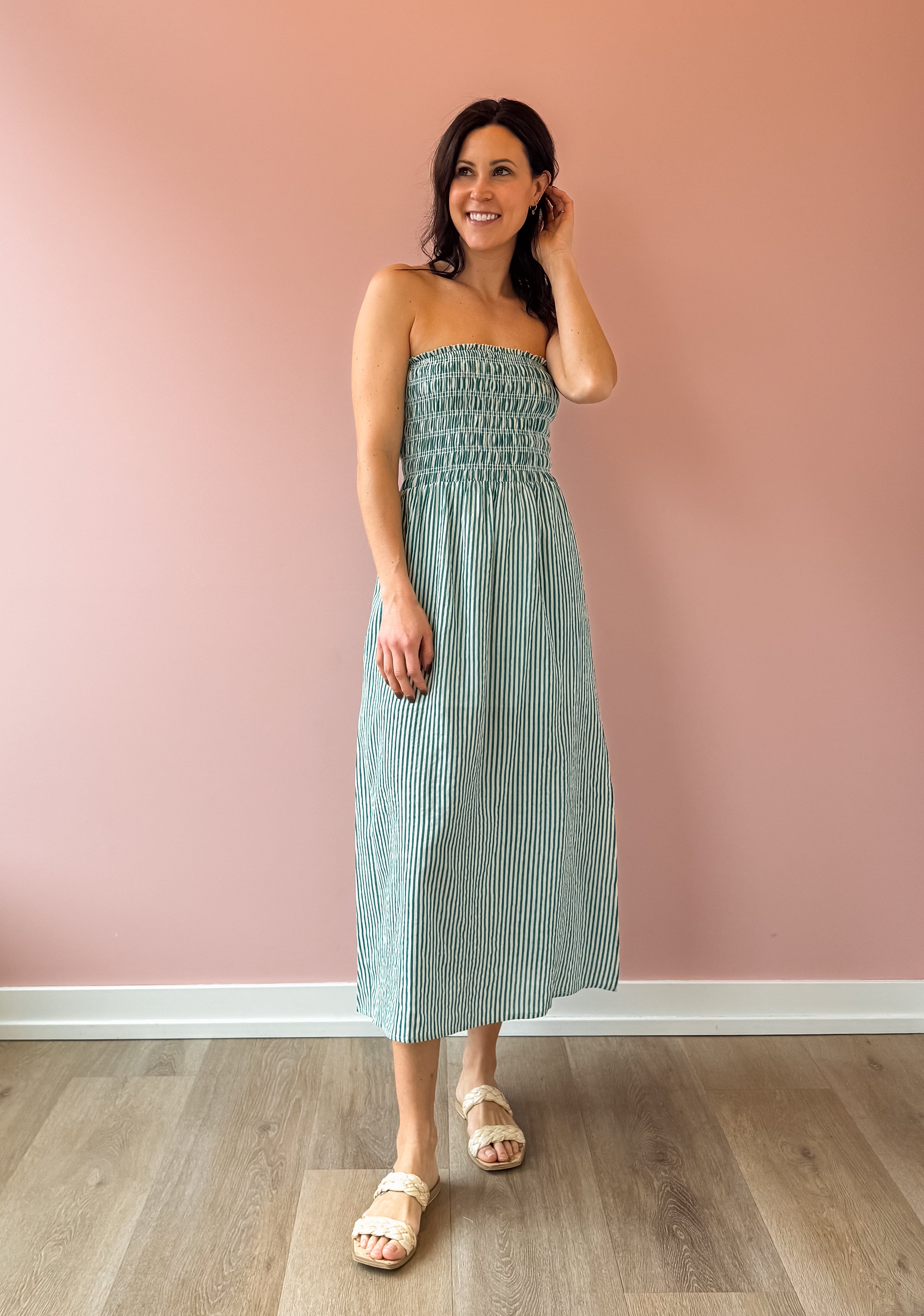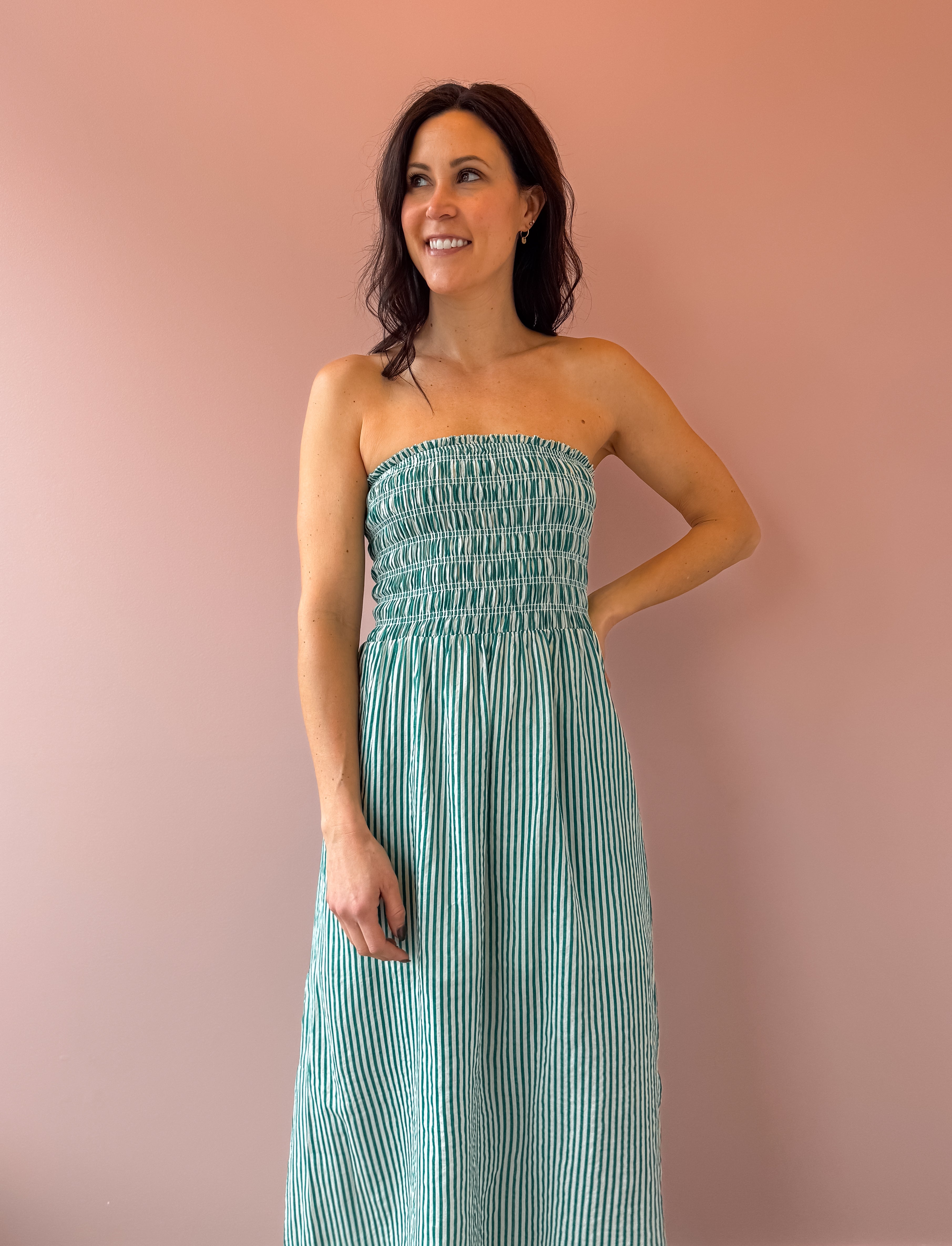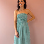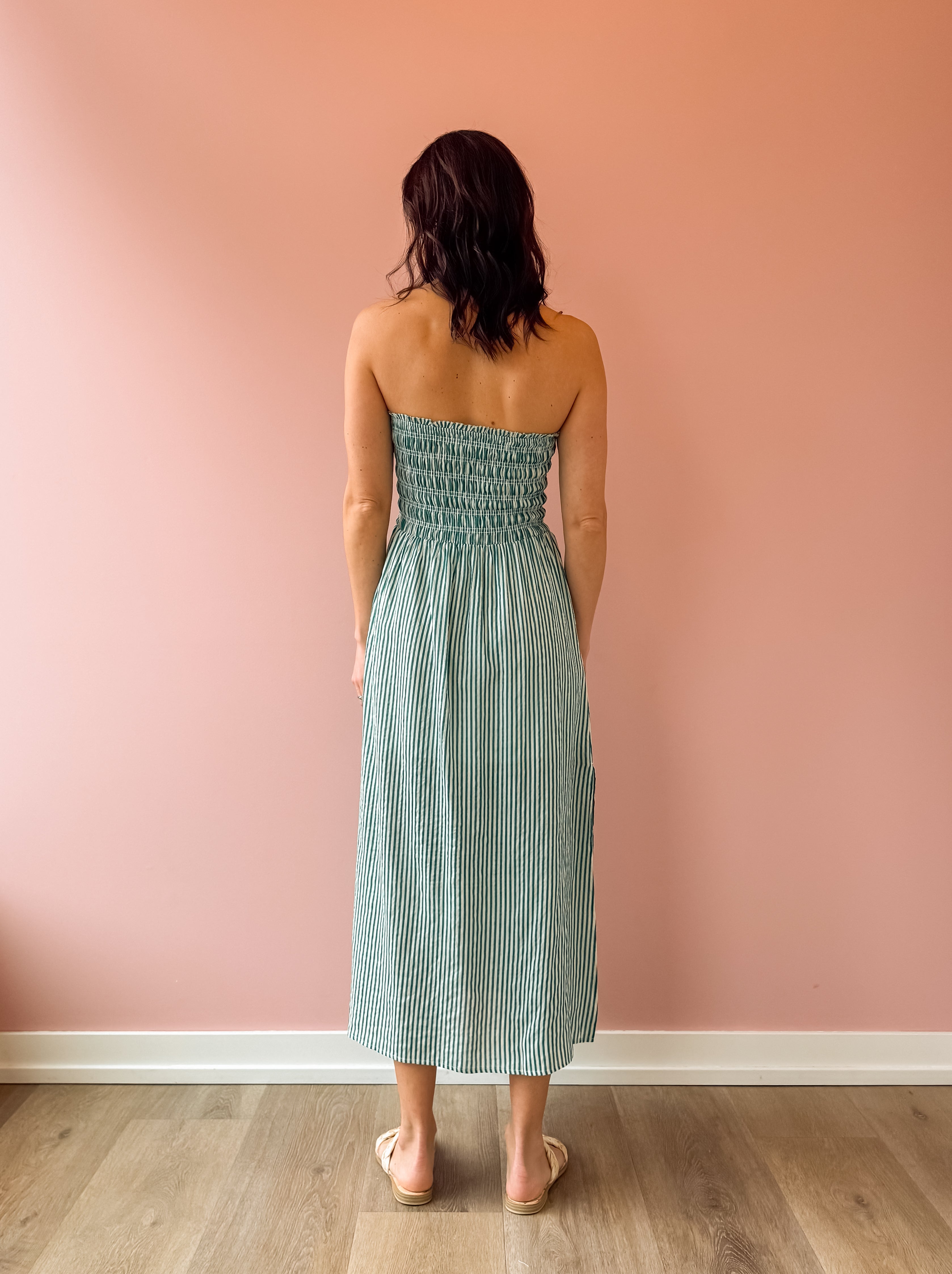 Flirty, fun, and utterly charming—the Ashlin midi dress features a captivating green and white stripe pattern that turns heads. The strapless design elegantly frames your shoulders while the flowing skirt moves gracefully with every step. Practical side slits add ease and style. Pair with sandals for effortless date night glamour or dress up for special occasions.