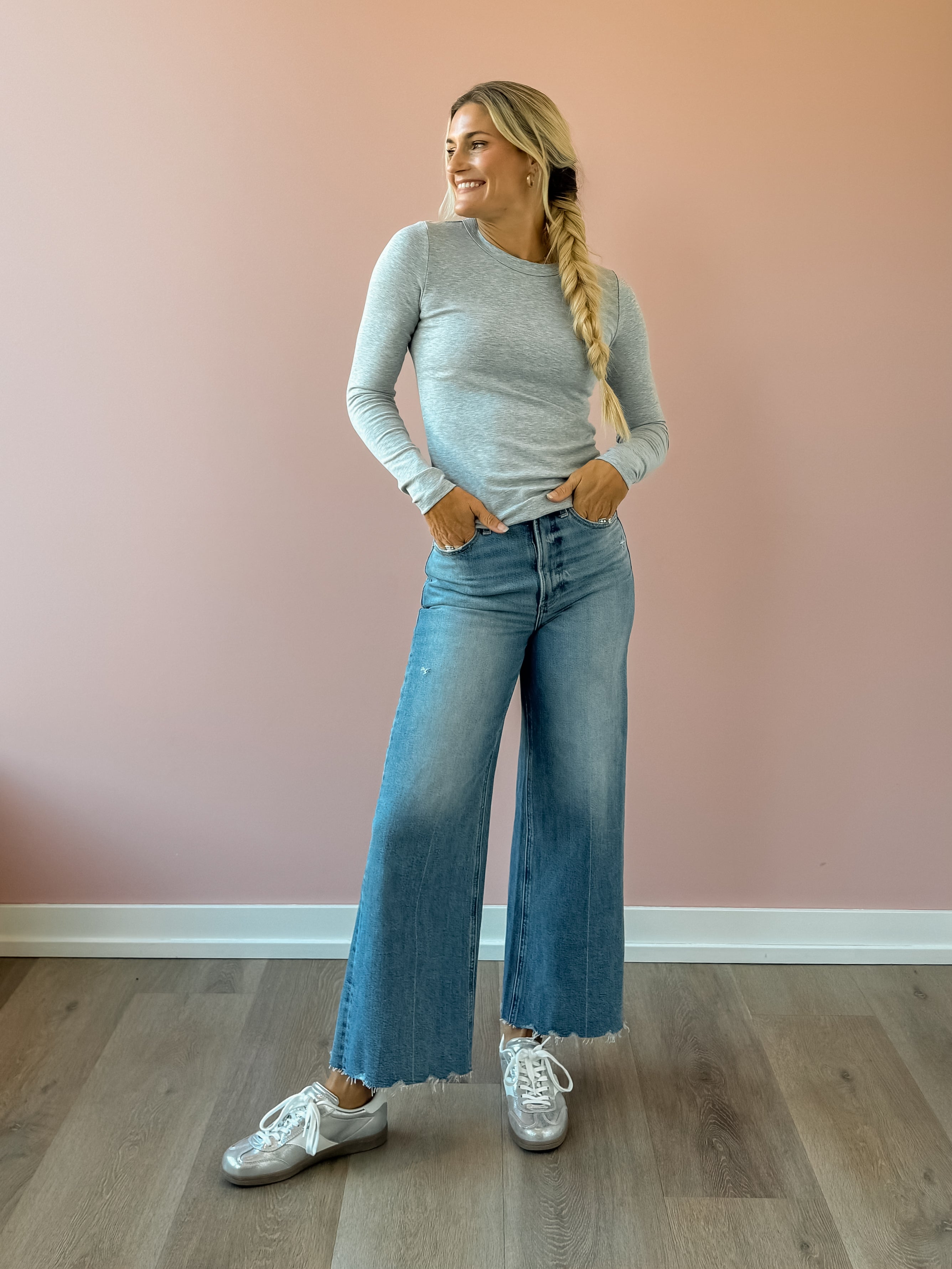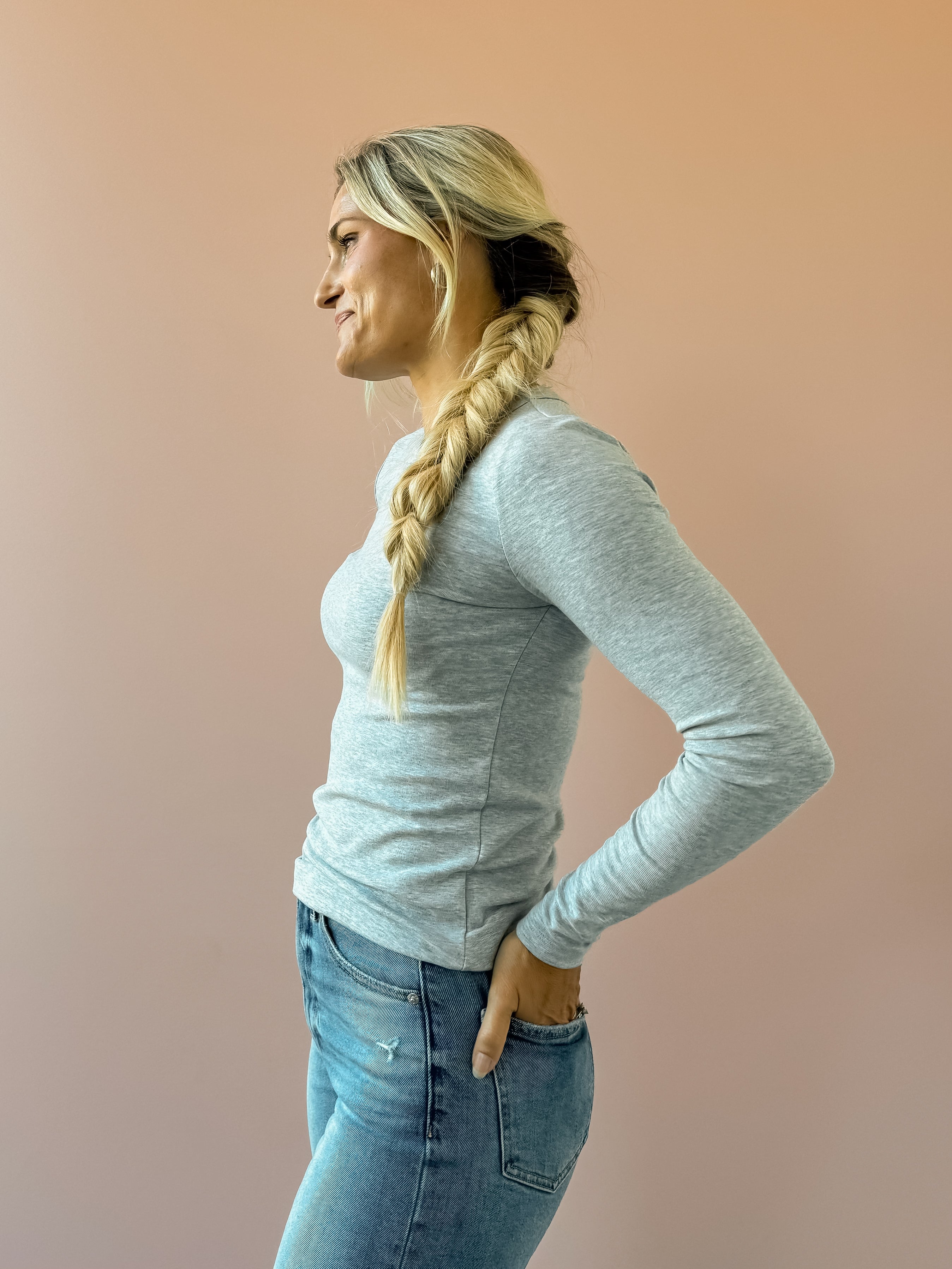 The Audrey Long Sleeve is soft, cozy, and made for effortless everyday wear. Its gentle gray tone and classic crew neckline make it a timeless staple you’ll reach for again and again. The relaxed-yet-polished fit pairs perfectly with everything from tailored trousers to your favorite worn-in jeans. Whether layered under a jacket or worn on its own, Audrey is the piece you’ll live in all season.