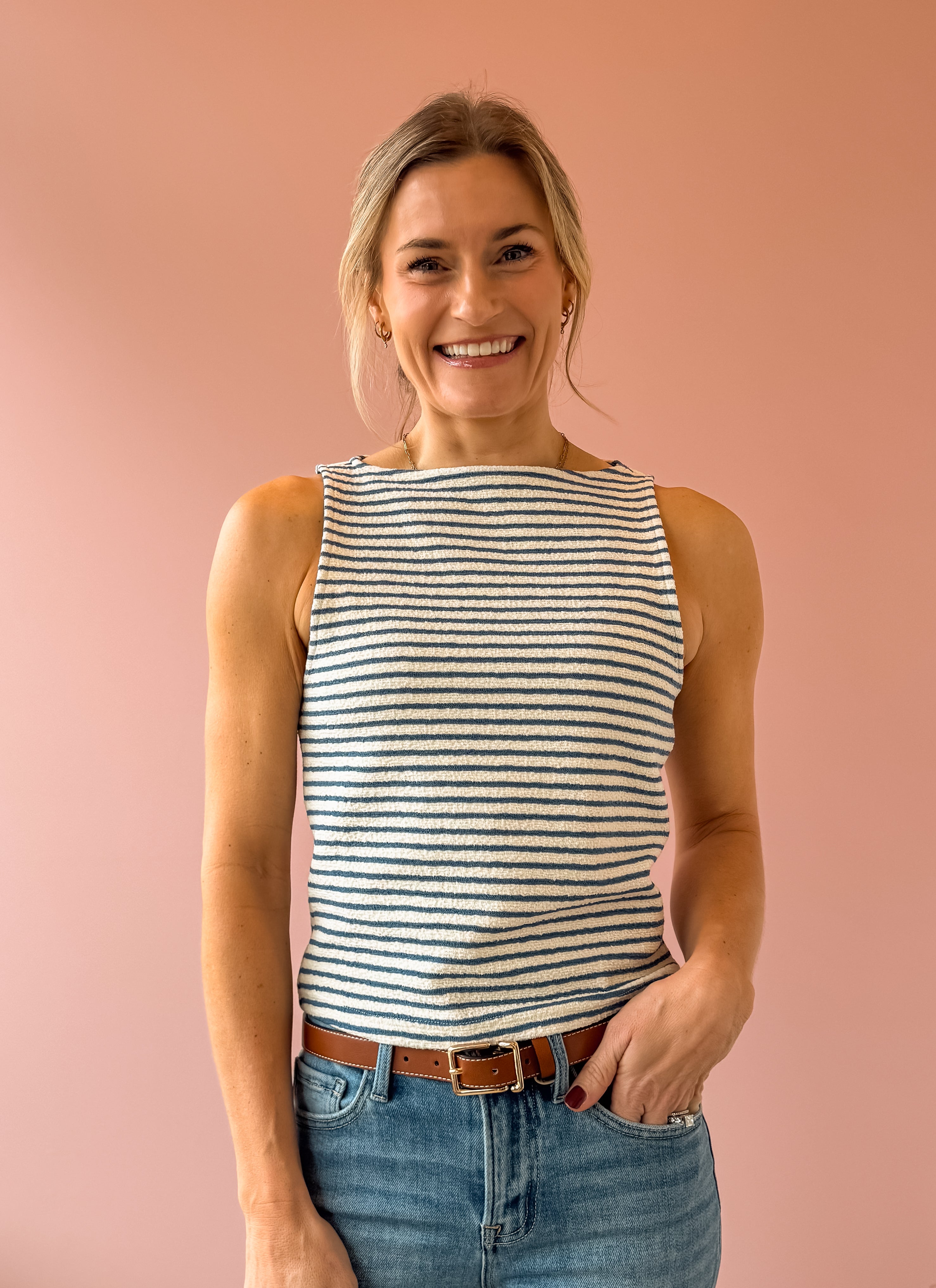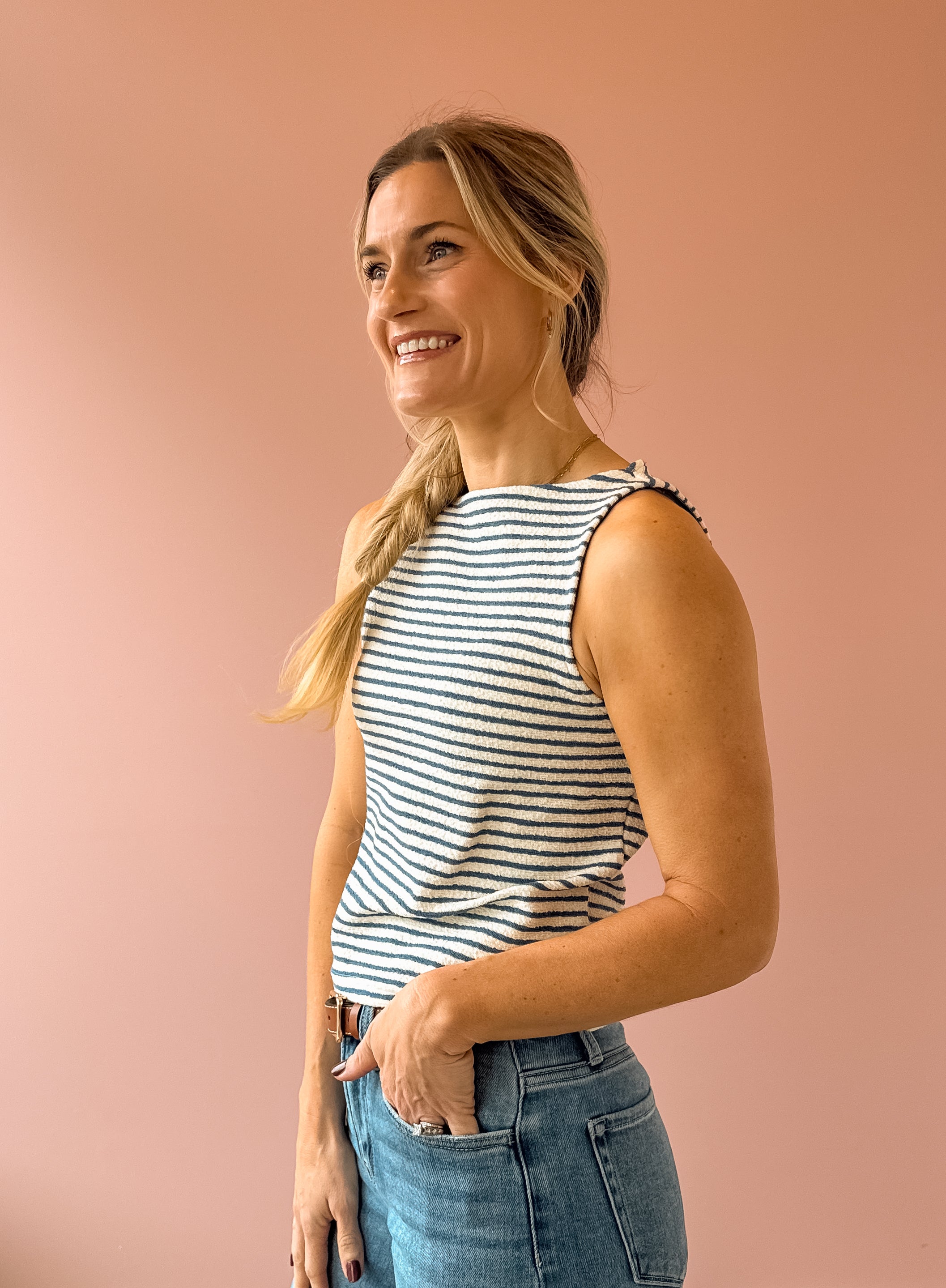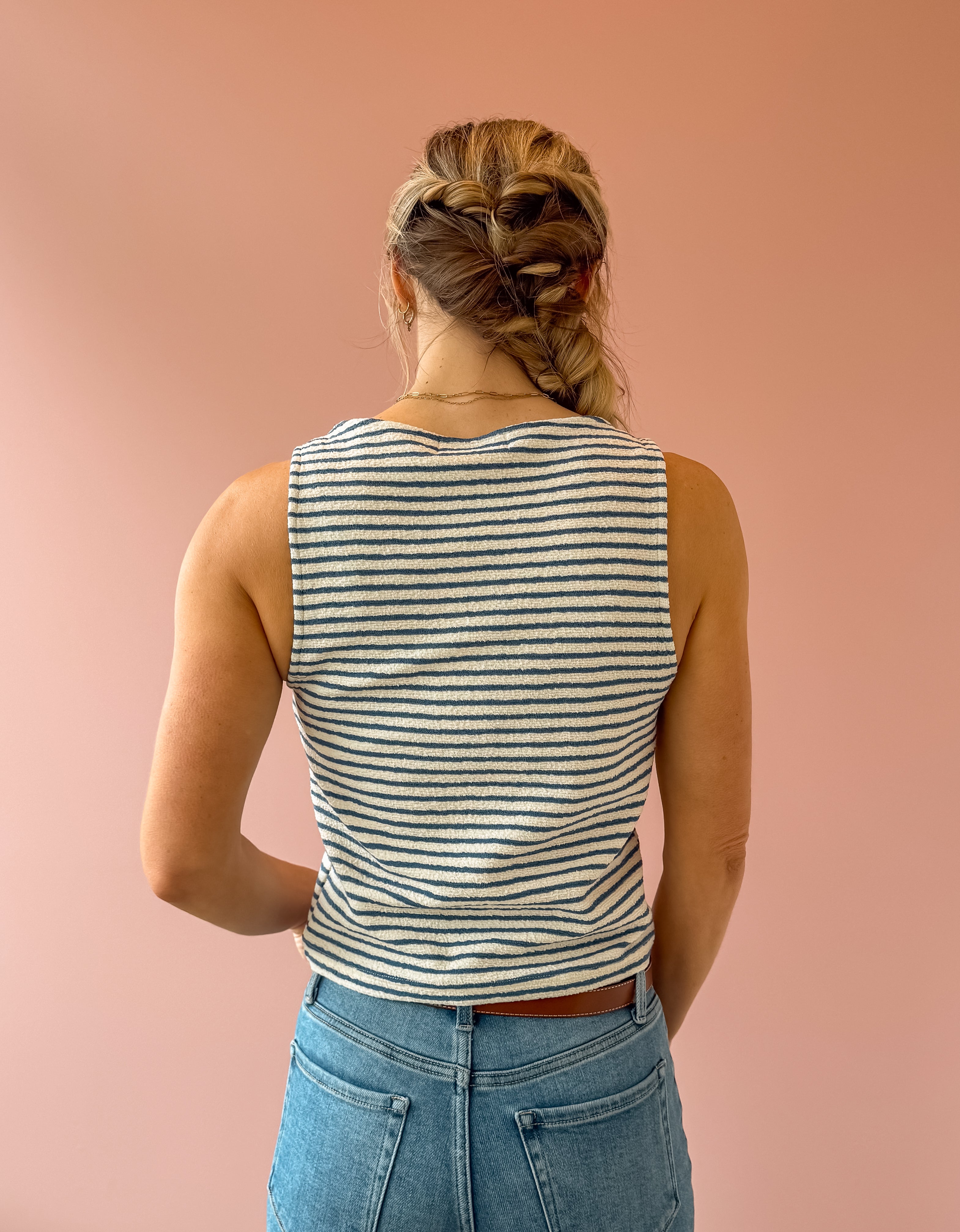 The Baby Bud Tank is a versatile sleeveless essential in soft blue and ivory tones. This high-neck knit tank features a relaxed fit that hits right at the hem, making it perfect for layering or wearing solo. Pair it with denim and sandals for an effortless, on-the-go look that works from casual outings to weekend adventures.