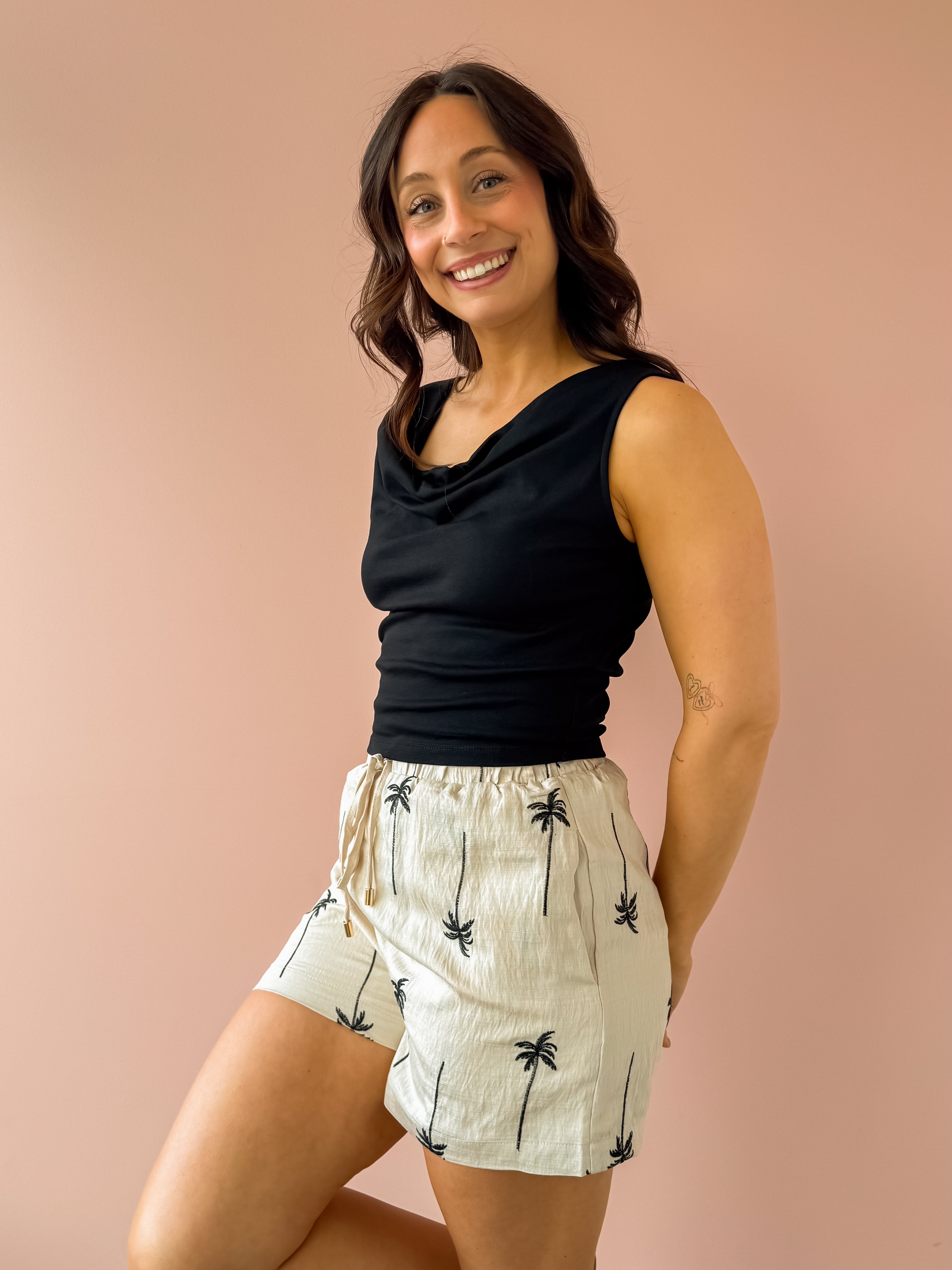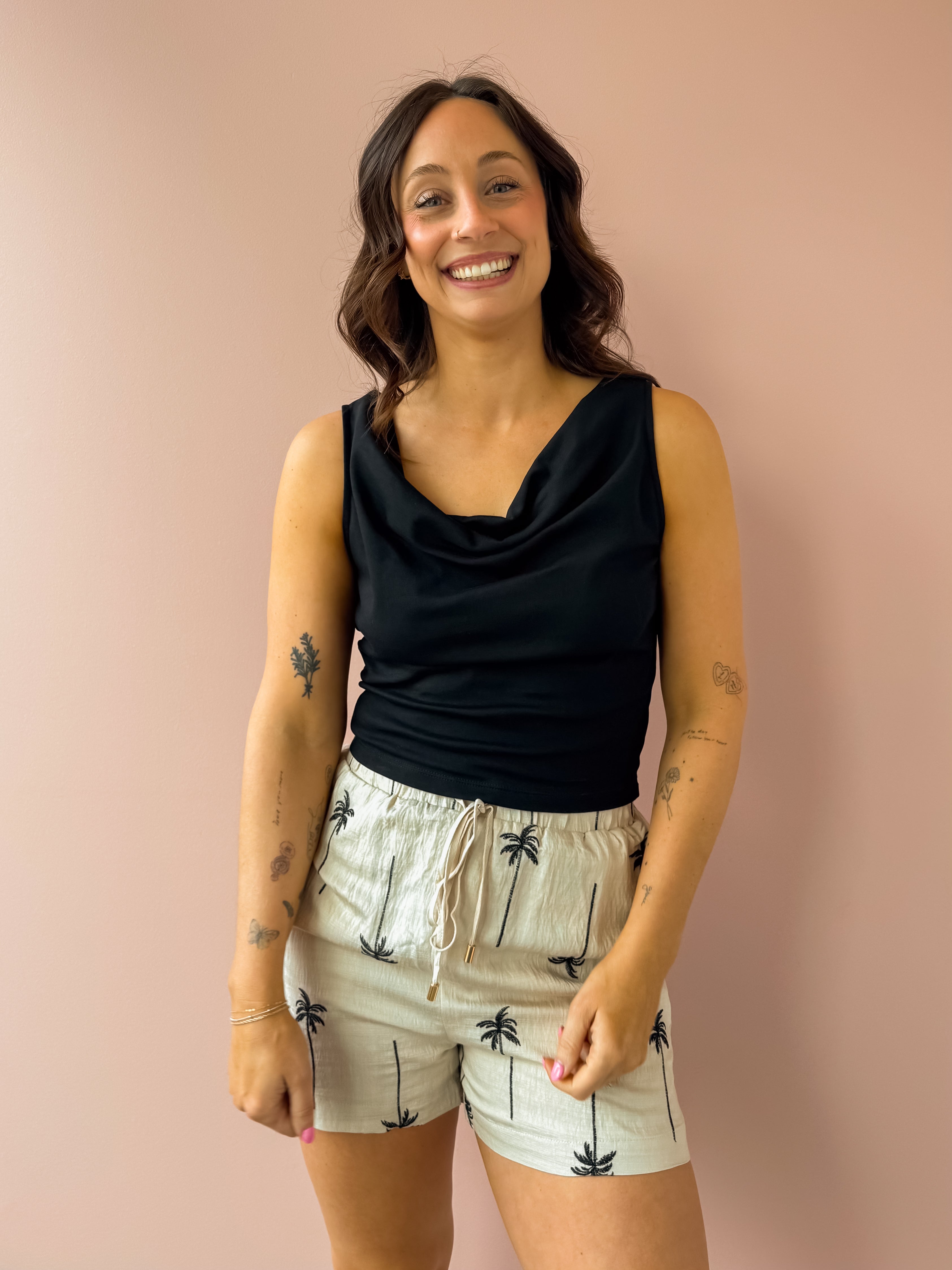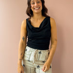 The Bella Top is a timeless black sleeveless essential with an elegantly draped neckline that adds feminine charm to any outfit. Cut to hit right at the hem, it pairs effortlessly with jeans and flats for a polished, classy look. Perfect for creating versatile everyday styles with timeless appeal.