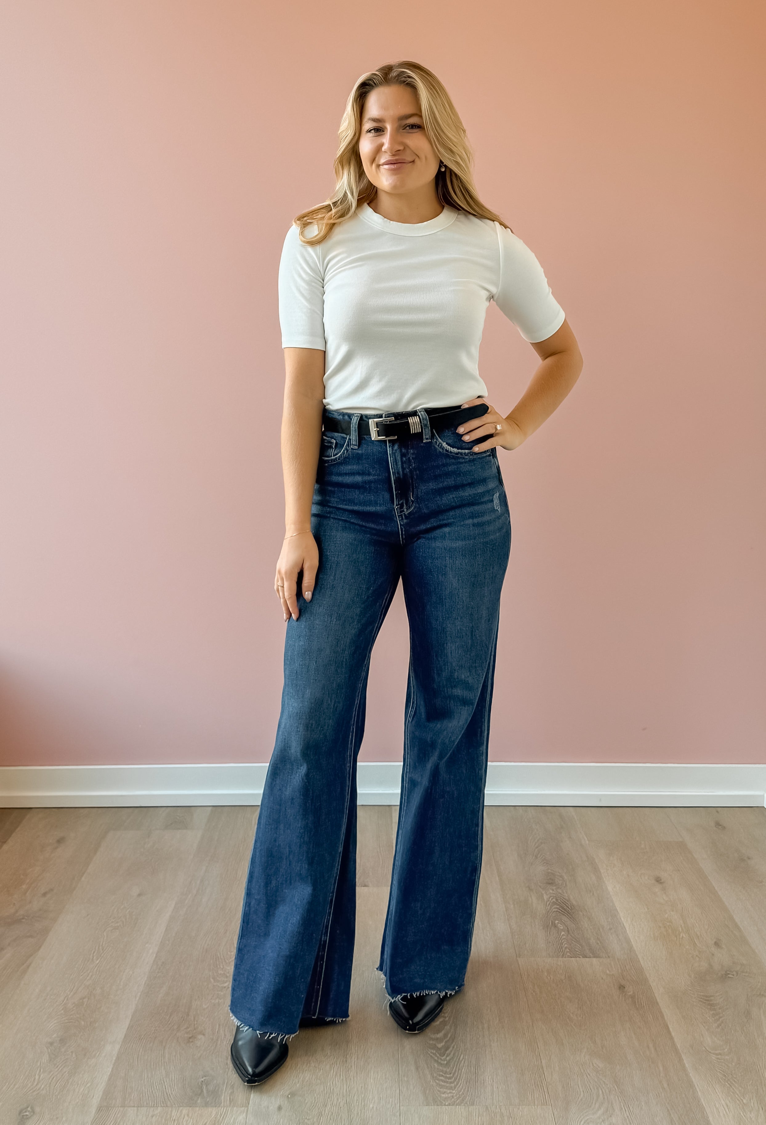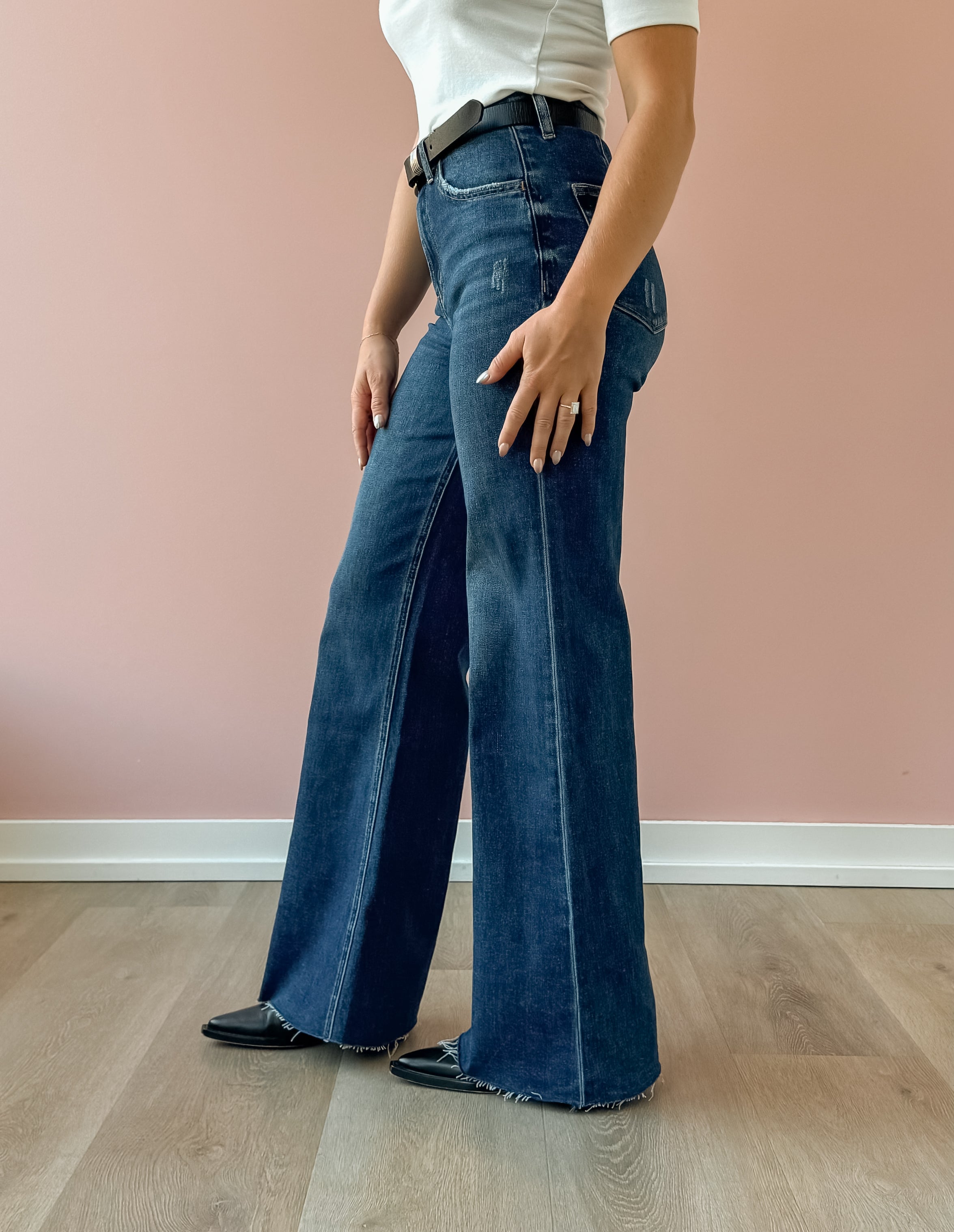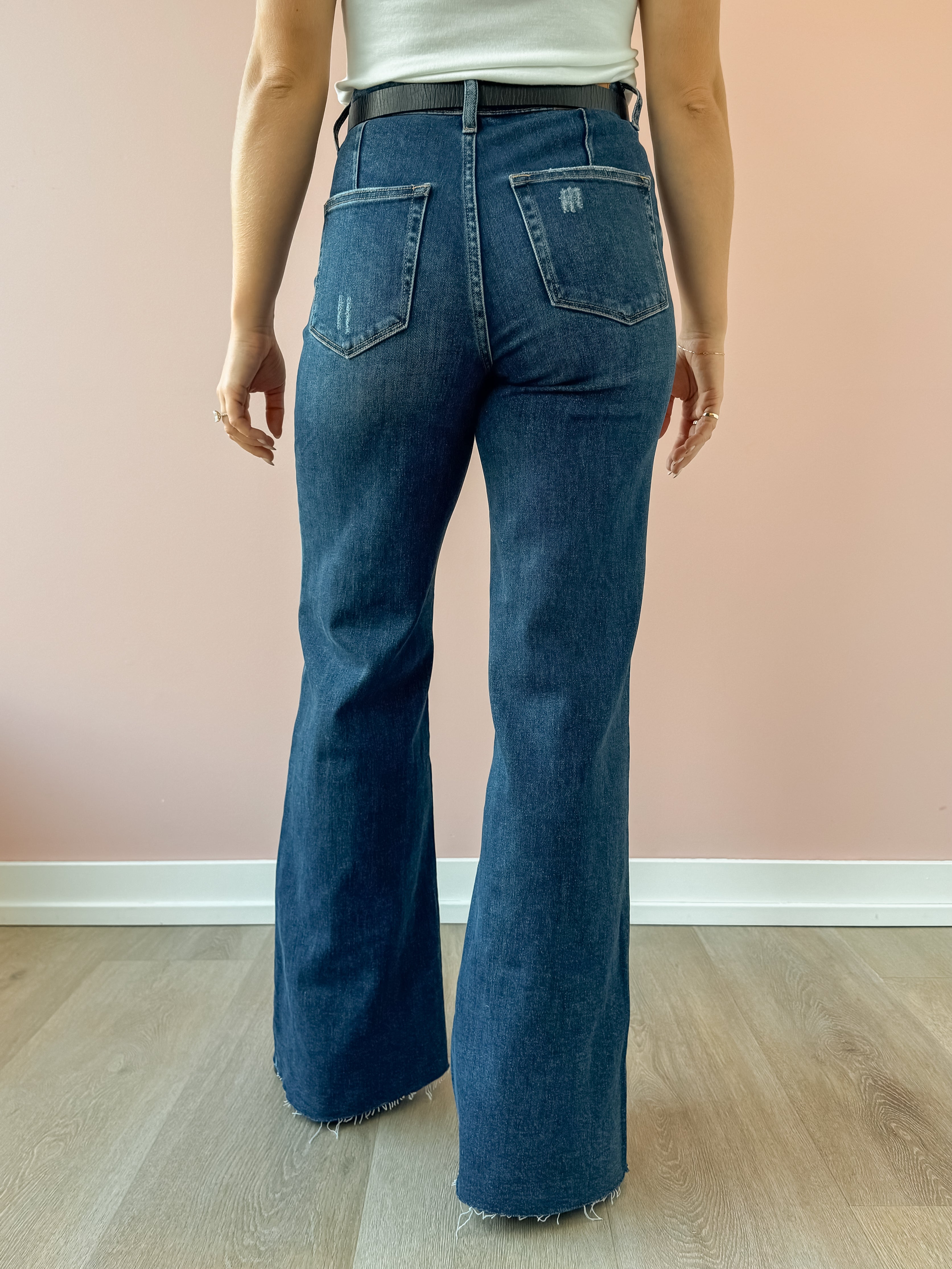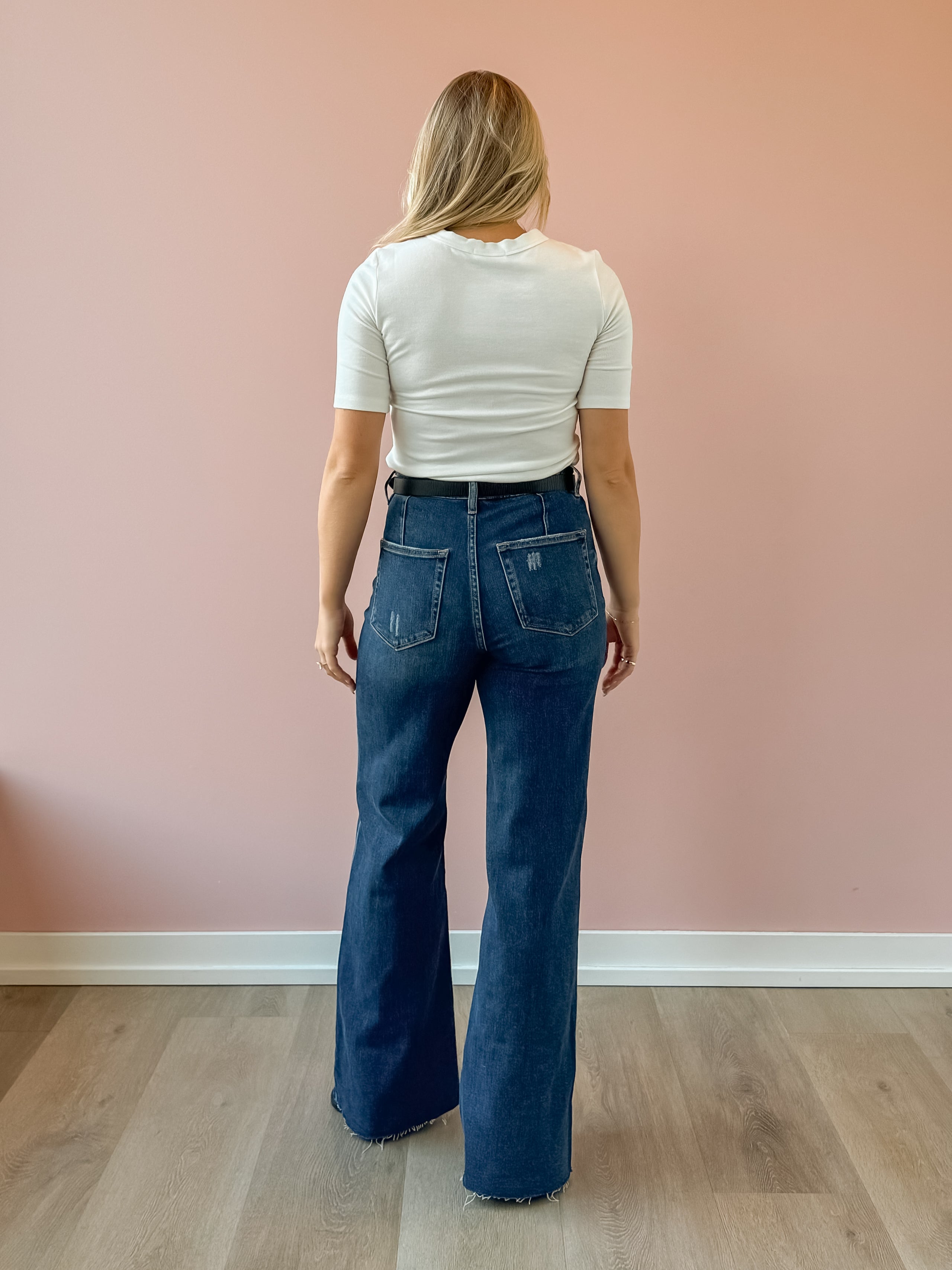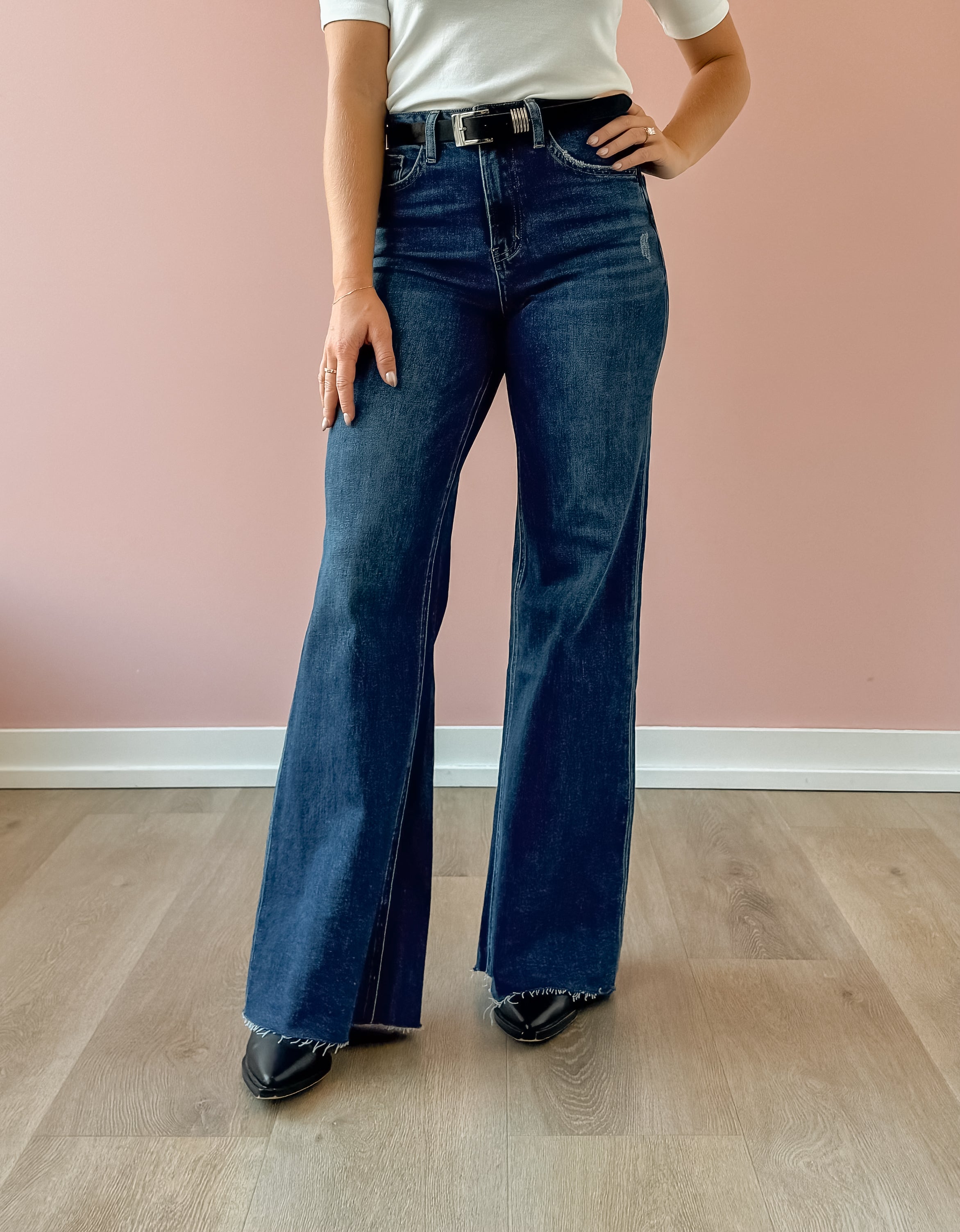 Elevate your denim game with the Peyton Wide Leg Jean in a rich dark wash. With a high-rise waist and flattering wide-leg silhouette, these jeans combine timeless shape with modern ease. The raw hem adds a subtle edge, perfect for dressing up with a blazer or keeping it casual with sneakers. Effortlessly versatile, they’re a must-have for a chic, polished wardrobe.