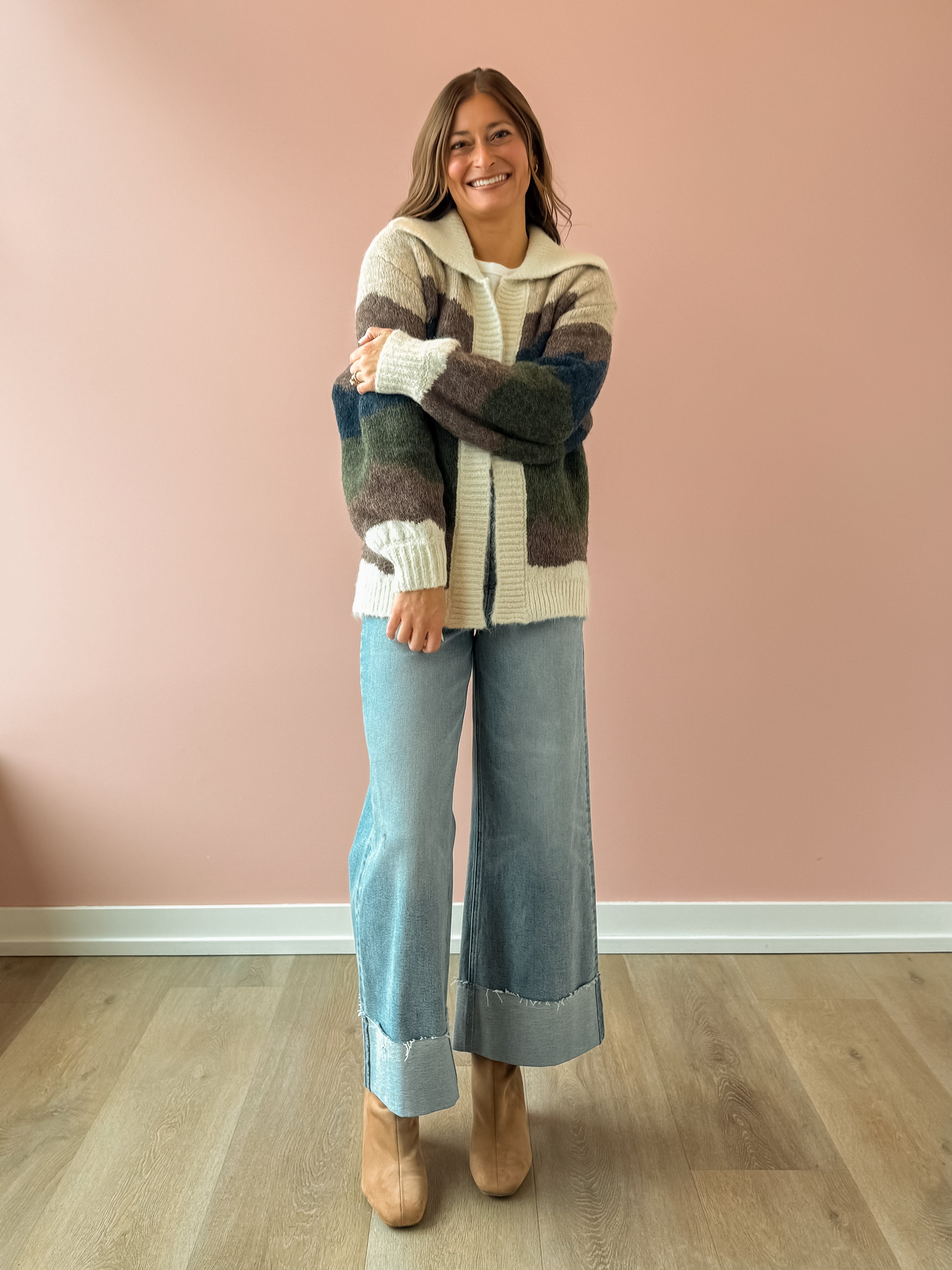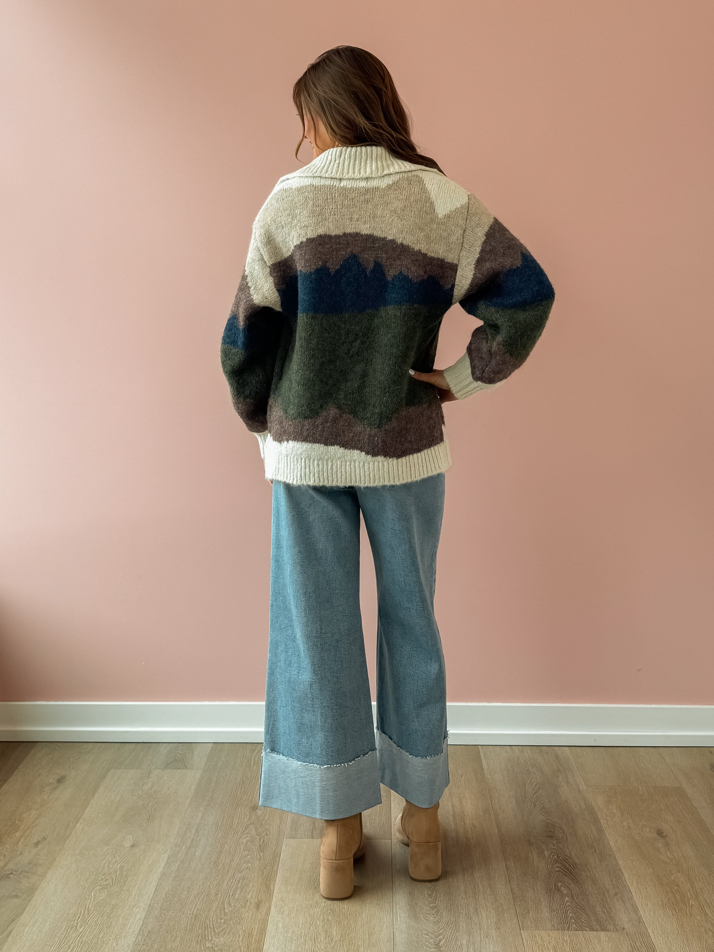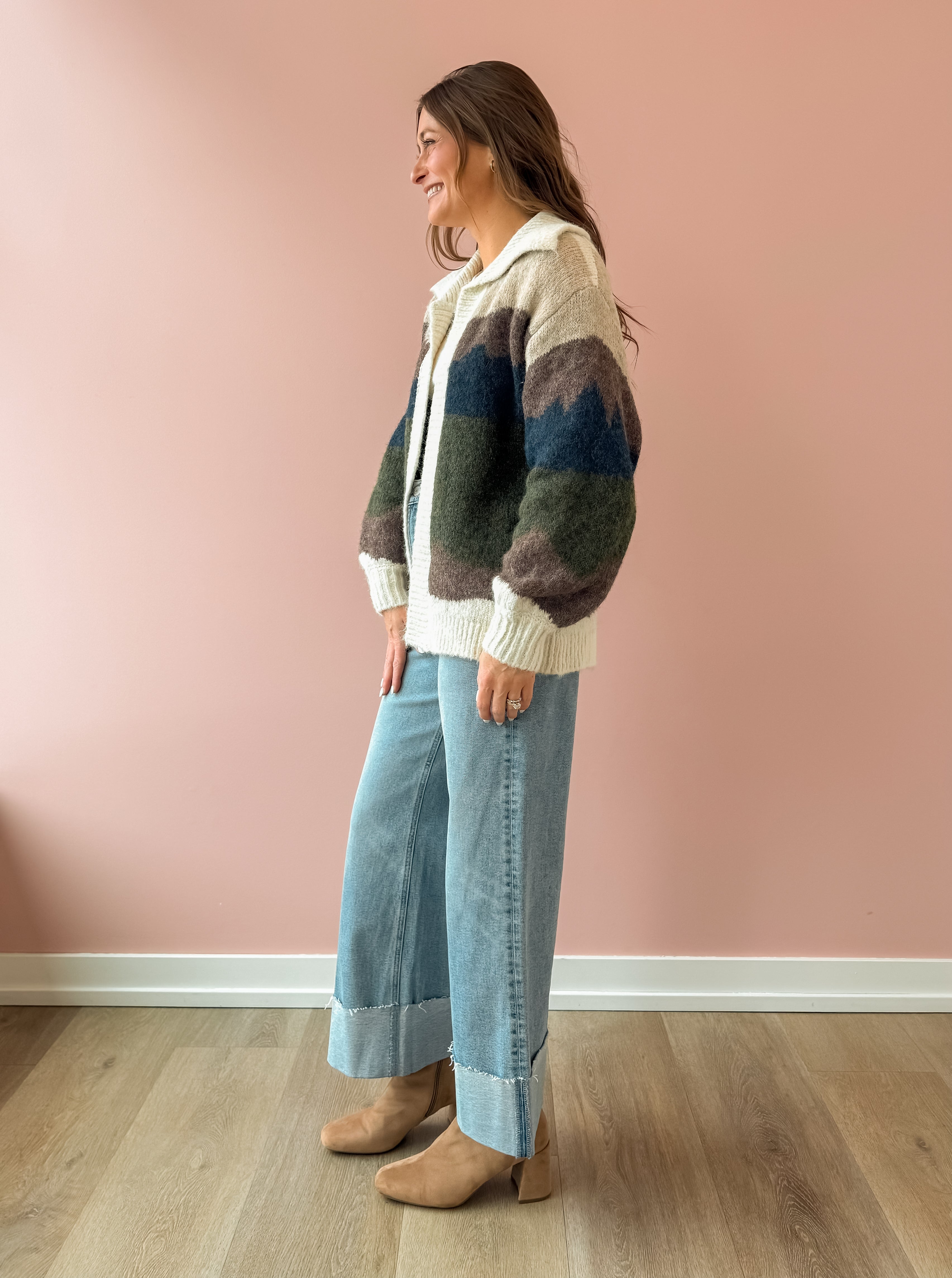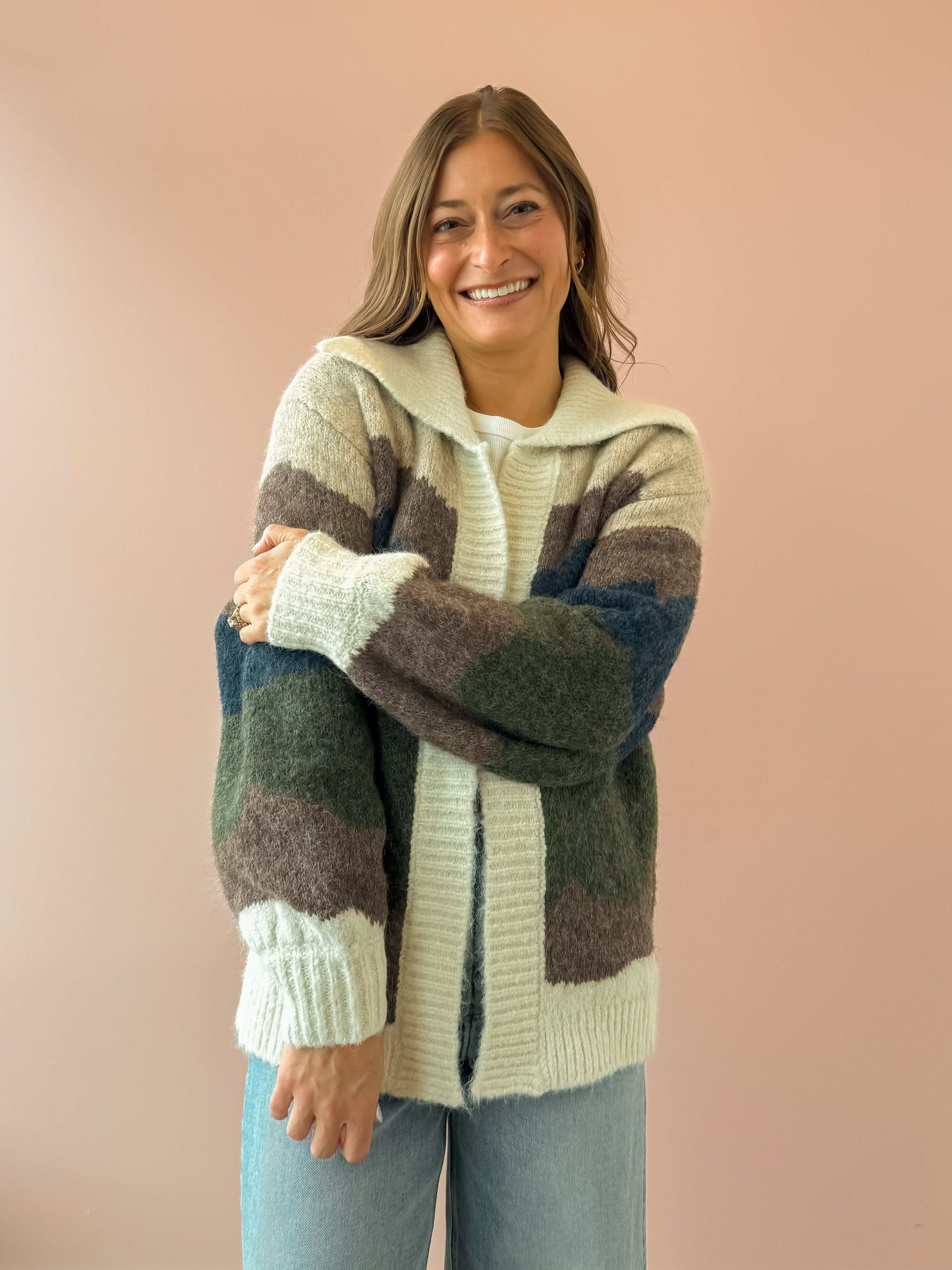 The Birdie Cardigan is your go-to layer for effortless style. Featuring a stunning landscape design in rich blues, greens, and warm browns, this piece brings visual interest to any outfit. Crafted from incredibly soft, cozy fabric, it's the perfect throw-on for those moments when you want to add polish and comfort at once. Whether you're dressing up basics or adding texture to your everyday look, this cardigan elevates everything it touches. We love this with denim and boots!