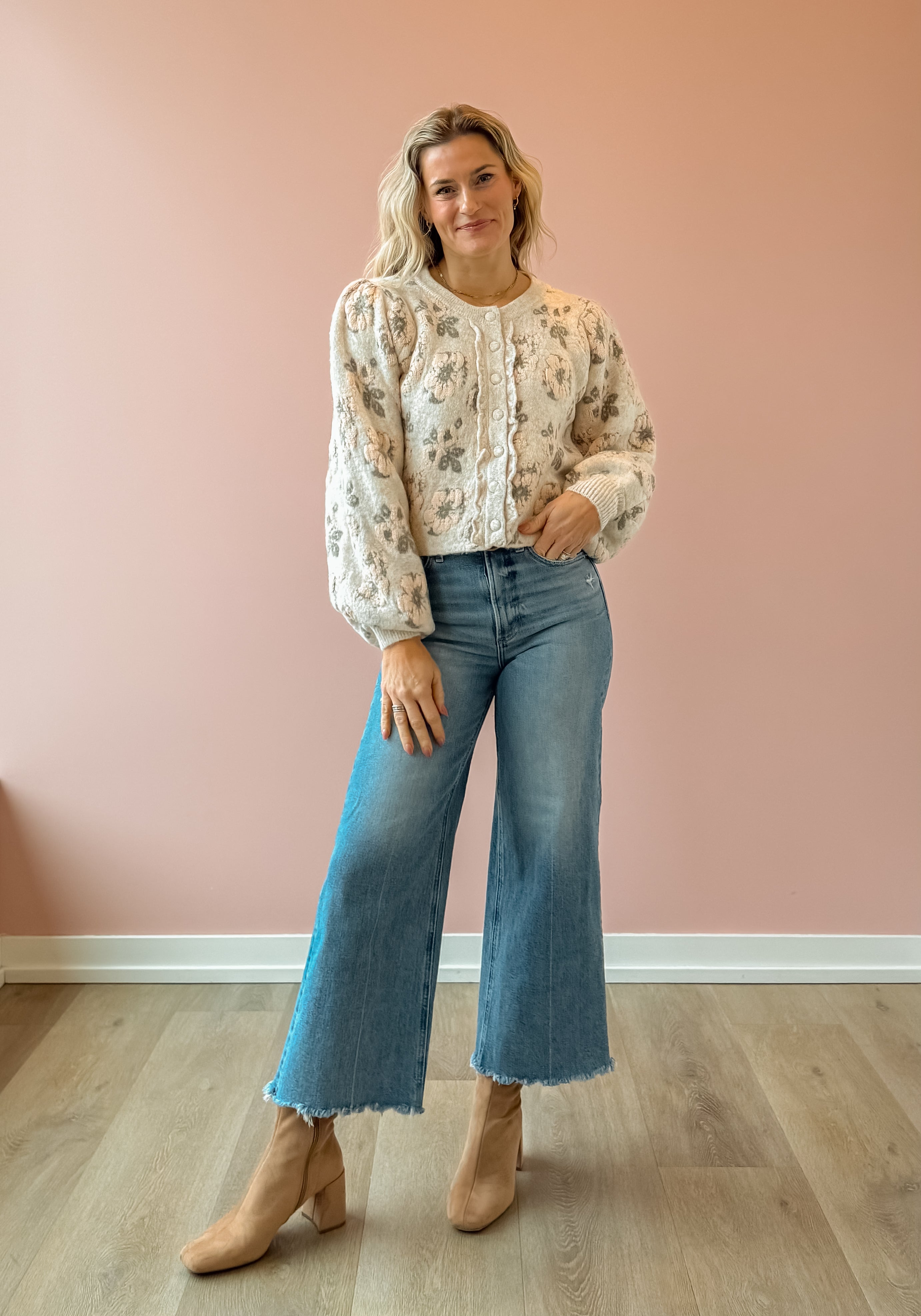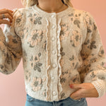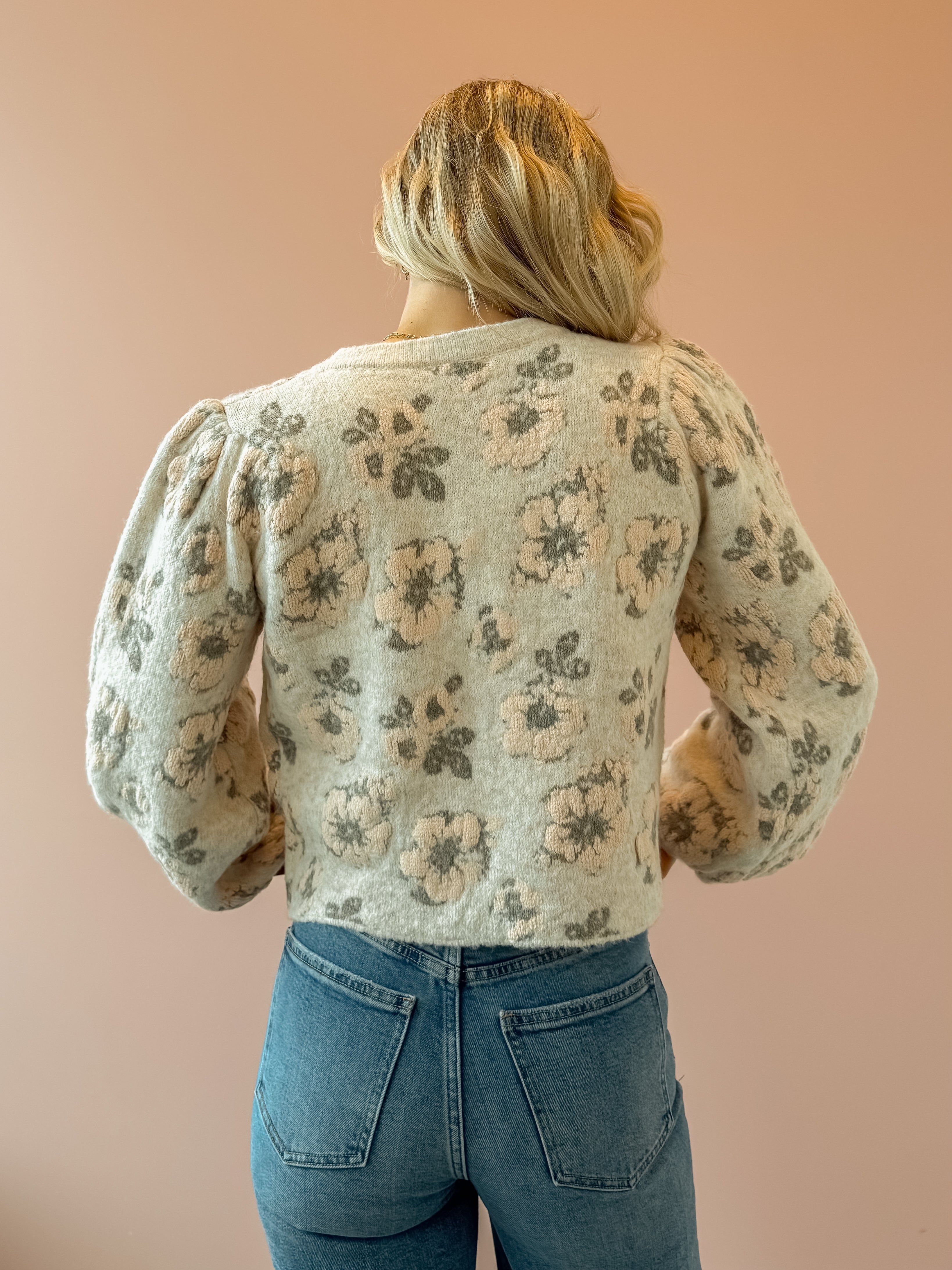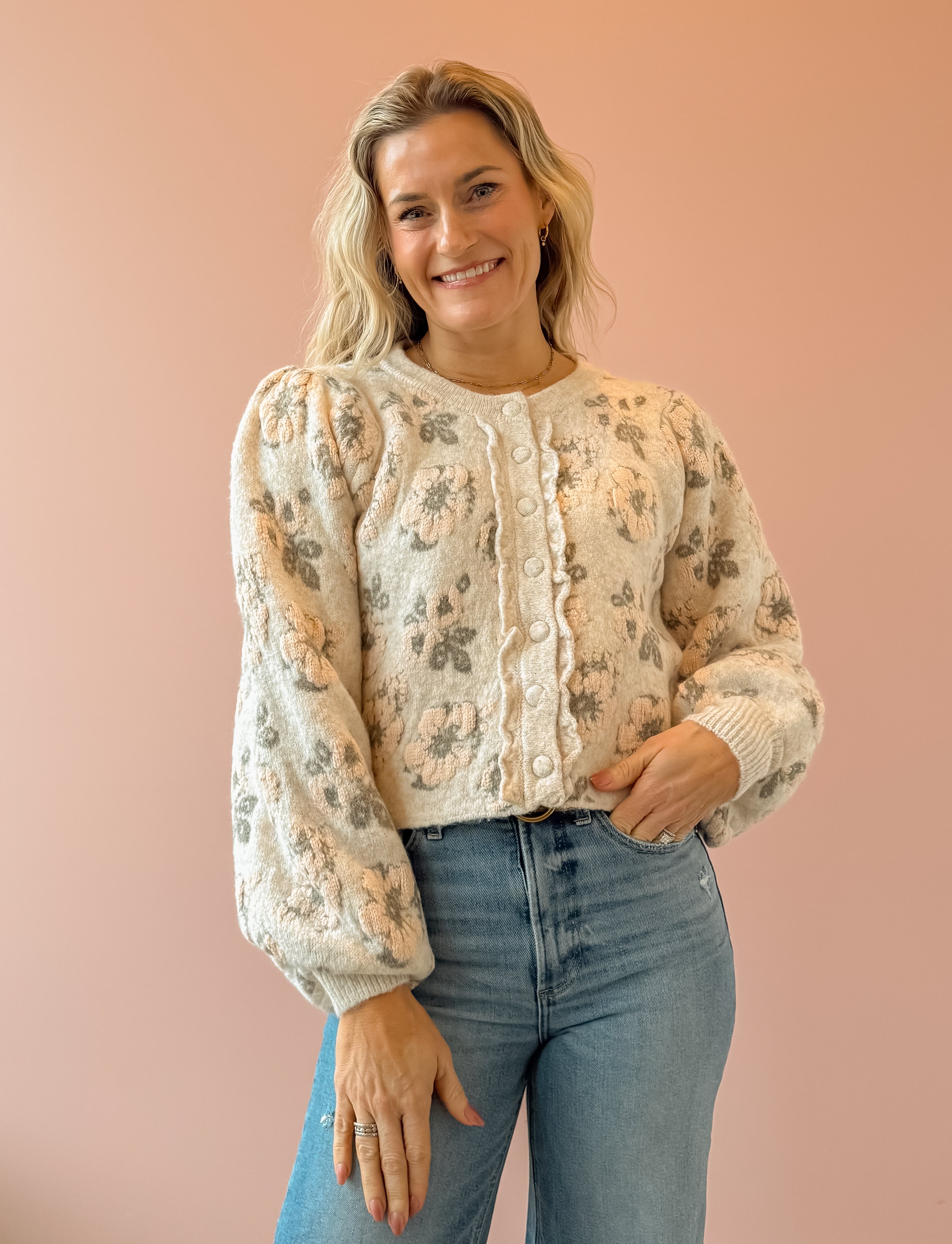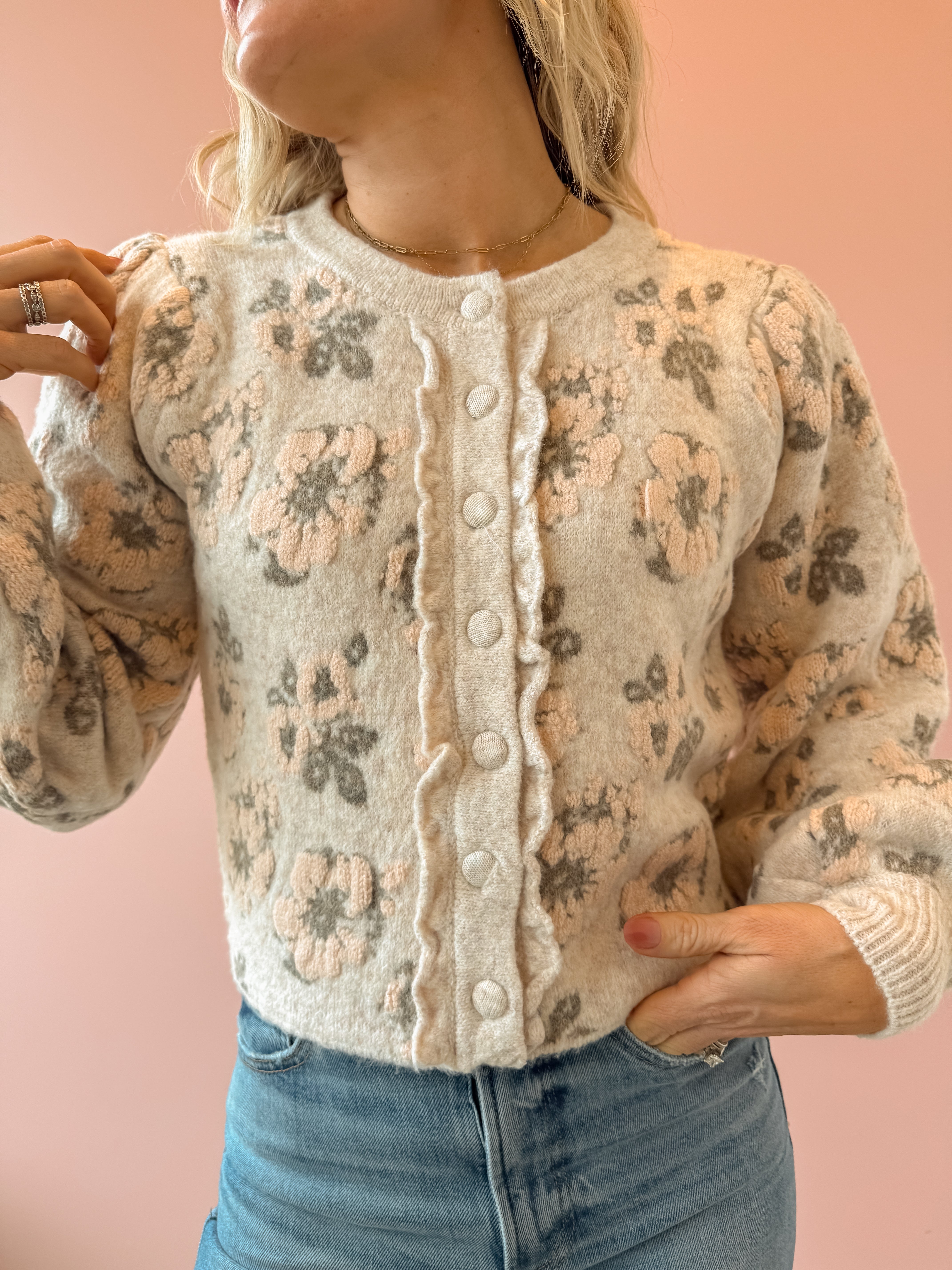Introducing the Blush Babe Sweater—your new spring essential that doesn't skimp on coziness! This floral jacquard knit features a gorgeous springtime print while keeping you wrapped in warmth. Style it buttoned up for a polished look or wear it open as a lightweight jacket for effortless versatility. Pair it with light wash jeans for that perfect casual-chic vibe. Whether you're layering through transitional weather or making a statement on its own, this sweater is about to become your go-to piece.