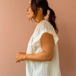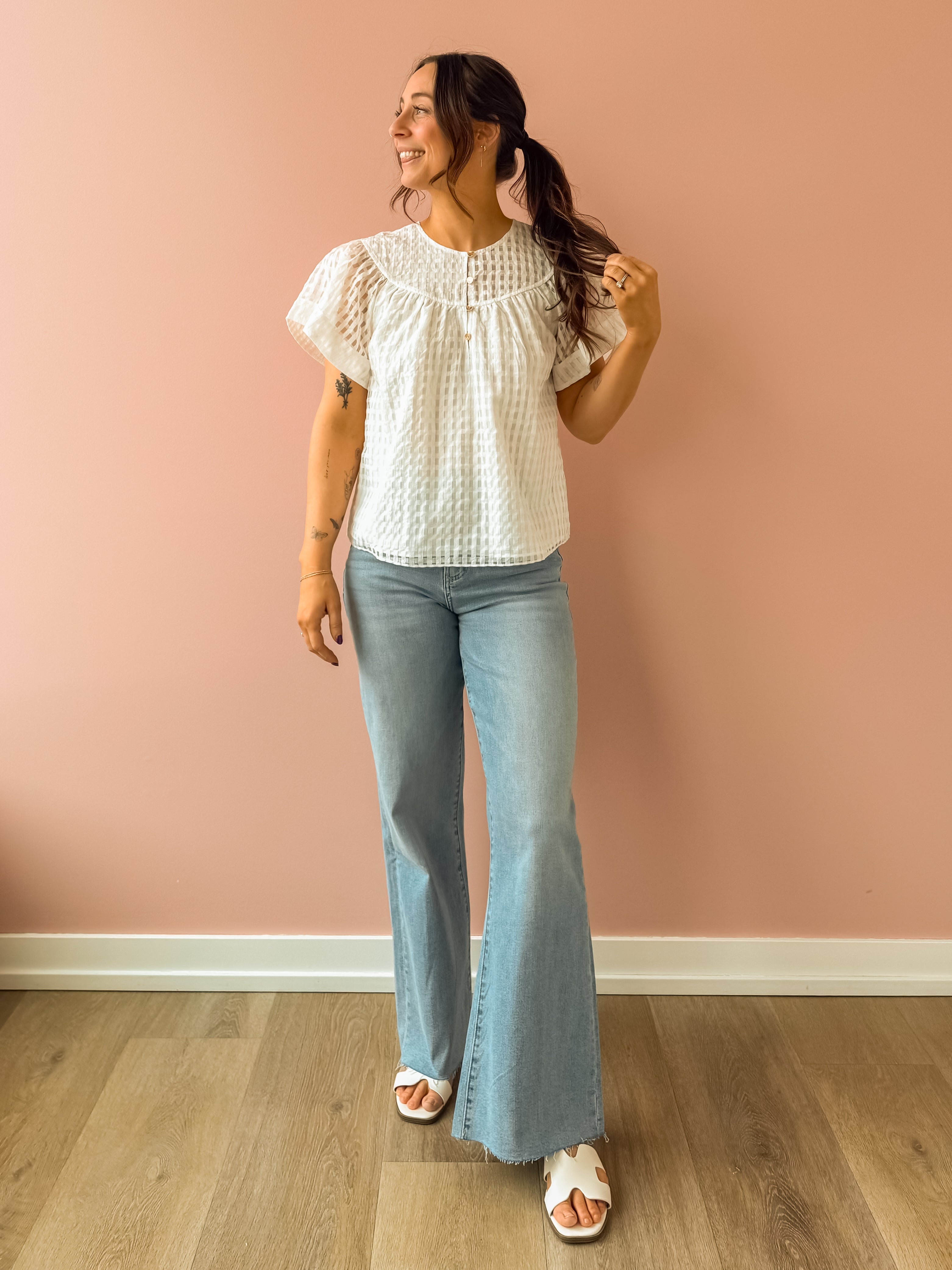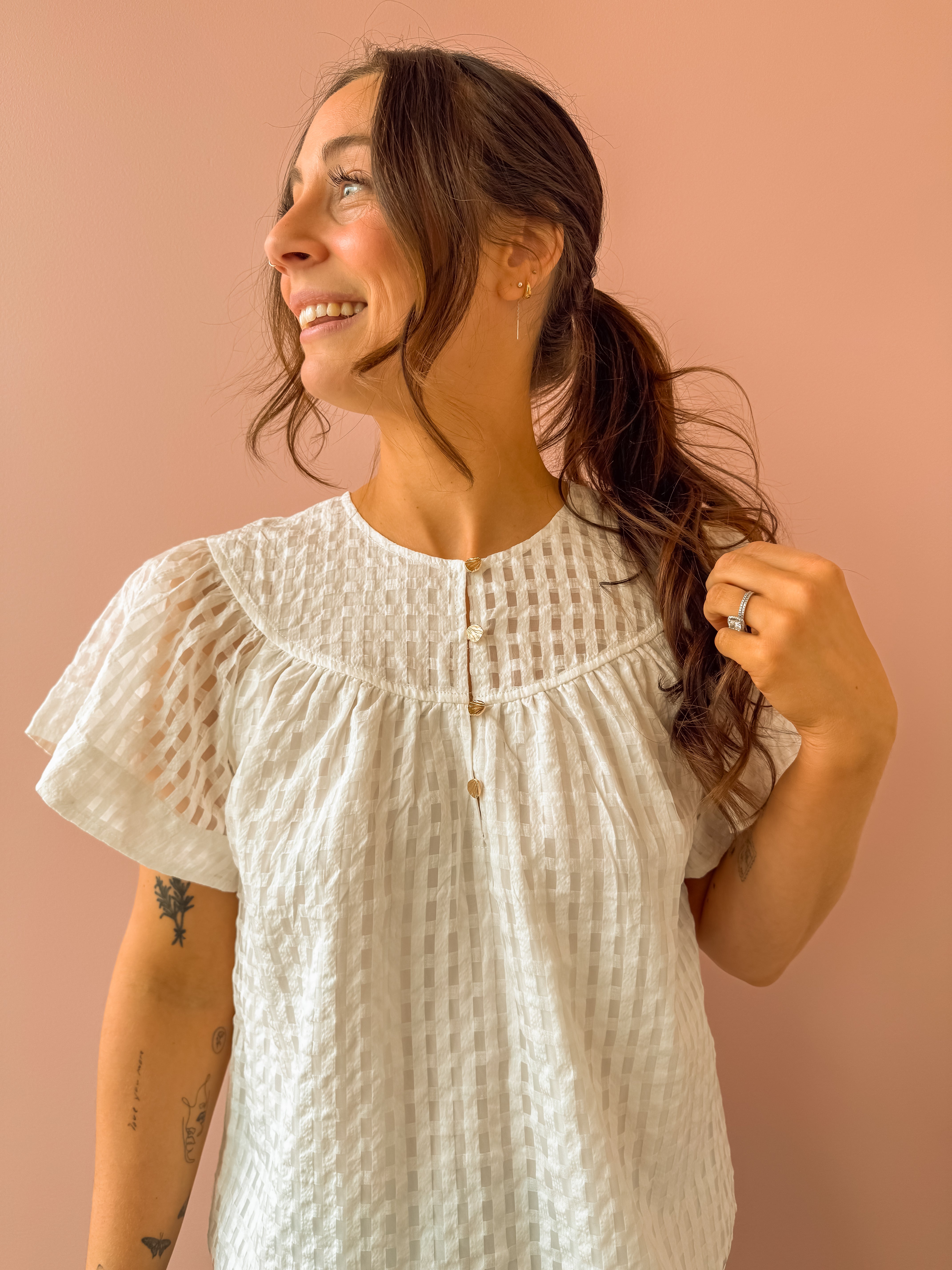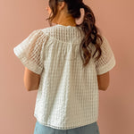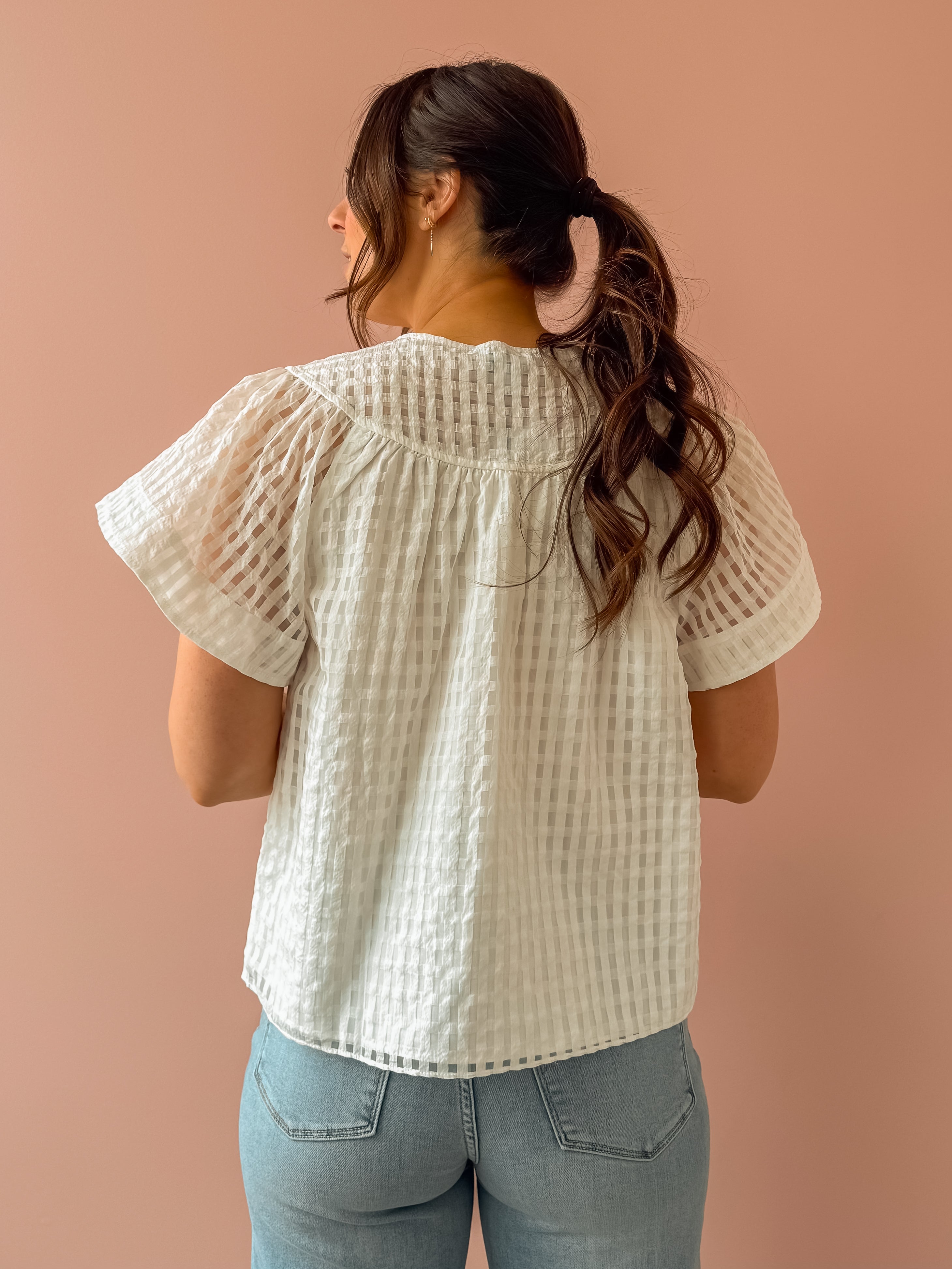 Effortlessly chic in semi-sheer textured check! This white blouse features a sweet round neck with shell buttons, flutter sleeves, and a relaxed silhouette that works hard for you. Tuck it in for polished structure or let it flow loose for laid-back vibes. Your new go-to for any occasion.