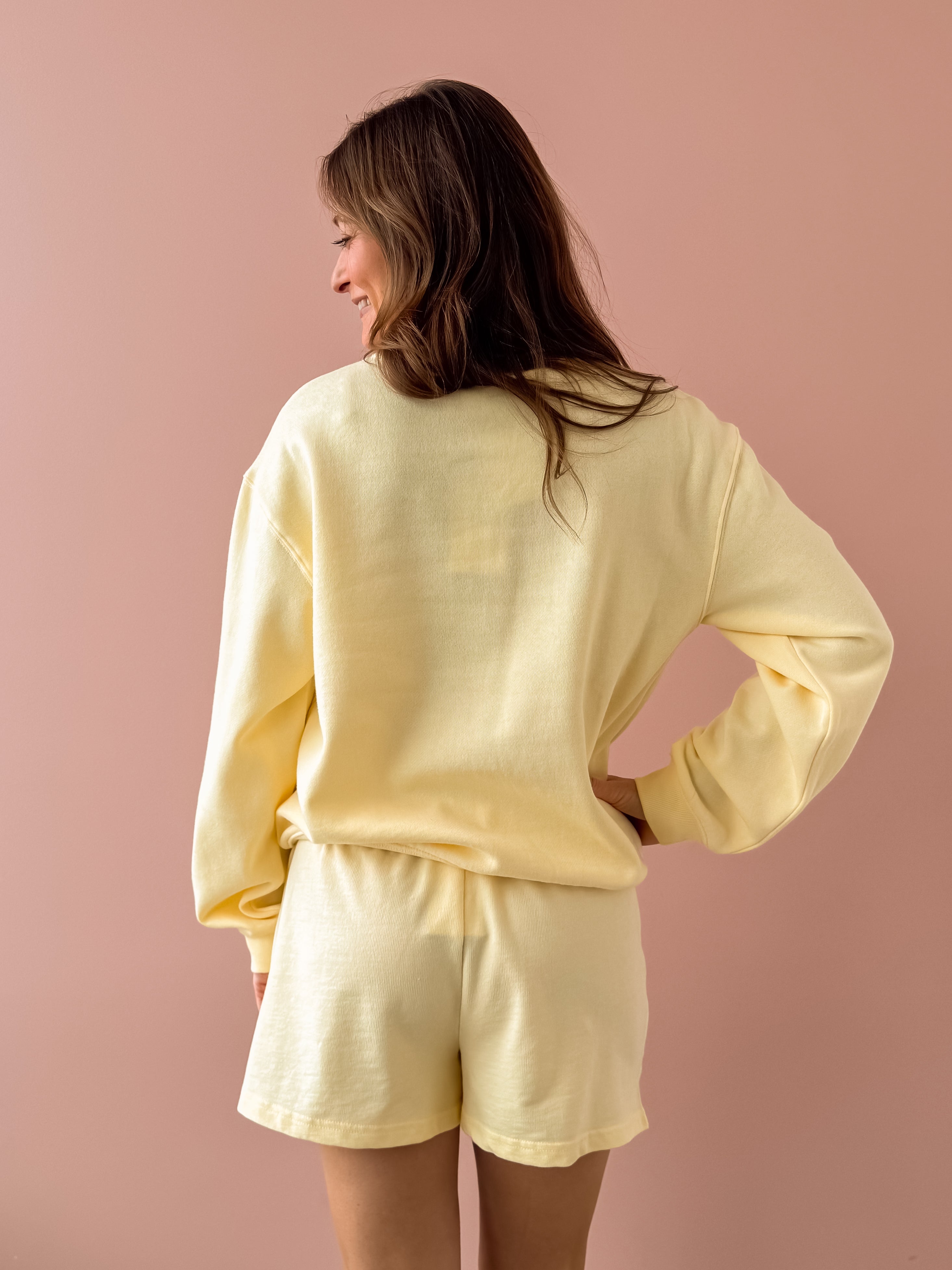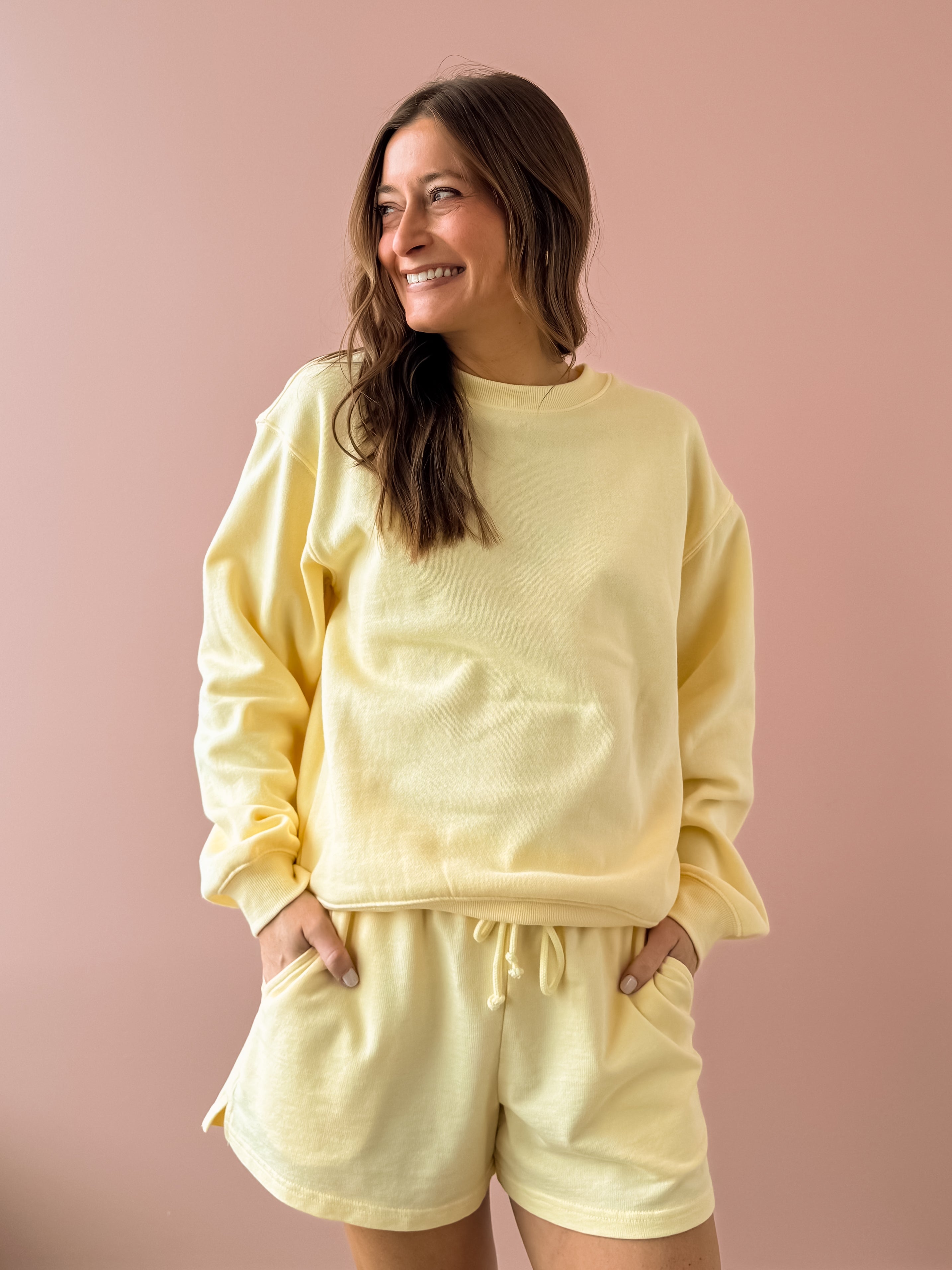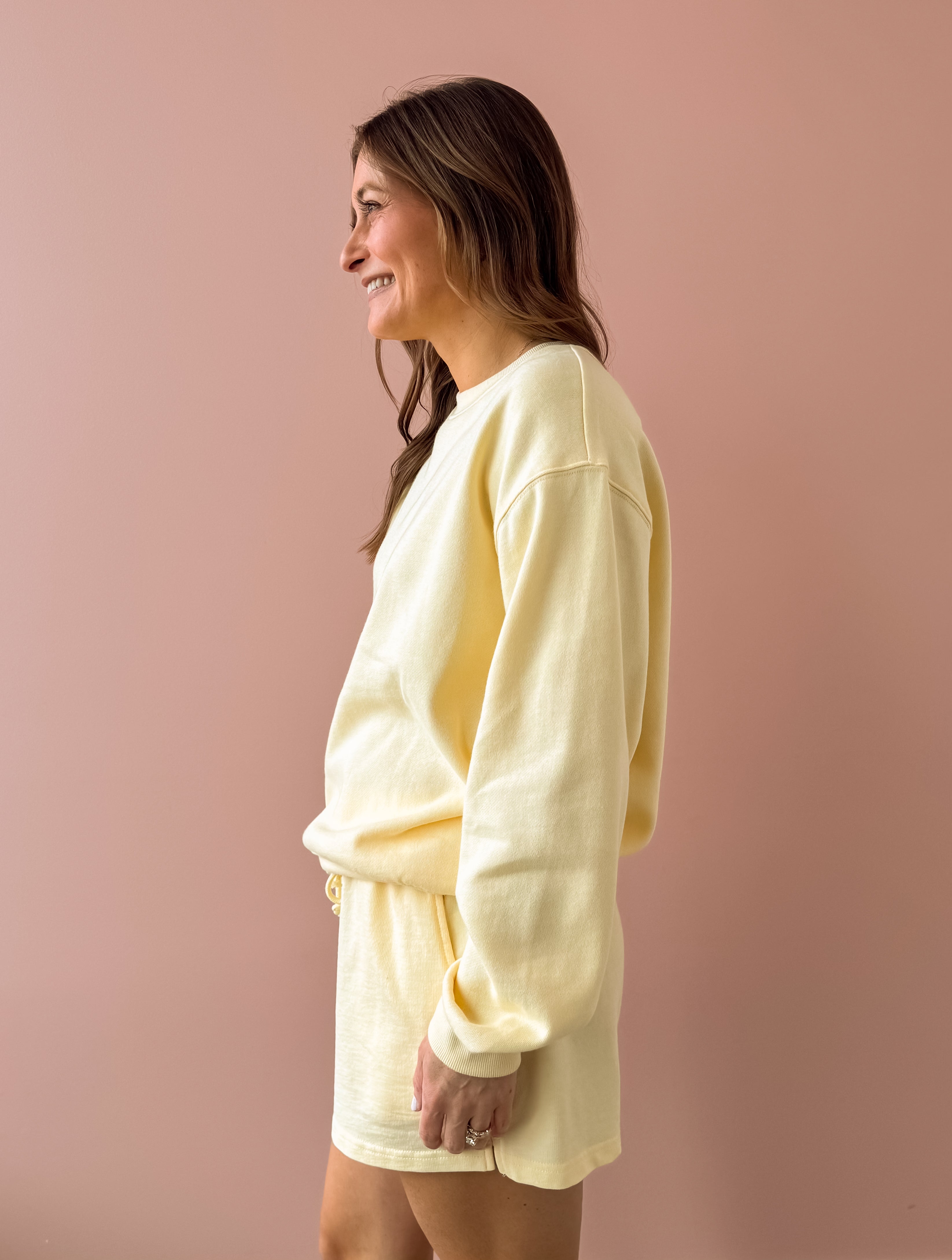 Cozy up in this effortlessly cool sweatshirt made from midweight cotton-blend fleece with a heavy soft wash for an ultra-soft feel. Designed with a relaxed fit, classic crew neckline, and long sleeves, it’s an easy layer you’ll reach for often. The Sunny Side color adds a cheerful pop that feels fresh yet wearable. Style it with our Birdie Short and sneakers for everyday wear or pair it with leggings and slides for laid-back days.