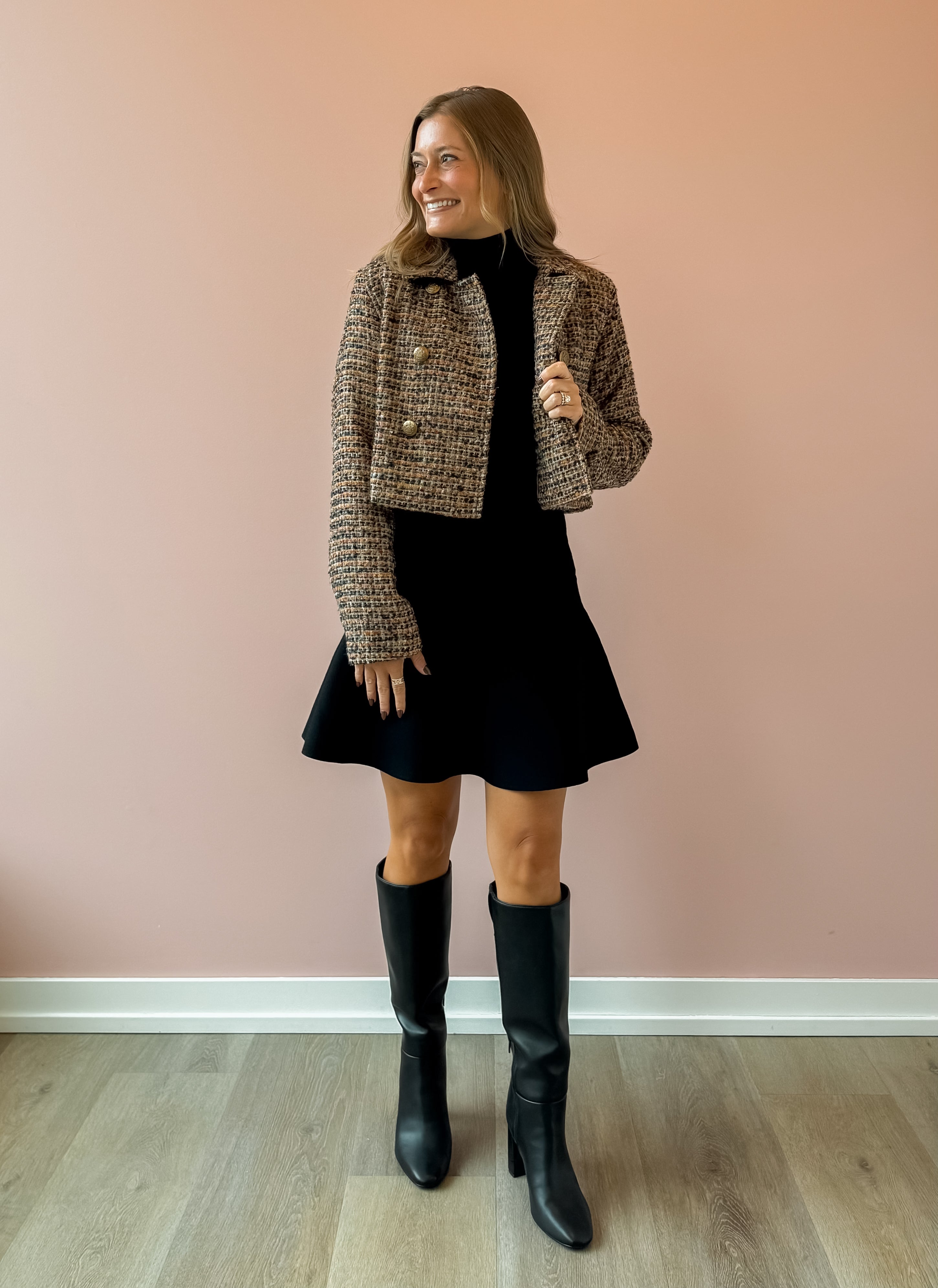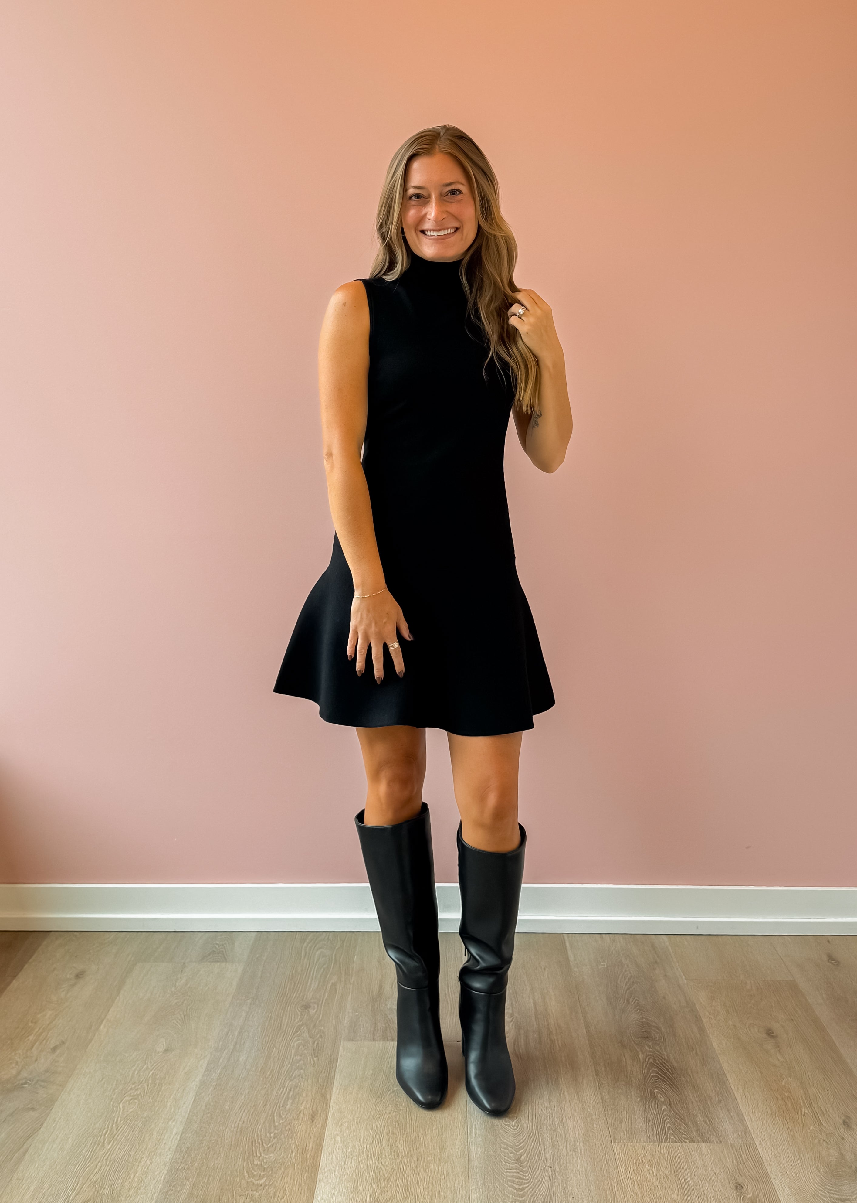 The Breslin Mini Dress is a sleek black essential crafted from cozy sweater material for a form-fitting, flattering fit. Its high neck and playful, flirty hem add flair to a classic shape, making it ideal for everything from office days to weekend outings. Pair it with loafers for chic casual style or heels for dressier events. This versatile dress effortlessly blends sophistication with a fun twist, elevating your wardrobe with timeless appeal.