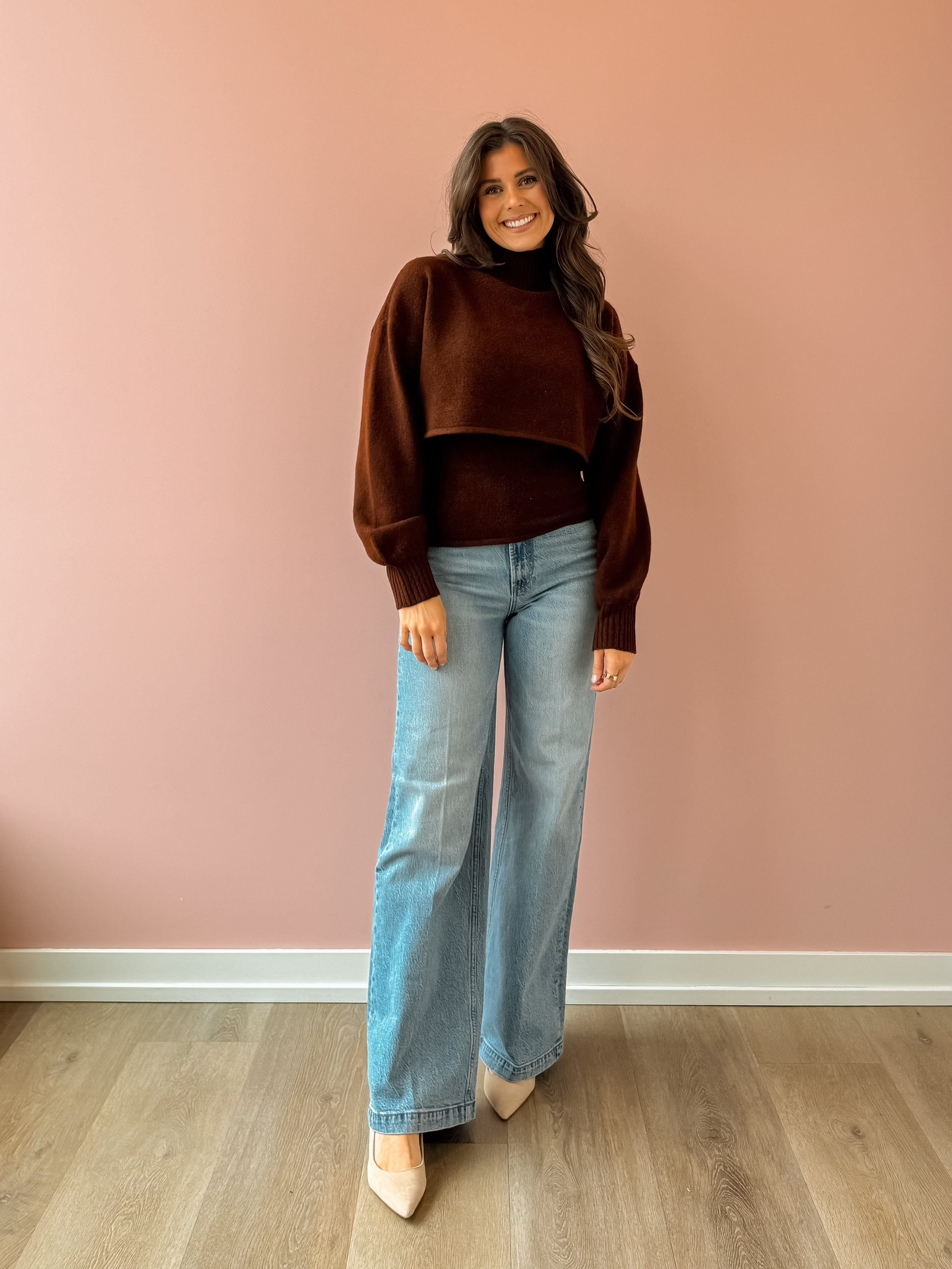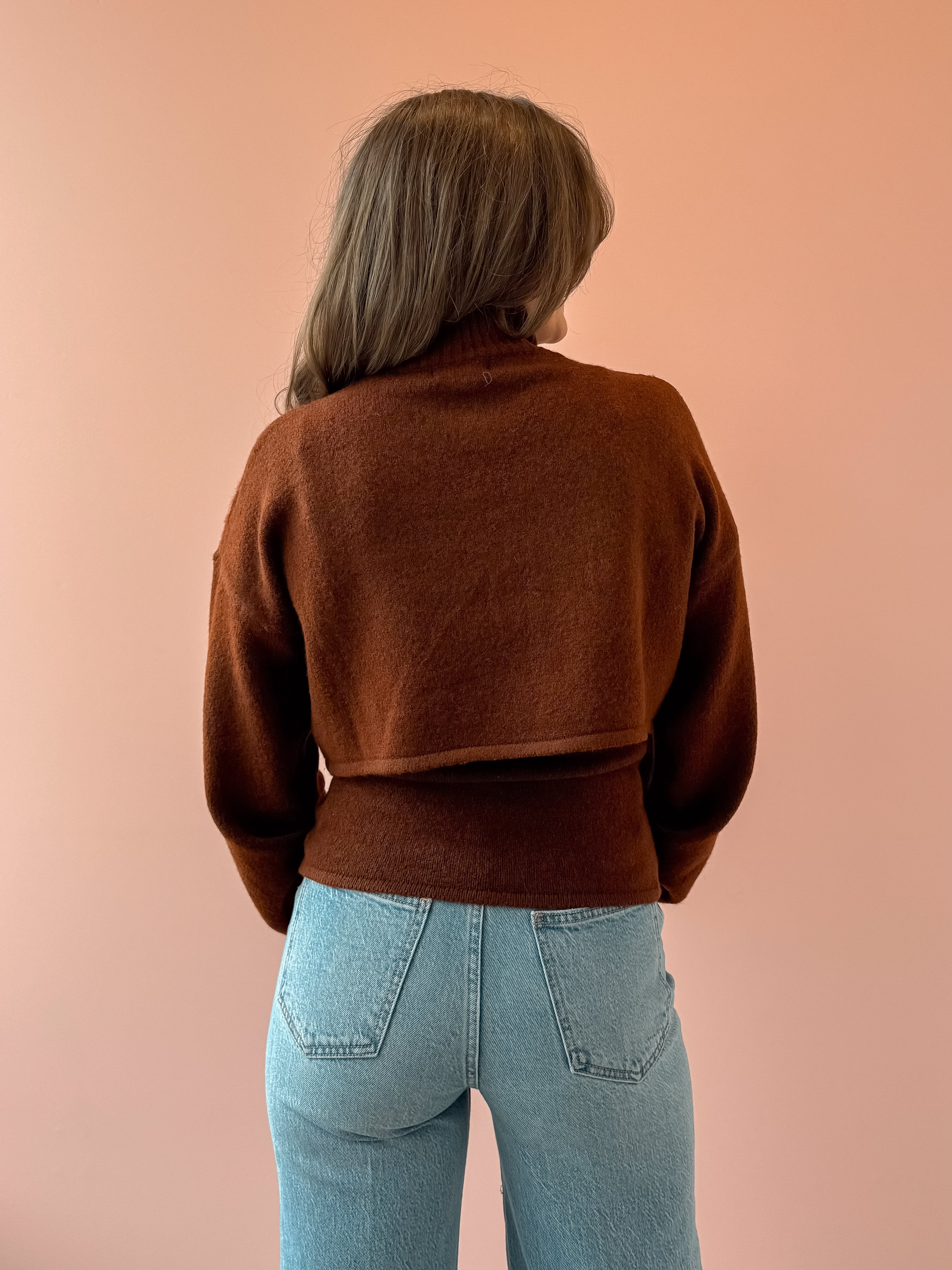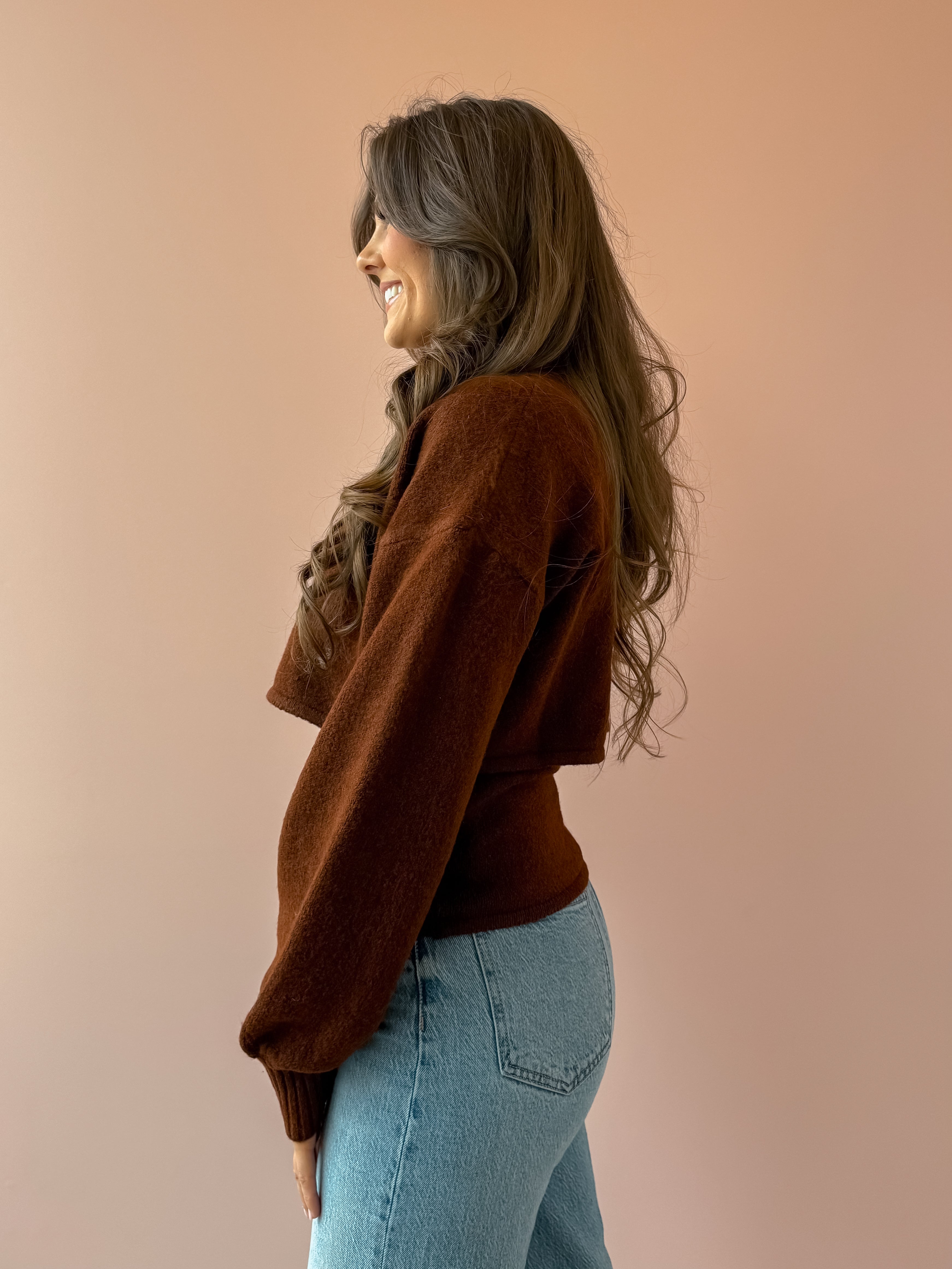 Elevate your everyday style with the Camilla Layered Two Piece Sweater—a versatile duo designed to work together or separately. The lightweight tank pairs beautifully beneath the cropped cardigan in a luxurious chocolate brown, creating flattering dimension when layered. Each piece shines independently, giving you endless styling possibilities. Wear them together for a polished, put-together look, or style the tank solo for warmer days. Pair with jeans and boots for an effortlessly chic ensemble that transitions seamlessly from day to night.