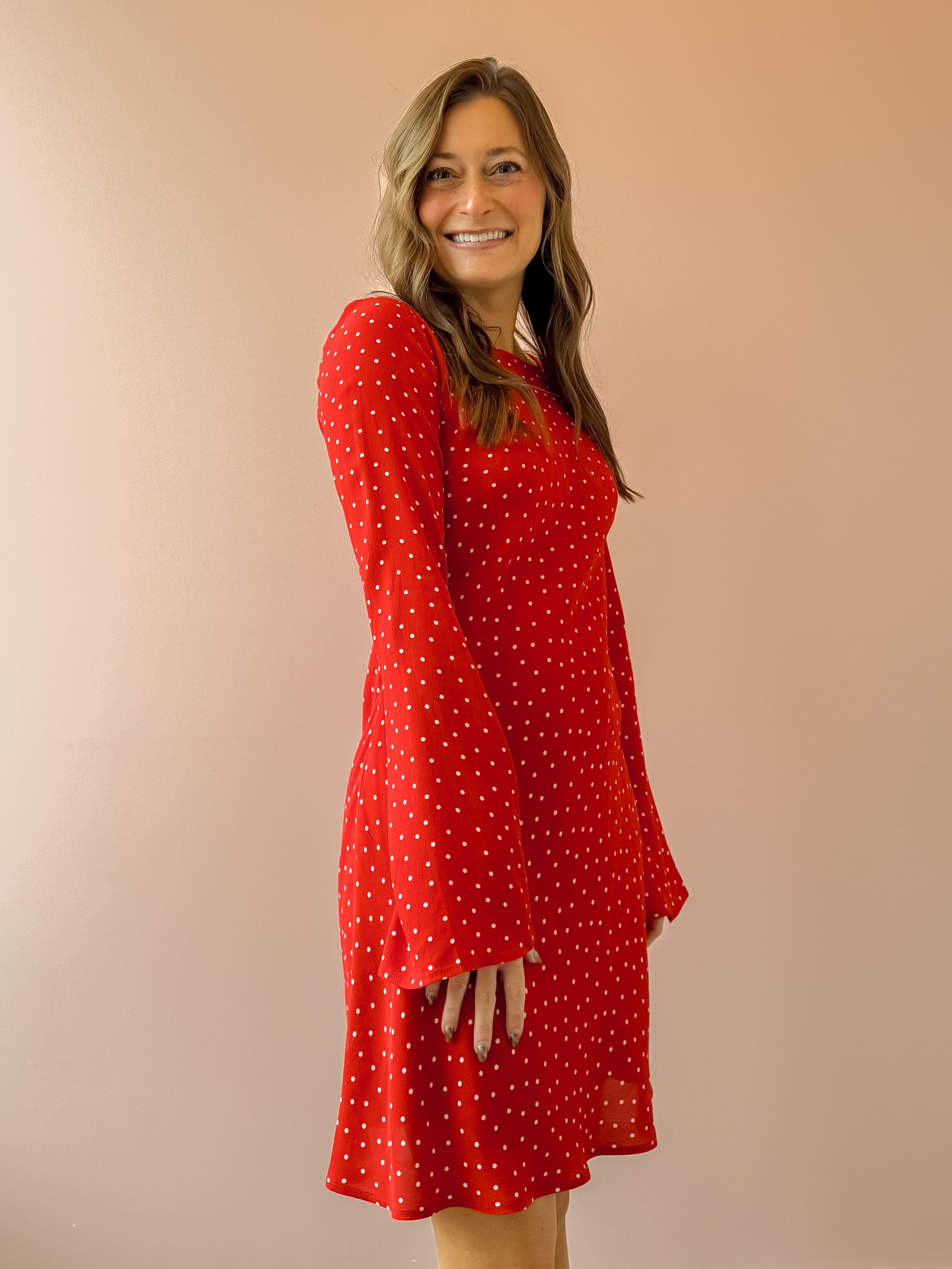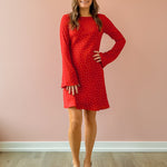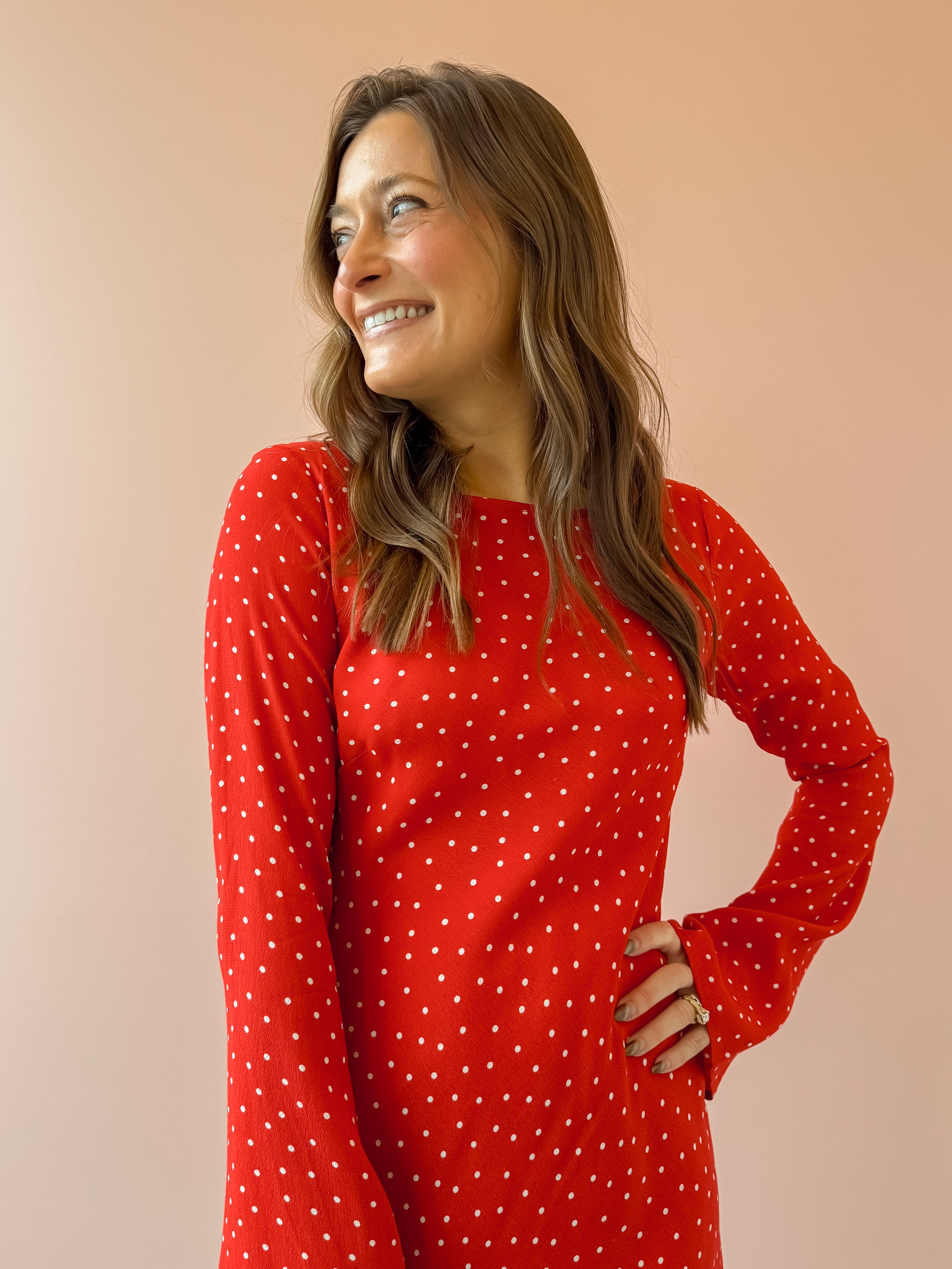 The Campbell Dot Crepe Mini Dress is a statement piece with its bold red hue and playful white polka dots. Designed with a sleek boat neckline, fitted silhouette, and long sleeves, it balances classic charm with a modern edge. The mini length keeps it fresh and flattering for nights out or special occasions. Style it with heels and a simple clutch for an effortlessly confident look.