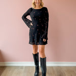 The Campbell Rio Mini Dress is a flirty take on a classic black mini, featuring delicate red roses scattered throughout. A sheer overlay adds a touch of romance, while the lined silhouette keeps it comfortable and easy to wear. With its mini length and playful charm, it’s perfect for nights out or special occasions. Pair it with heeled boots or strappy heels for an effortlessly chic look.