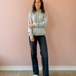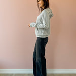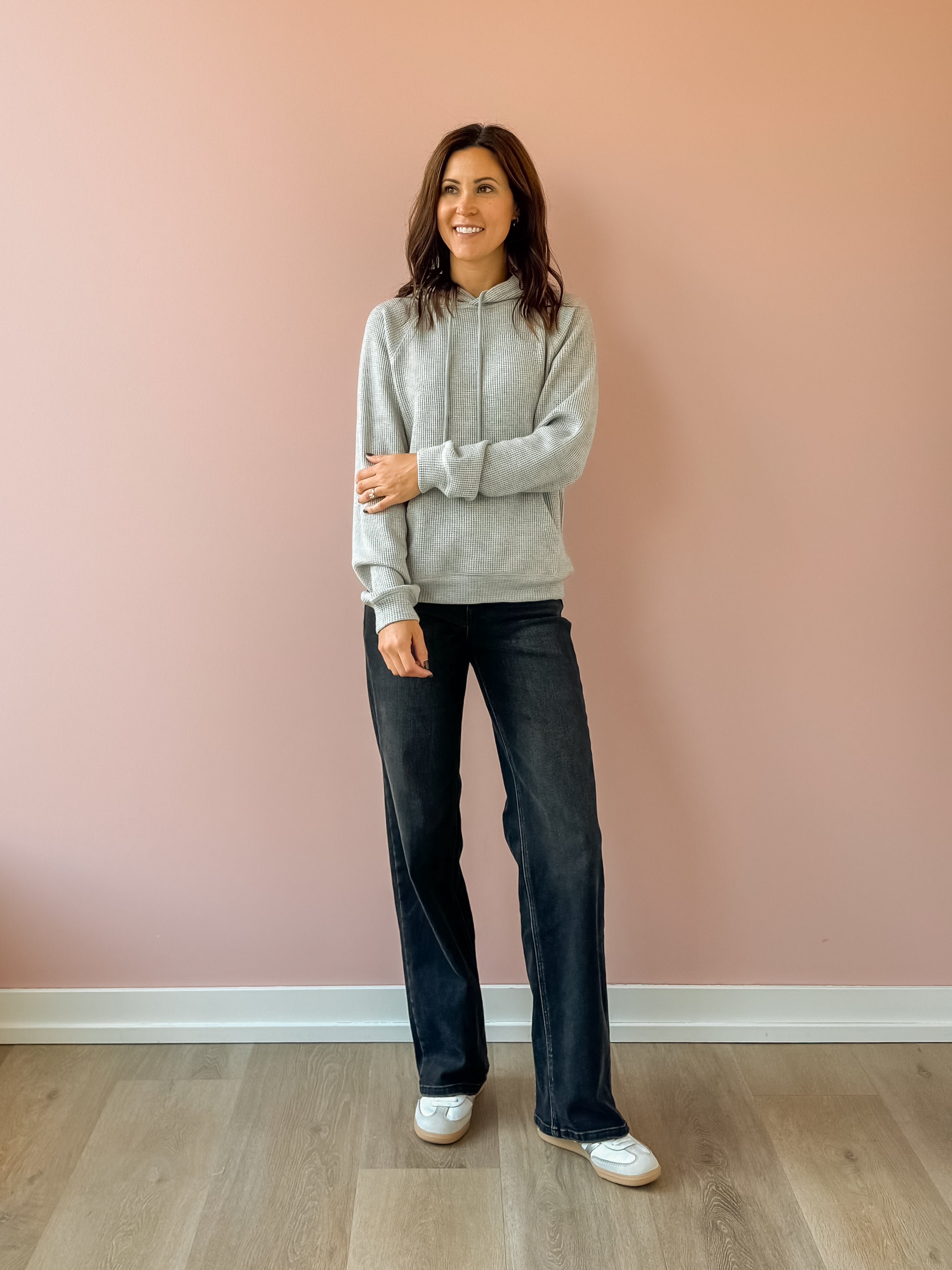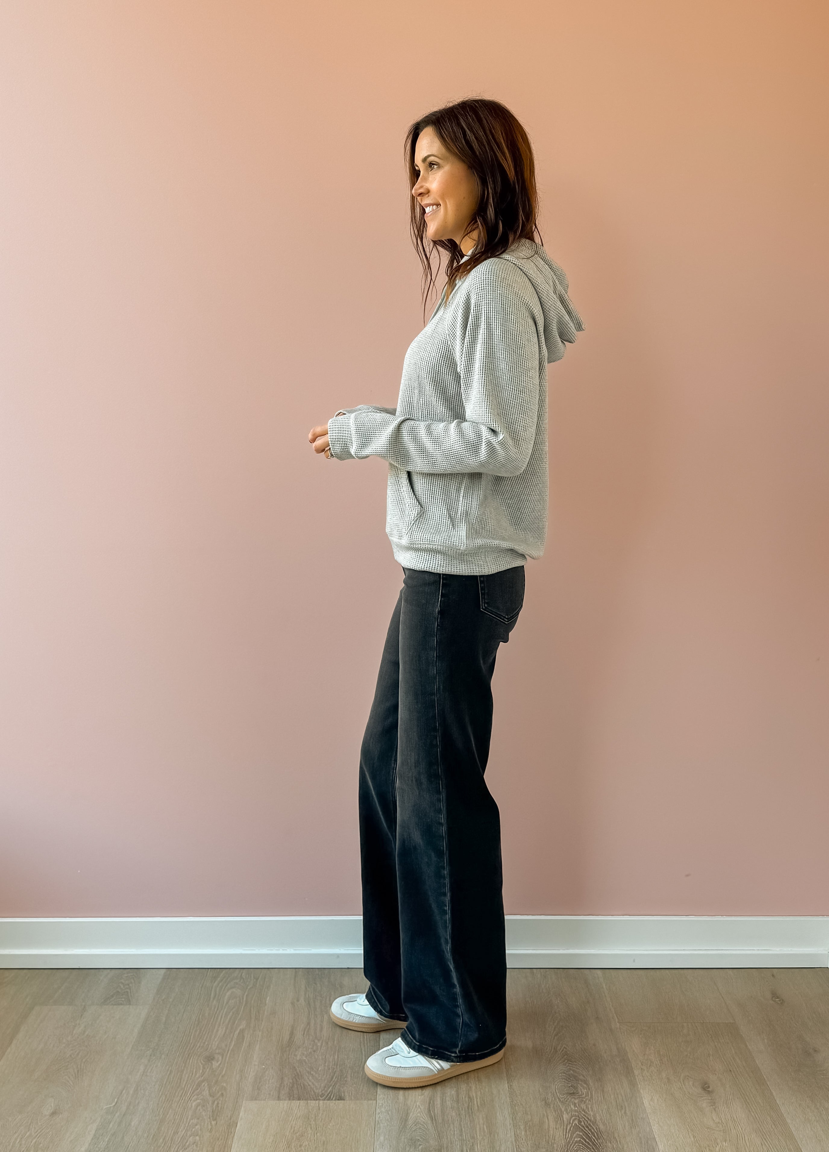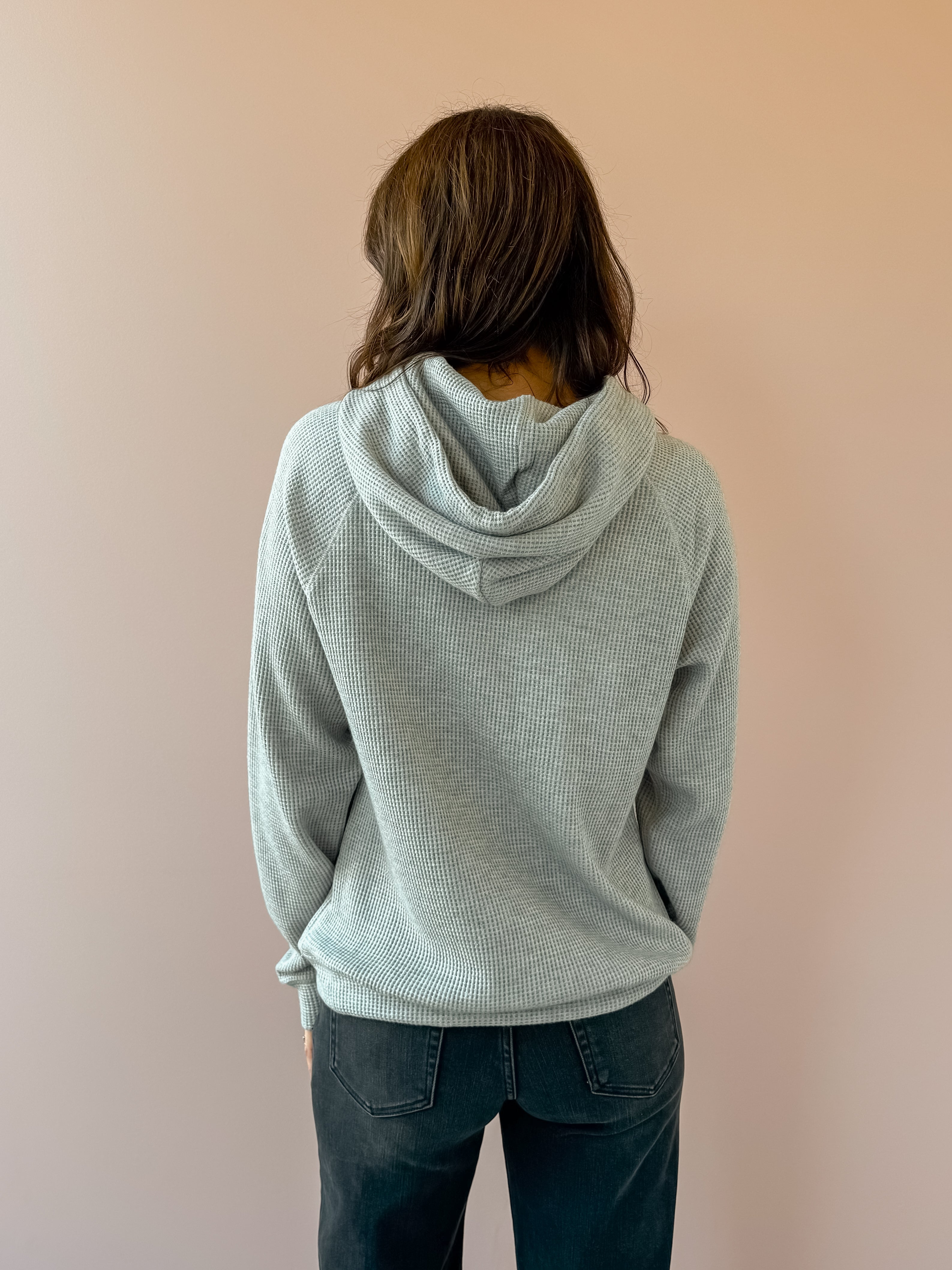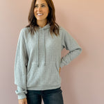 Stay comfortably stylish with the Carlin Hoodie, crafted from soft grey waffle knit fabric. Its cozy hood and adjustable drawstring offer a snug fit, while the convenient front pocket adds practicality. Ideal for relaxing at home or running errands, this hoodie combines comfort and casual charm effortlessly.