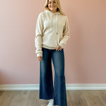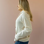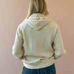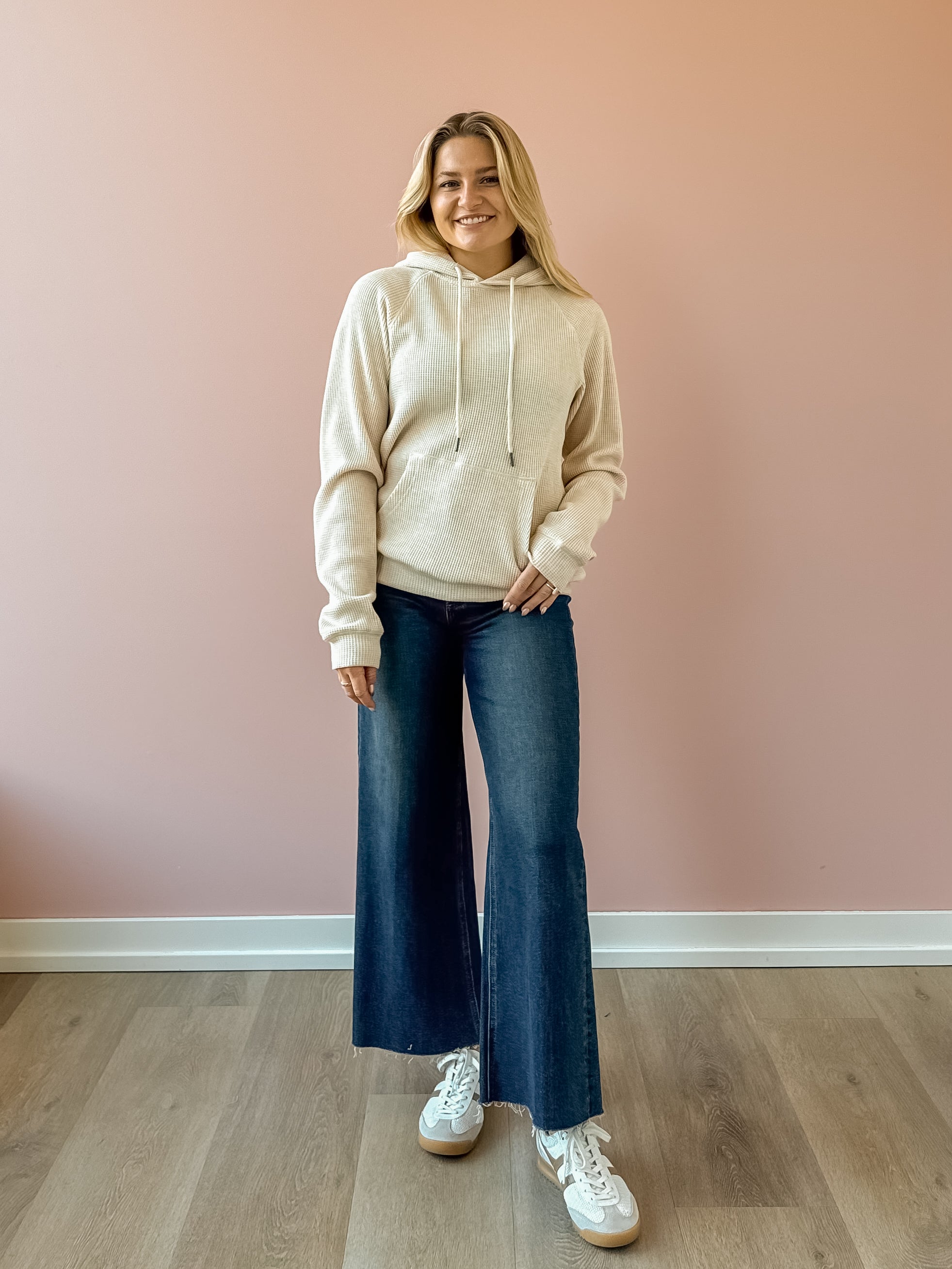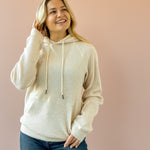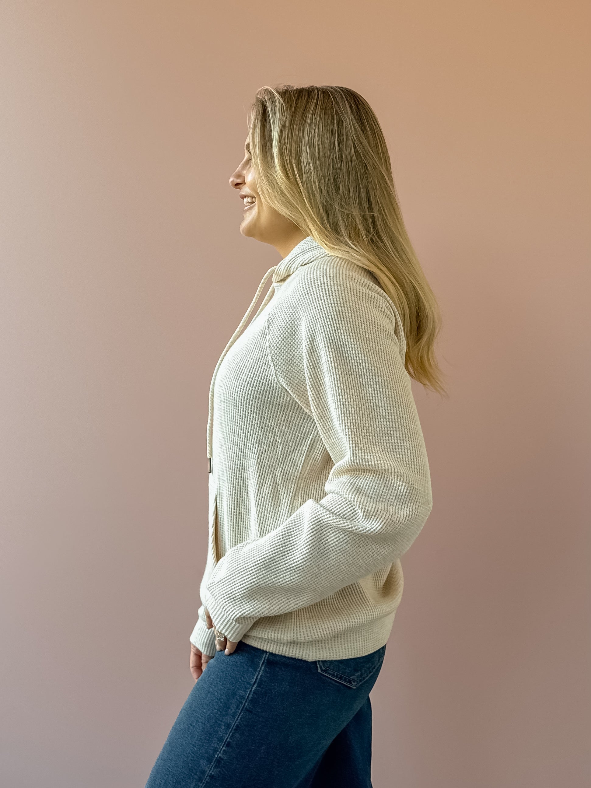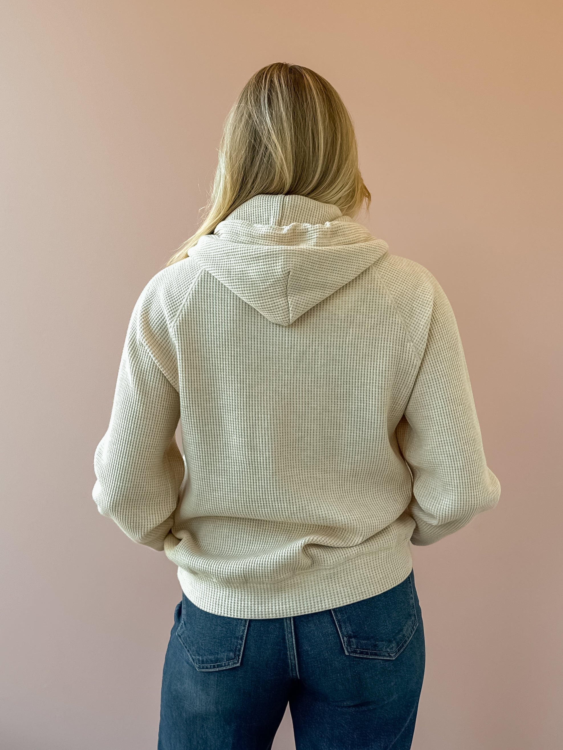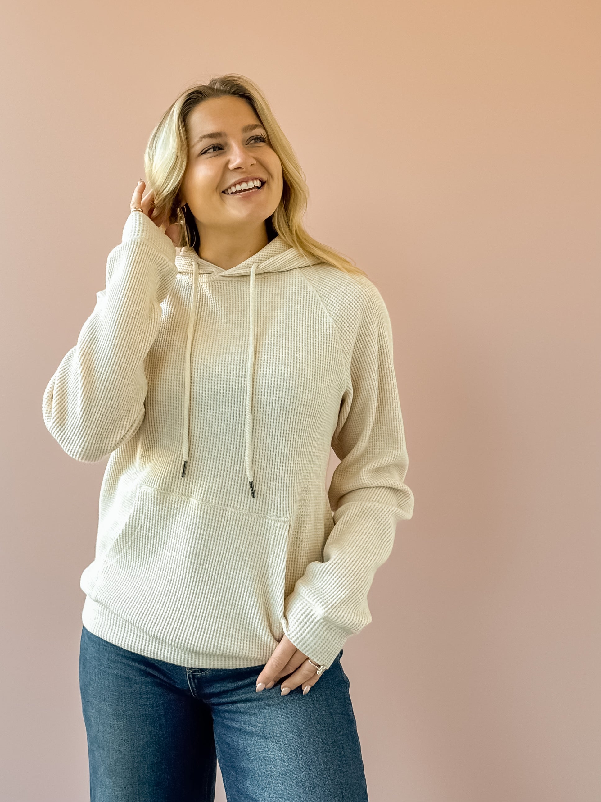 Stay comfortably stylish with the Carlin Hoodie, crafted from soft oatmeal waffle knit fabric. Its cozy hood and adjustable drawstring offer a snug fit, while the convenient front pocket adds practicality. Ideal for relaxing at home or running errands, this hoodie combines comfort and casual charm effortlessly.