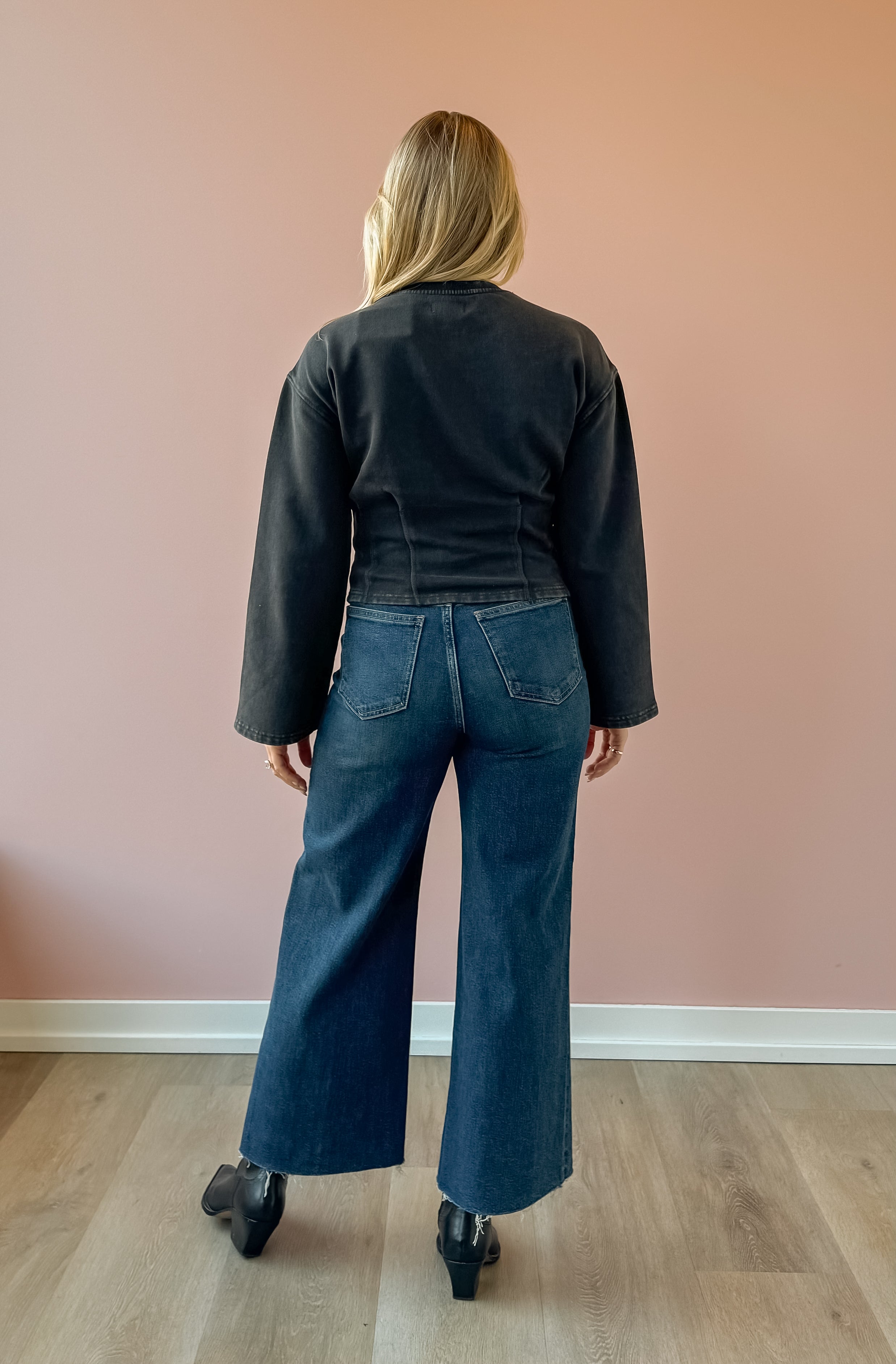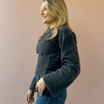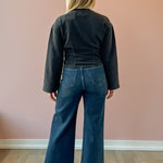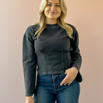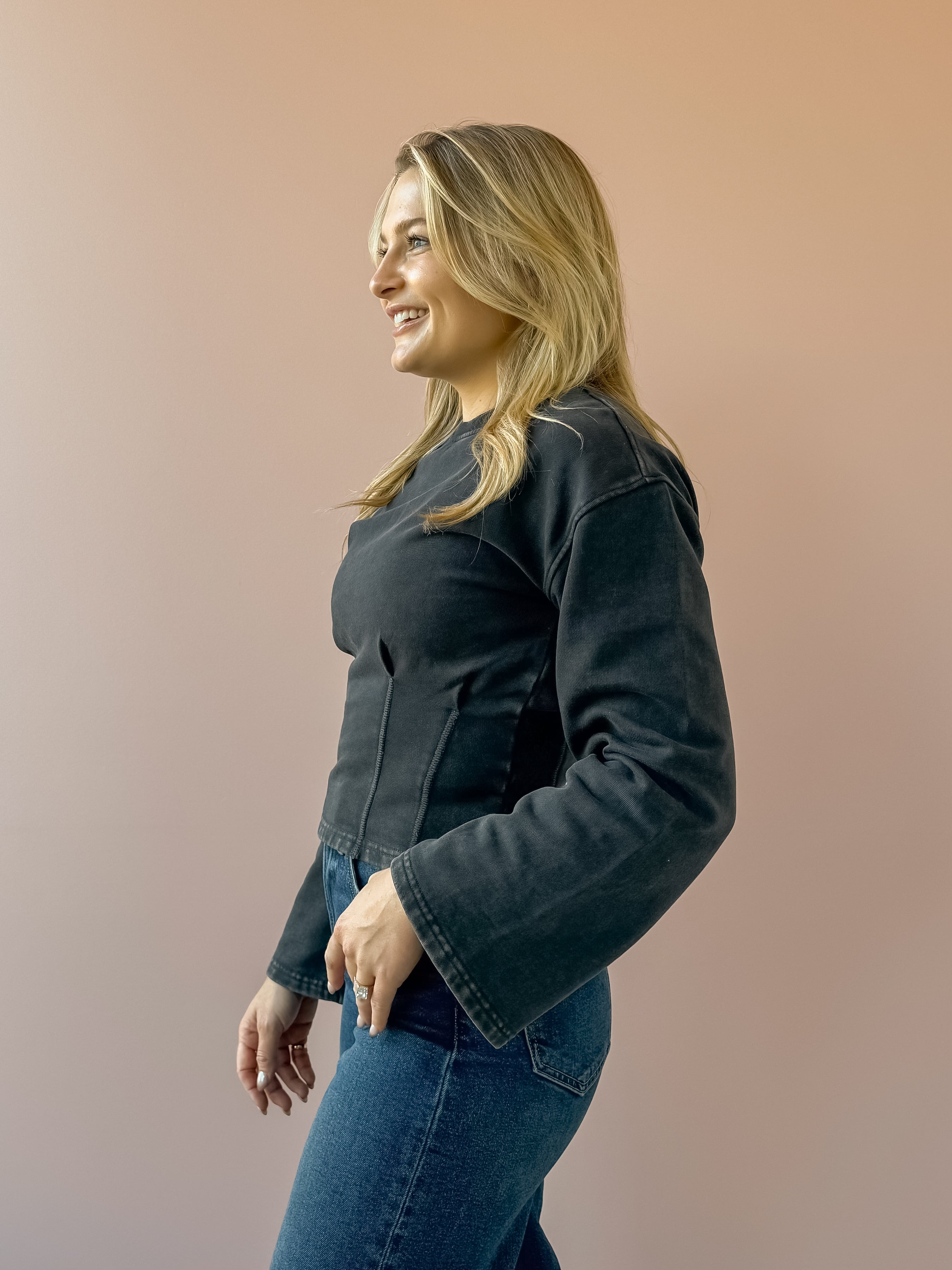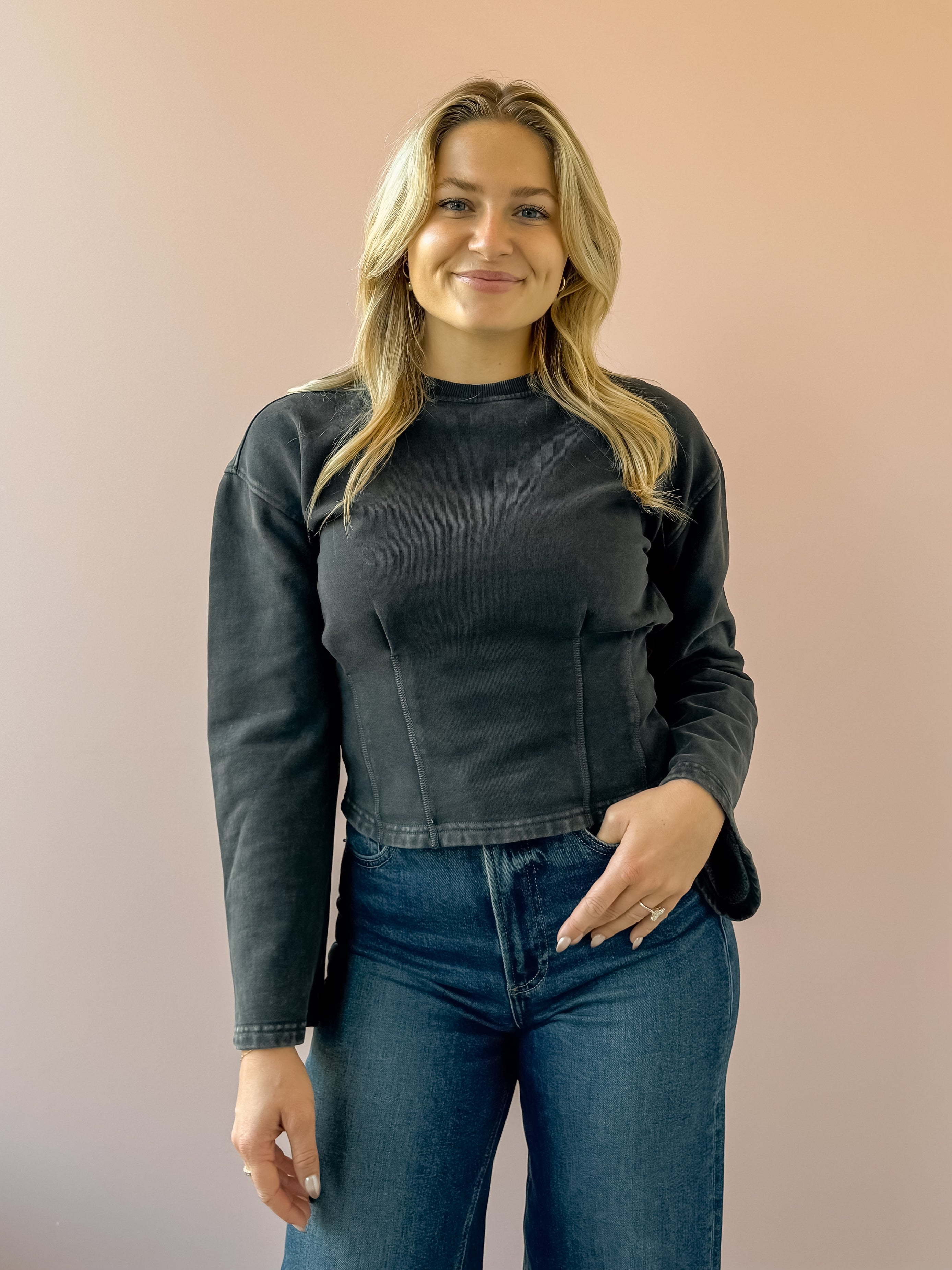 The Carmelle Top in black charcoal blends elegance with comfort. Its round neckline and oversized sleeves create a chic silhouette, while the ruched waist highlights your figure by fitting snugly at the waist. Perfect for both casual and dressy occasions, this top adds a sophisticated touch to any outfit. Style with trousers and loafers for the office, or denim and sneakers for a casual look!