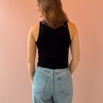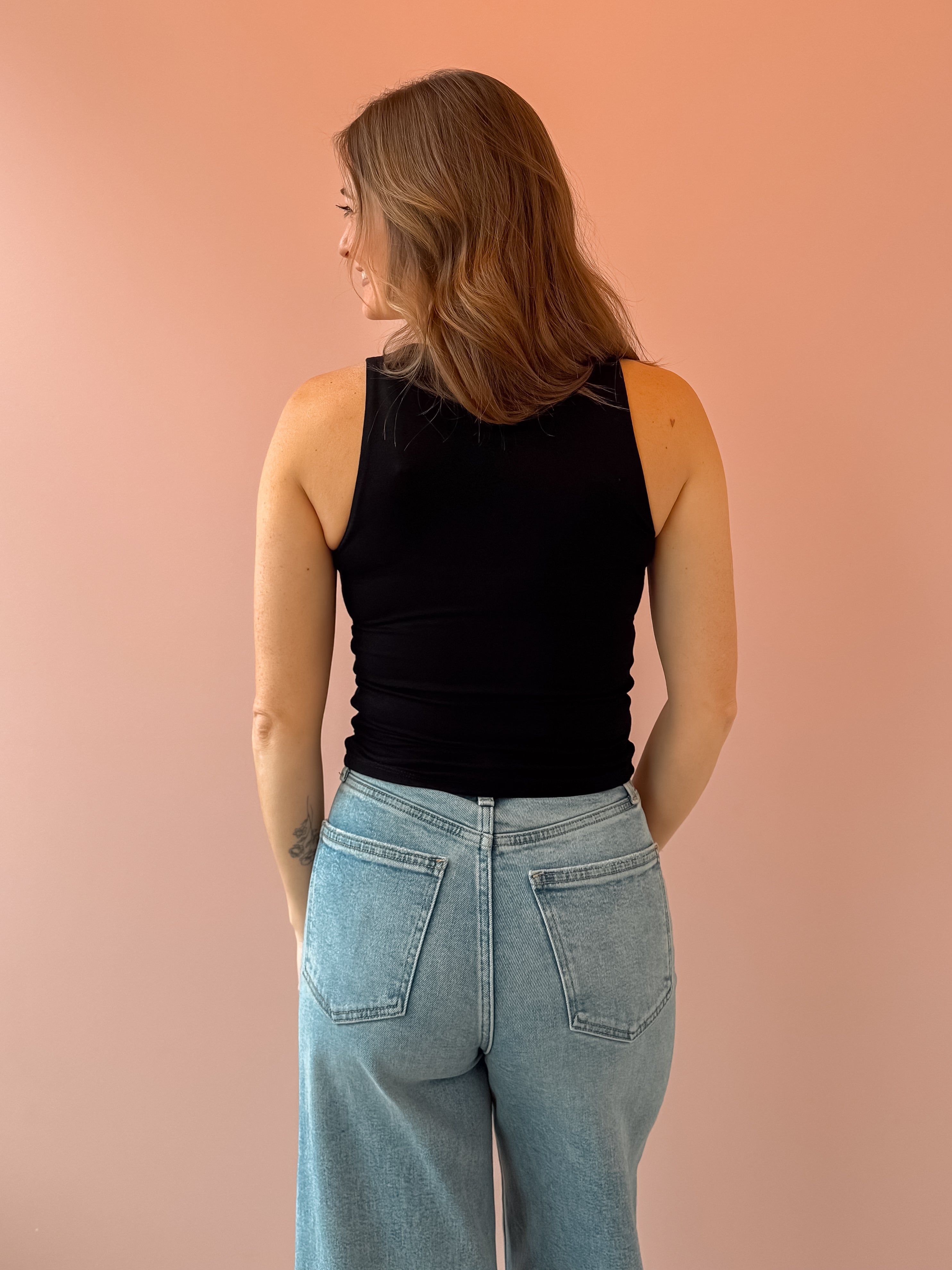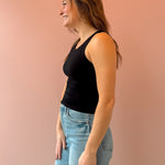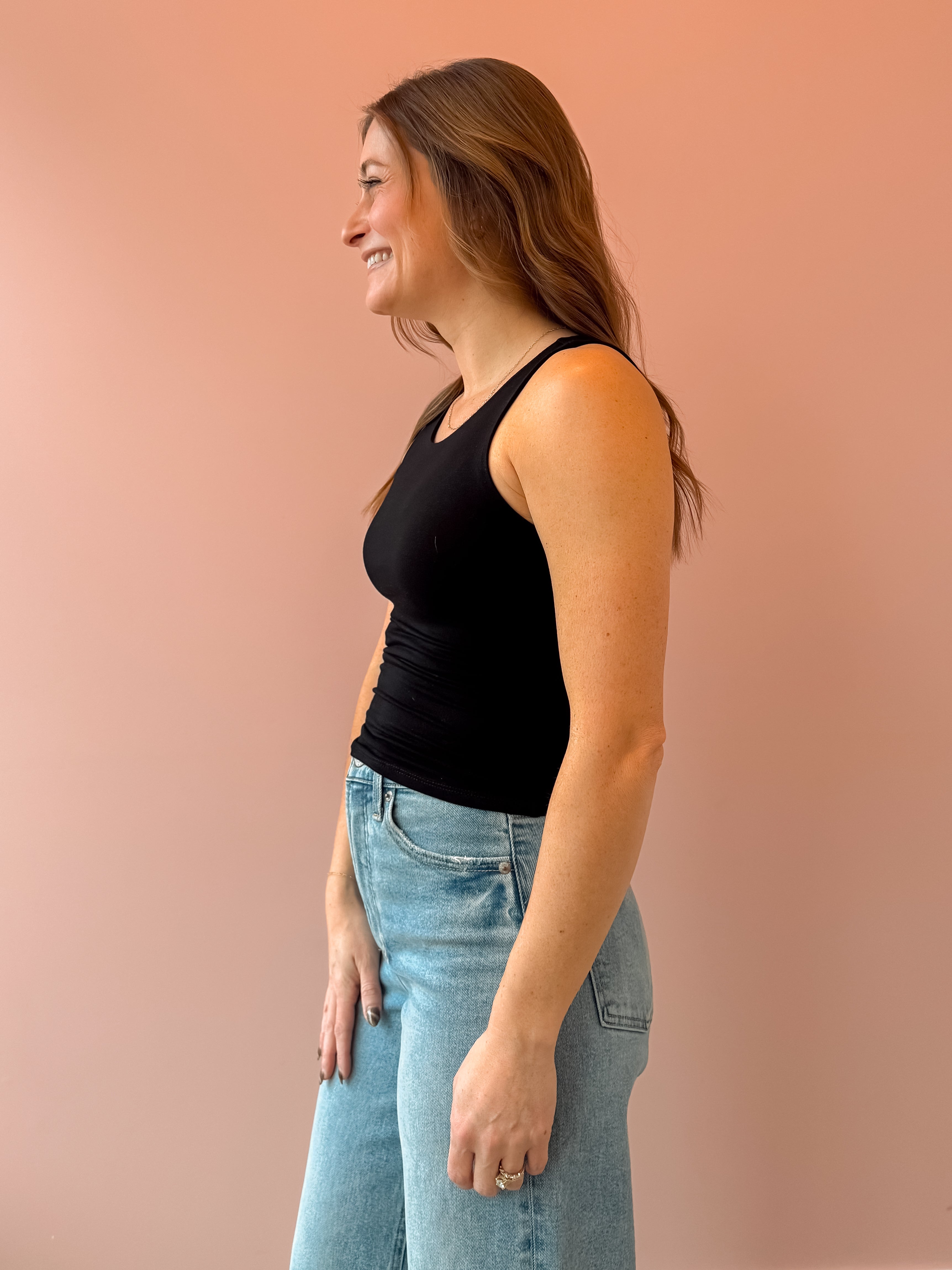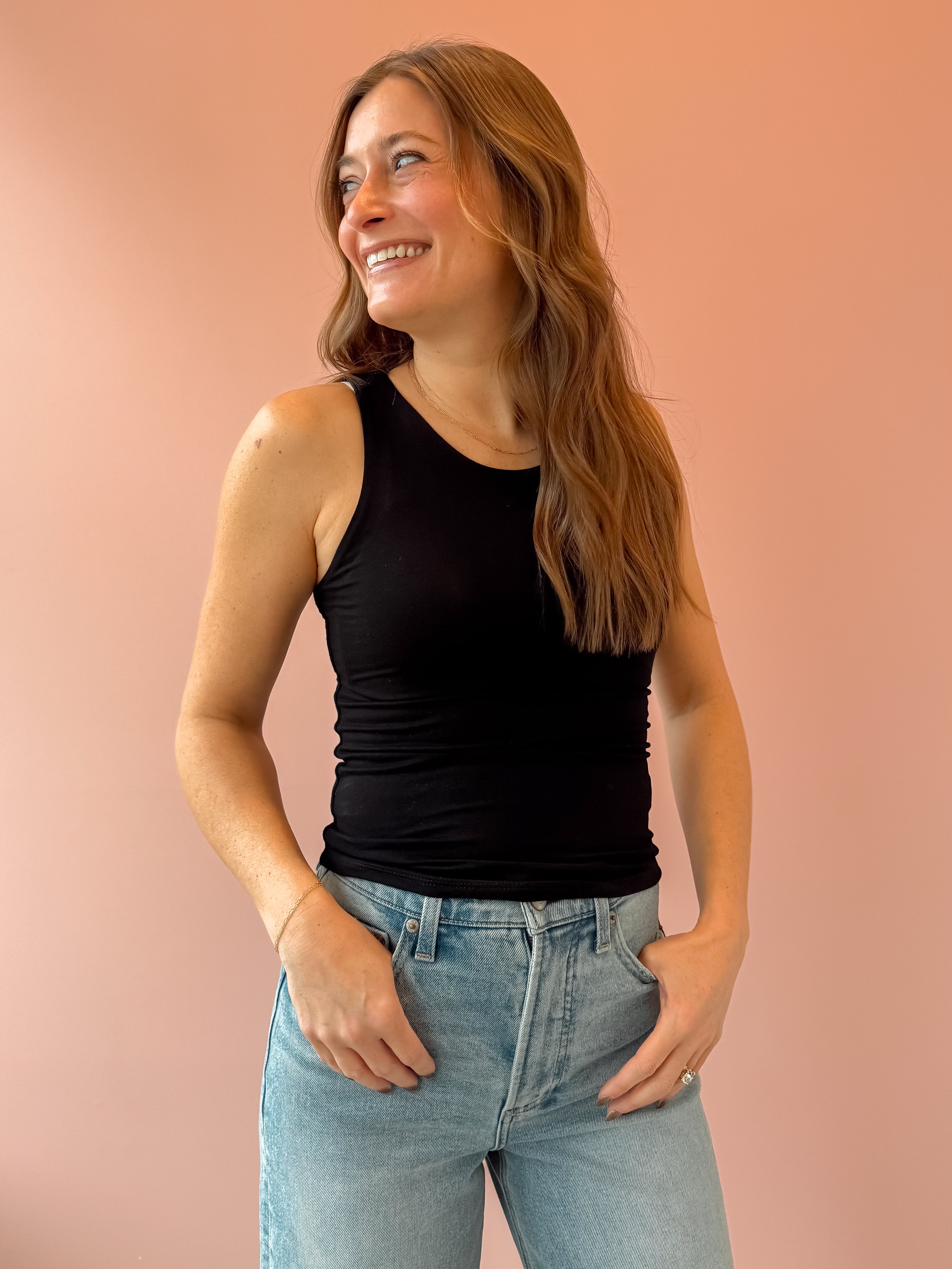 This black basic tank is a timeless wardrobe essential designed for effortless layering and everyday wear. Crafted from a soft, stretchy knit, it features a classic round neckline at the front and a smooth, body-skimming fit. The double-lined construction provides added coverage and a flattering finish, making it perfect to wear on its own or as a foundational layering piece. Simple, comfortable, and endlessly versatile, this tank is ready to become your go-to basic year-round!
