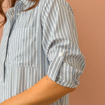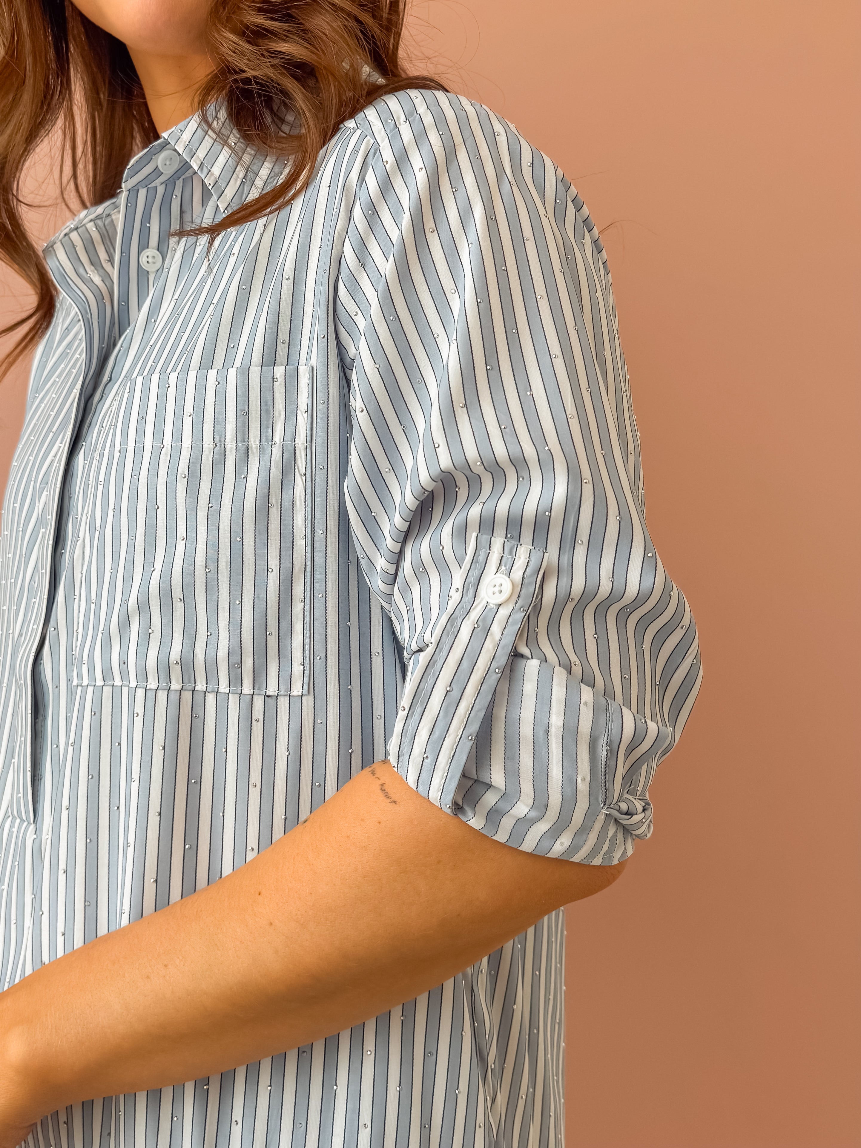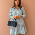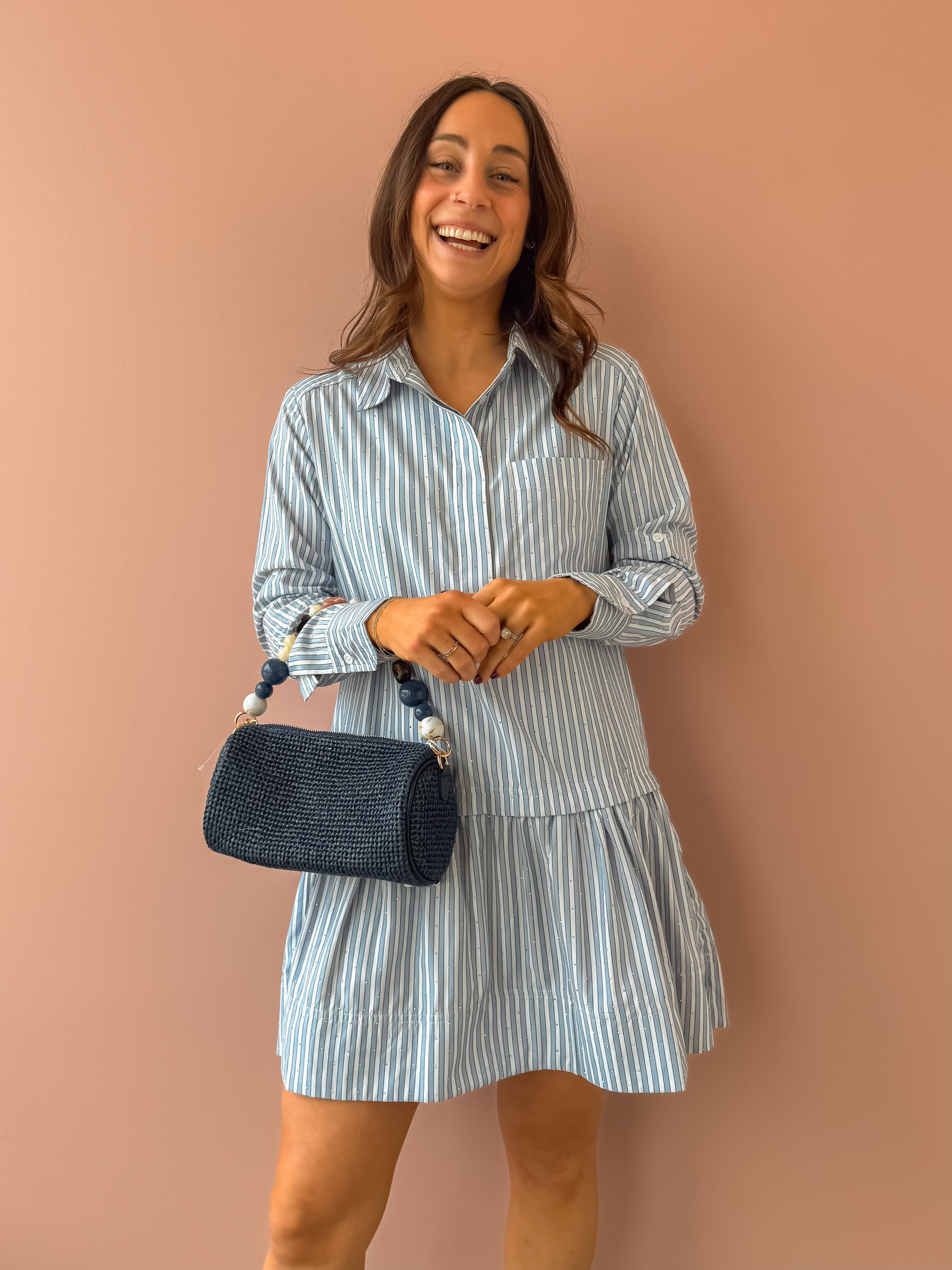 The Chelsea Shirt Dress brings effortless style with its eye-catching stripe pattern and sparkling rhinestone accents. Rock the classic point collar and button-down front, then play with the roll-tab sleeves for a customized look. The oversized, relaxed fit pairs perfectly with the drop-waist silhouette and playful high-low tiered hem. Mini length with major personality—dress it up or down for instant versatility.
