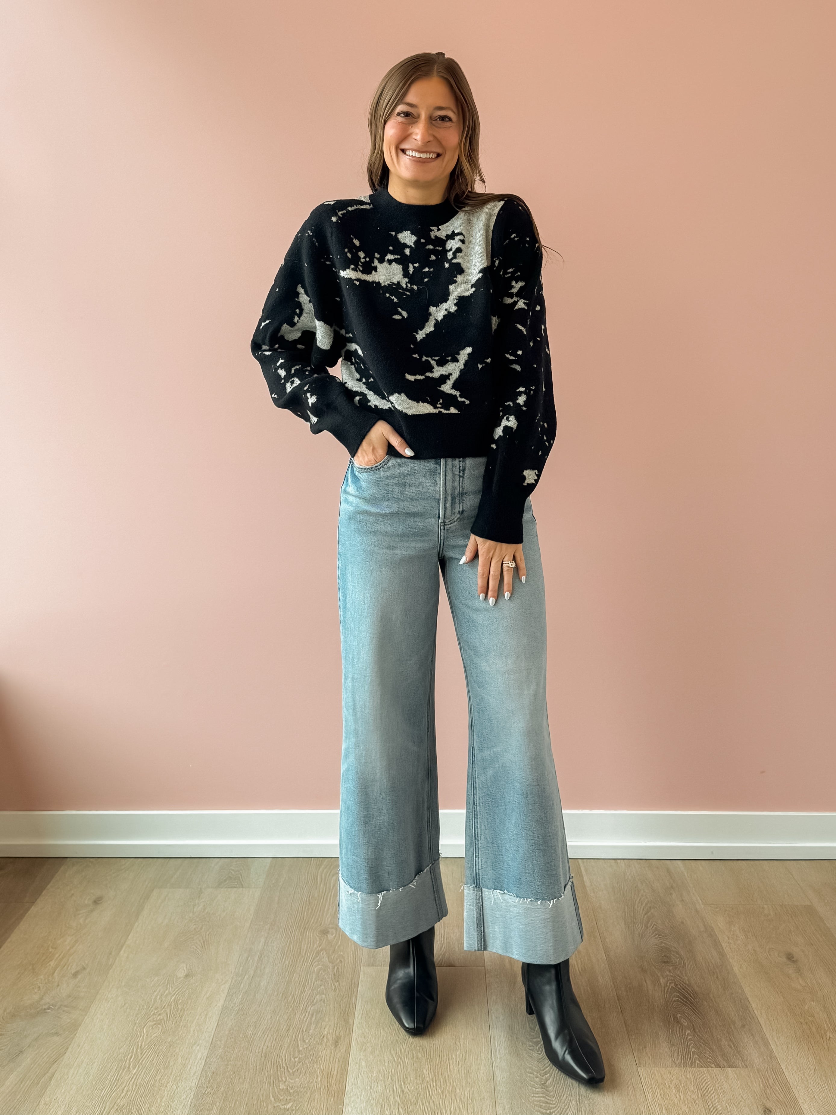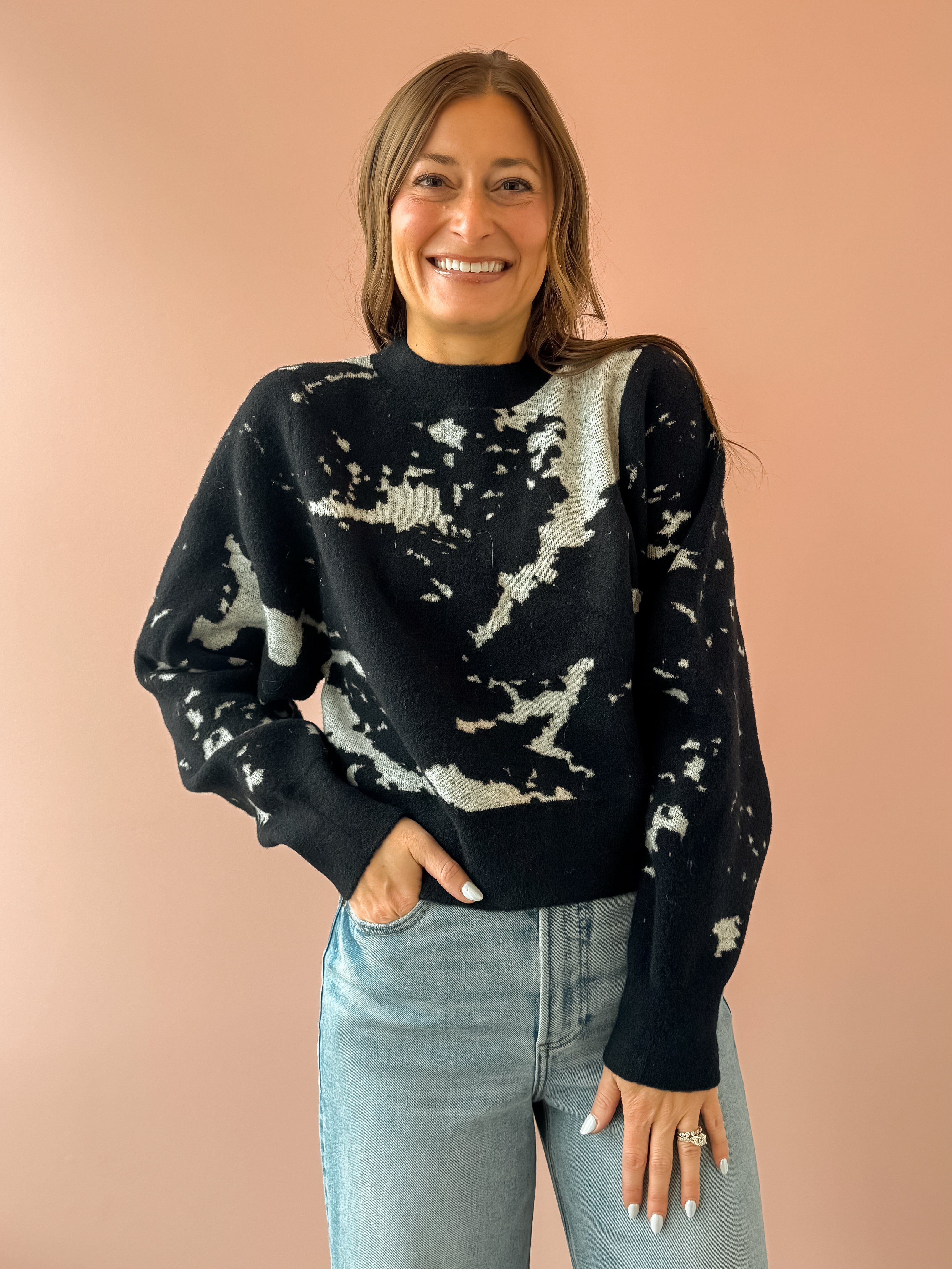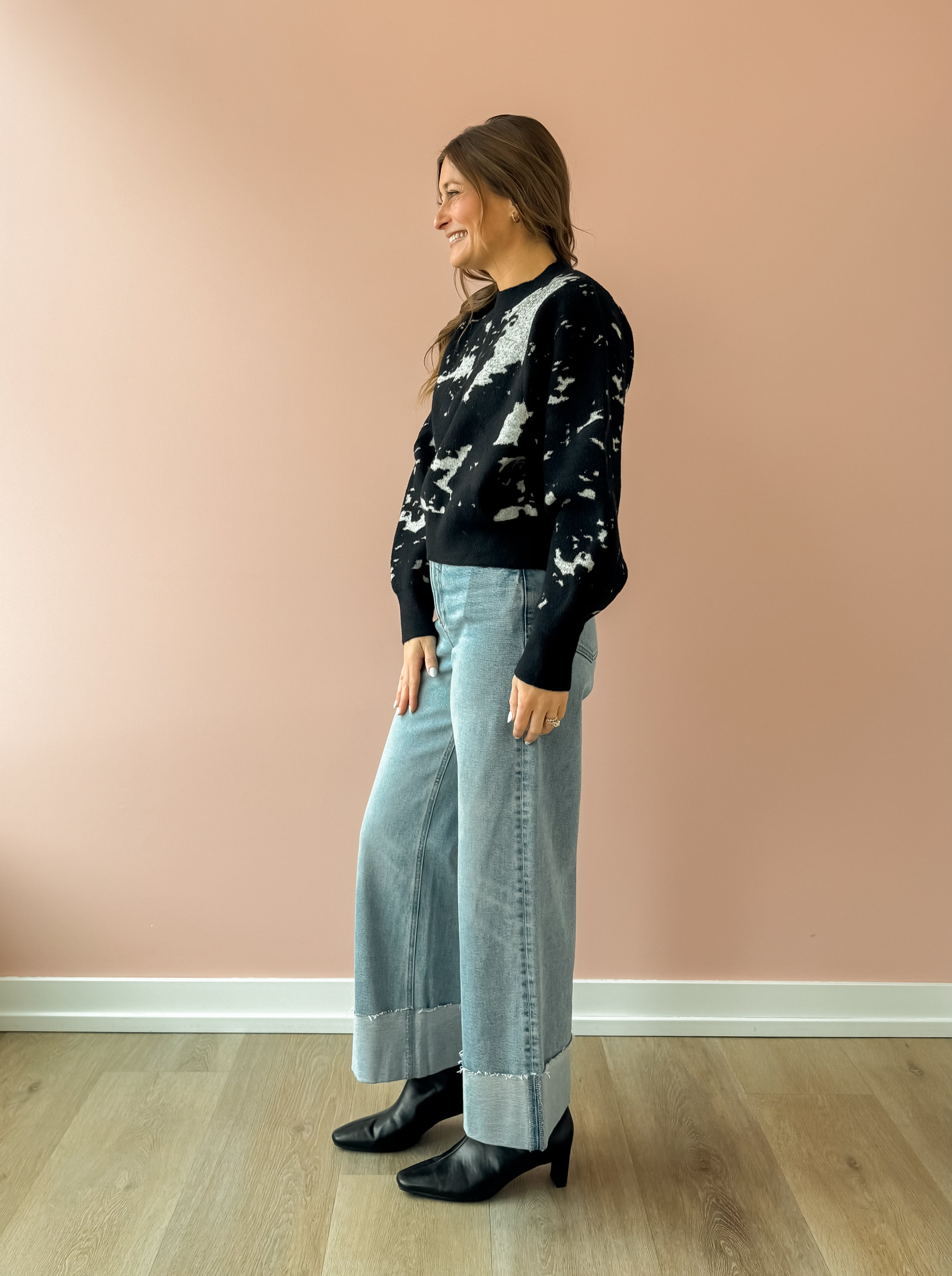The Chelsea Sweater is cozy with a little edge — a super soft, semi-cropped knit featuring a bold black and white cow print pattern. With its classic crewneck and just-right length, it’s made for multiple occasions. Style it with black jeans and a sleek bootie for an effortlessly cool look.