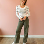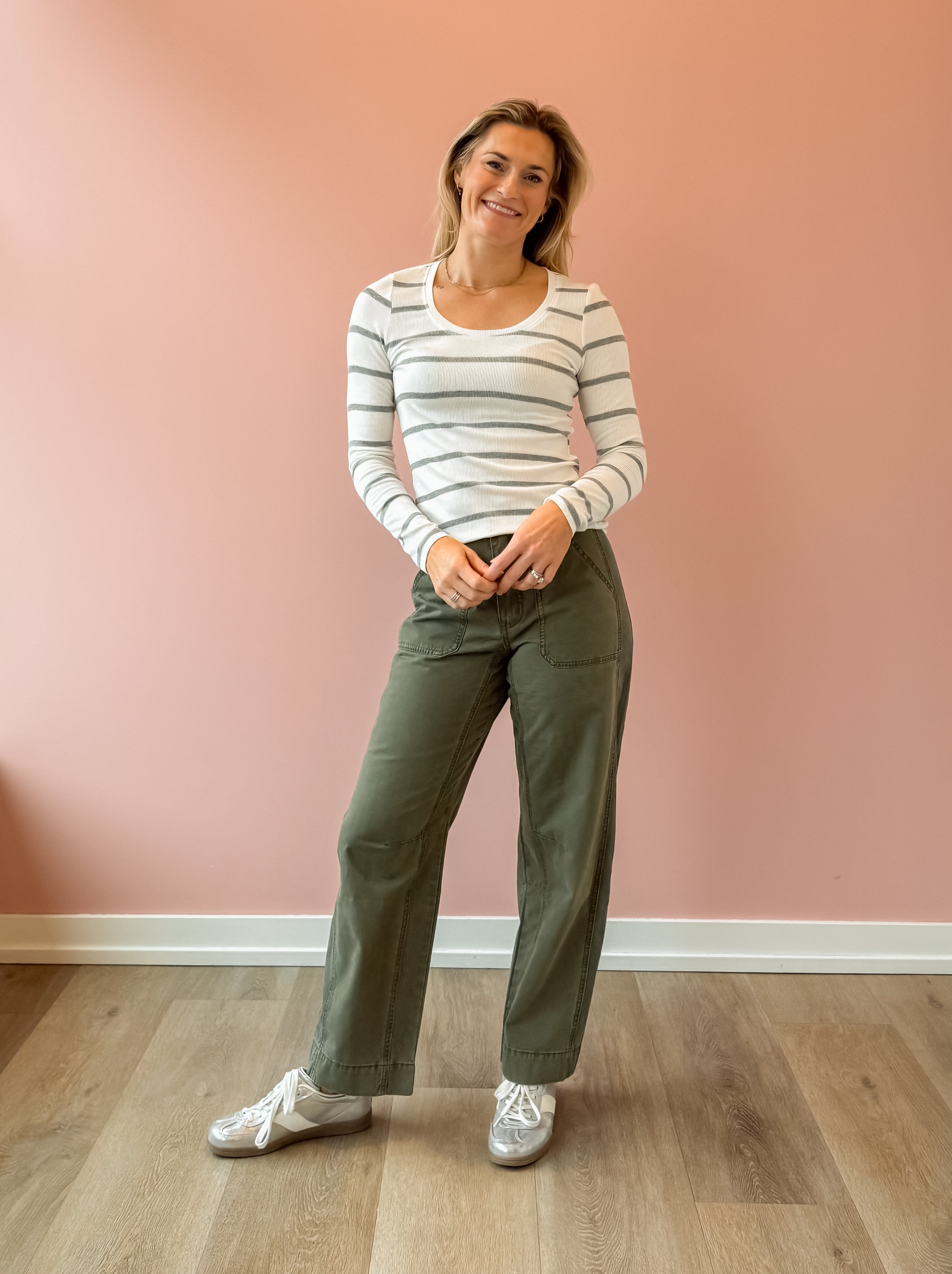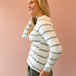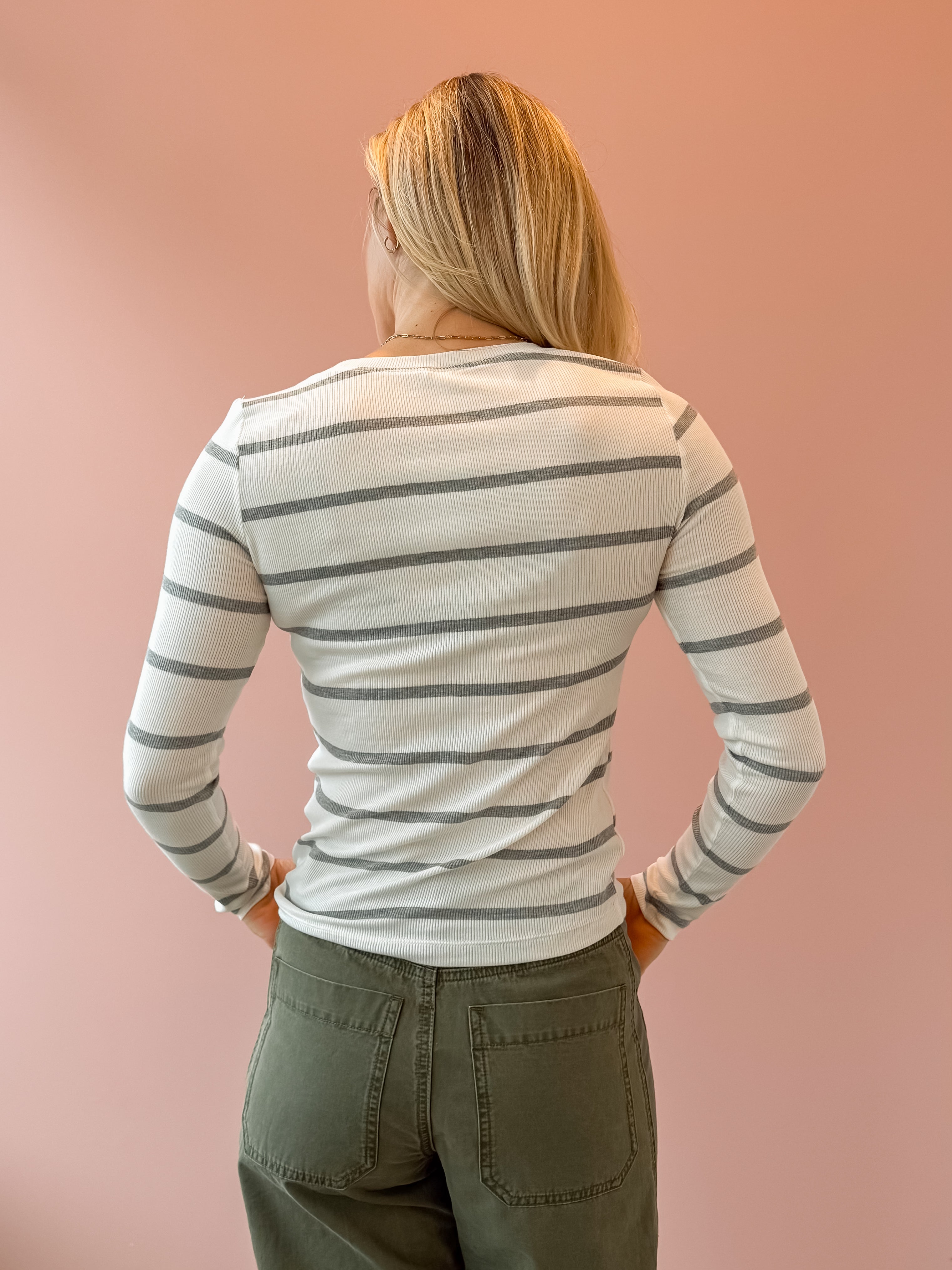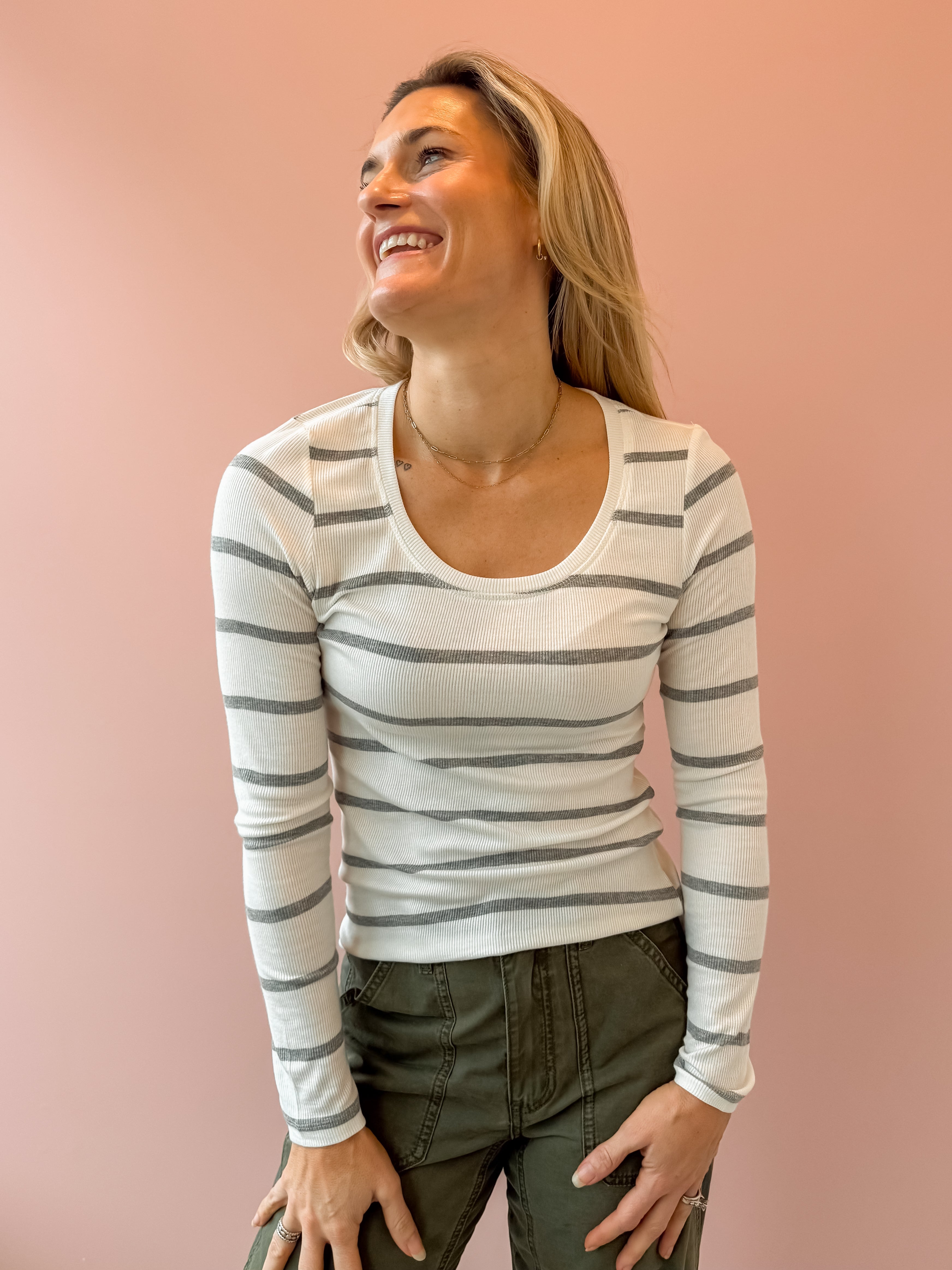 A timeless essential with a flattering silhouette, this striped long-sleeve top is designed to elevate everyday dressing. Crafted in a soft, ribbed knit, it features a wide scoop neckline that frames the collarbone beautifully while maintaining a clean, minimal look. The slim, body-hugging fit makes it ideal for layering or wearing on its own, and the classic white-and-gray stripe adds effortless versatility. Pair it with denim for a casual feel or dress it up with tailored trousers for an understated, polished outfit.