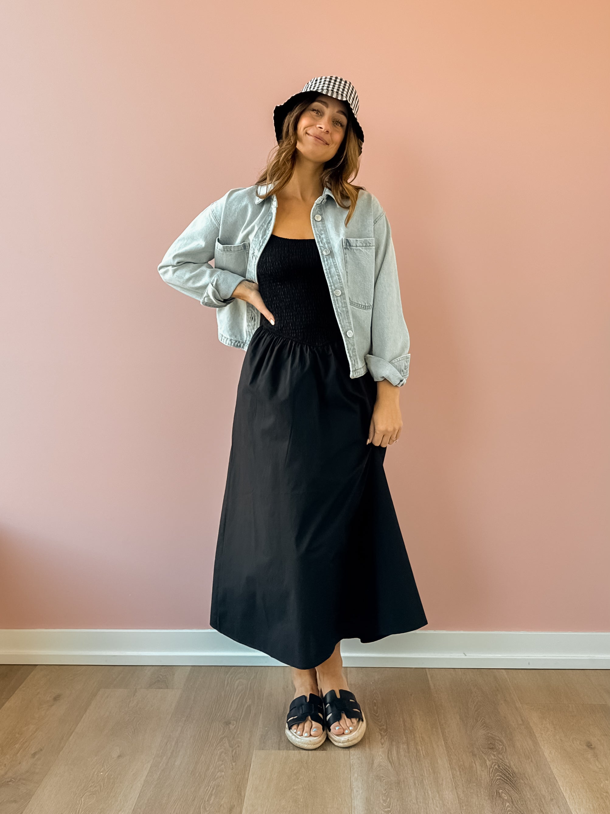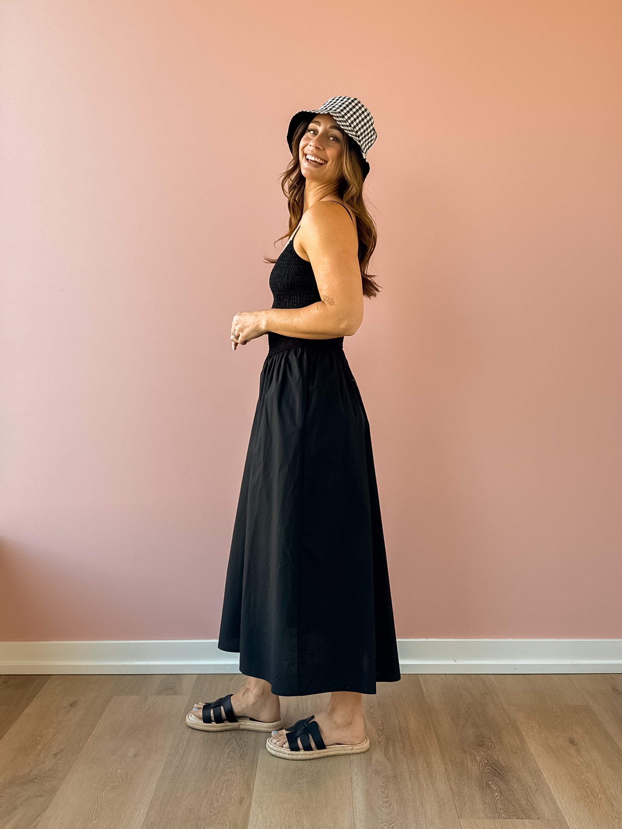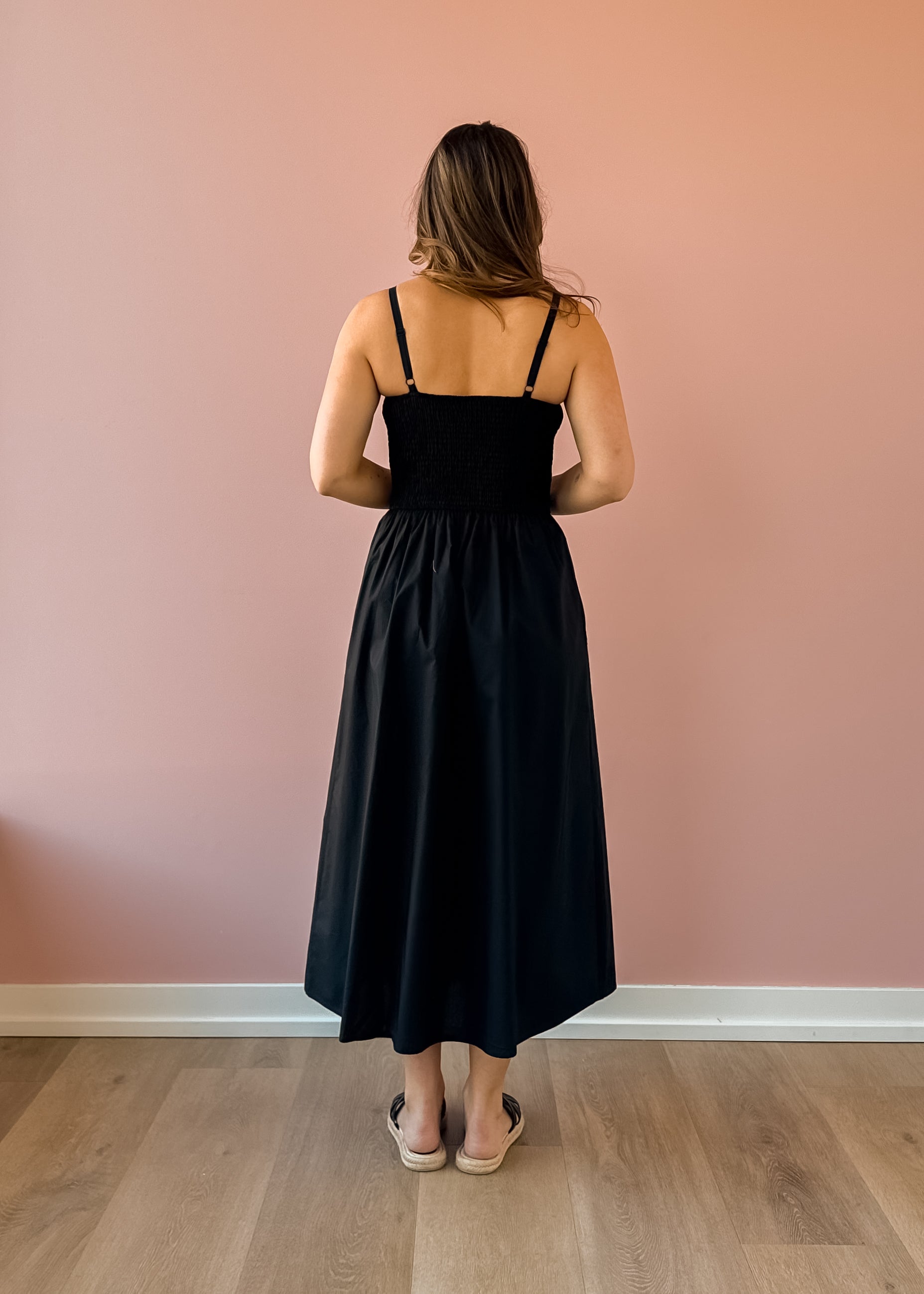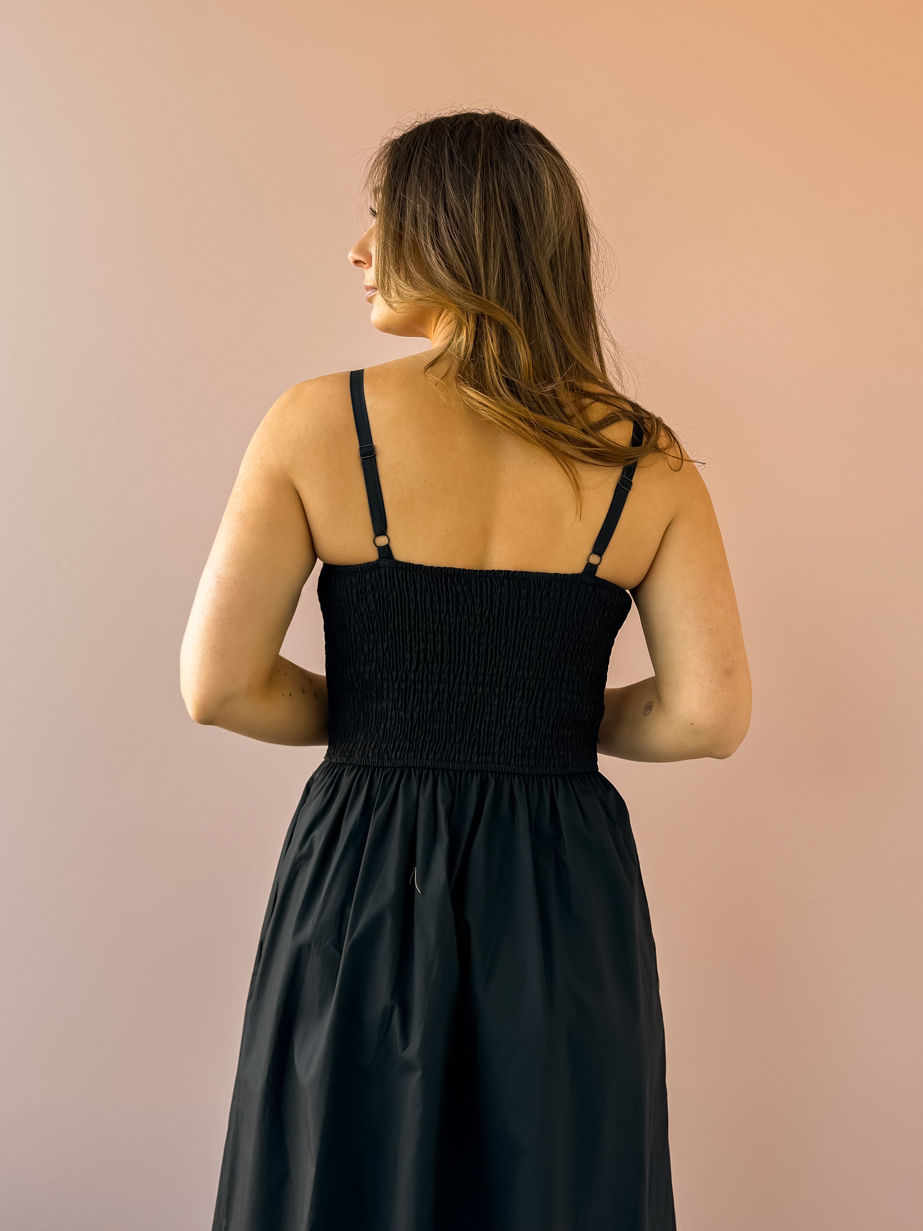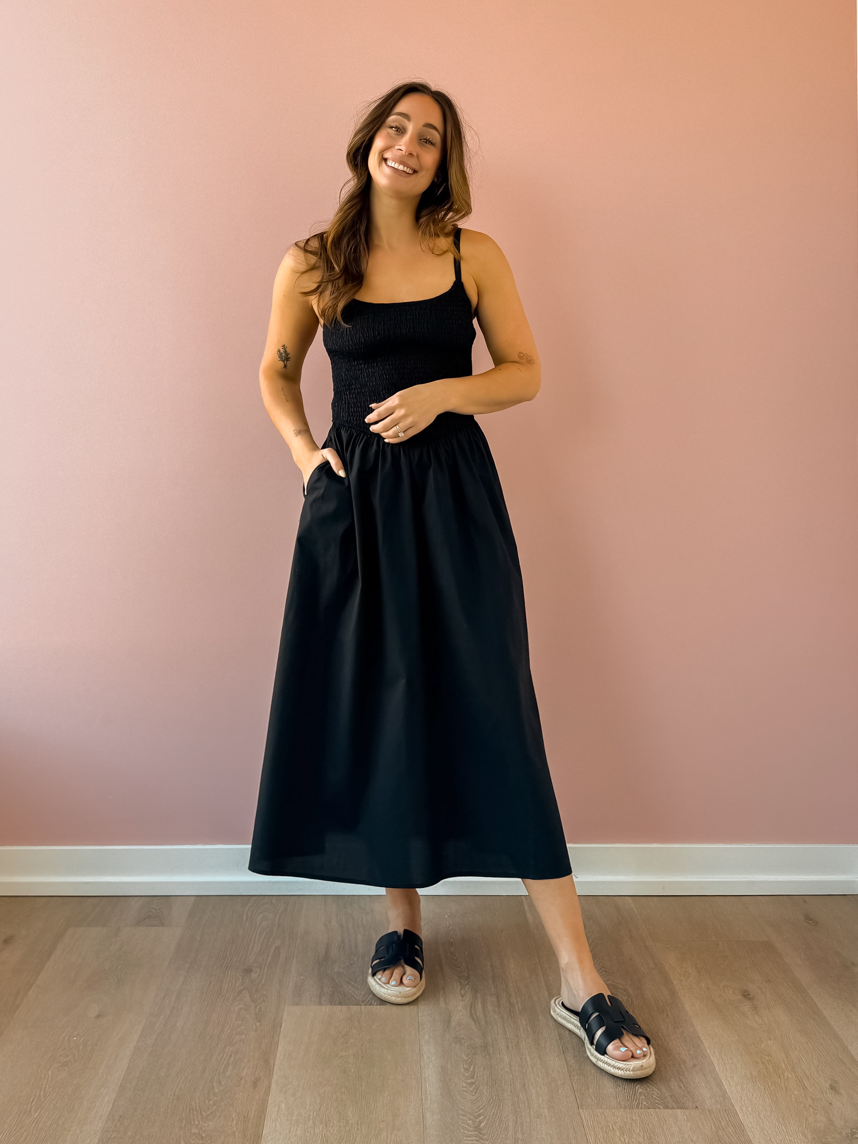 Crafted from midweight poplin fabric, this dress is designed for comfort and style. It features a cinched elastic bodice and adjustable shoulder straps for a customized fit. The pull-on styling makes it easy to wear, while the side seam pockets add a practical, chic touch. Unlined for a light, breezy feel, it’s the perfect piece for those days when you want to feel effortlessly put together. Style this with flats or heels!