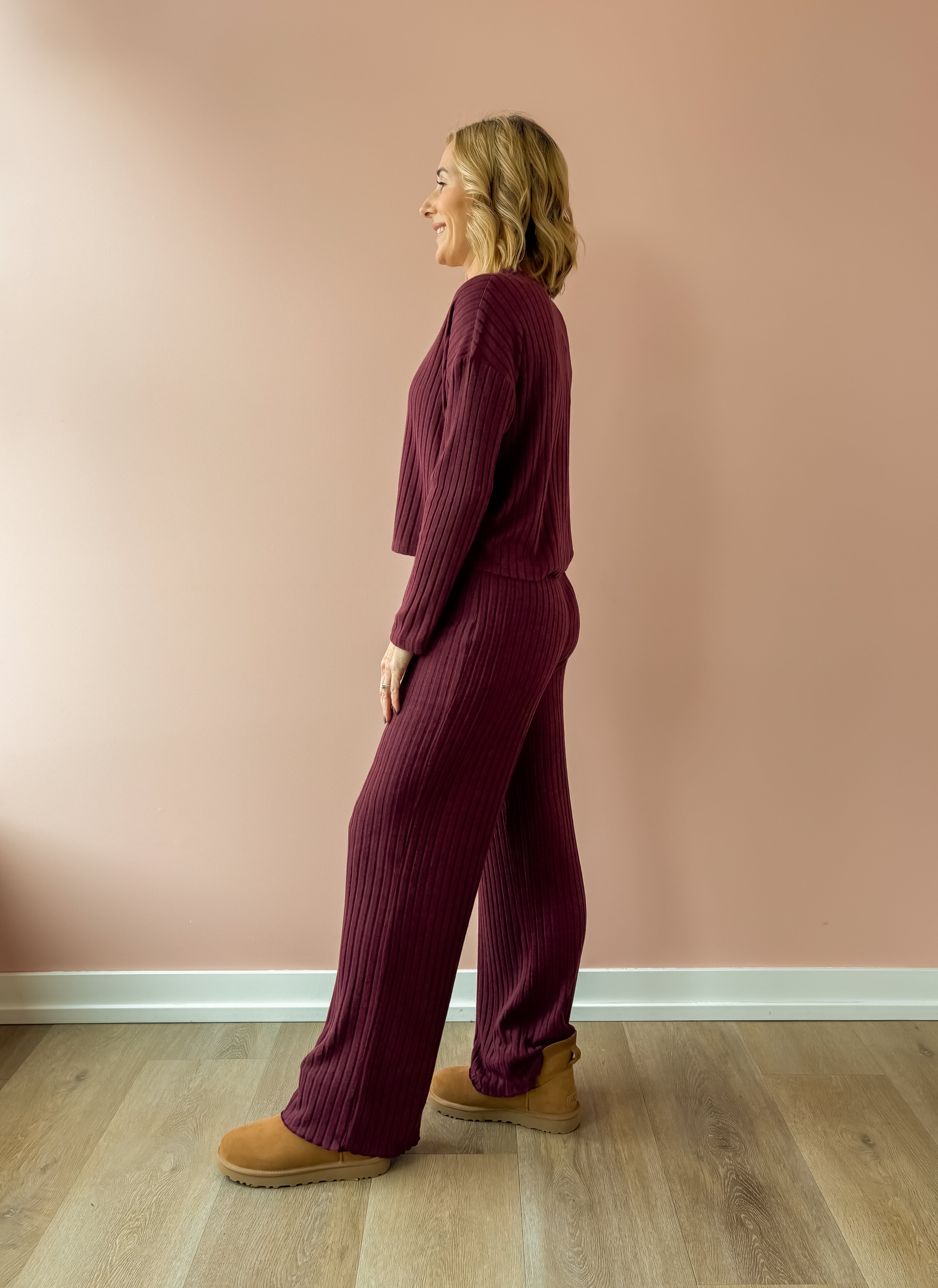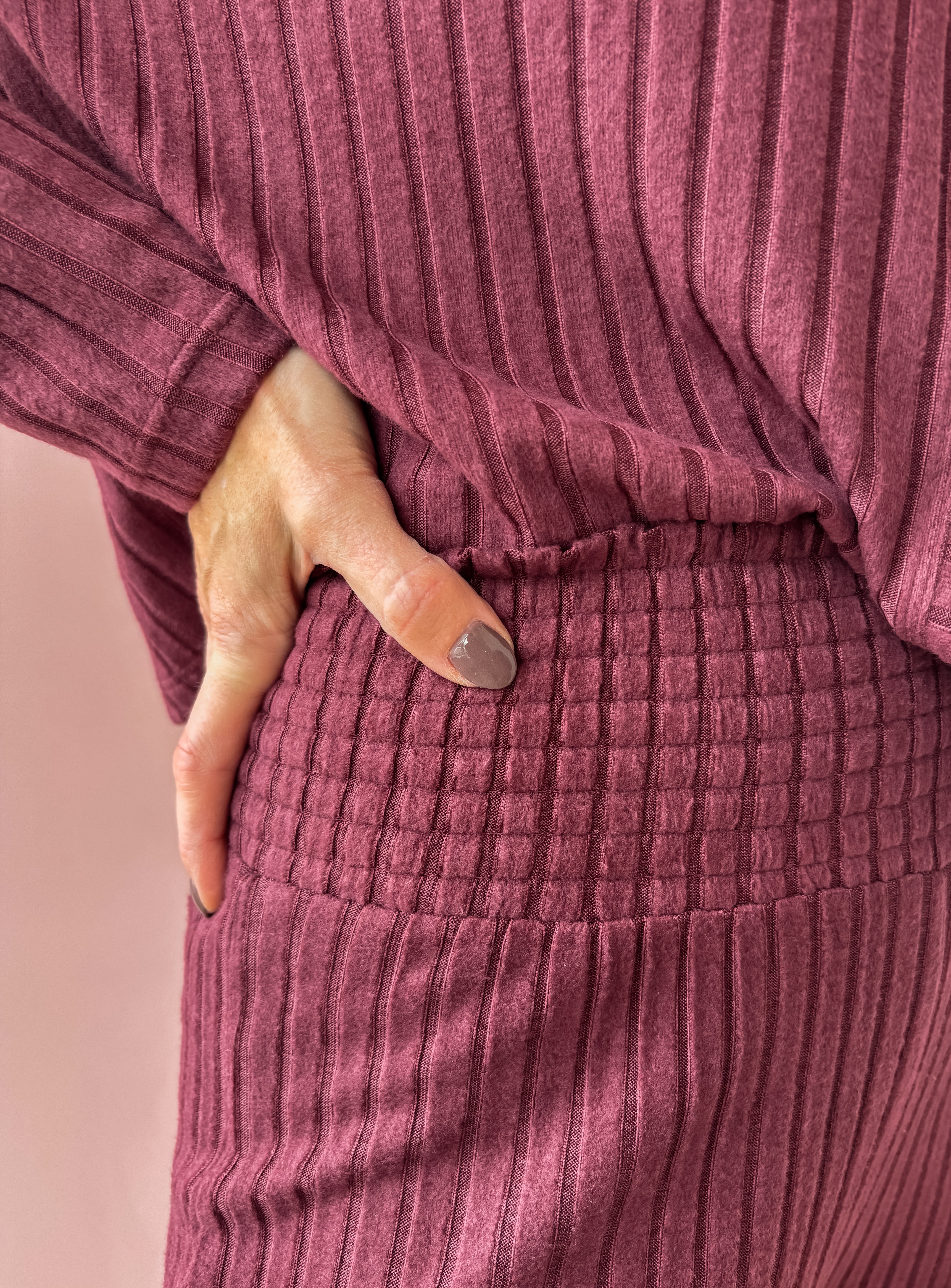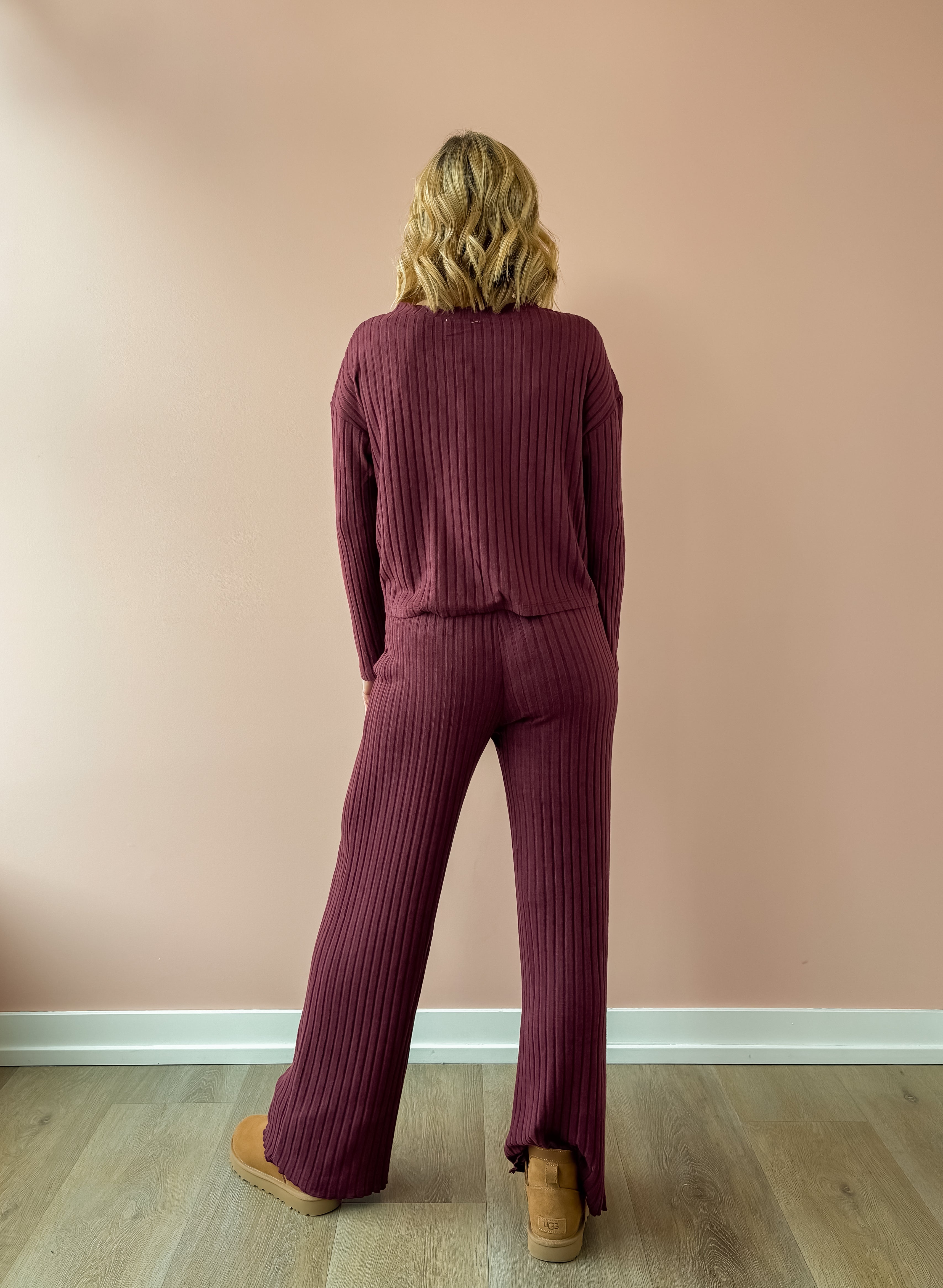 Discover effortless comfort with the Dawn Smocked Rib Pant. Featuring a high-rise silhouette and a relaxed full-length cut, these pants are designed for lounging in style. The signature smocked waistband provides a secure, comfortable fit, while the soft, midweight rib fabric moves with you thanks to its gentle stretch. In a rich merlot hue, they pair perfectly with our Mara Rib Cardigan for a coordinated loungewear set that feels cozy, polished, and made for relaxing at home.