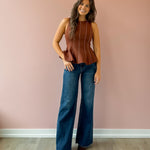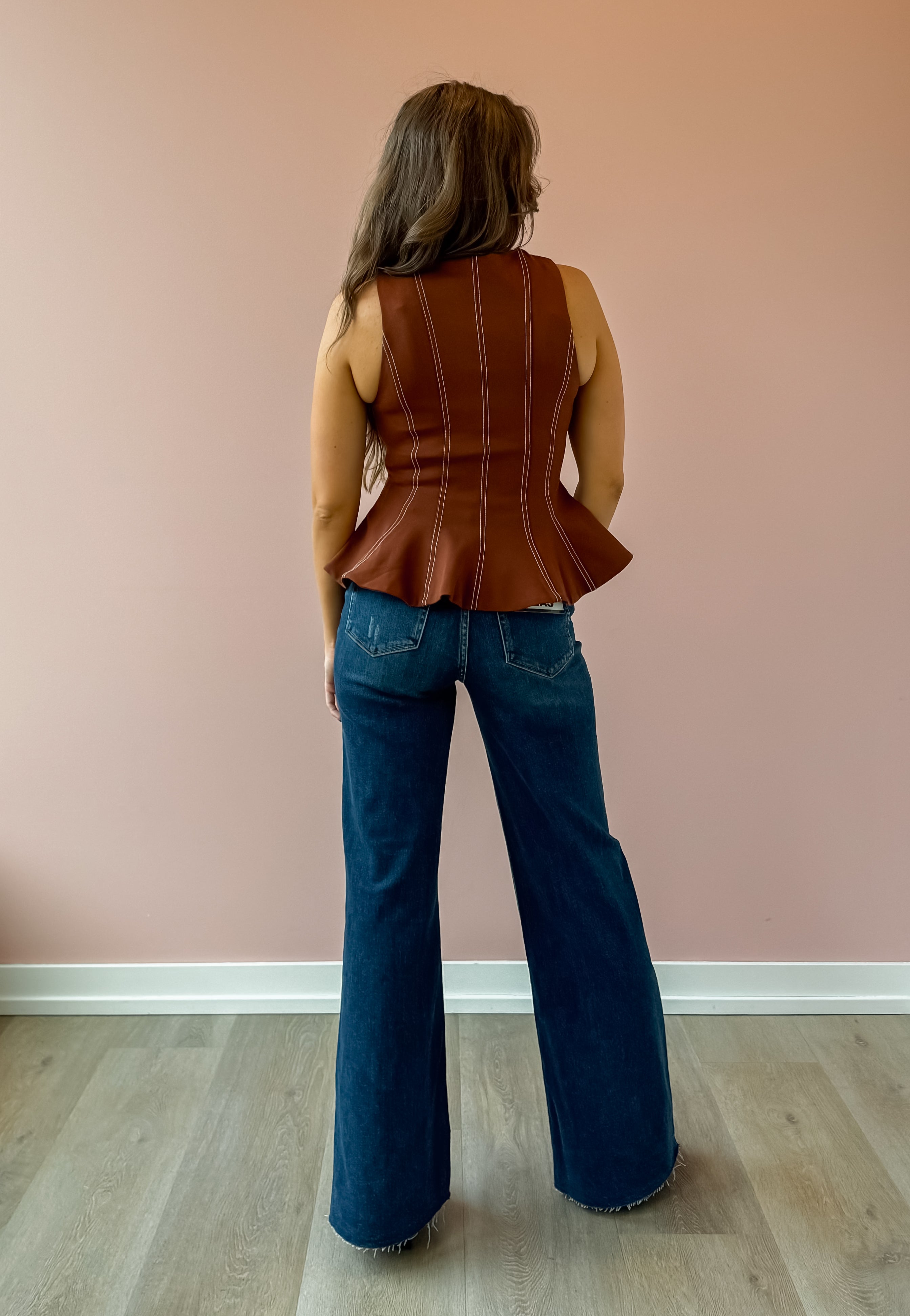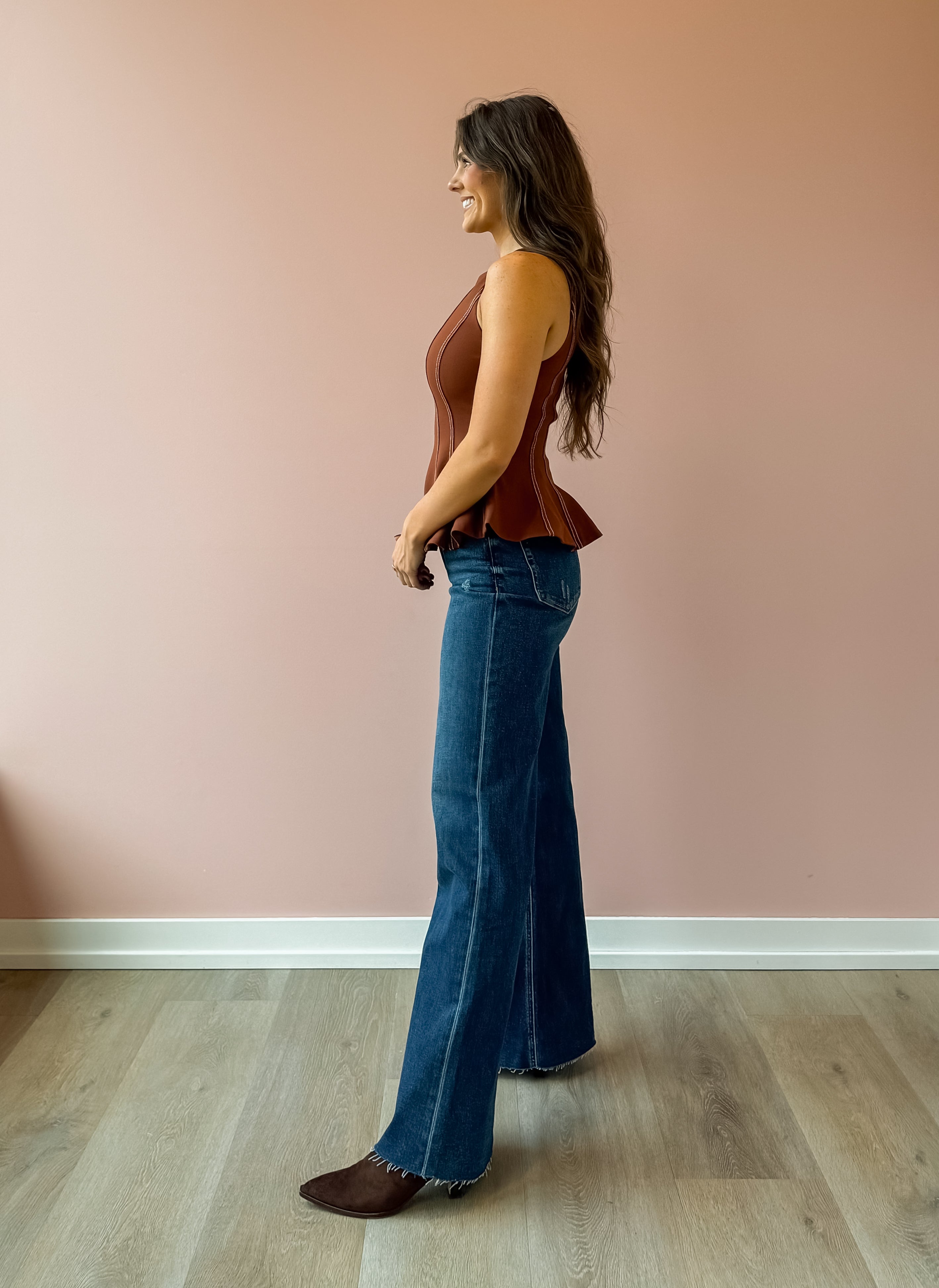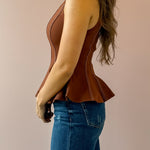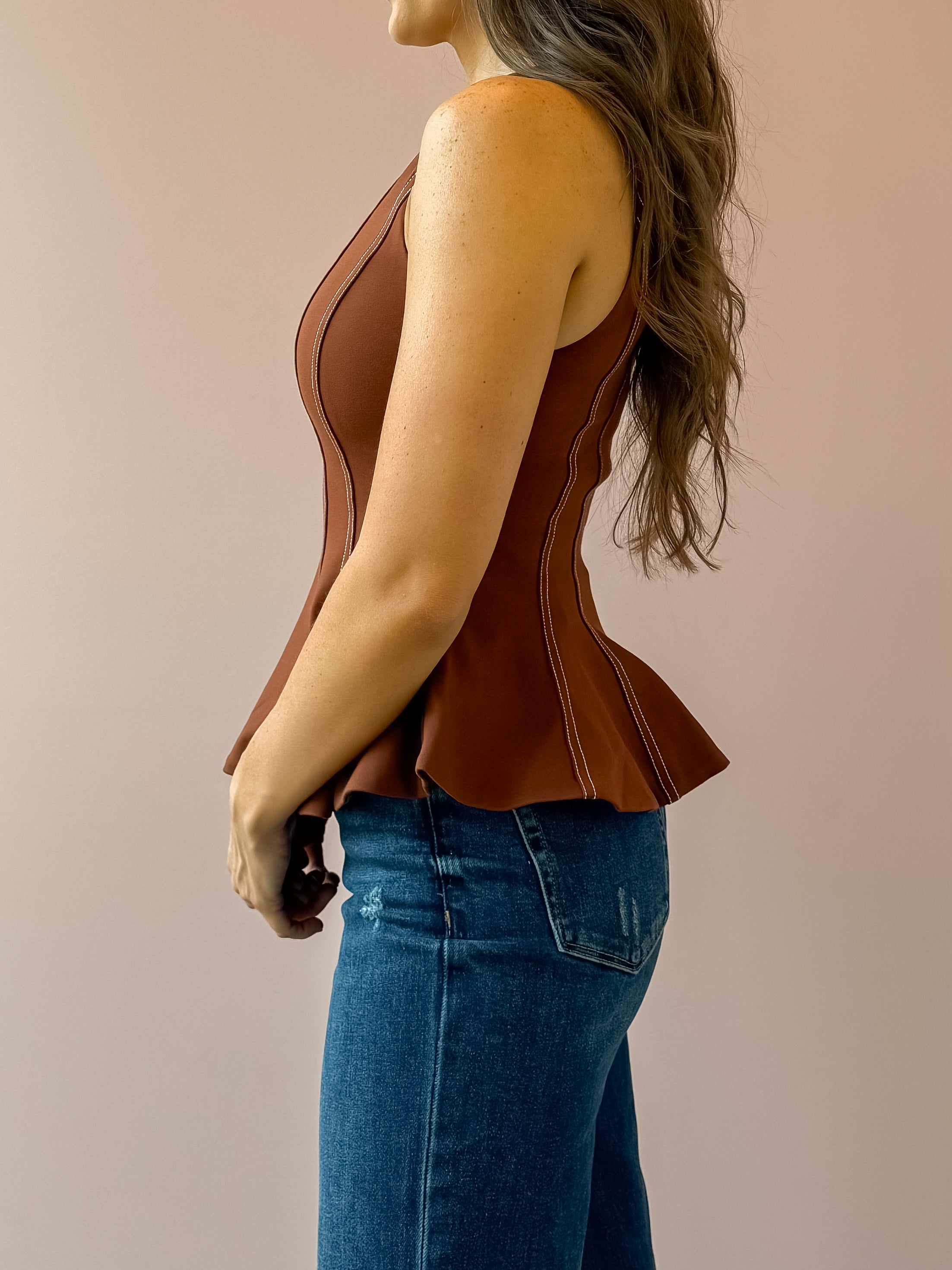 The Delaney Top combines comfort and style with its soft brown fabric and crisp white top stitching. Its flattering peplum silhouette and sleeveless design make it versatile—perfect for pairing with tailored trousers at the office or denim and heels for a date night look!