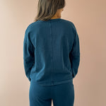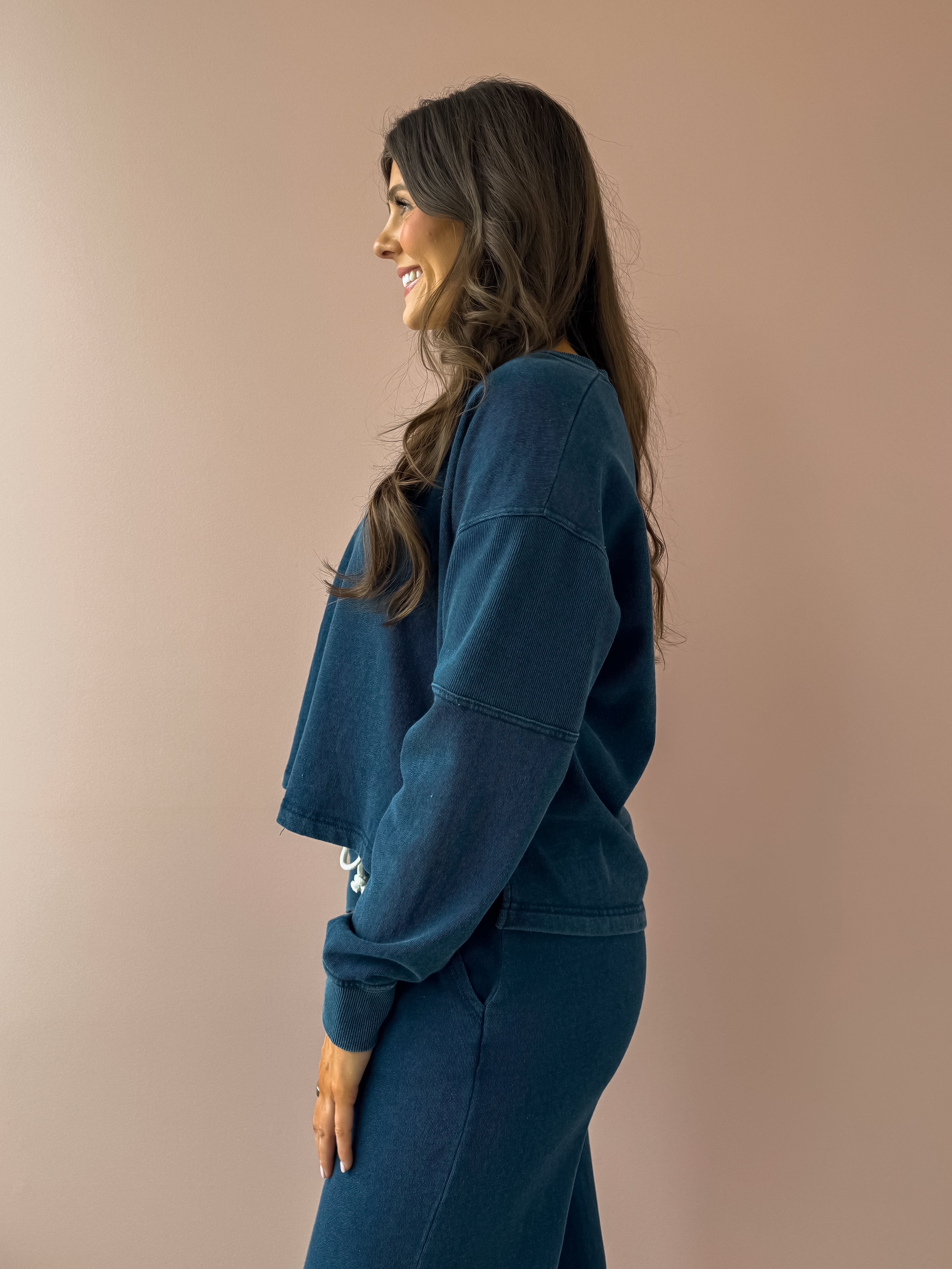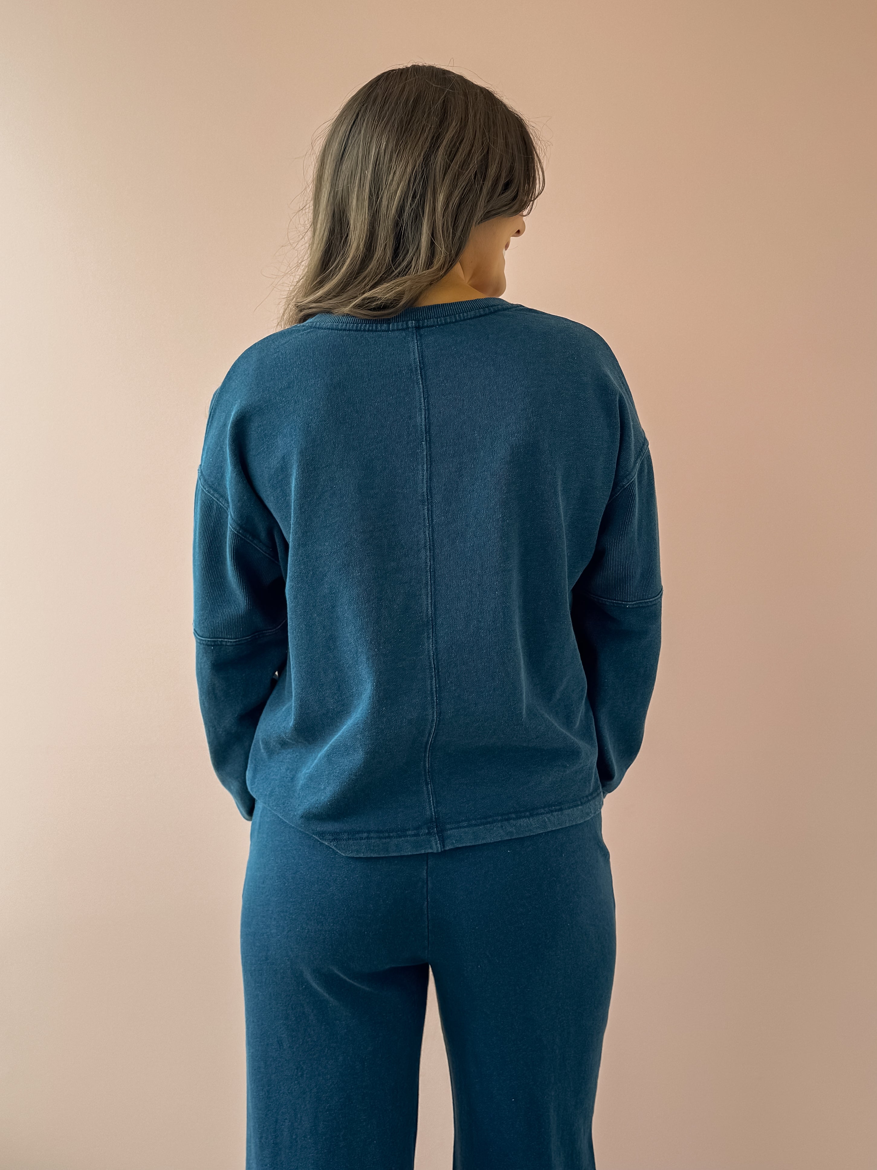 Soft knit denim gives this v-neck sweatshirt its perfectly laid-back feel. Finished with a mineral wash for a lived-in look that gets better over time, it features subtle rib details and an easy, relaxed fit. Pair it with our Hunter Knit Denim Pant and a fresh sneaker for effortless, everyday style.