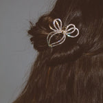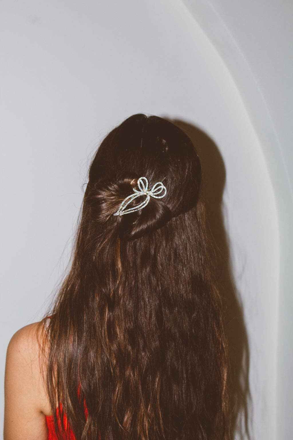 Elevate your everyday hairstyle with this stunning Diamond Bow Hair Pin—a sophisticated twist on our beloved Antoinette design. Featuring an elegant crystal bow detail, this 4-inch gold French pin combines timeless beauty with practical functionality. Perfect for securing updos with effortless grace, it's the ideal accessory for anyone seeking that polished, classic look without sacrificing comfort or style.