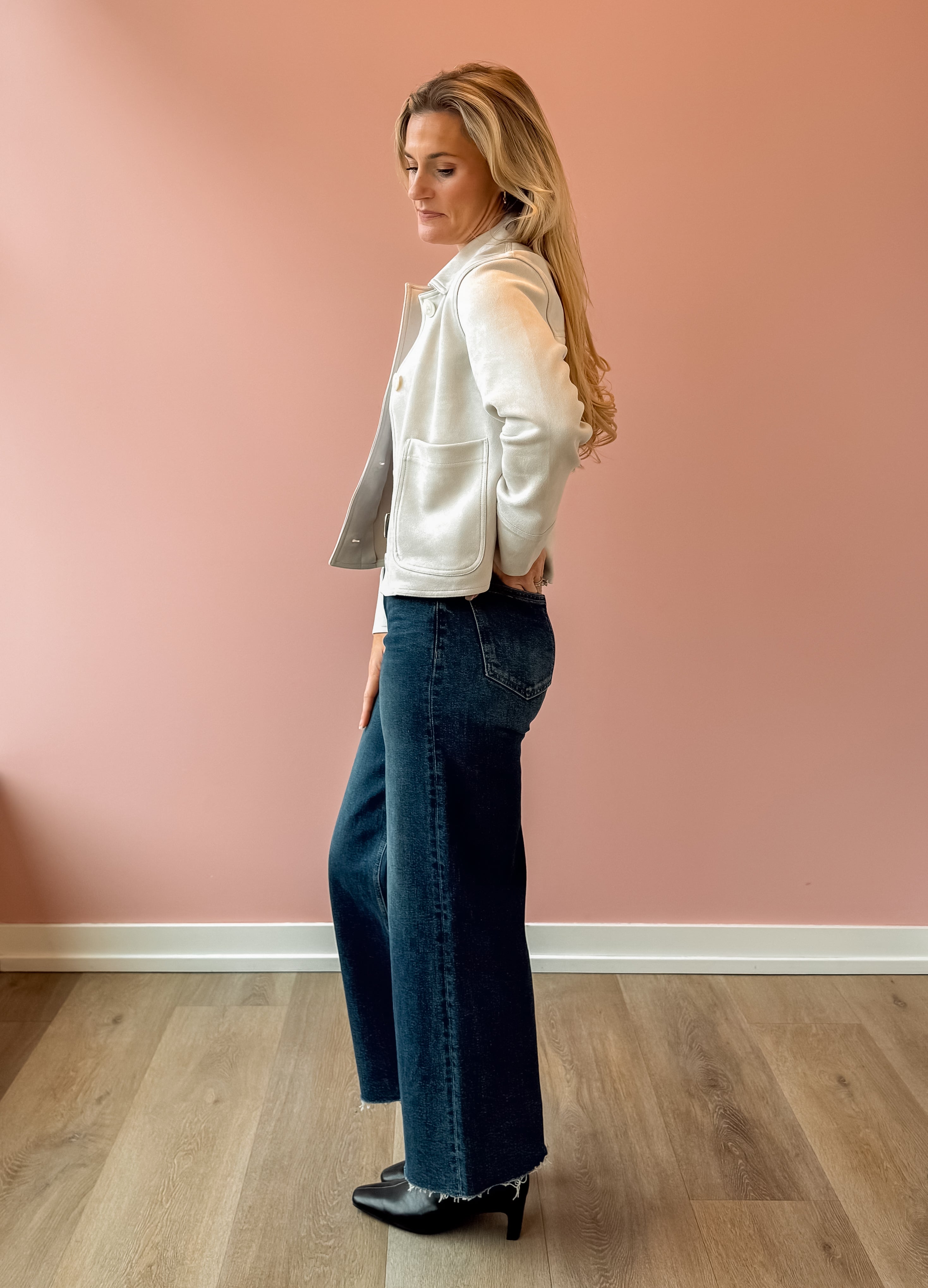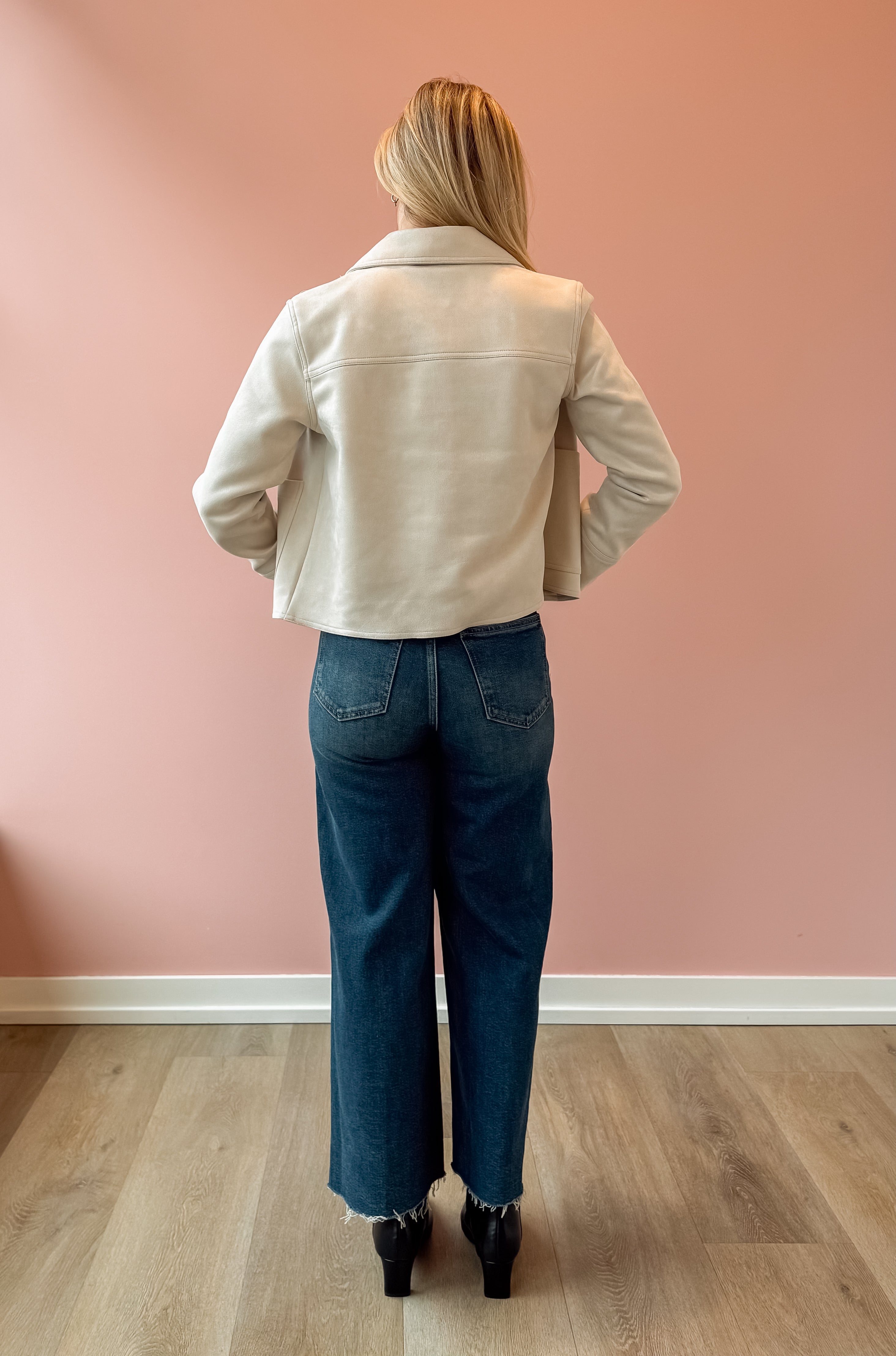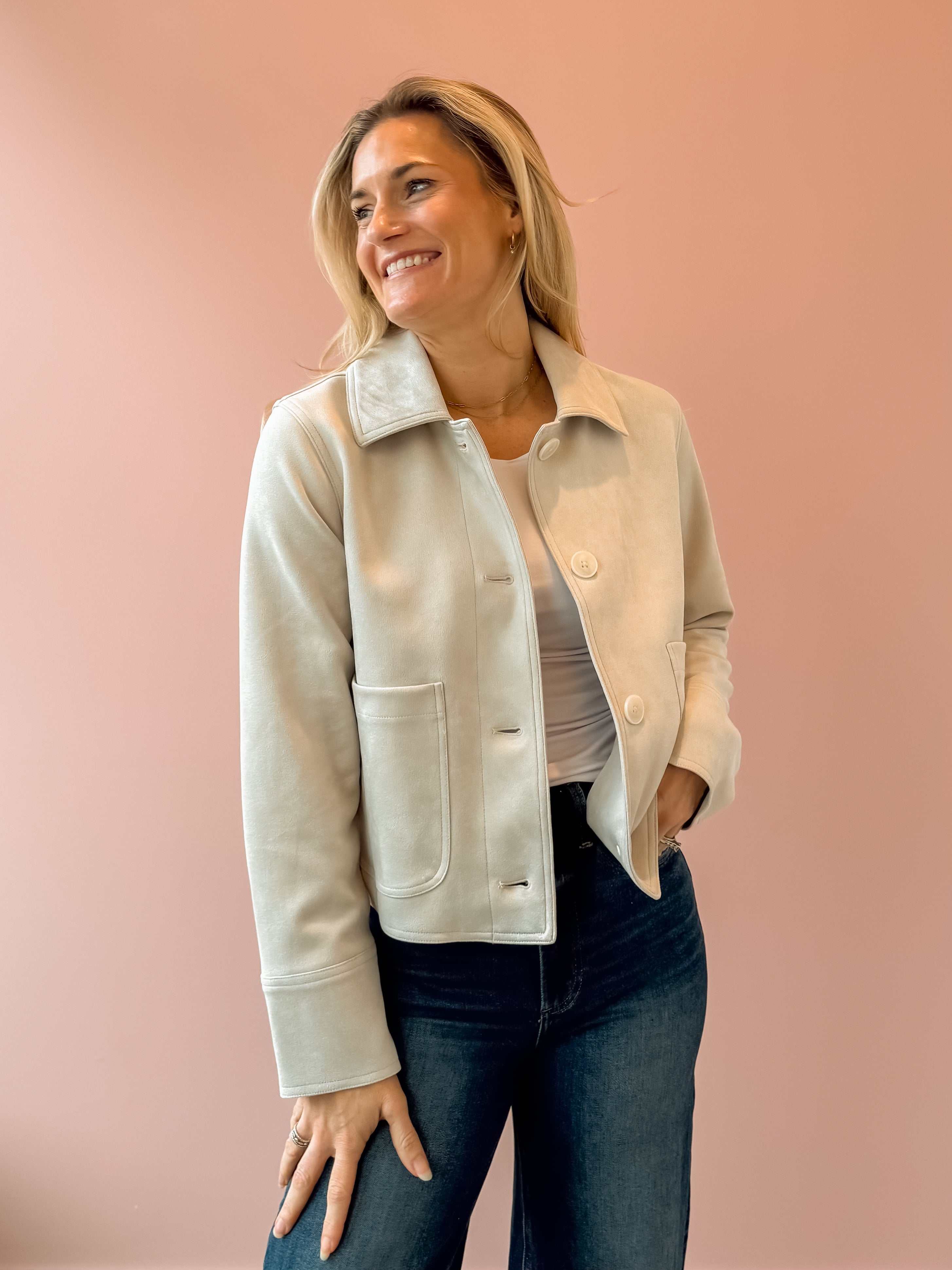 The Dillon Suede Jacket delivers effortless style with its luxuriously soft faux suede exterior and thoughtfully designed silhouette. Featuring a relaxed boxy fit, collared neckline, and convenient patch pockets, this versatile piece layers beautifully over any outfit. The button-front closure and long sleeves offer easy styling flexibility, while the midweight construction with a heavy soft wash provides comfort without bulk. Made from a durable polyester-spandex blend, this jacket combines tactile appeal with everyday wearability—the perfect addition to your seasonal wardrobe.