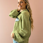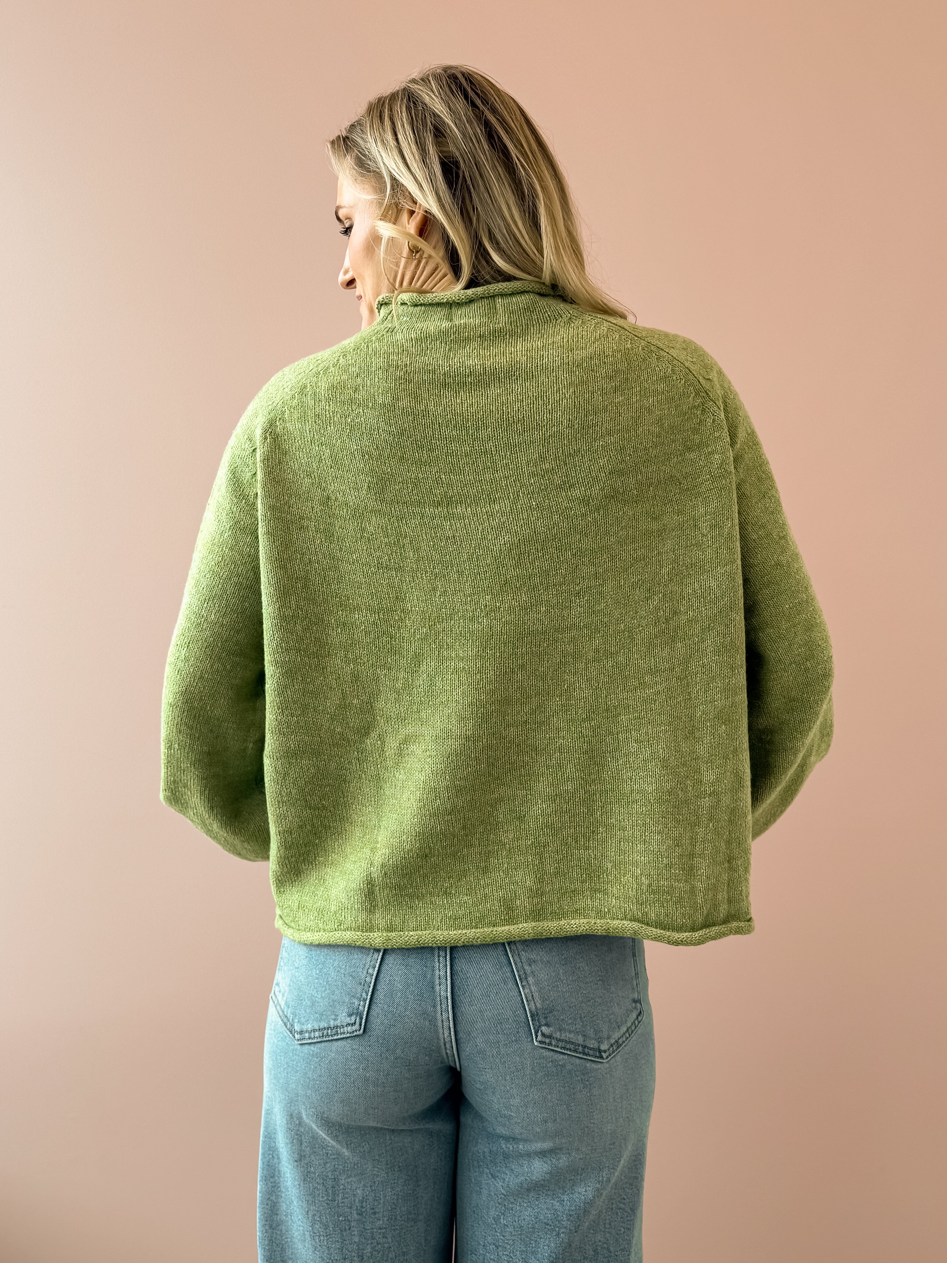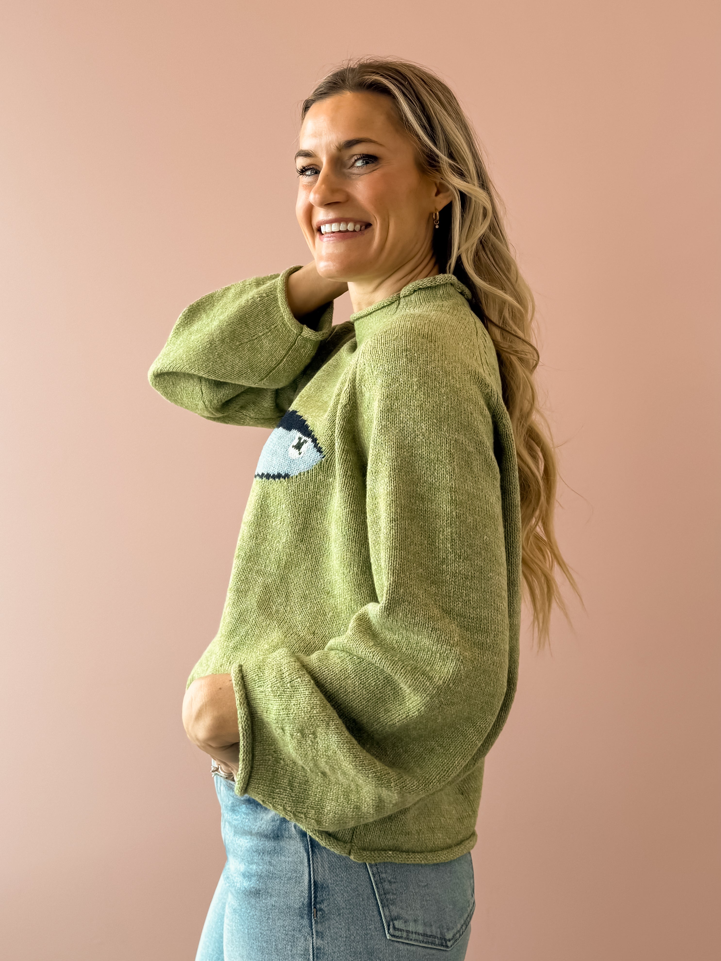 Meet your new wardrobe essential—the Dockside Sweater in a gorgeous green shade. This generously cut pullover wraps you in softness with its inviting mock neck and relaxed silhouette that feels as good as it looks. The playful fish motif adds character and charm to any outfit. Whether you're heading to the beach with shorts and sandals or keeping it casual with denim and sneakers.