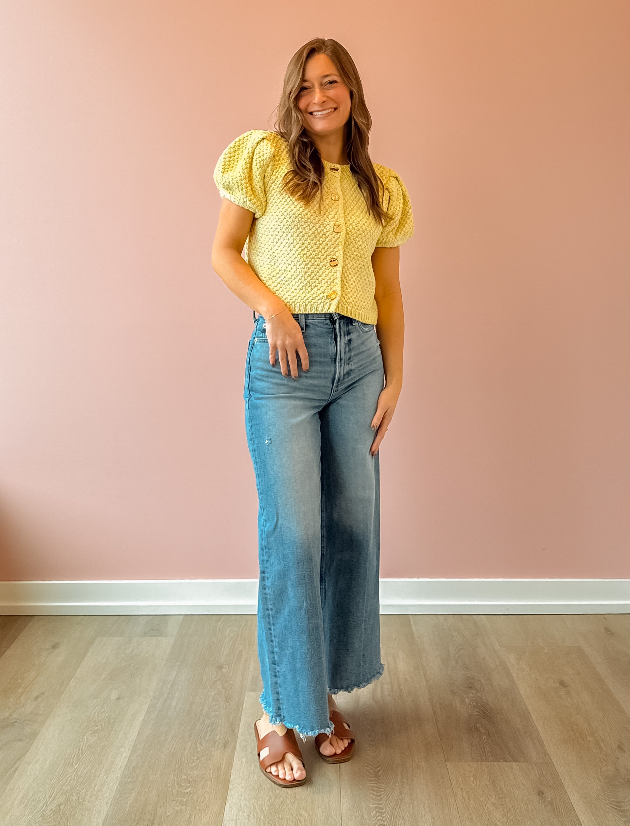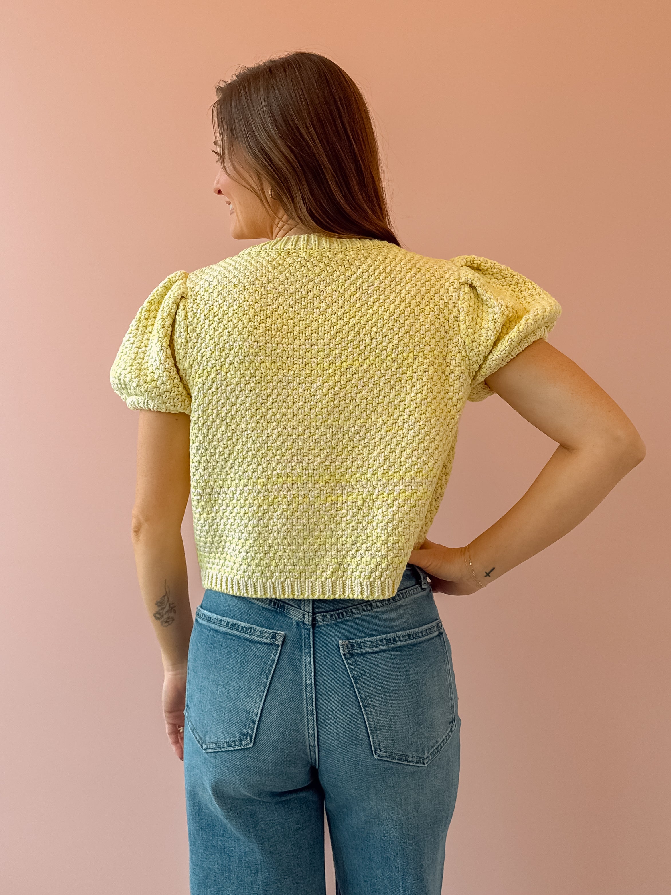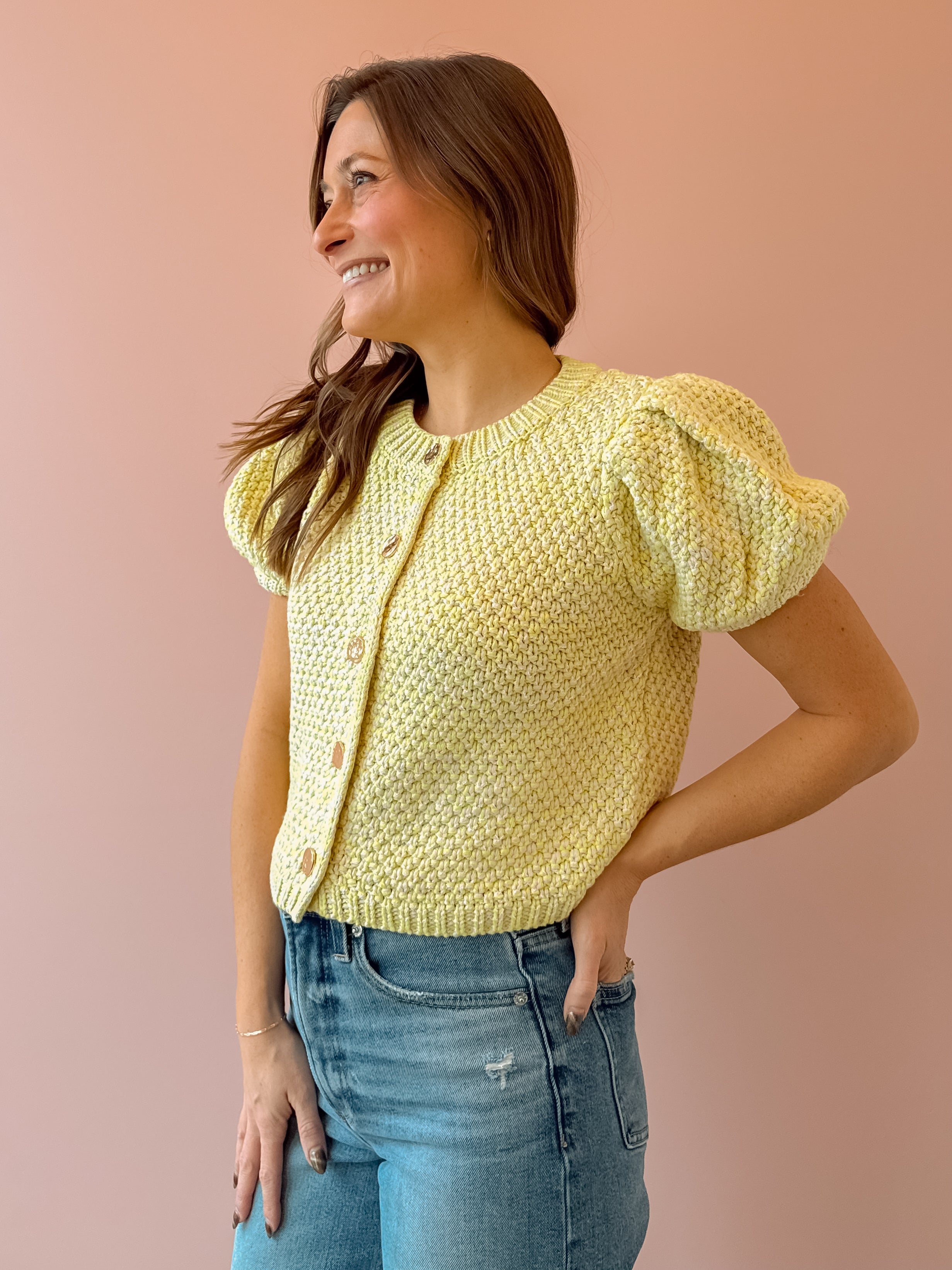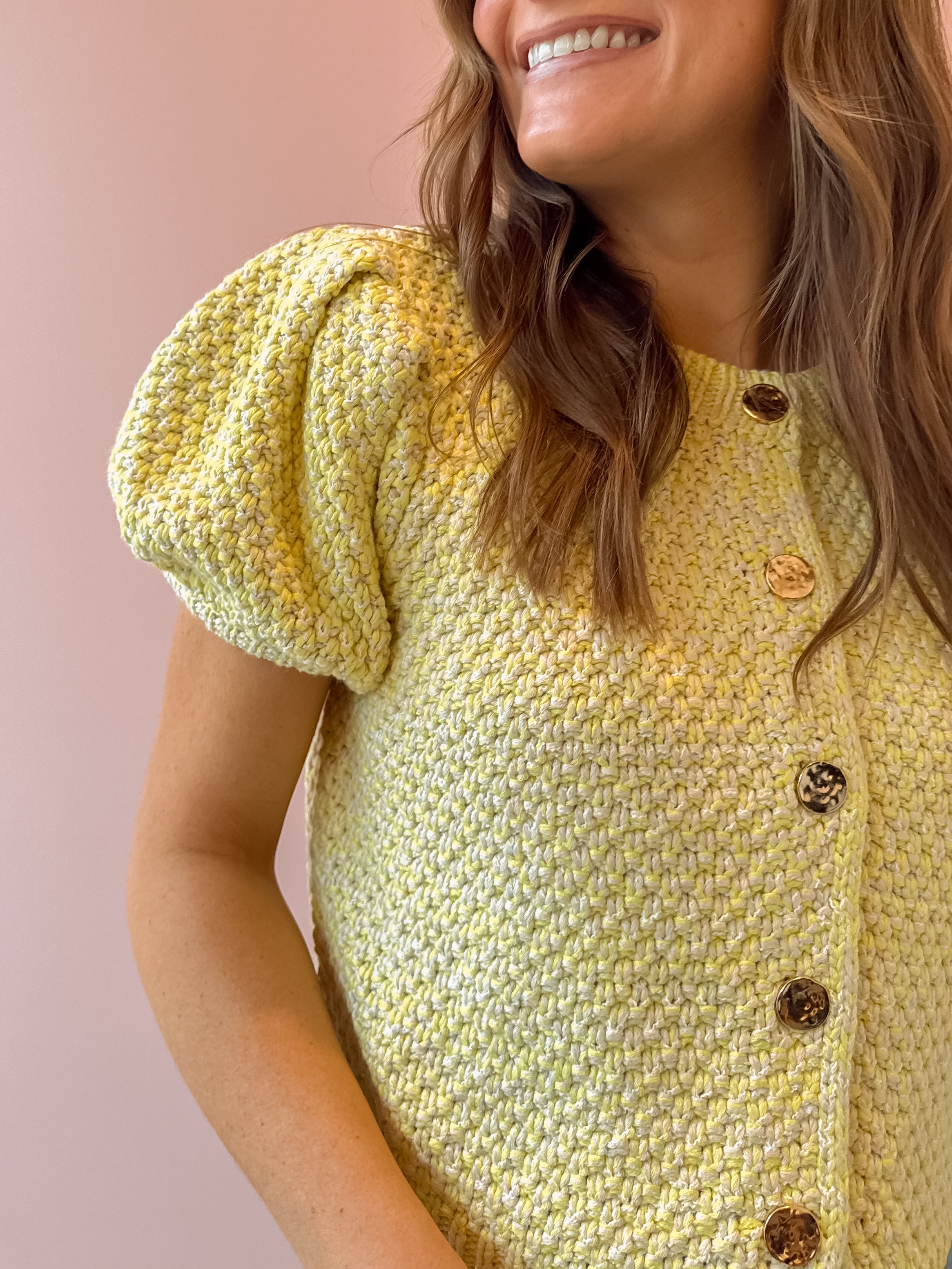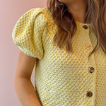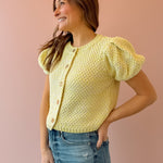 Brighten up your wardrobe with the Downtown Cardigan, a woven knit sweater that's equal parts cozy and chic. Featuring eye-catching neon yellow and adorable puff sleeves, this piece is your new spring essential. Layer it over your favorite tee or dress it up for a fun, fashion-forward look. Perfect for those in-between seasons when you want warmth without the bulk. Get ready to turn heads!