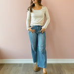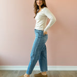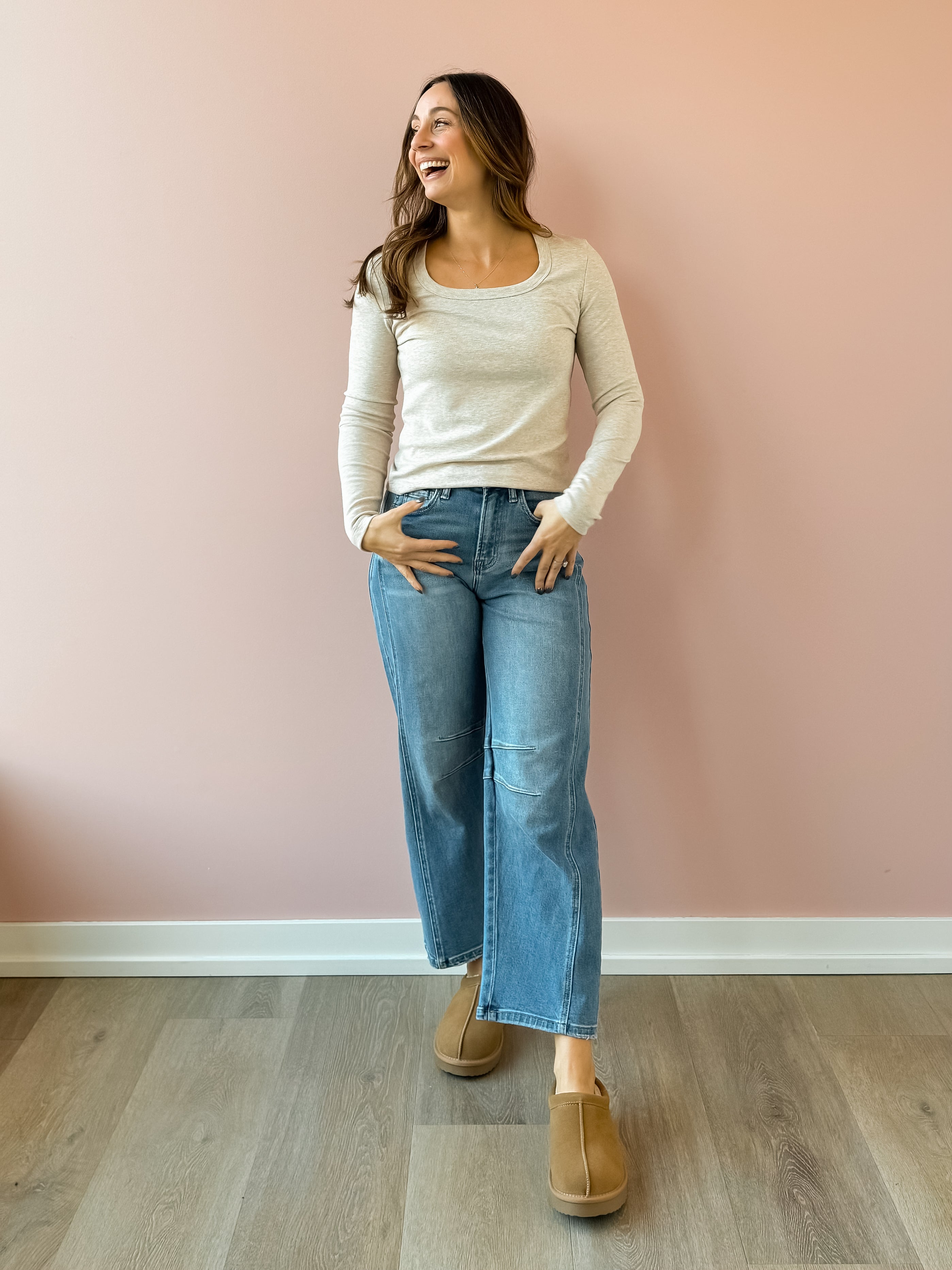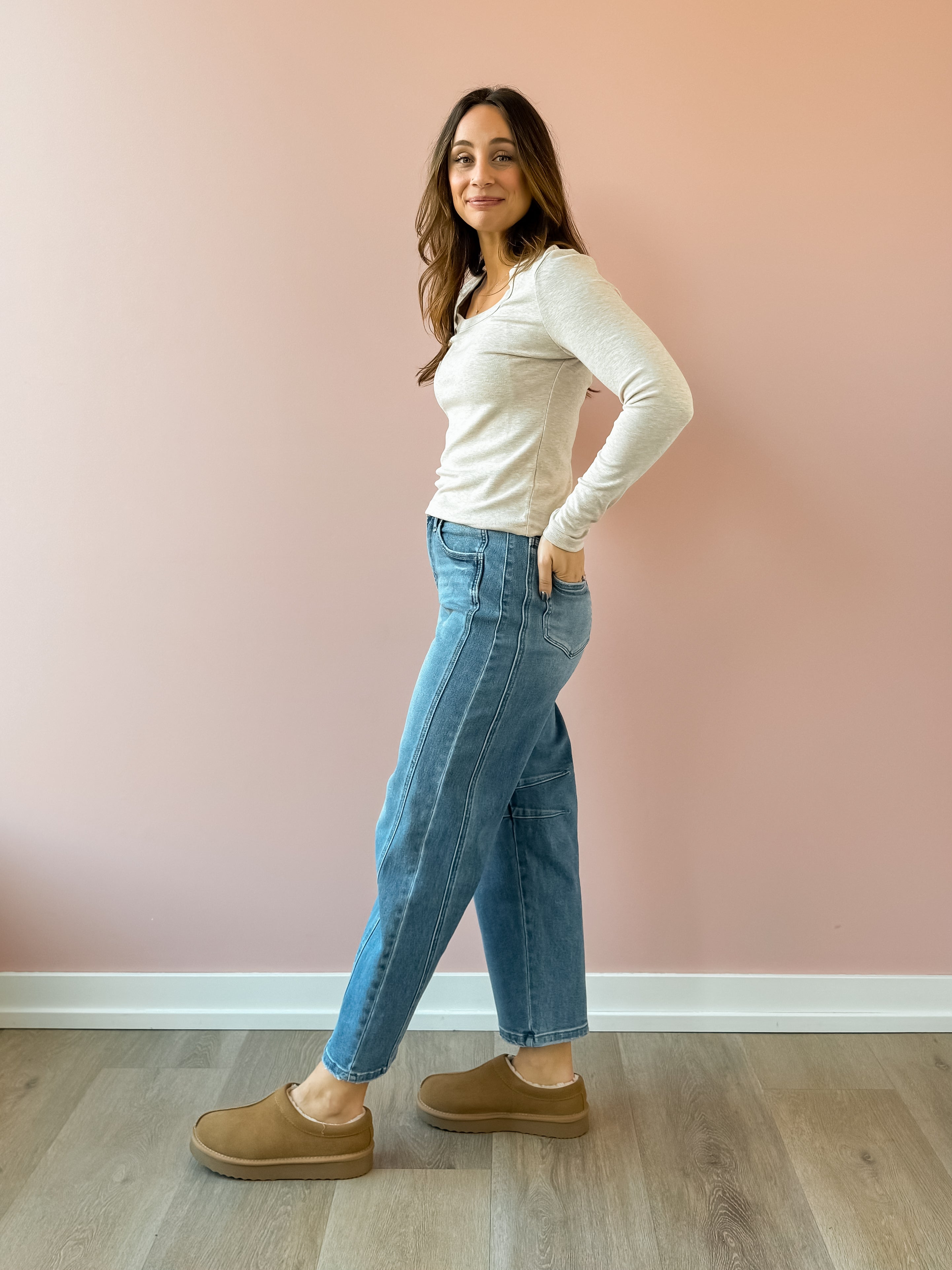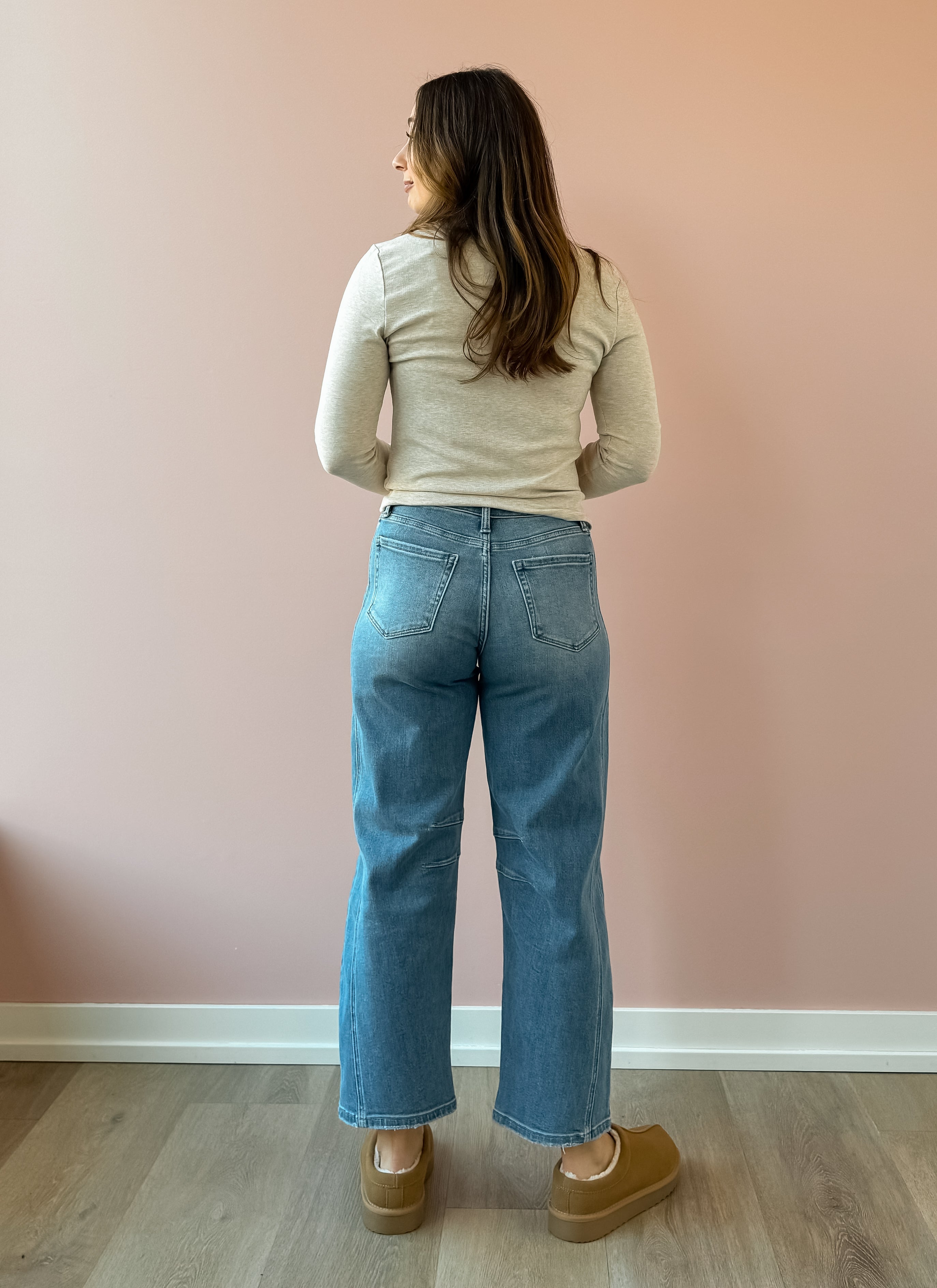 These Durability Barrel Jeans bring fun to your wardrobe with their playful cropped barrel shape and medium wash denim. The high-rise waist flatters your figure while the comfort stretch fabric moves with you all day. Featuring classic five-pocket styling, neat seam details, and a finished hem, they’re perfect for showing off your favorite shoes. Embrace a fresh twist on denim that combines comfort and style in every step!