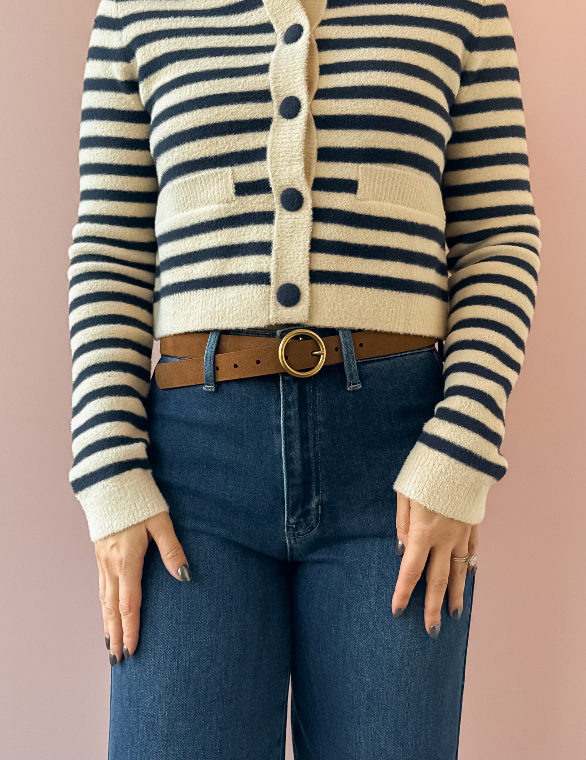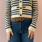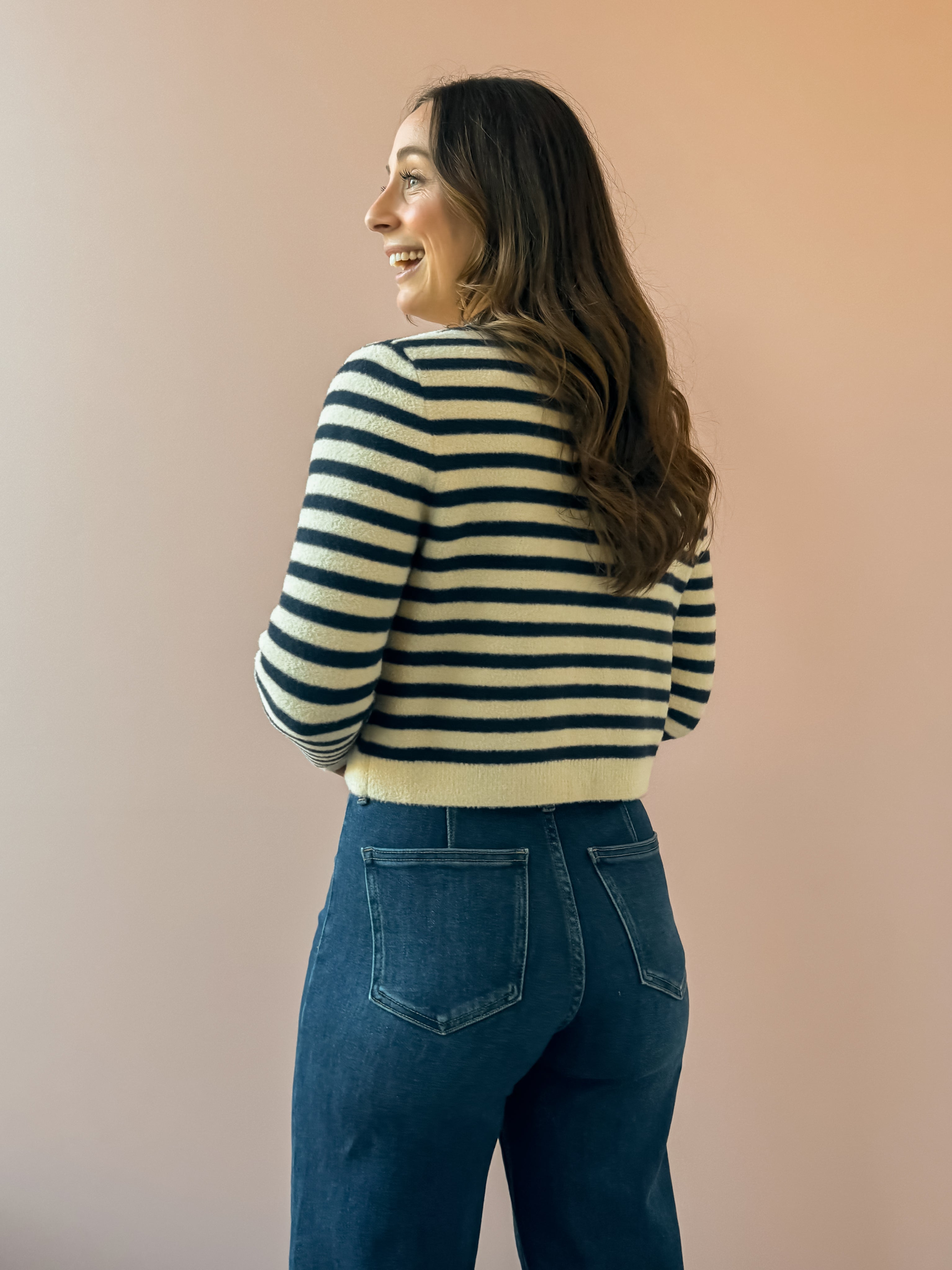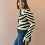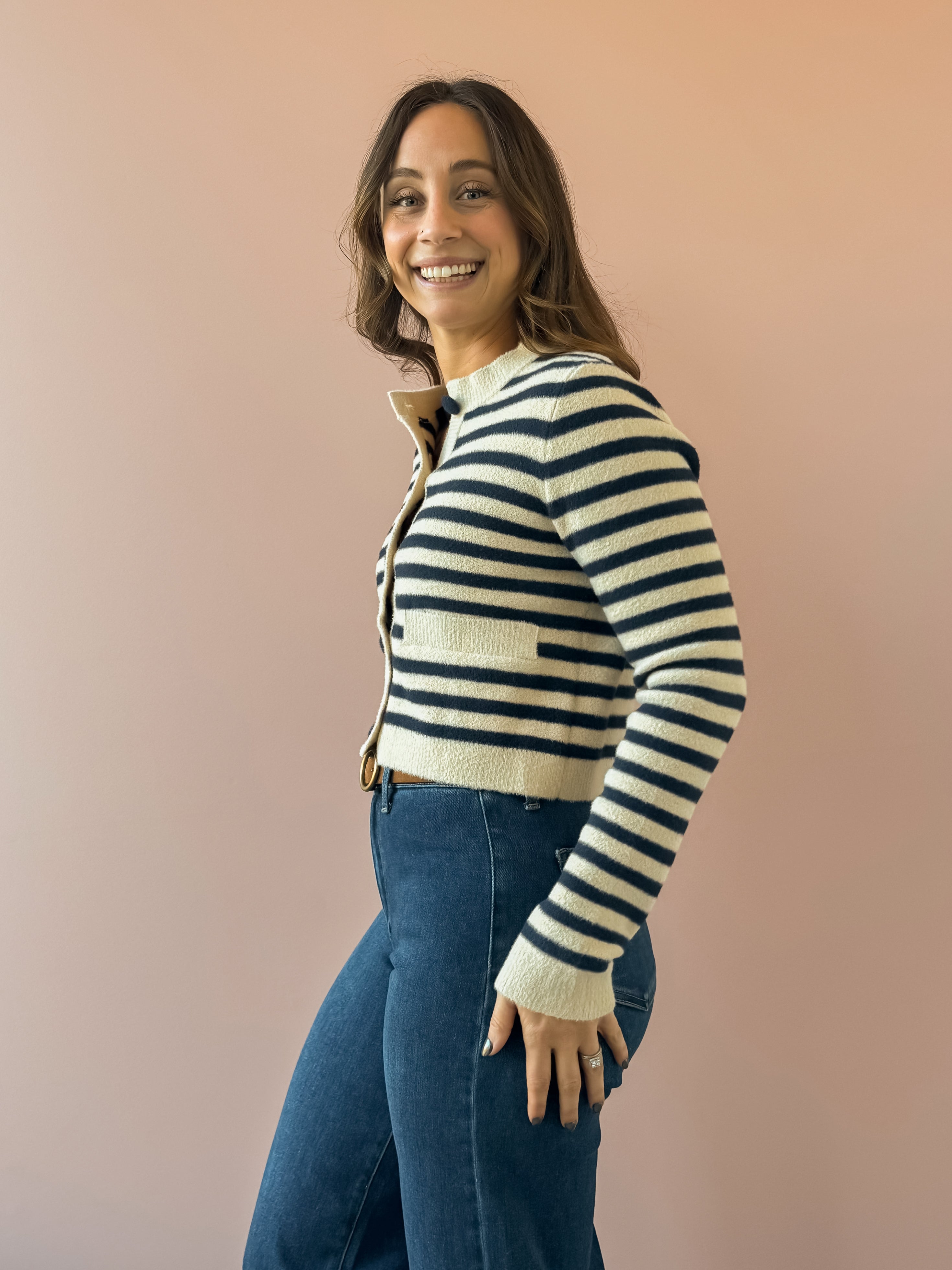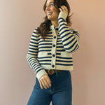 Elevate your everyday style with this timeless cream and navy stripe cardigan. Featuring a soft and cozy fabric, it’s the perfect layering piece for all seasons. The horizontal stripes lend a nautical-inspired charm, while the small front pockets and oversized buttons give the perfect classic vibe. Whether paired with jeans or draped over a dress, this versatile cardigan blends comfort and classic style.