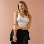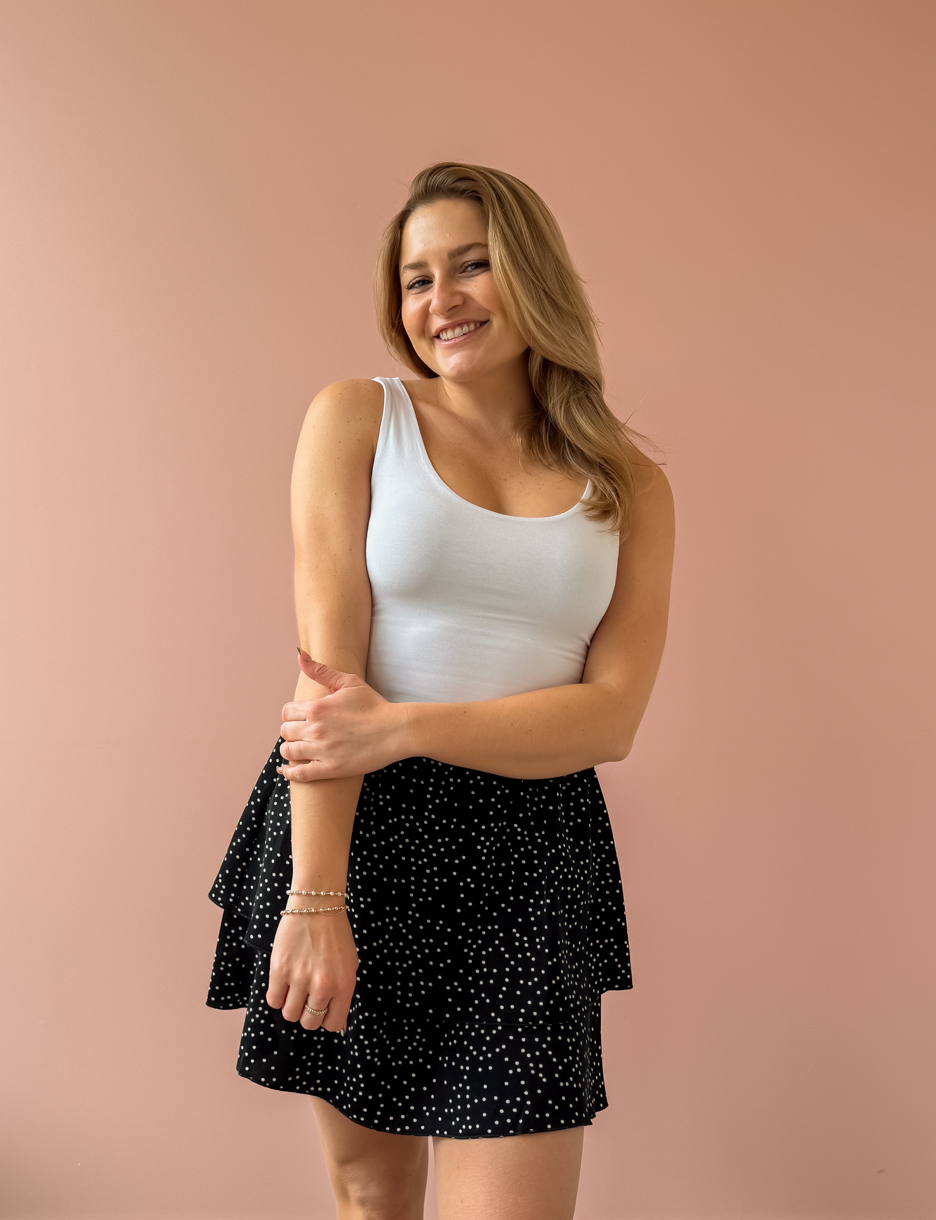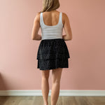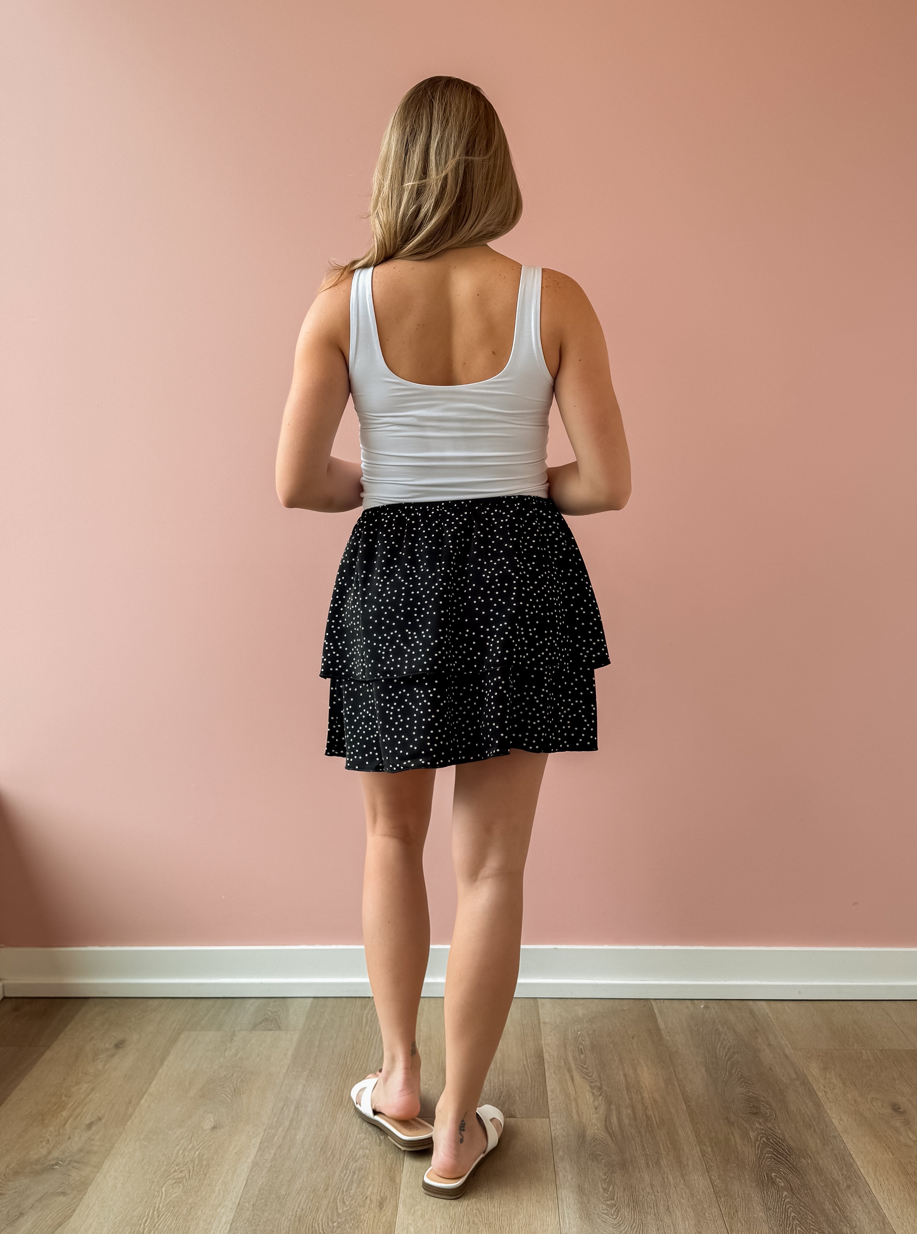 Meet the Juliette Mini Skort, a black high-rise skort with white polka dots and soft ruffle detailing for the sweetest feminine touch. Flirty yet polished, the skort silhouette gives you the look of a skirt with the ease of built-in shorts underneath. Style it with a fitted knit or airy blouse and finish with ballet flats or sandals for an effortlessly chic look.