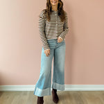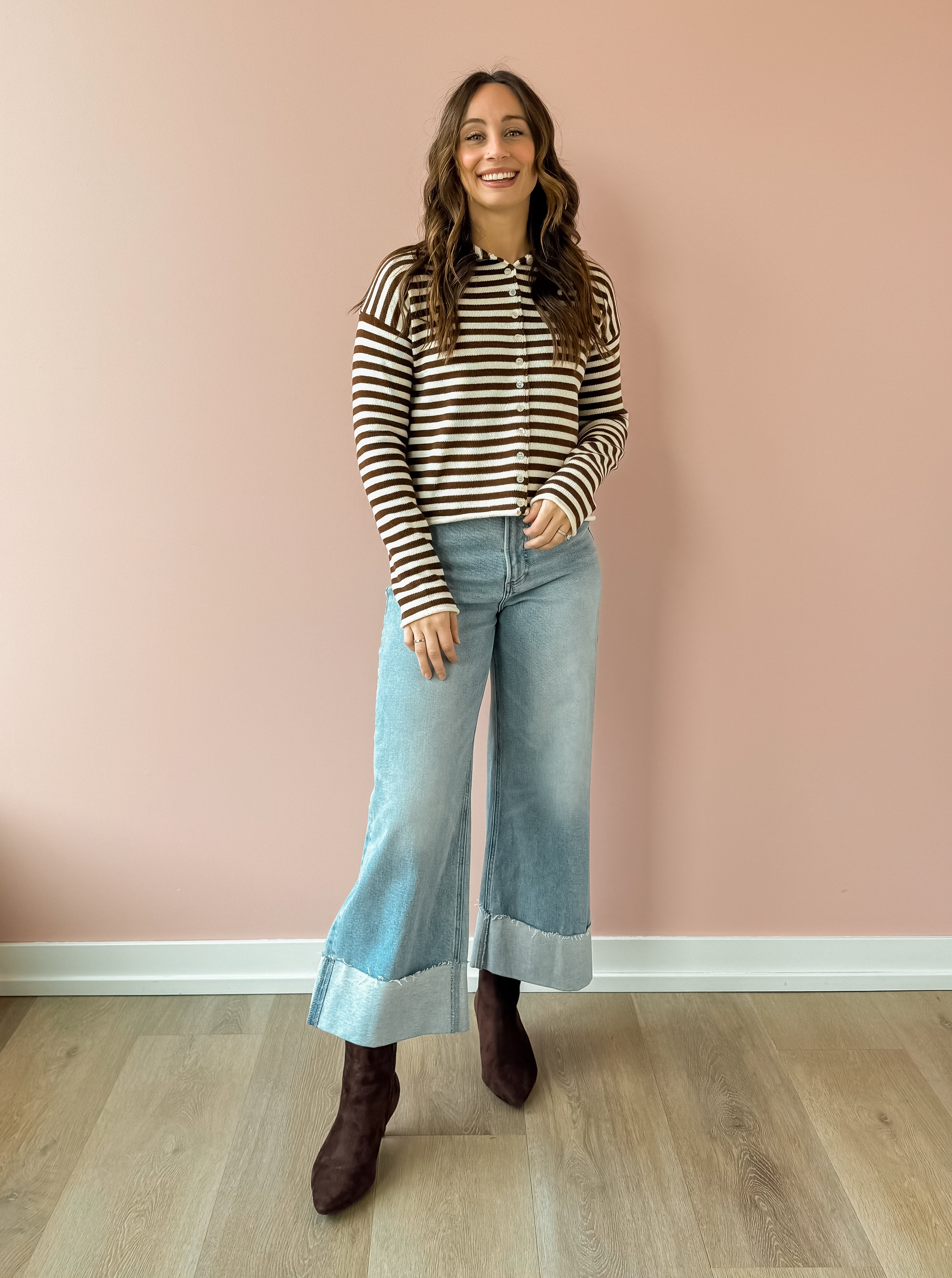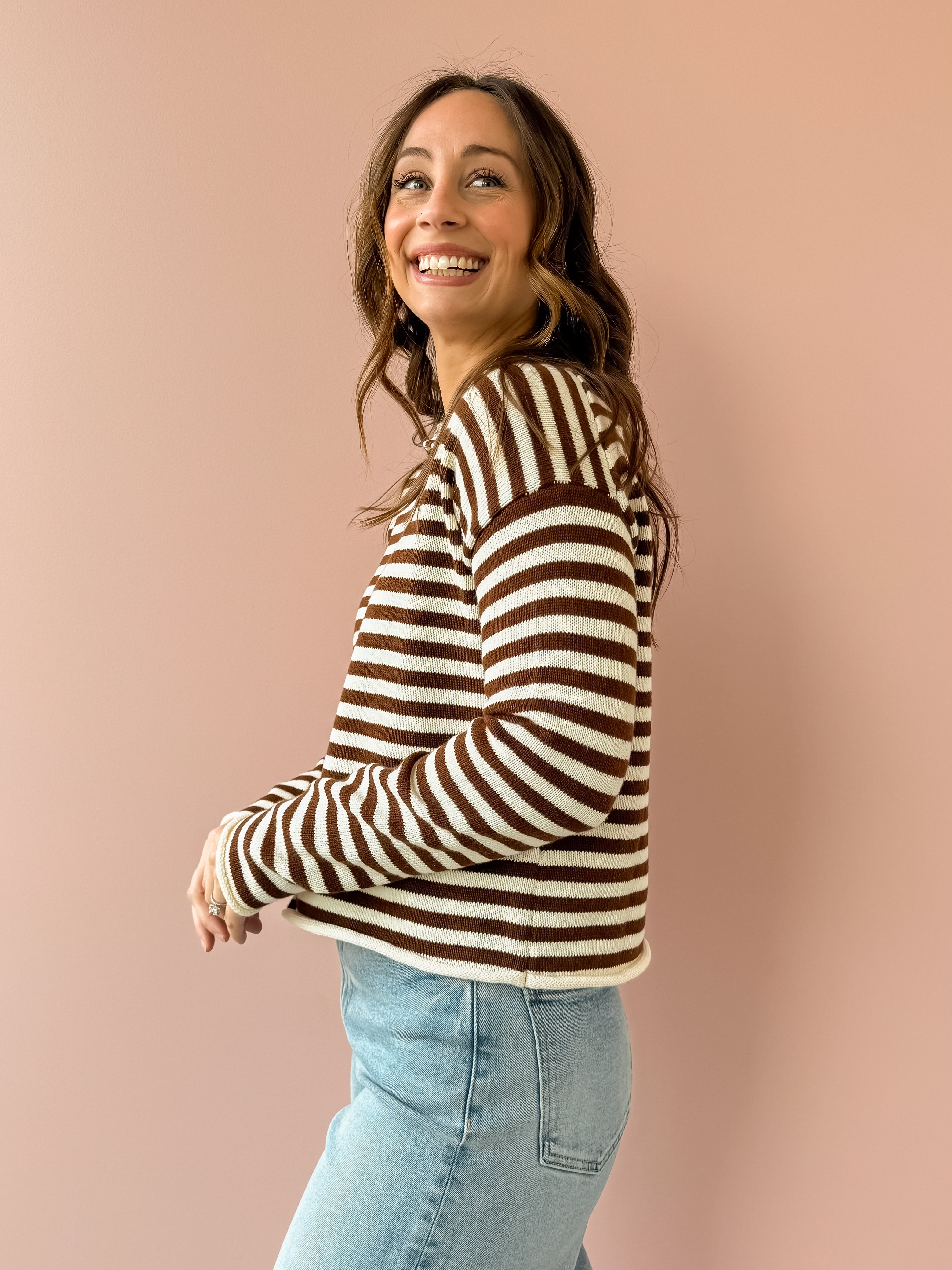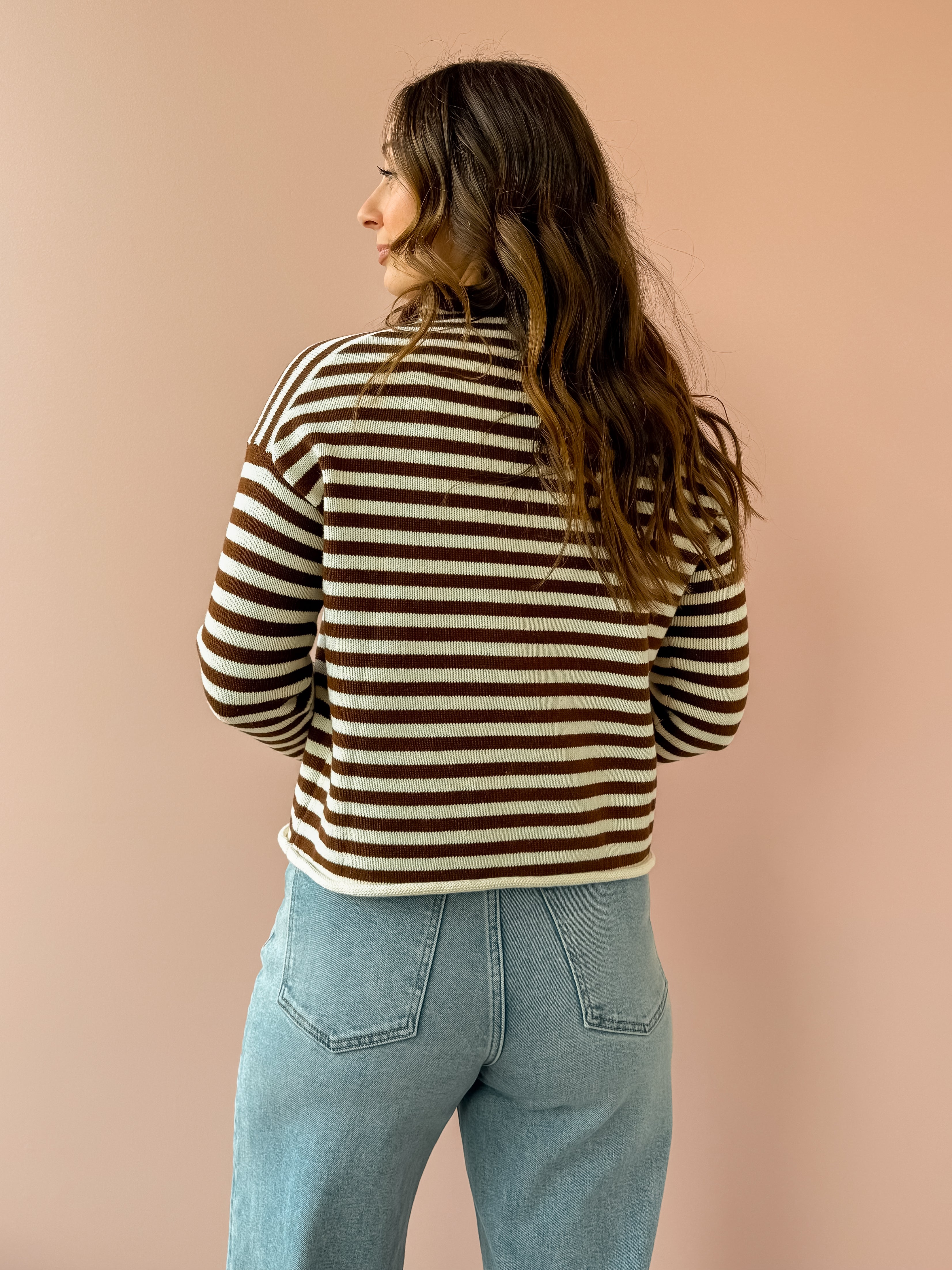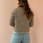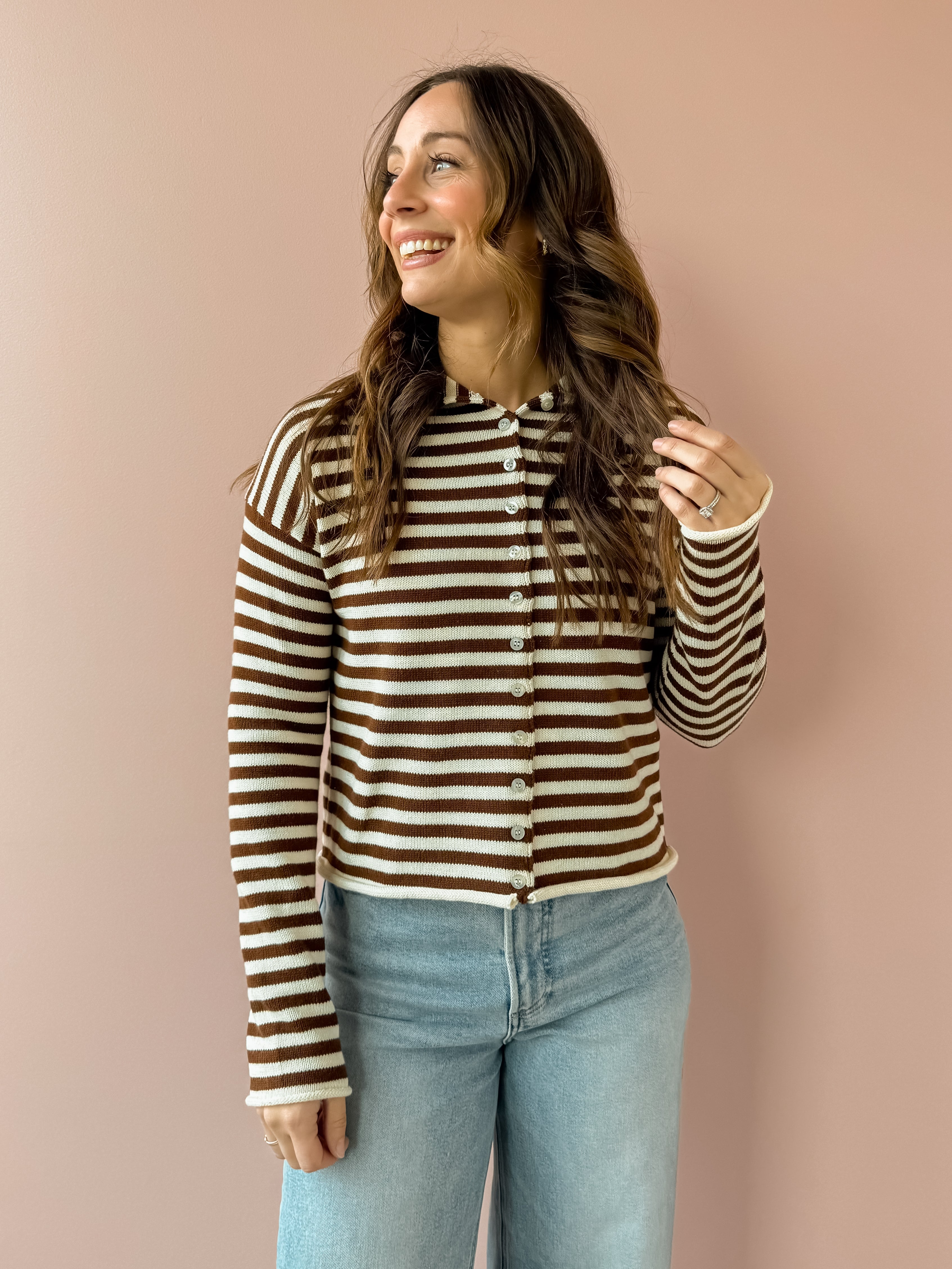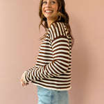 The Elina Knit Cardigan offers cozy comfort with stylish chocolate brown and white stripes. Its relaxed fit and versatile button closure let you wear it open for layering or closed for warmth. Perfect paired with denim and boots, it adds effortless chic to your casual wardrobe.