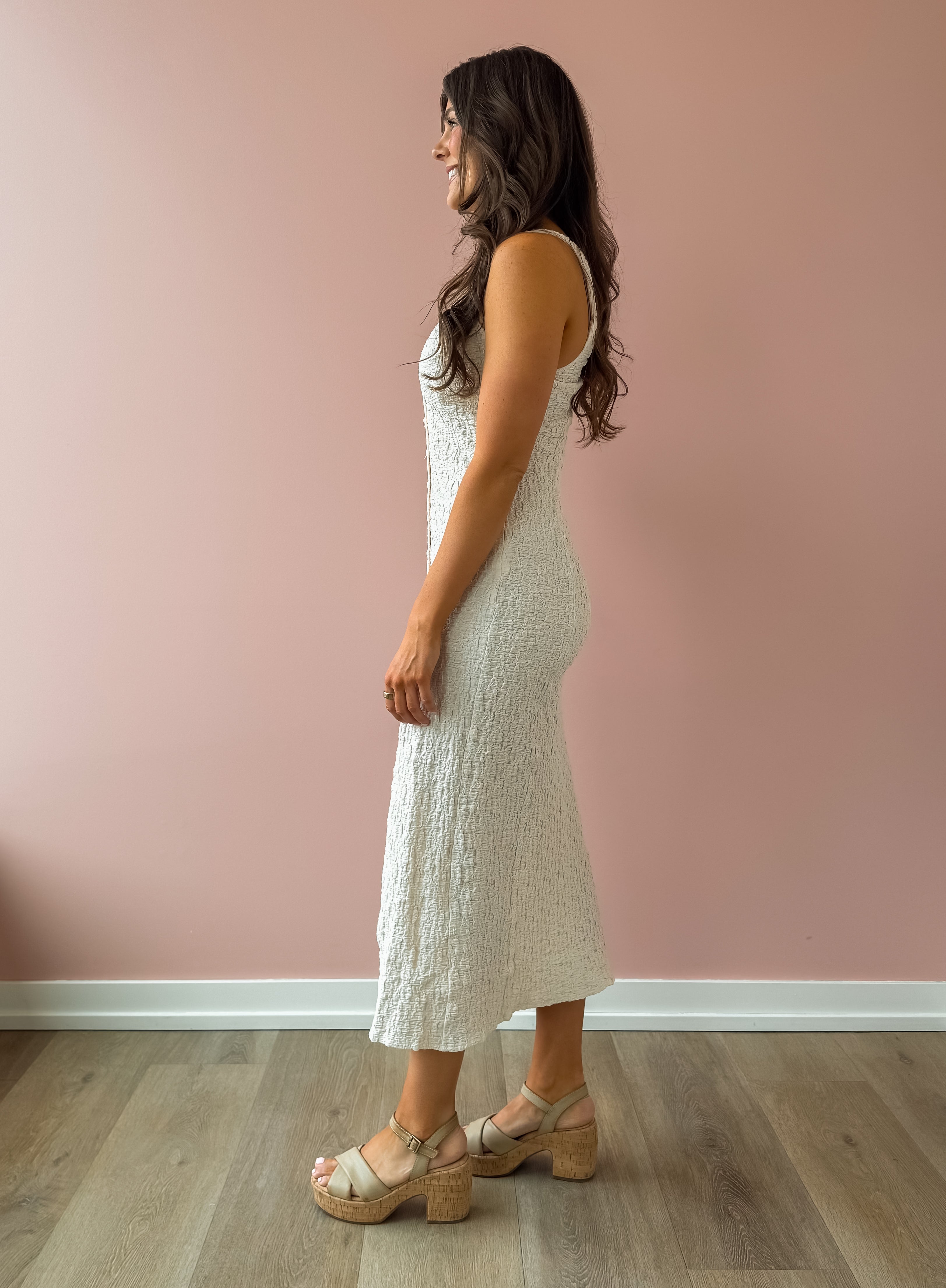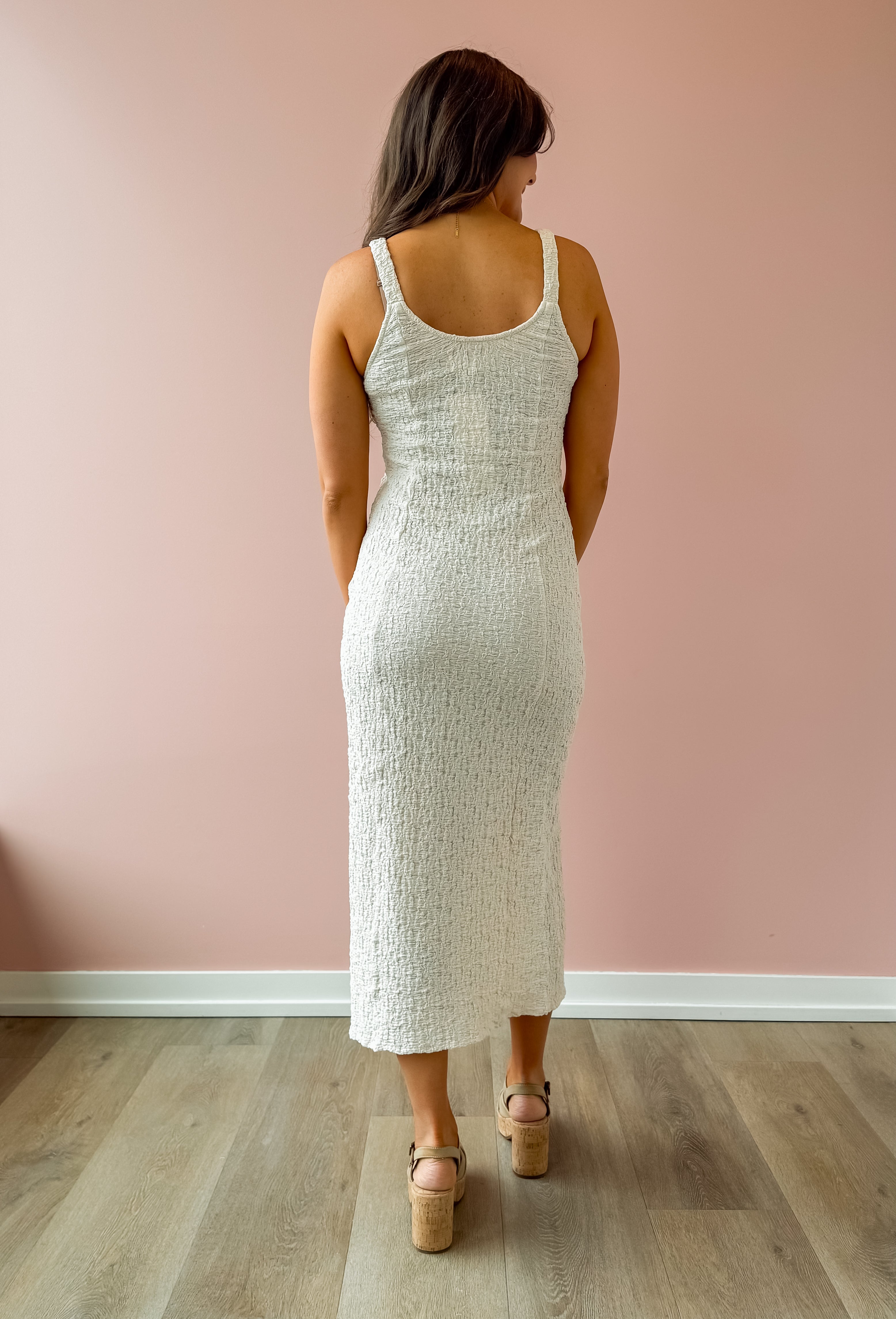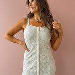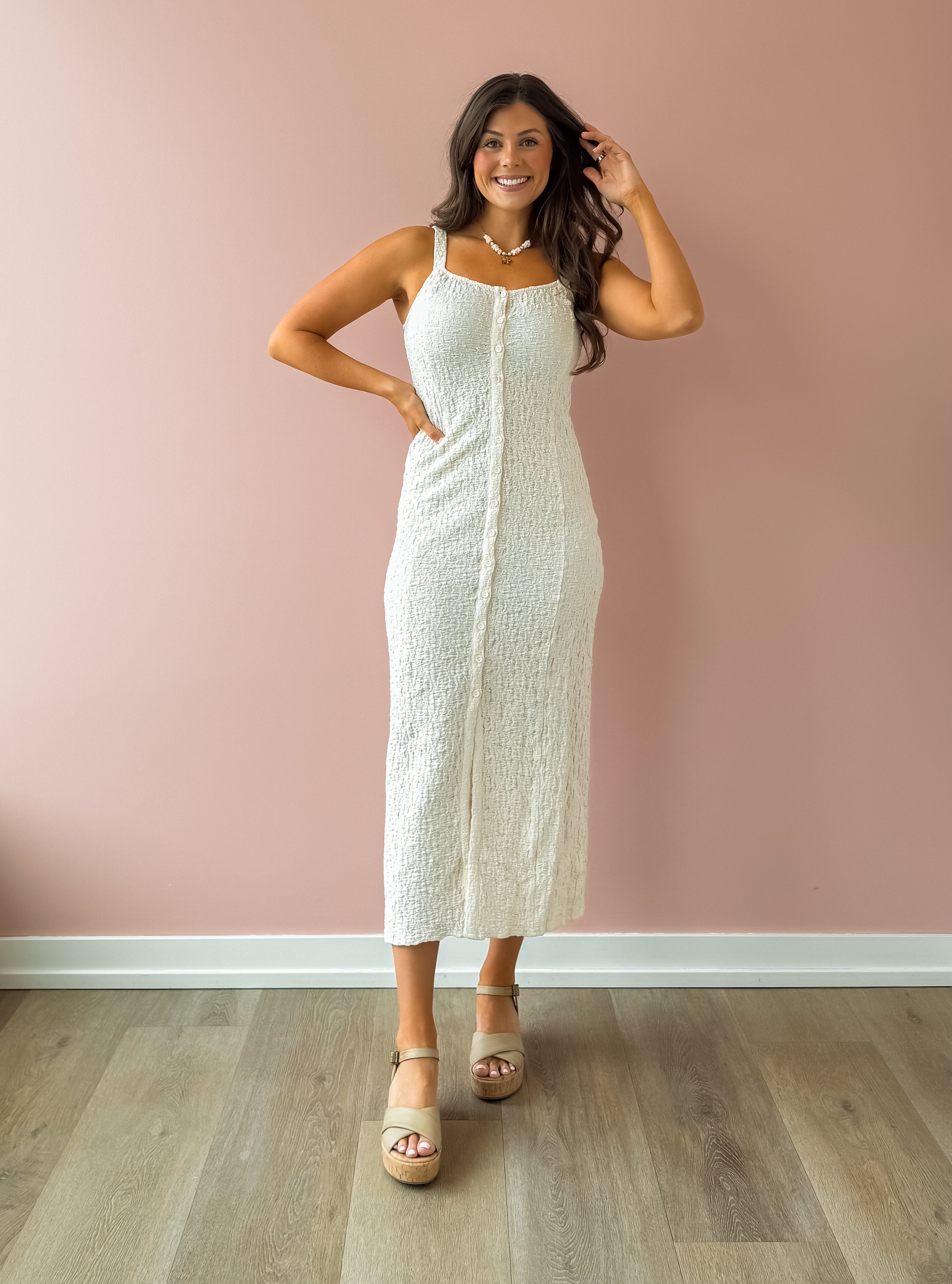Soft, feminine, and effortlessly polished, the Elowena Dress is a timeless staple you’ll reach for all season long. Designed in a creamy neutral hue, this dress features a subtle textured fabric that adds dimension while keeping the look elevated. Thicker spaghetti straps offer comfortable support, while the button-up front with a slit adds a touch of flirtiness and ease of movement. We love this with a sandal or wedge!