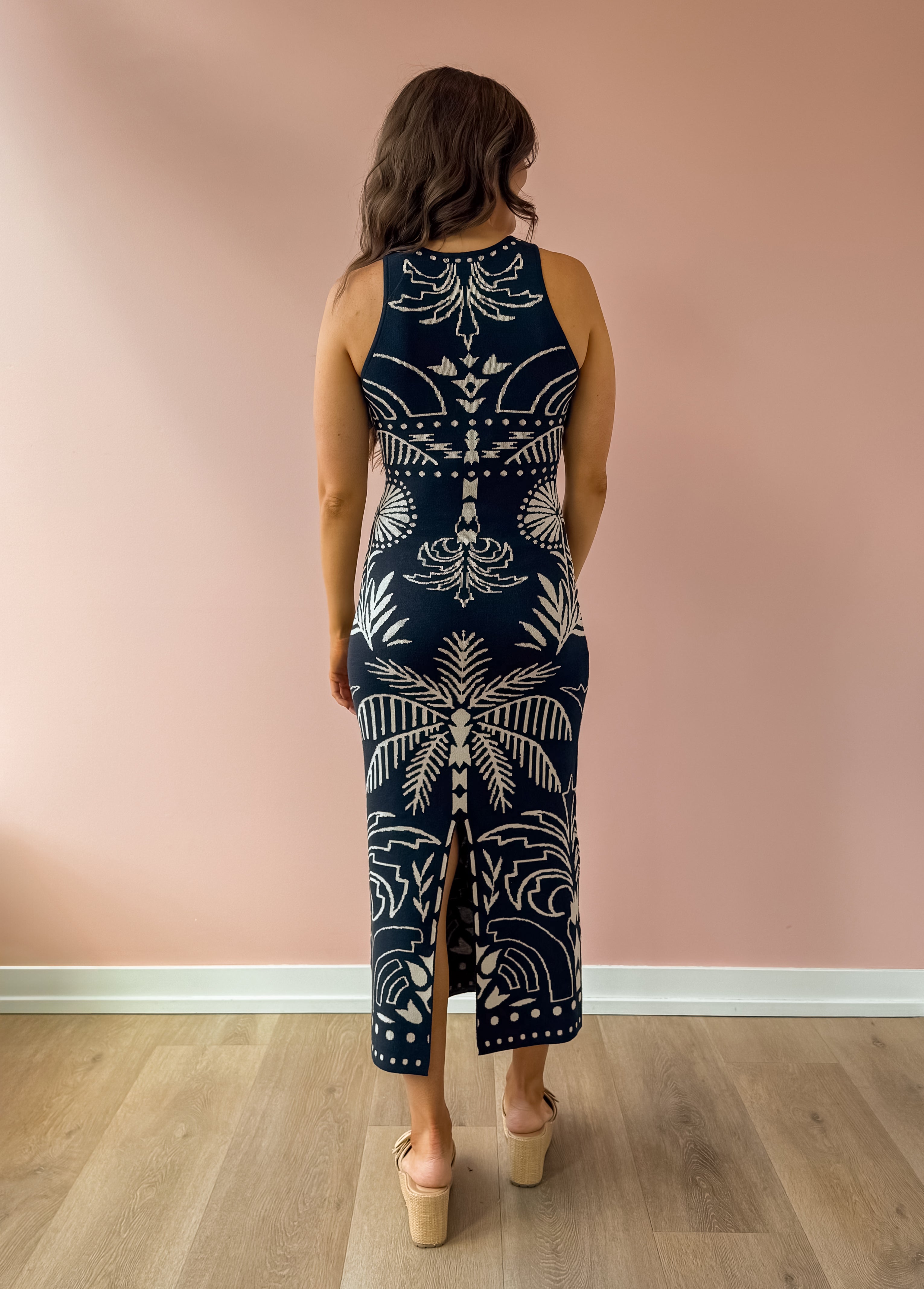 Slip into effortless elegance with the Esperanza Midi Dress. Crafted in a soft, midweight sweater knit, this sleeveless silhouette features a subtle tropical palm motif and a rich deep navy hue that feels both polished and relaxed. Designed with a flattering, easy fit that skims the body, it’s finished with a back slit for just the right touch of movement. Style it with a simple sandal for warm evenings, coastal getaways, or elevated everyday wear.
