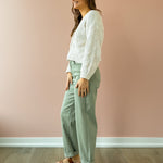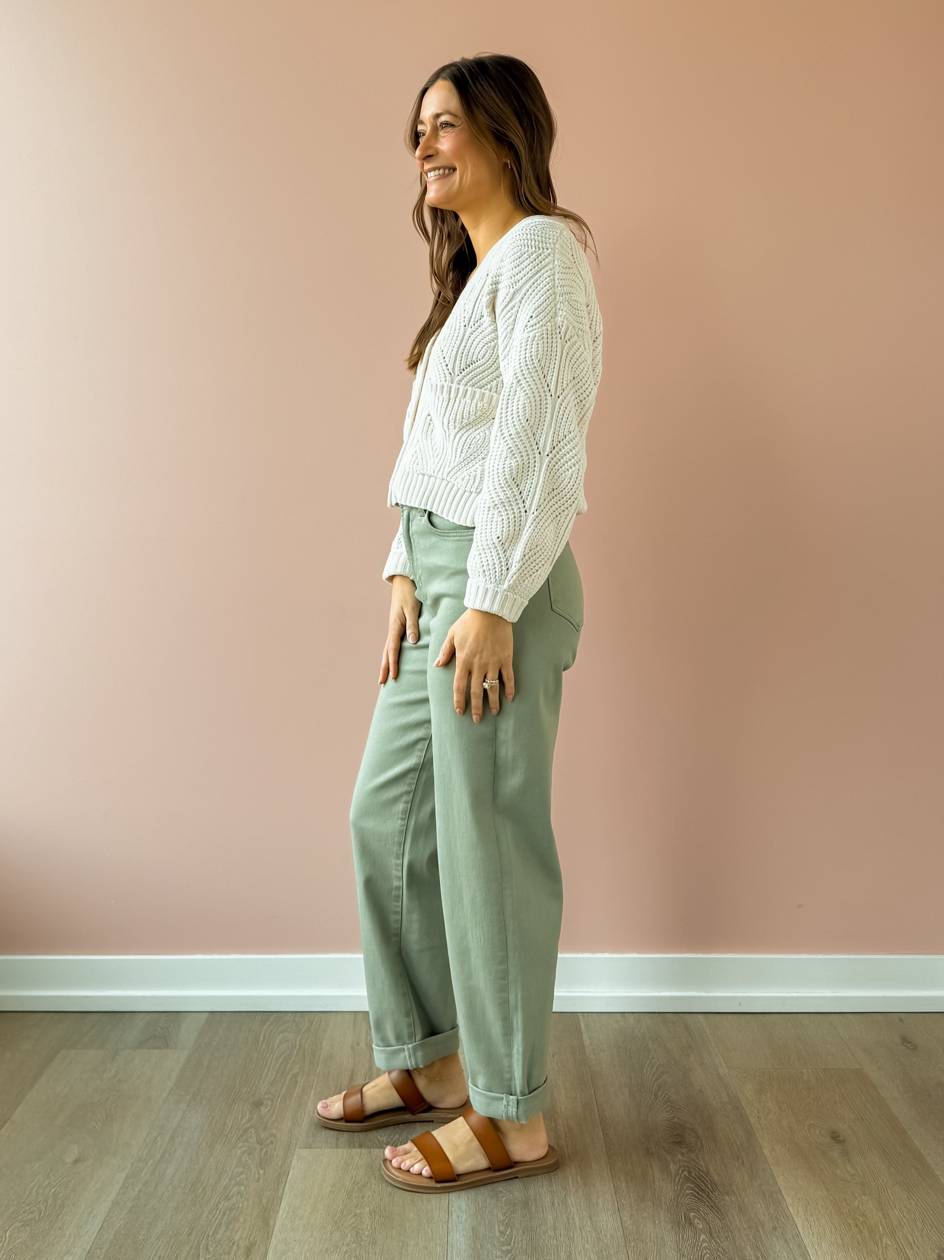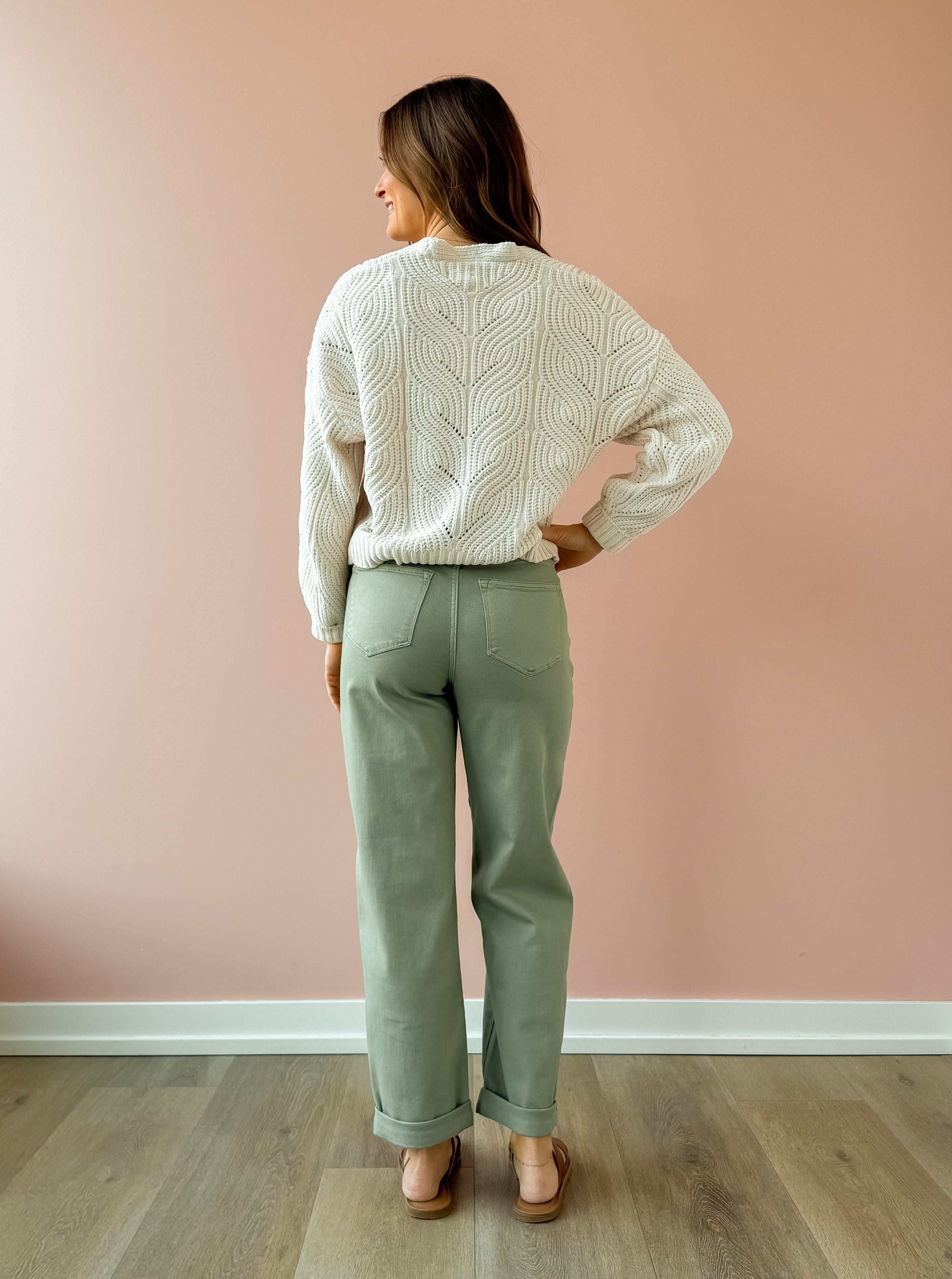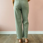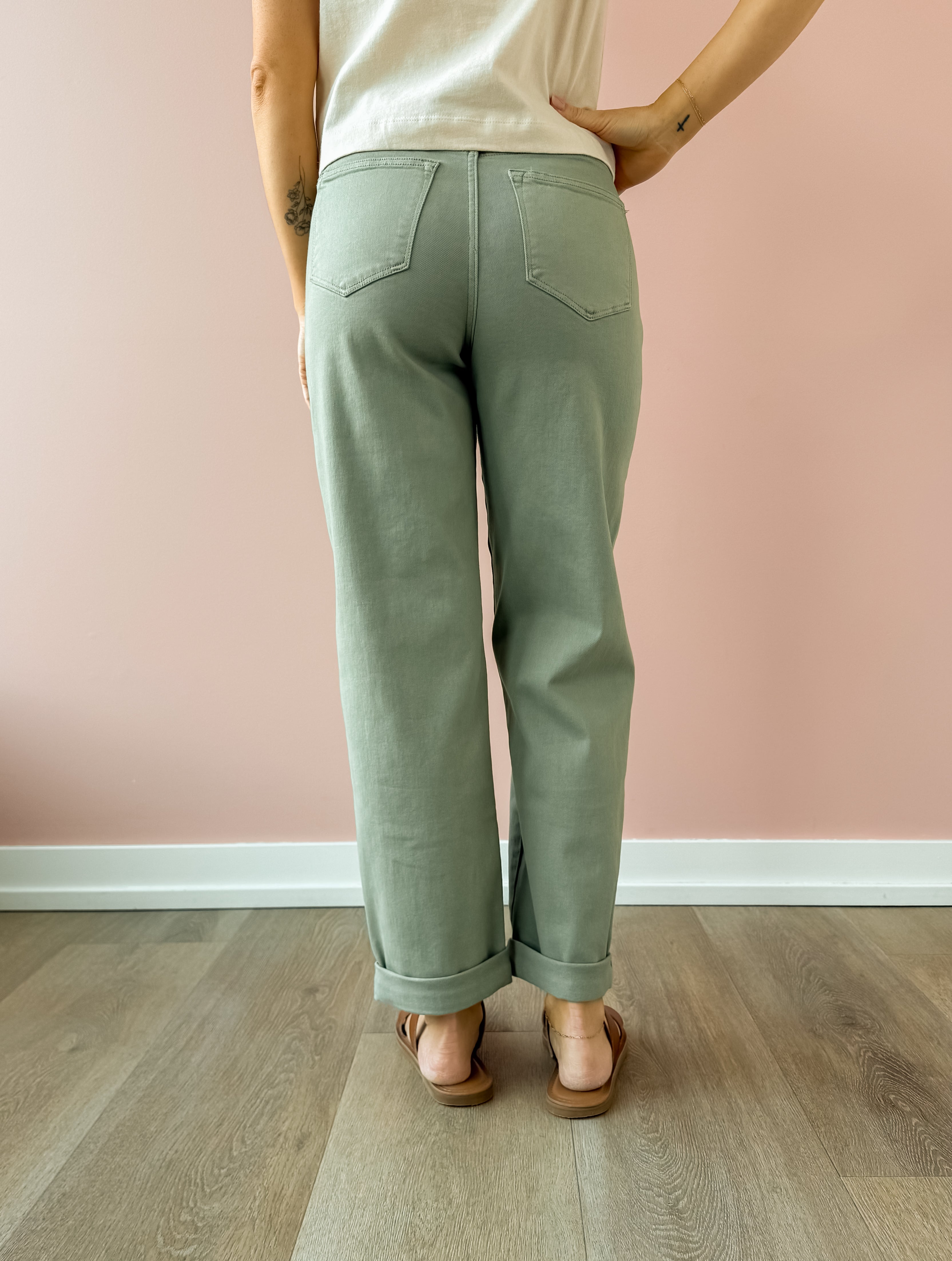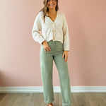 Introducing the Everett Cuffed Jeans—your new wardrobe essential in a stunning sage hue. Designed with versatility in mind, these high-rise straight-leg jeans feature a clever cuffed hem that lets you customize your look: wear them cuffed with sandals for a relaxed vibe, or unfold them for extra length. Complete with functional side pockets and a secure zipper closure, they're the perfect canvas for endless styling possibilities. Pair them with a classic tee and sneakers for effortless everyday appeal, or dress them up for something more polished. The soft sage tone complements virtually any color palette, making these jeans a go-to piece you'll reach for again and again.