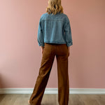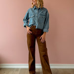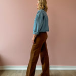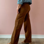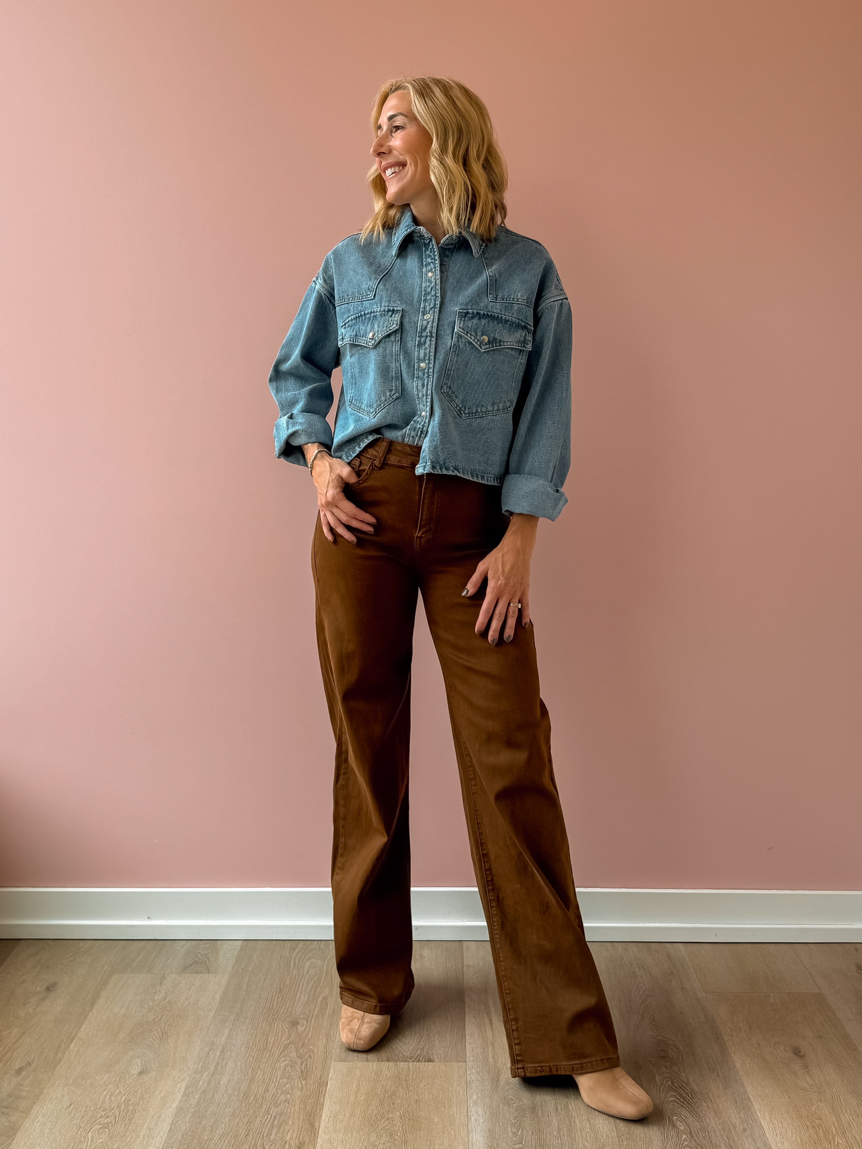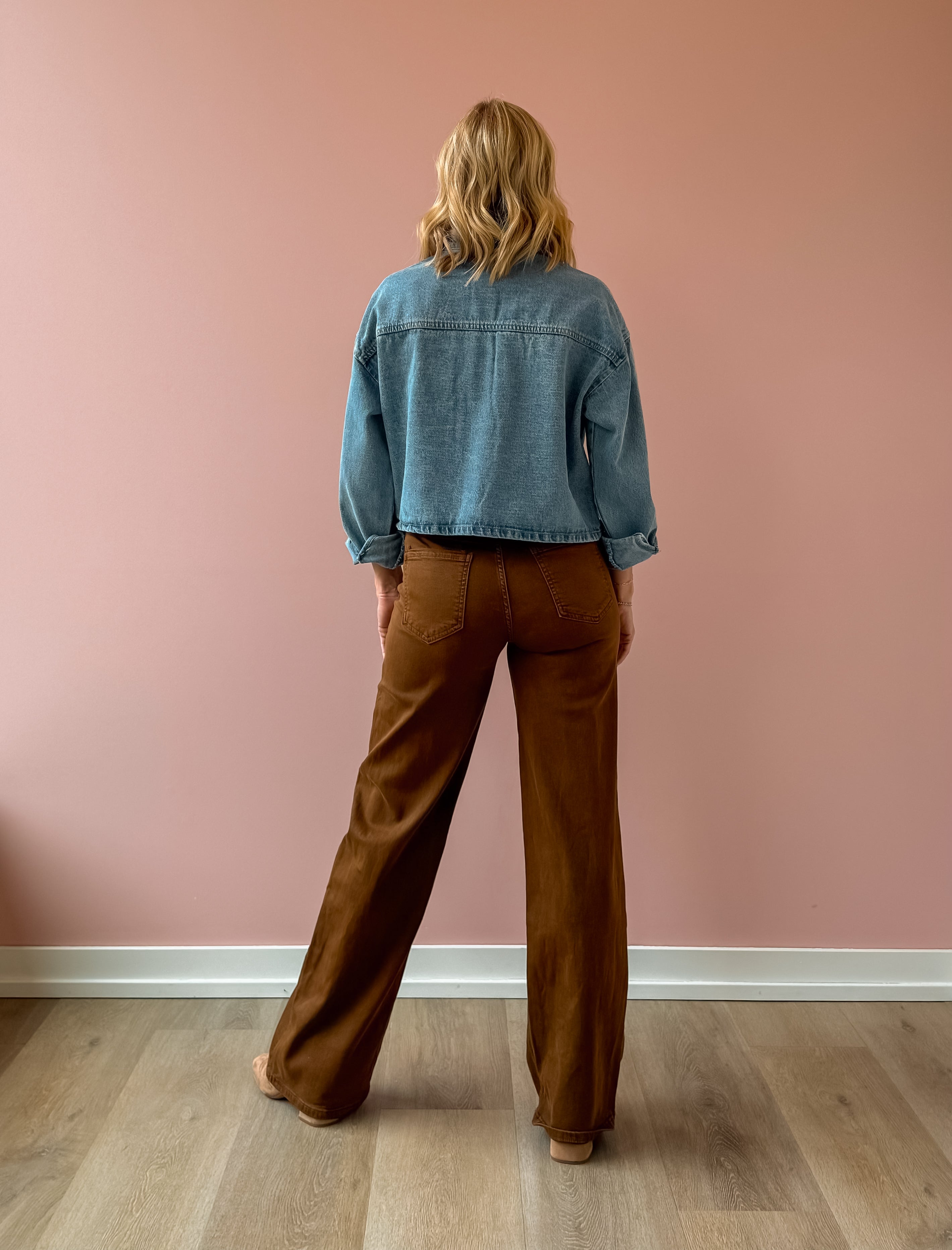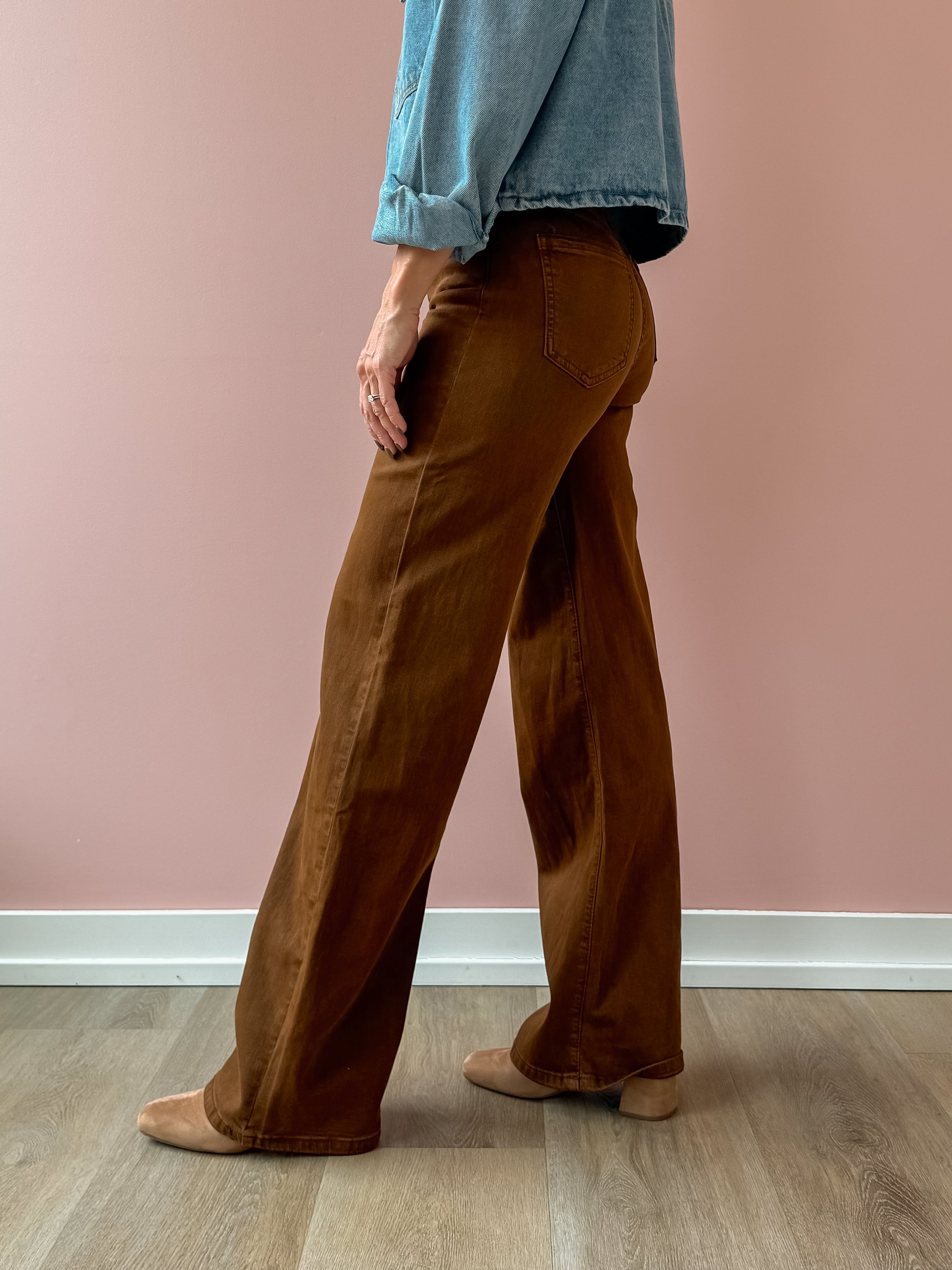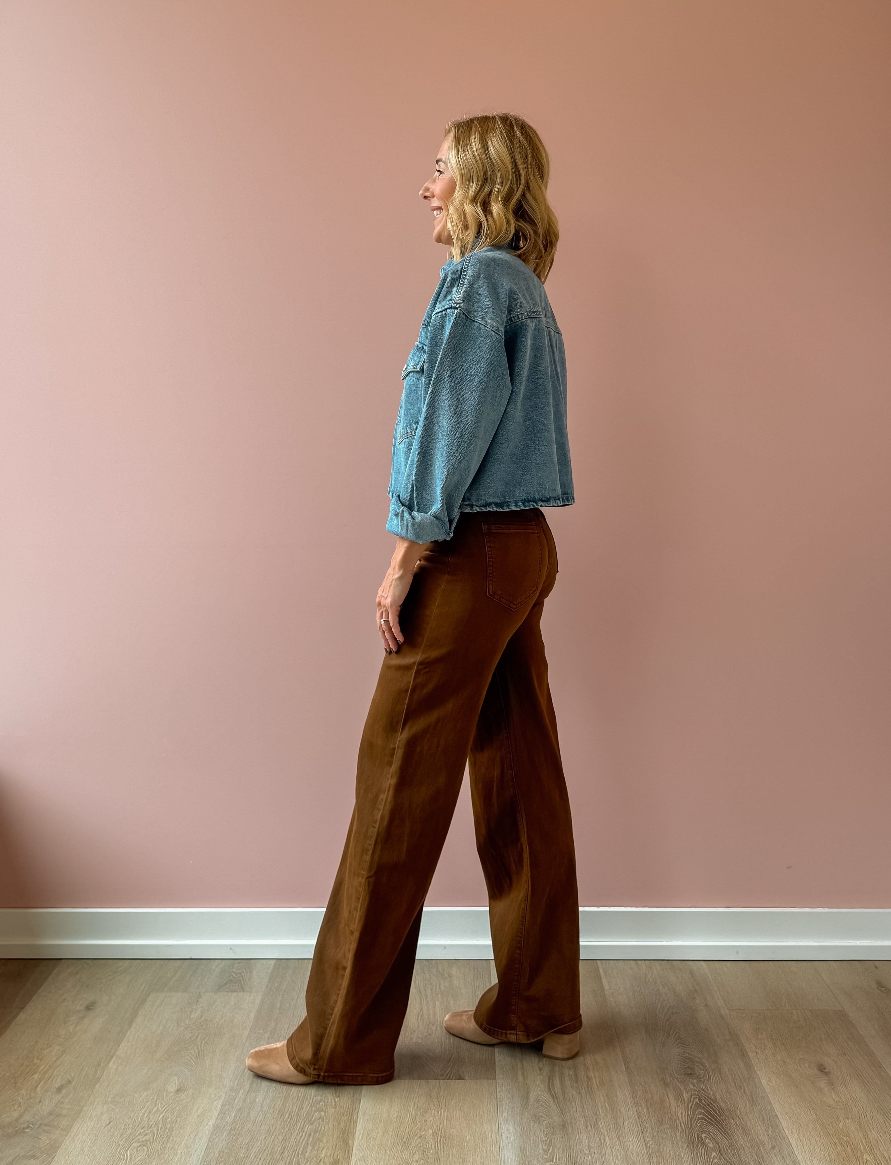 Elevate your everyday style with these vintage-wash brown jeans. With a flattering high-rise waist, wide-leg silhouette, and clean straight hem, they offer both comfort and timeless appeal. Functional side pockets add ease, while the rich vintage tone pairs beautifully with everything from a crisp white blouse to a cozy knit sweater. Style them with loafers or heeled boots for a polished look!