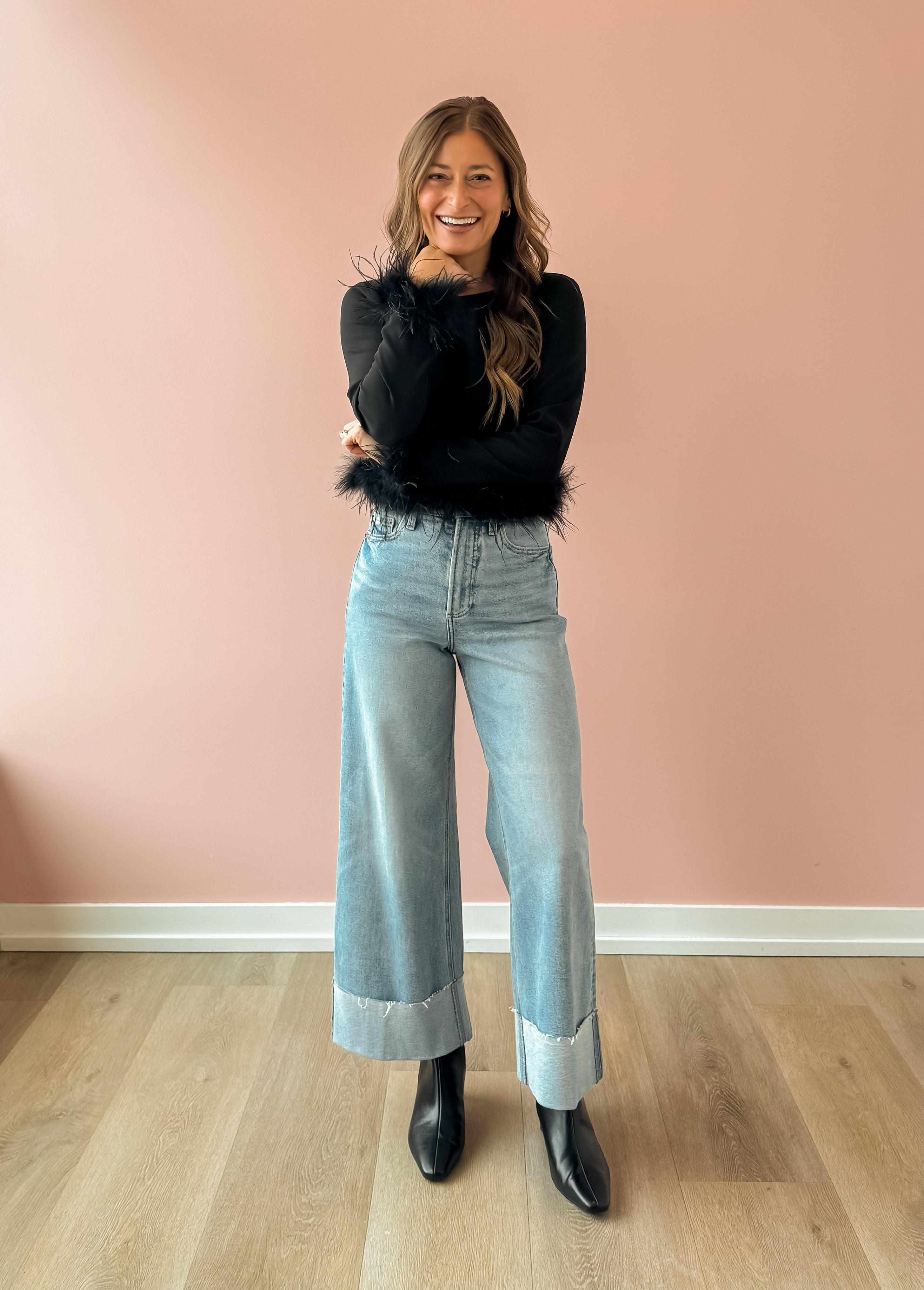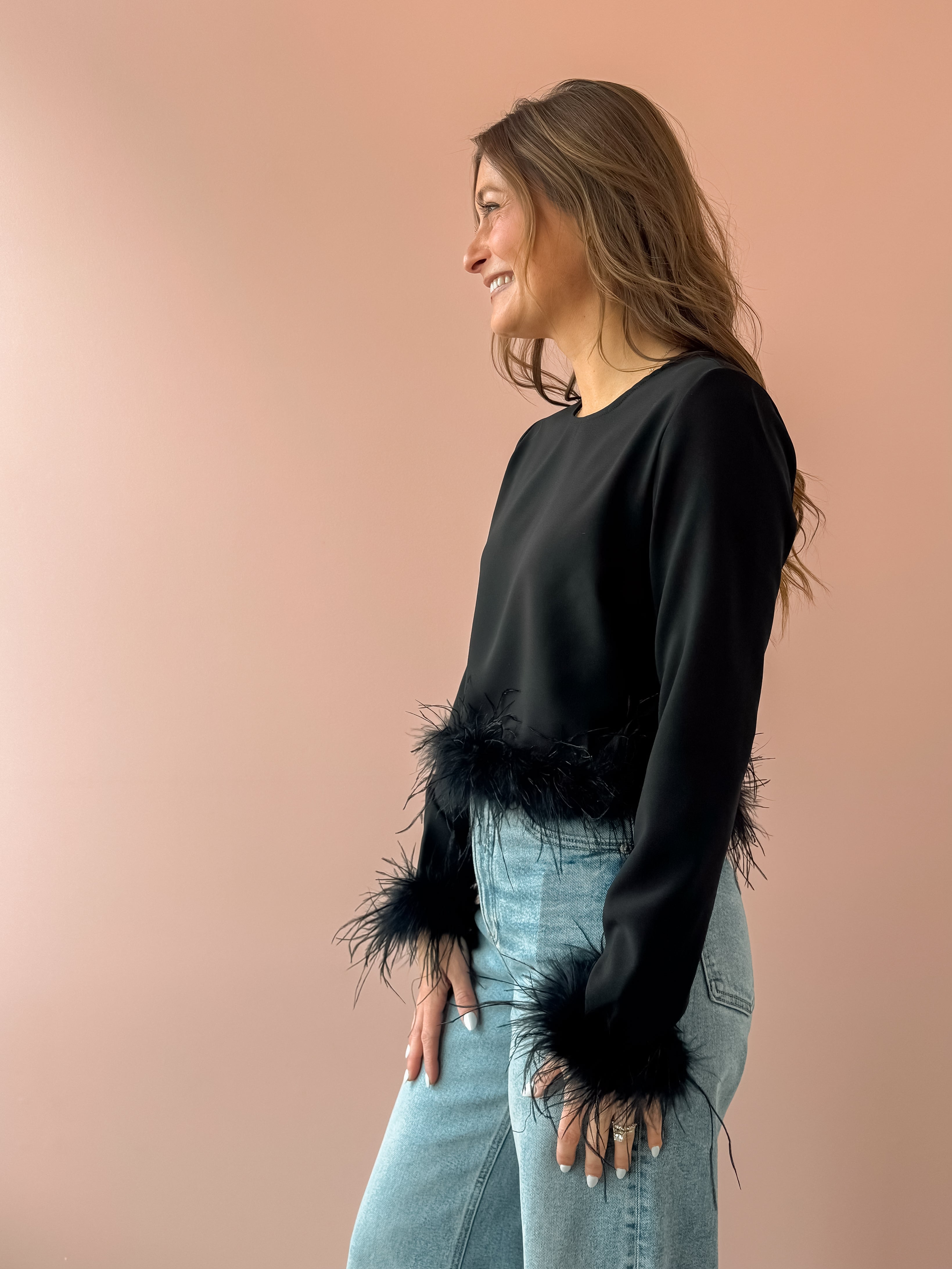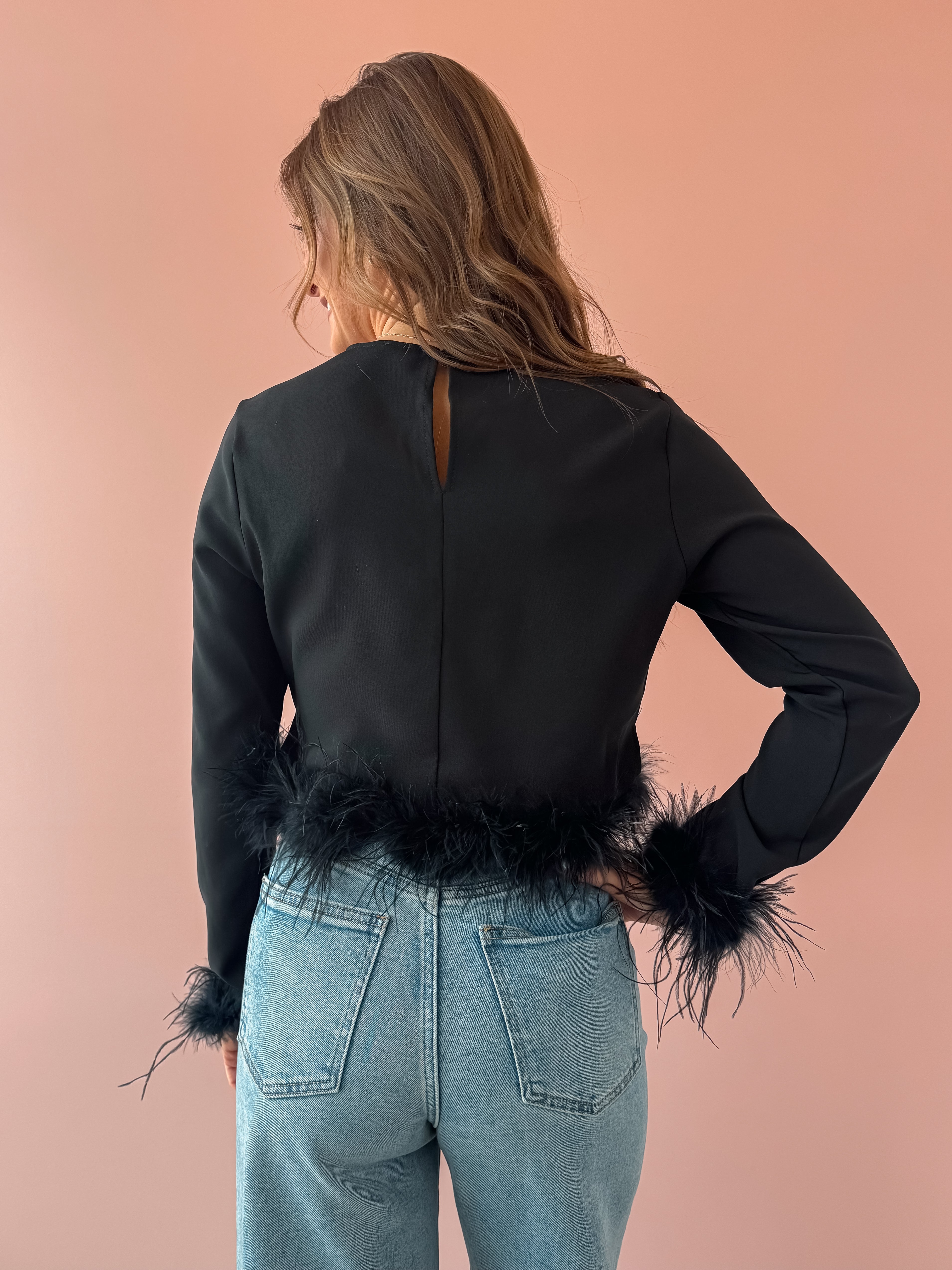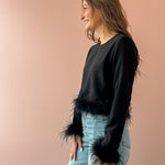 Elevate your wardrobe with the Susie Feather Trim Top, a sophisticated piece that combines edge with elegance. This black long-sleeve top features a classic crewneck and luxurious feather fur detailing along the hem and cuffs for an eye-catching finish. The semi-cropped silhouette flatters your figure while offering versatile styling options—pair it with high-rise denim for a chic casual look or dress it up with a skirt and heels for an unforgettable night out. Perfect for anyone seeking a statement piece that transitions seamlessly from day to night.