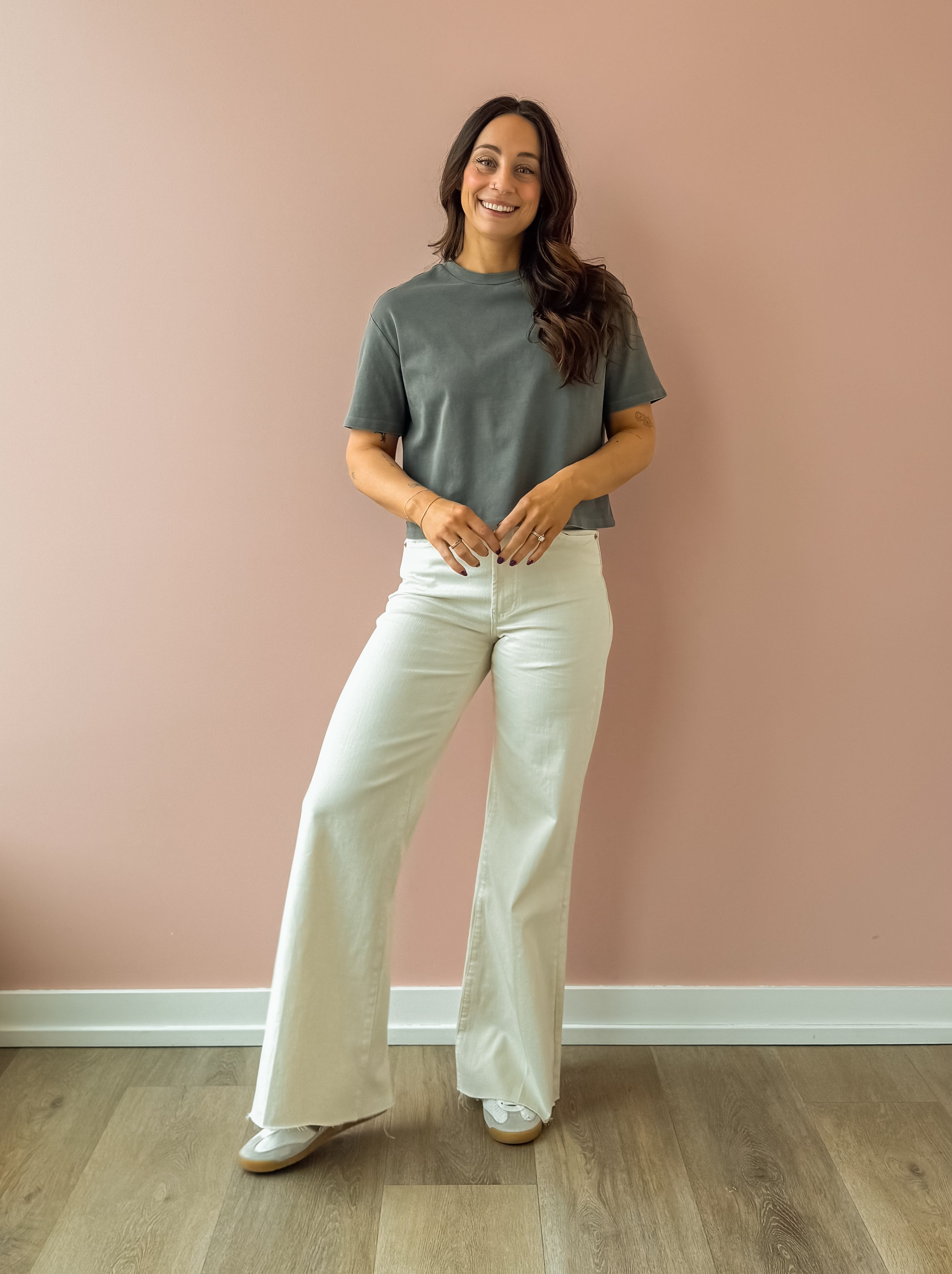 High rise wide leg jeans. It's cozy fit that sits at natural waist, embraces your natural curves and accentuates your hips and thigh. Full inseam on stretch denim featuring cut-off hem details add flair to these soft pants, available in designer colors, and finished with a center inseam press for a tailored look. We love these with a sweater and ballet flats!