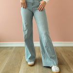 Step into style with the Fiona high-rise jeans, featuring a playful railroad stripe that breaks up the typical denim look. The wide-leg silhouette and raw hem give these jeans an effortlessly cool vibe—perfect for throwing on with your favorite tee and sneakers. A fun wardrobe staple that's anything but ordinary.