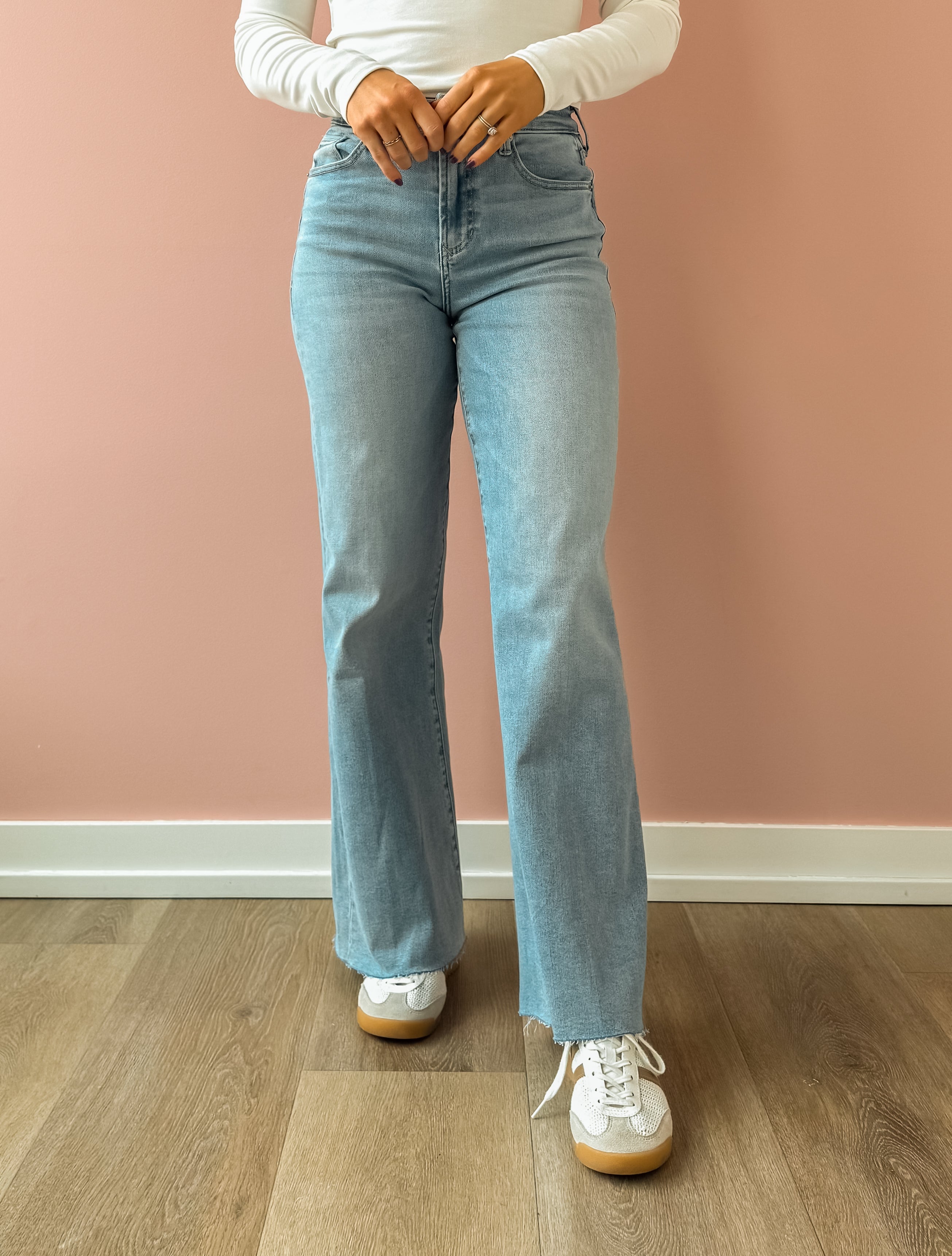 Step into style with the Fiona high-rise jeans, featuring a playful railroad stripe that breaks up the typical denim look. The wide-leg silhouette and raw hem give these jeans an effortlessly cool vibe—perfect for throwing on with your favorite tee and sneakers. A fun wardrobe staple that's anything but ordinary.