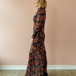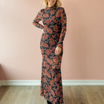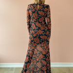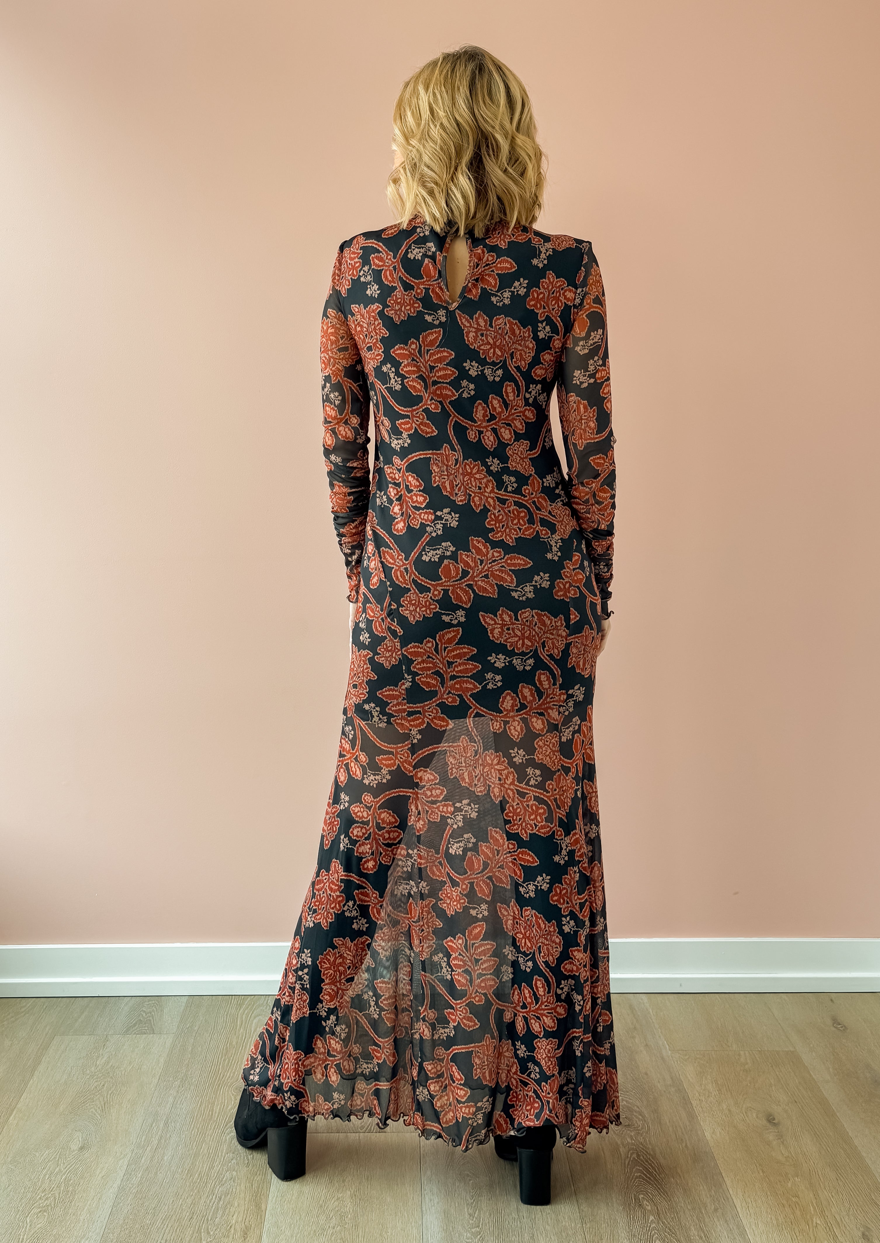 The Hannah Maxi Dress combines elegance with modern sophistication. This stunning floral mesh design features a flattering mock neck and a striking red floral pattern against a charcoal grey backdrop. The practical knee-length liner provides coverage, while sheer mesh flows beautifully below for an enchanting silhouette. Perfect for winter weddings and special occasions, pair it with heels and statement earrings to complete your show-stopping look.