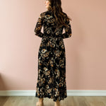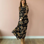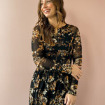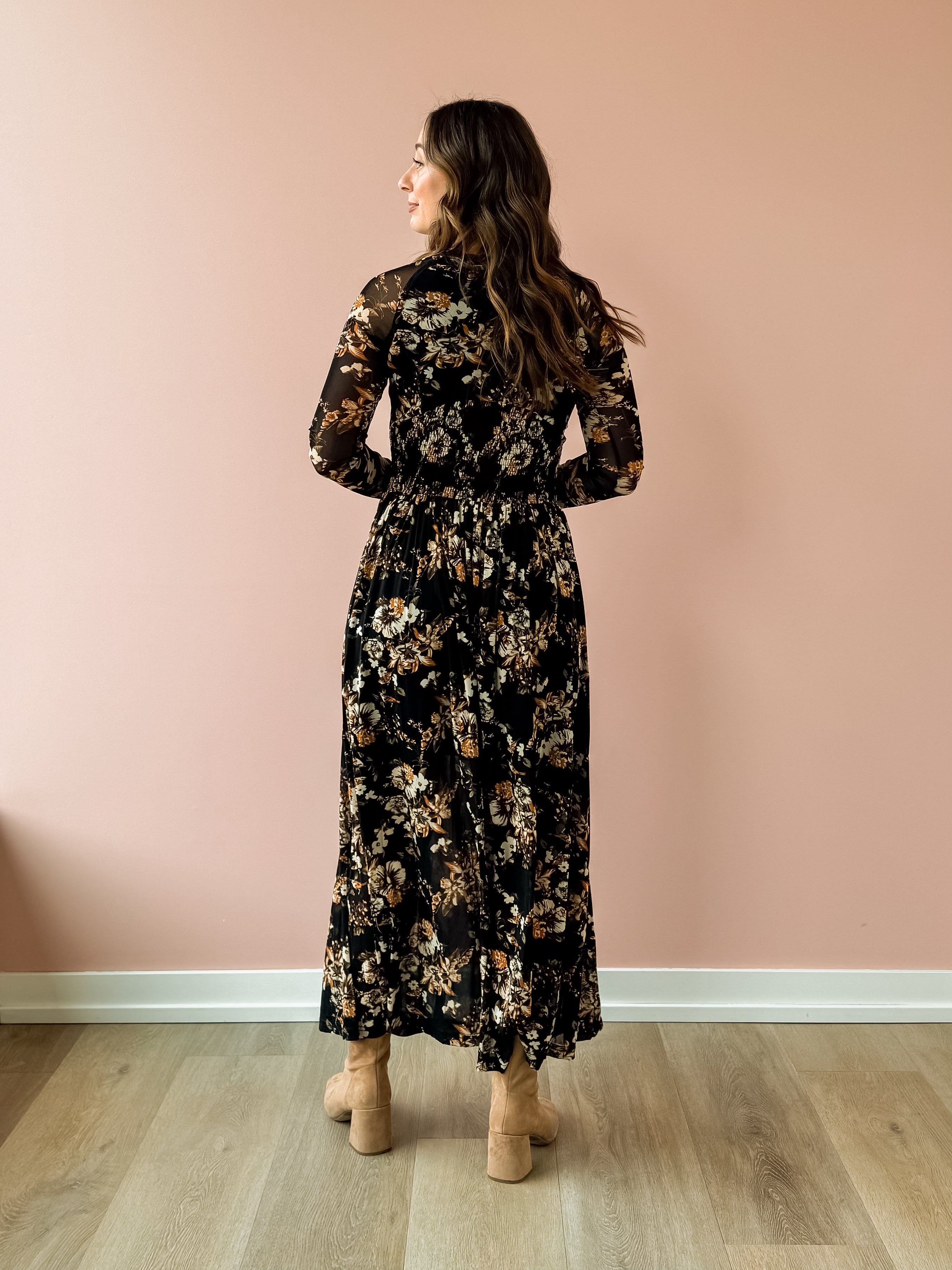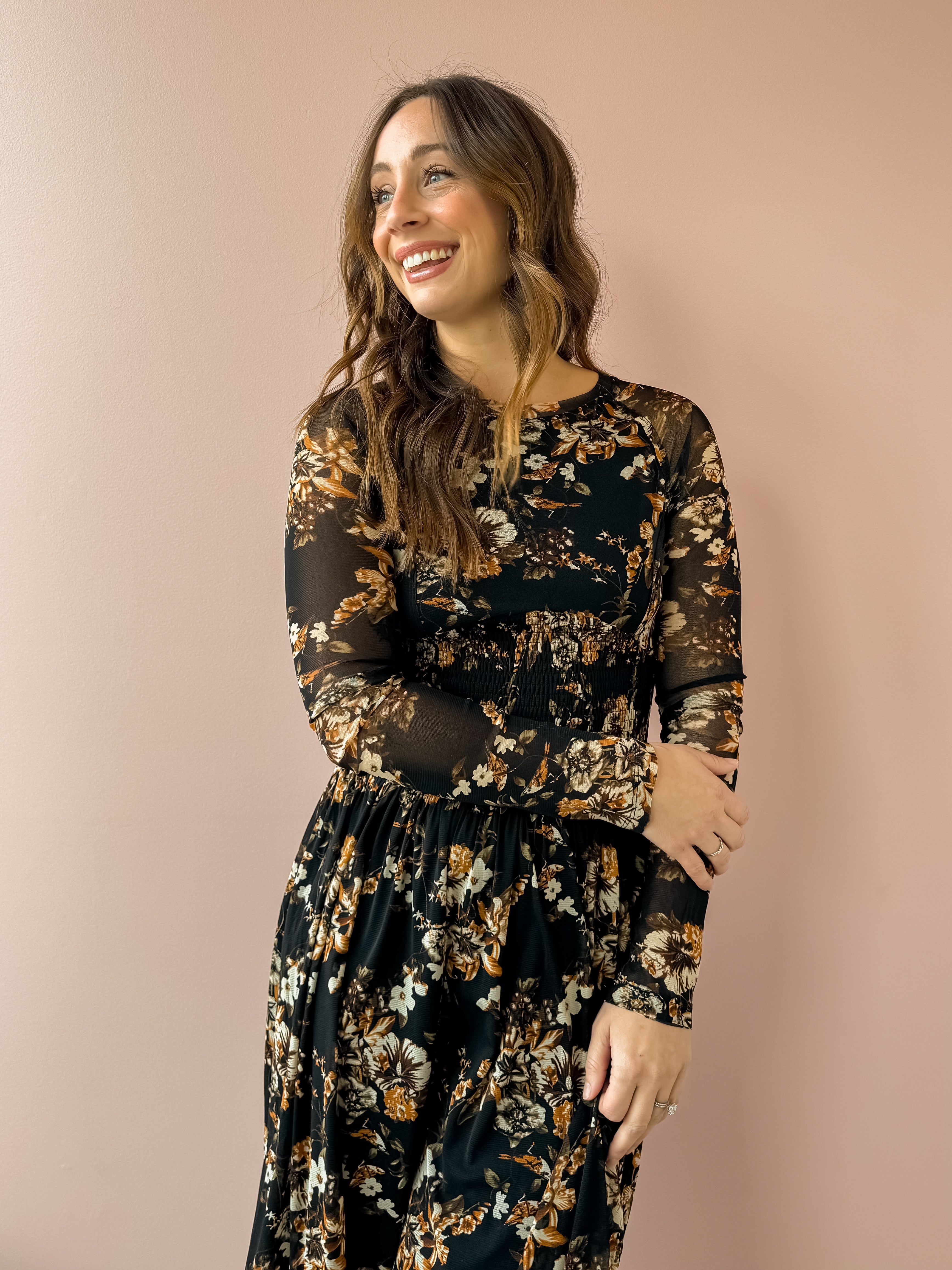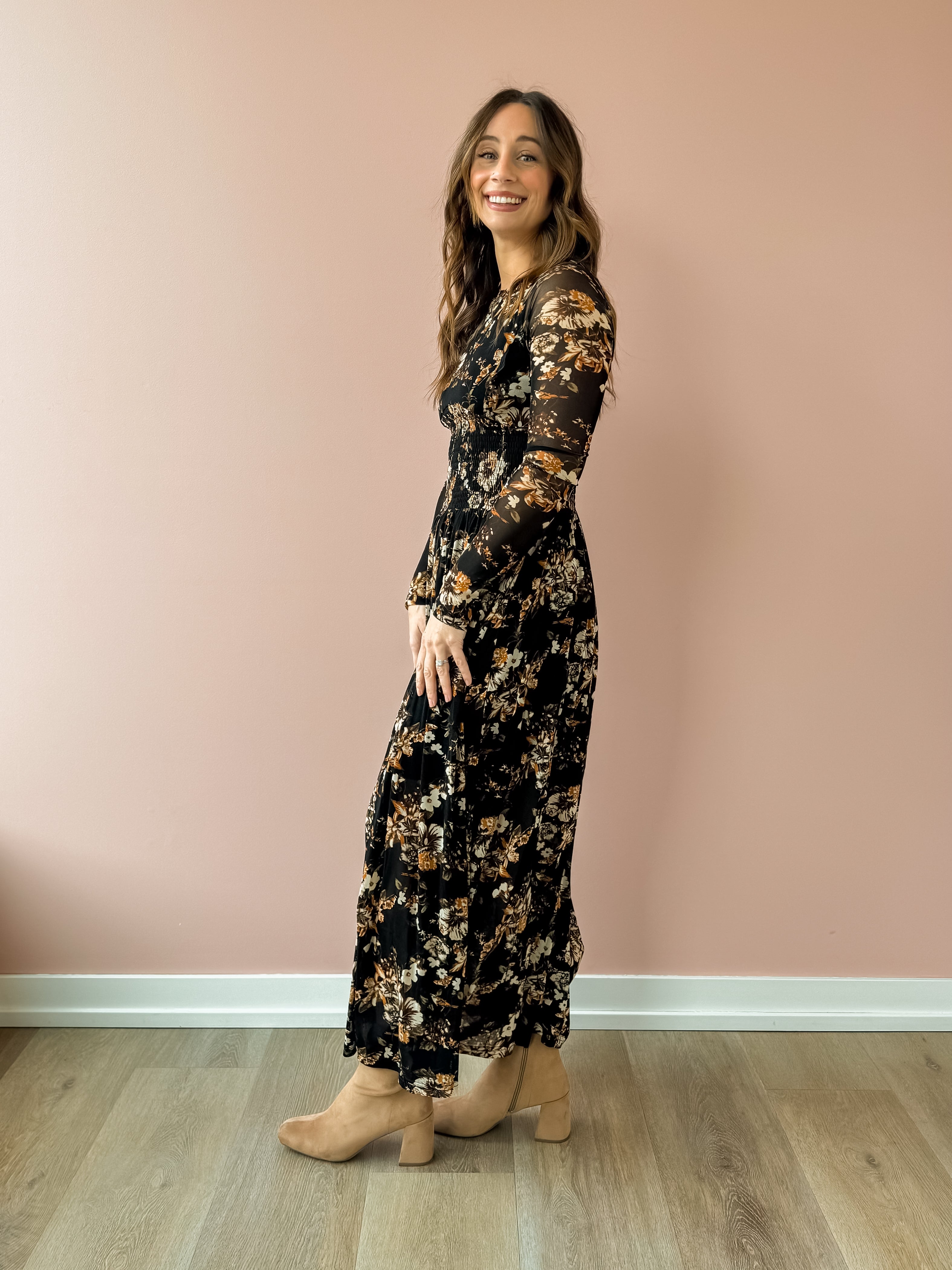 The Jackie Midi Dress combines timeless elegance with modern versatility. This sophisticated piece features long sleeves adorned with a rich brown and cream floral pattern that transitions beautifully through seasons. The slip lining provides coverage while sheer detailing at the hem adds an unexpected touch of refinement. Perfect for elevating your everyday style or dressing up for special occasions, this midi dress pairs effortlessly with brown boots for a polished, put-together look that turns heads.