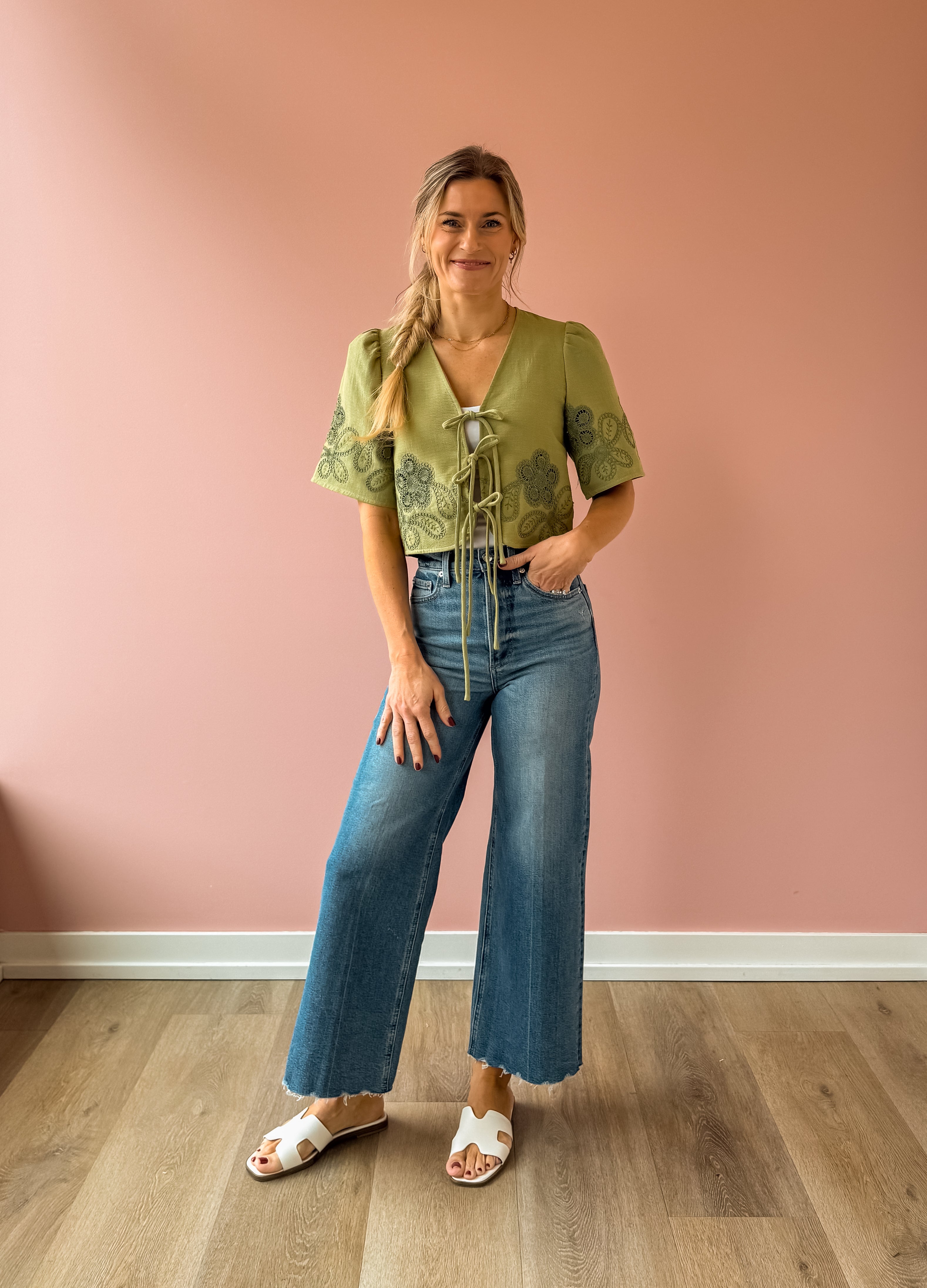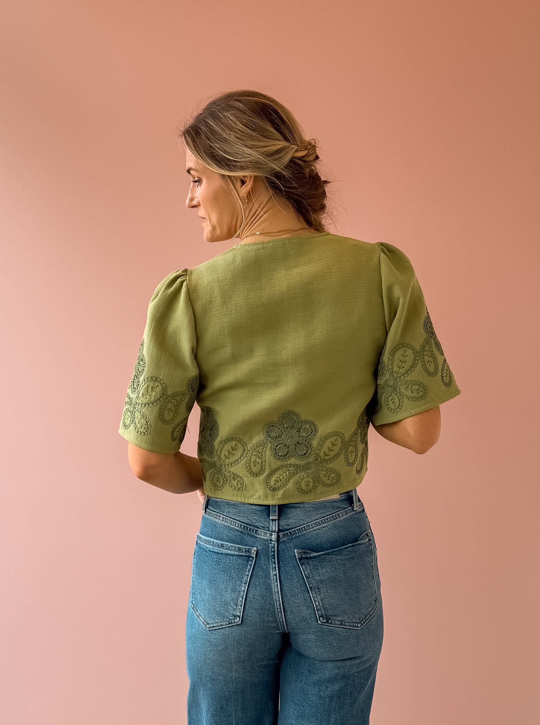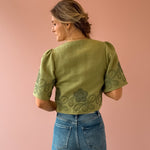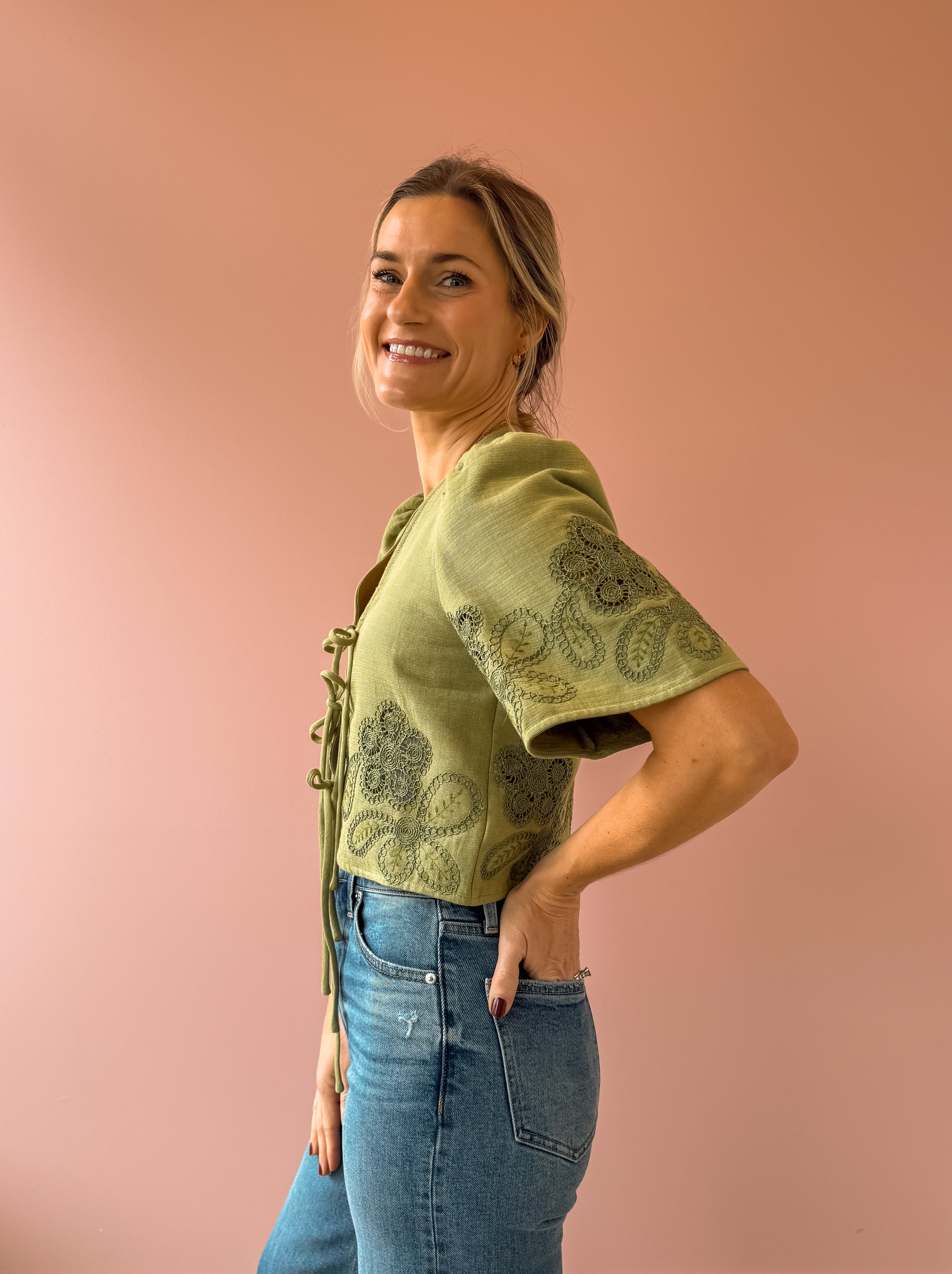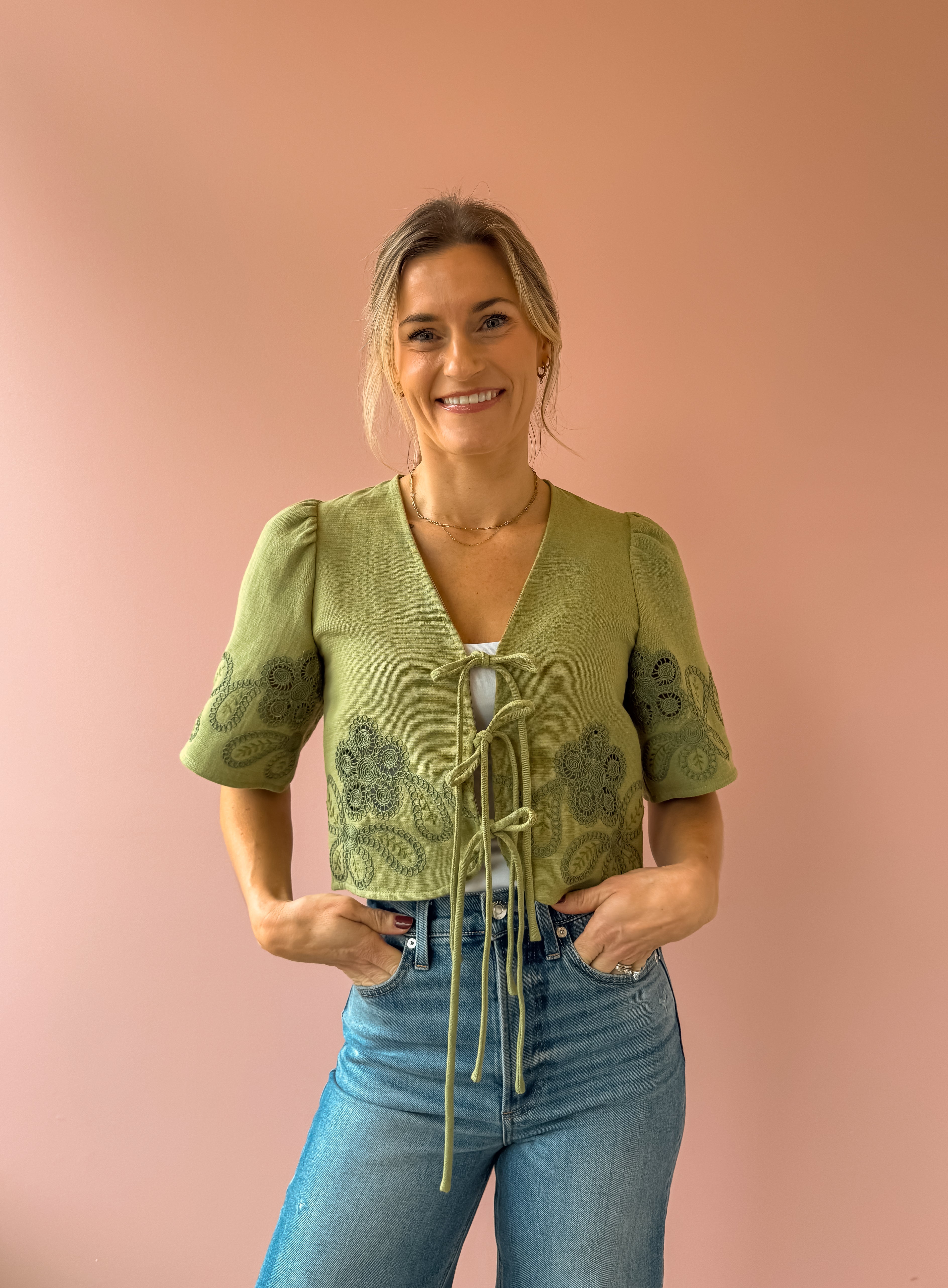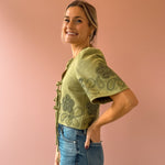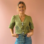 The Floweret Top is a sage-hued essential that effortlessly blends elegance with versatility. Featuring delicate short puff sleeves and a flattering v-neckline, this piece showcases feminine green lace detailing throughout. Three tie closures down the center allow you to customize your look—fasten them for a polished silhouette or leave them open for an airy, relaxed vibe. Perfect paired with a tank, denim, and sandals for an effortlessly chic look.